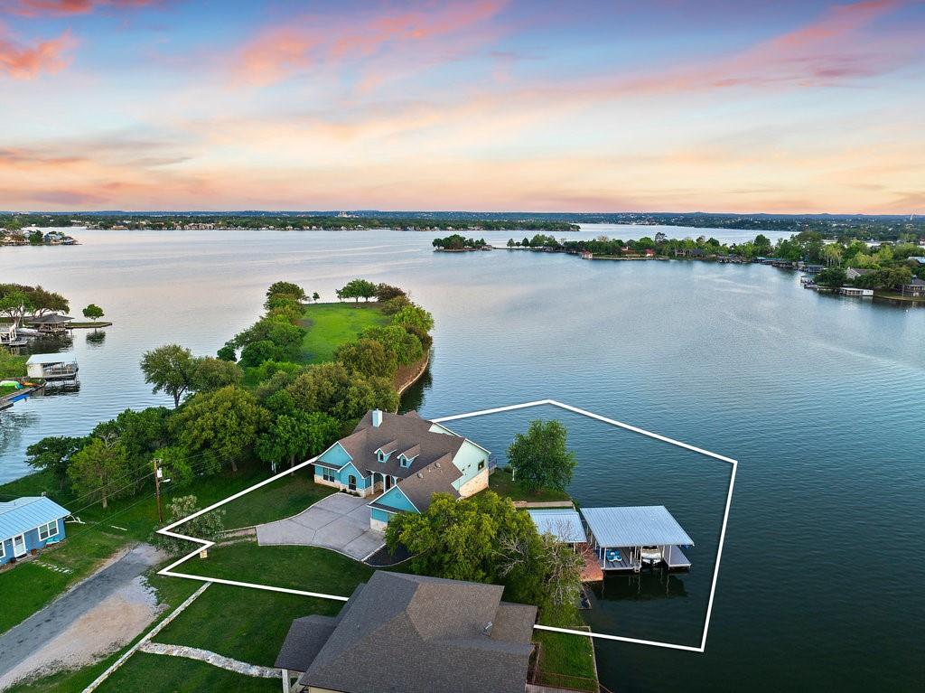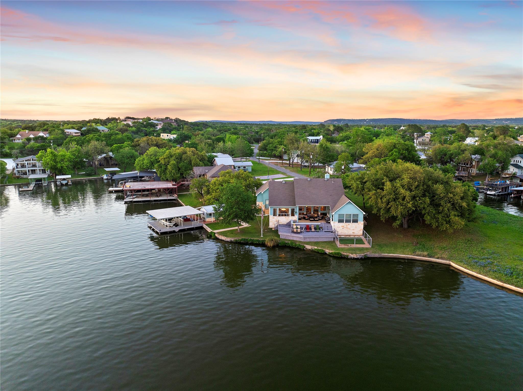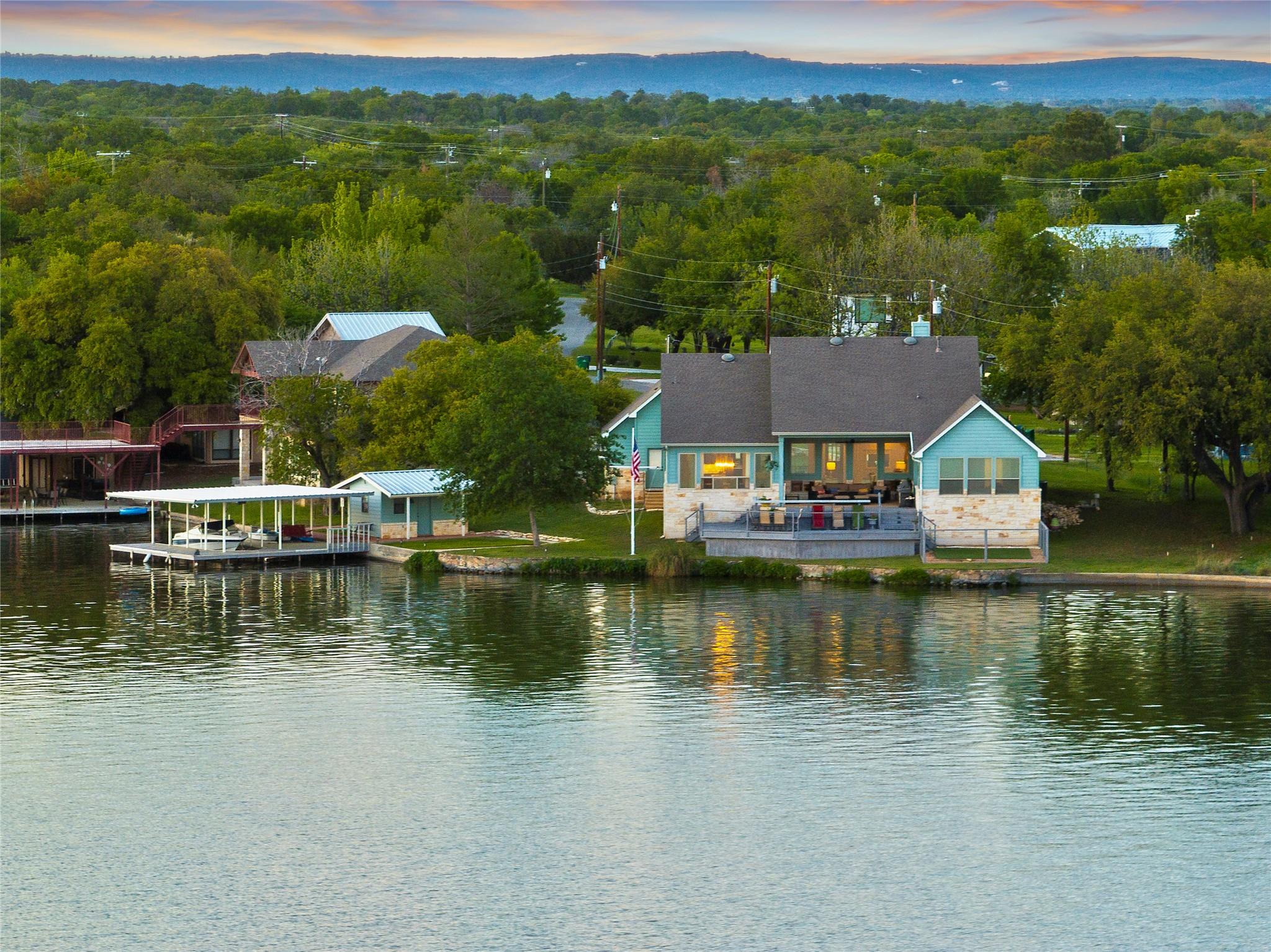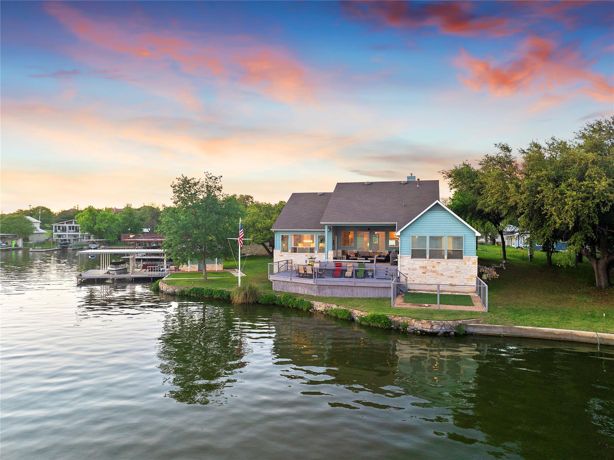 Don't miss out on this unique chance to own a stunning waterfront home in Sunrise Beach. This property is perfect for hosting large gatherings or enjoying intimate moments with loved ones. Nestled on two spacious lots with 208 feet of waterfront in a protective cove, this home offers a safe beach area for children to play, a yard for outdoor activities, and a serene spot under a majestic oak tree for napping. Originally built by David Weekley in 2011, this well-maintained single-story home can easily be expanded to include a second story for an additional bedroom and bathroom. The open concept layout seamlessly connects the kitchen, dining, and living areas, while the mudroom features a convenient half bath, extra storage, and a laundry room with access to the lake. The property also boasts an attached garage, ample driveway parking, and modern amenities such as a sound system, outdoor kitchen plumbing, and outdoor TV cable. With 2,663 square feet of living space, 3 bedrooms, and 2.5 baths, this home comes equipped with a boat dock for one boat and two jet skis, as well as a spacious boathouse for storing water toys, a refrigerator, and yard tools. The strategic placement of the house on two lots ensures breathtaking lake views from nearly every room, while the southeast-facing patio and two-level decking capture refreshing summer breezes and shield from chilly north winds. Situated at the end of a quiet street, this property offers unparalleled privacy and stunning views of wildlife, sunrises, sunsets, storms rolling in, rainbows, and more. The sale also includes 70 feet of inundated waterfront ownership, making this home a truly exceptional find in the area.
