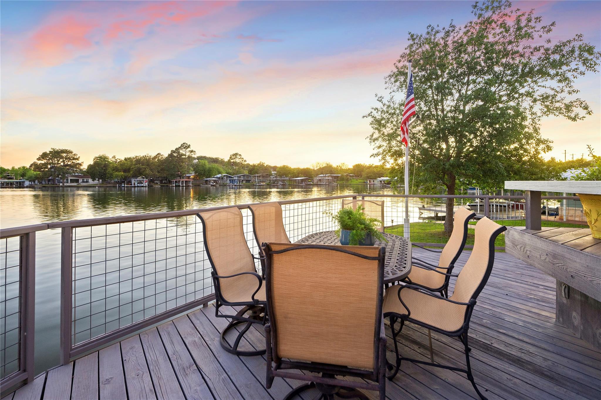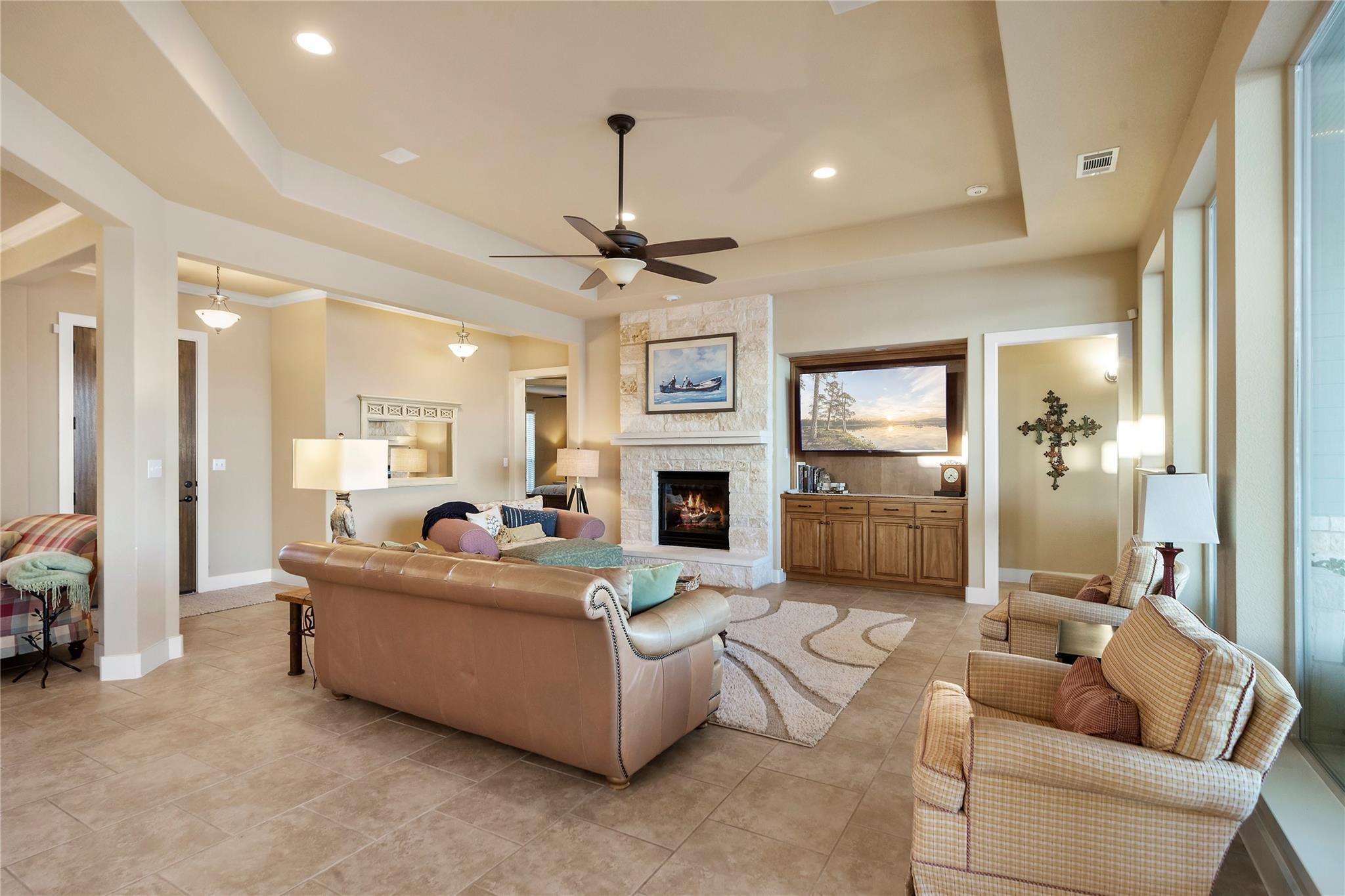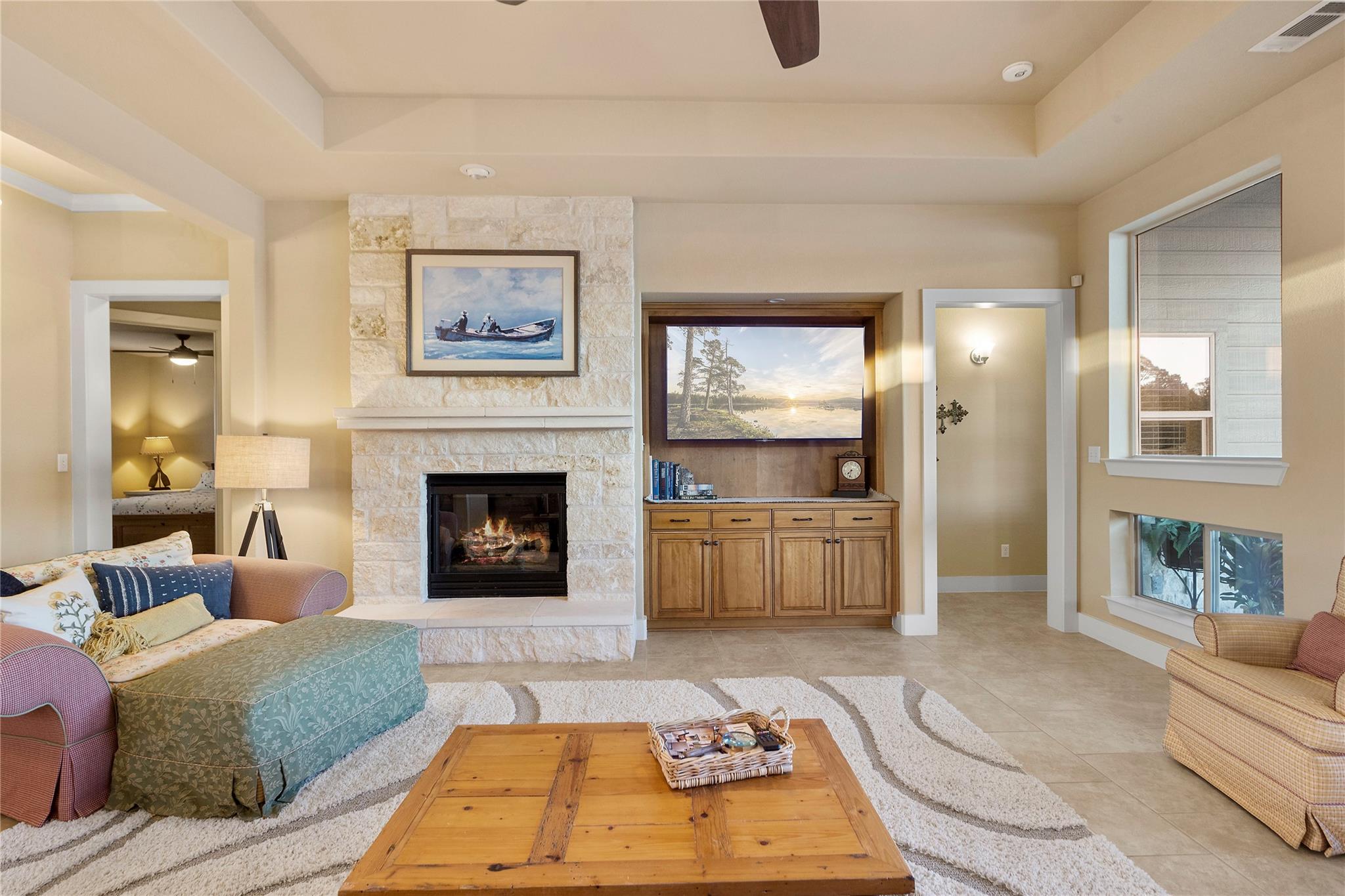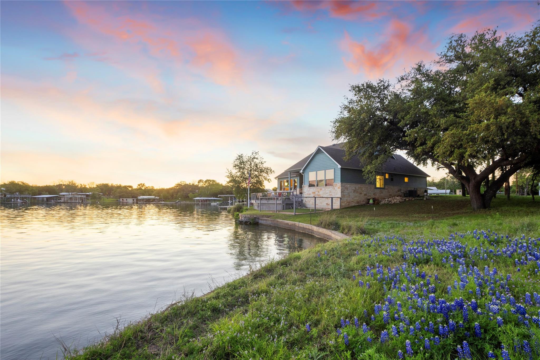 Don't miss out on this unique chance to own a stunning waterfront home in Sunrise Beach. This property is perfect for hosting large gatherings or enjoying intimate moments with loved ones. Nestled on two spacious lots with 208 feet of waterfront in a protective cove, this home offers a safe beach area for children to play, a yard for outdoor activities, and a serene spot under a majestic oak tree for napping. Originally built by David Weekley in 2011, this well-maintained single-story home can easily be expanded to include a second story for an additional bedroom and bathroom. The open concept layout seamlessly connects the kitchen, dining, and living areas, while the mudroom features a convenient half bath, extra storage, and a laundry room with access to the lake. The property also boasts an attached garage, ample driveway parking, and modern amenities such as a sound system, outdoor kitchen plumbing, and outdoor TV cable. With 2,663 square feet of living space, 3 bedrooms, and 2.5 baths, this home comes equipped with a boat dock for one boat and two jet skis, as well as a spacious boathouse for storing water toys, a refrigerator, and yard tools. The strategic placement of the house on two lots ensures breathtaking lake views from nearly every room, while the southeast-facing patio and two-level decking capture refreshing summer breezes and shield from chilly north winds. Situated at the end of a quiet street, this property offers unparalleled privacy and stunning views of wildlife, sunrises, sunsets, storms rolling in, rainbows, and more. The sale also includes 70 feet of inundated waterfront ownership, making this home a truly exceptional find in the area.