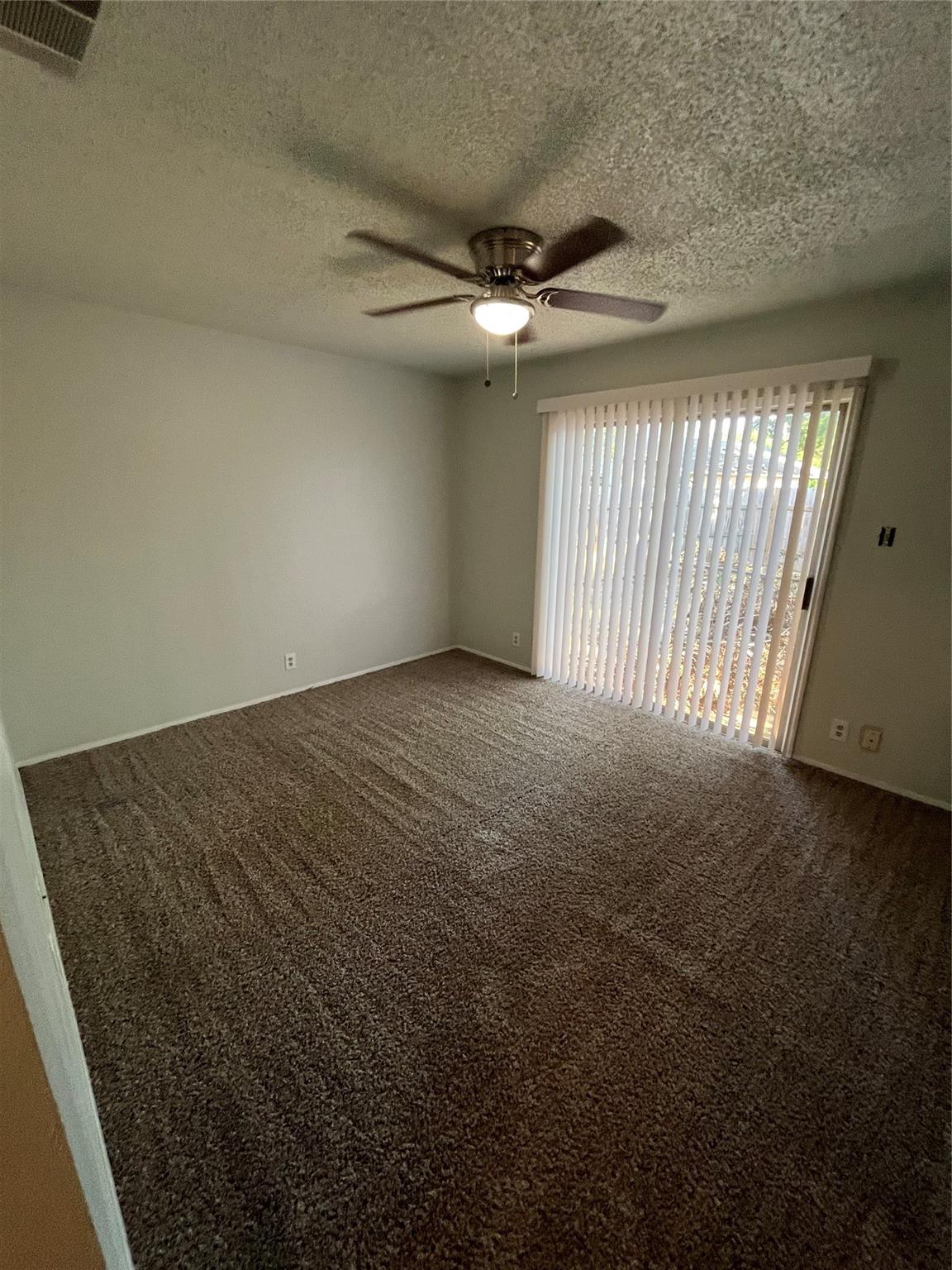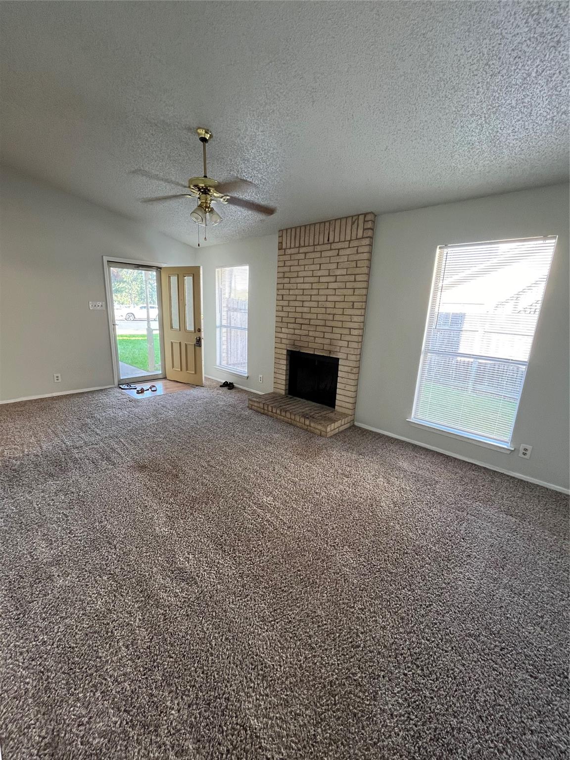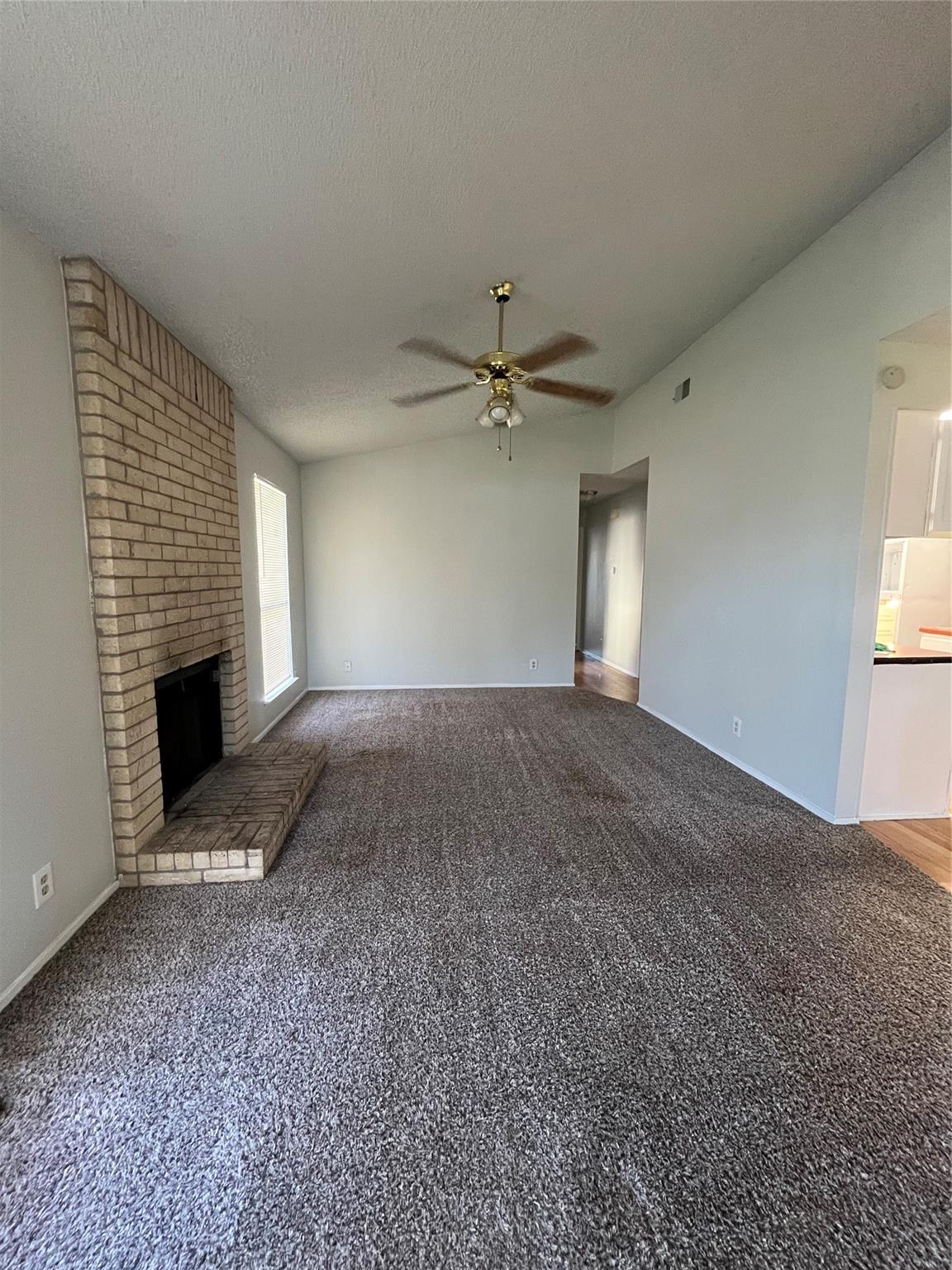 Spacious floor plan living room featuring open floor plan, arch door way, fireplace, ceiling fan and sliding glass door to fenced back yard. Large kitchen with lots of cabinets and counter space. Ceiling fans and blinds throughout. Lots of storage space and attached garage. Lots of trees and plush lawn.