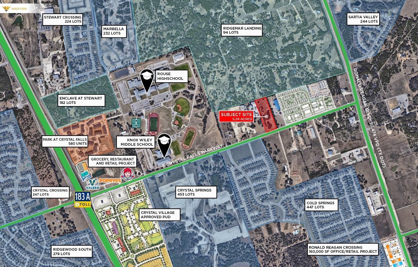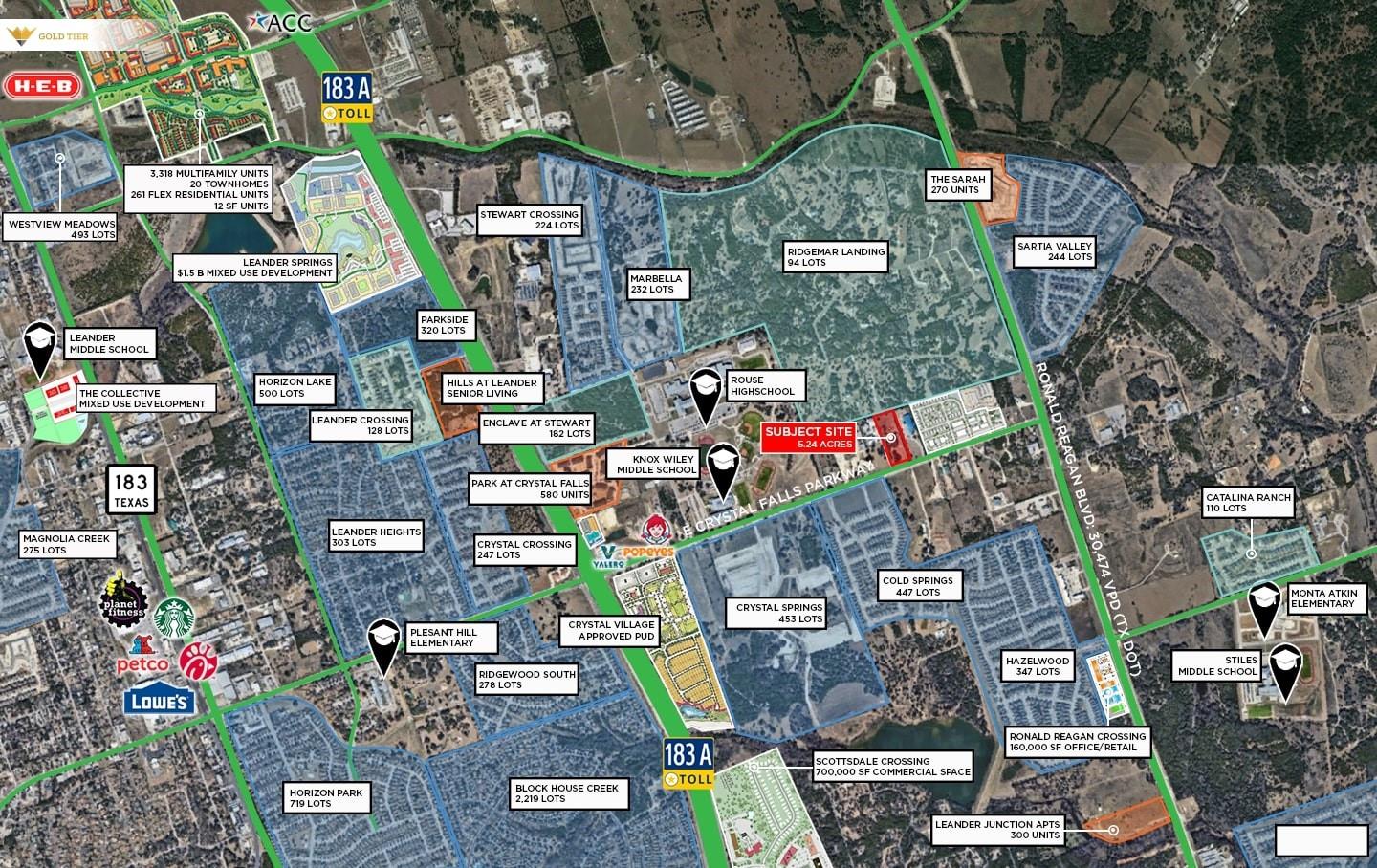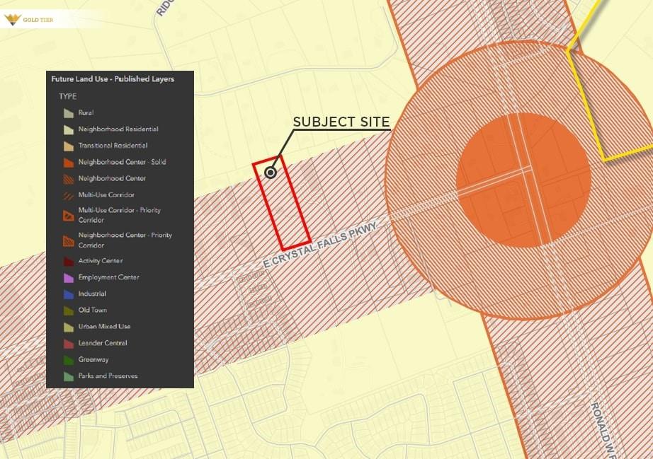 Gold Tier Real Estate is proud to present a 5.24 acre commercial tract on E Crystal Falls Pkwy in Leander, Texas. With its excellent development potential and strategic location, this property is a must-see for anyone seeking to invest or develop in the booming Leander economy. With easy access to major highways such as Highway 183 and local transportation hubs, this property offers a convenient location for businesses of all types. Whether you're looking to build a flex industrial, retail center, or office complex, this tract of land has the potential to accommodate a variety of commercial ventures. The City of Leander shows this tract as “Multi-Use Corridor” on their Future Land Use Map. There is an 8” water line along E Crystal Falls Pkwy and a 8” wastewater line approximately 500’ from the subject site. The site is level. There is no FEMA flood zone or wetlands. **Prospective purchasers are advised to conduct independent analyses of the property. The broker does not warrant the accuracy of any information provided.**