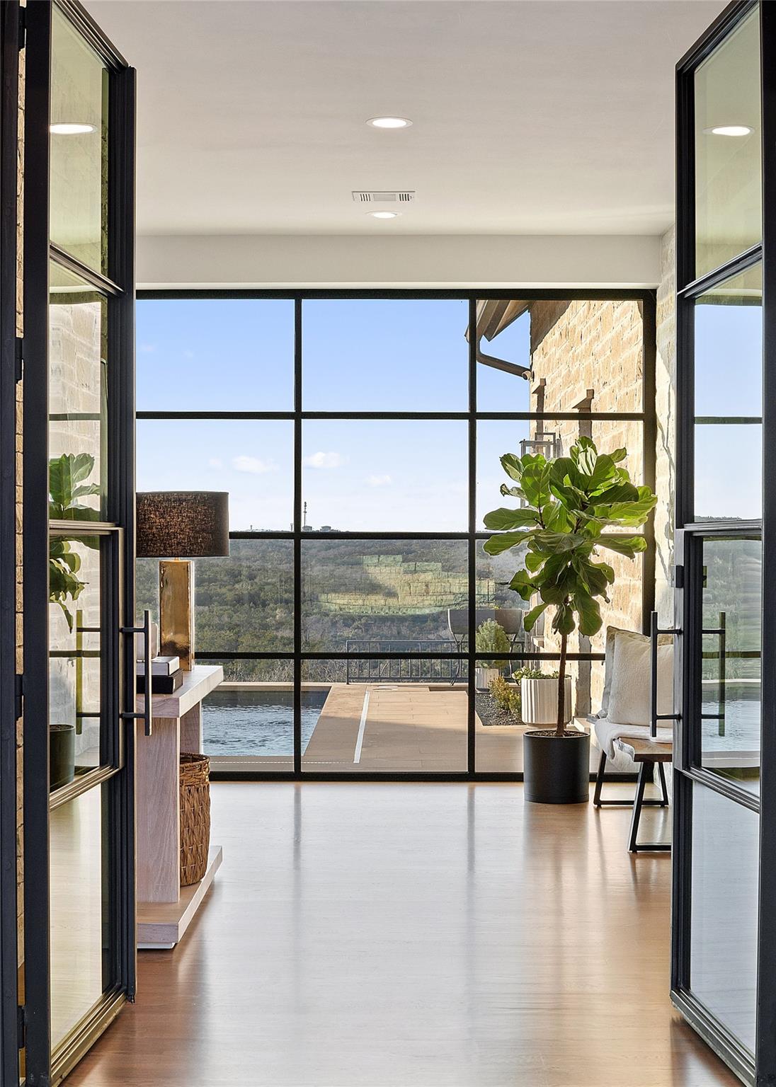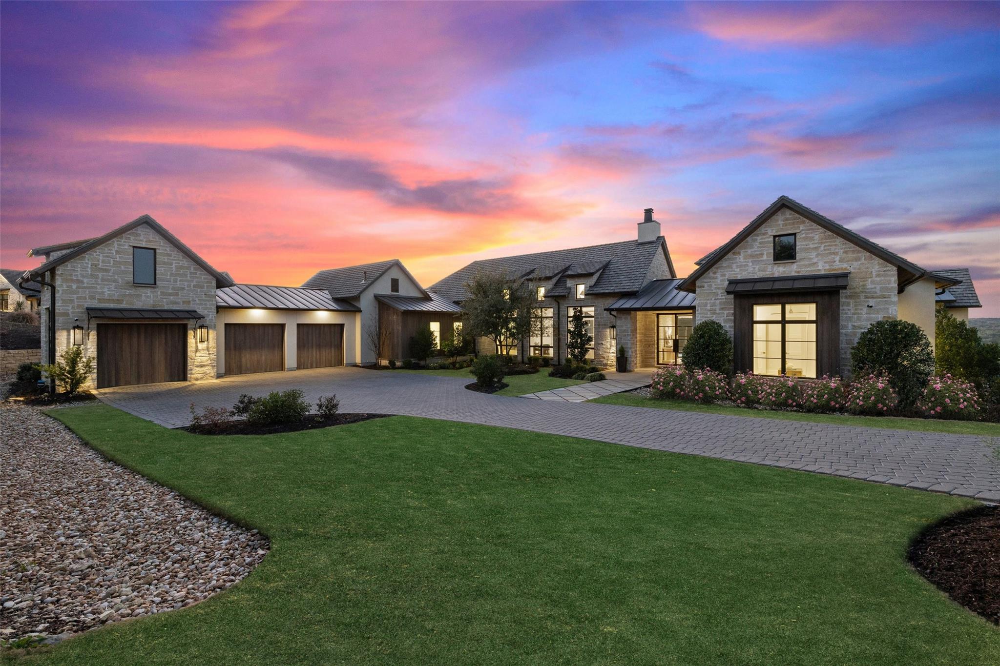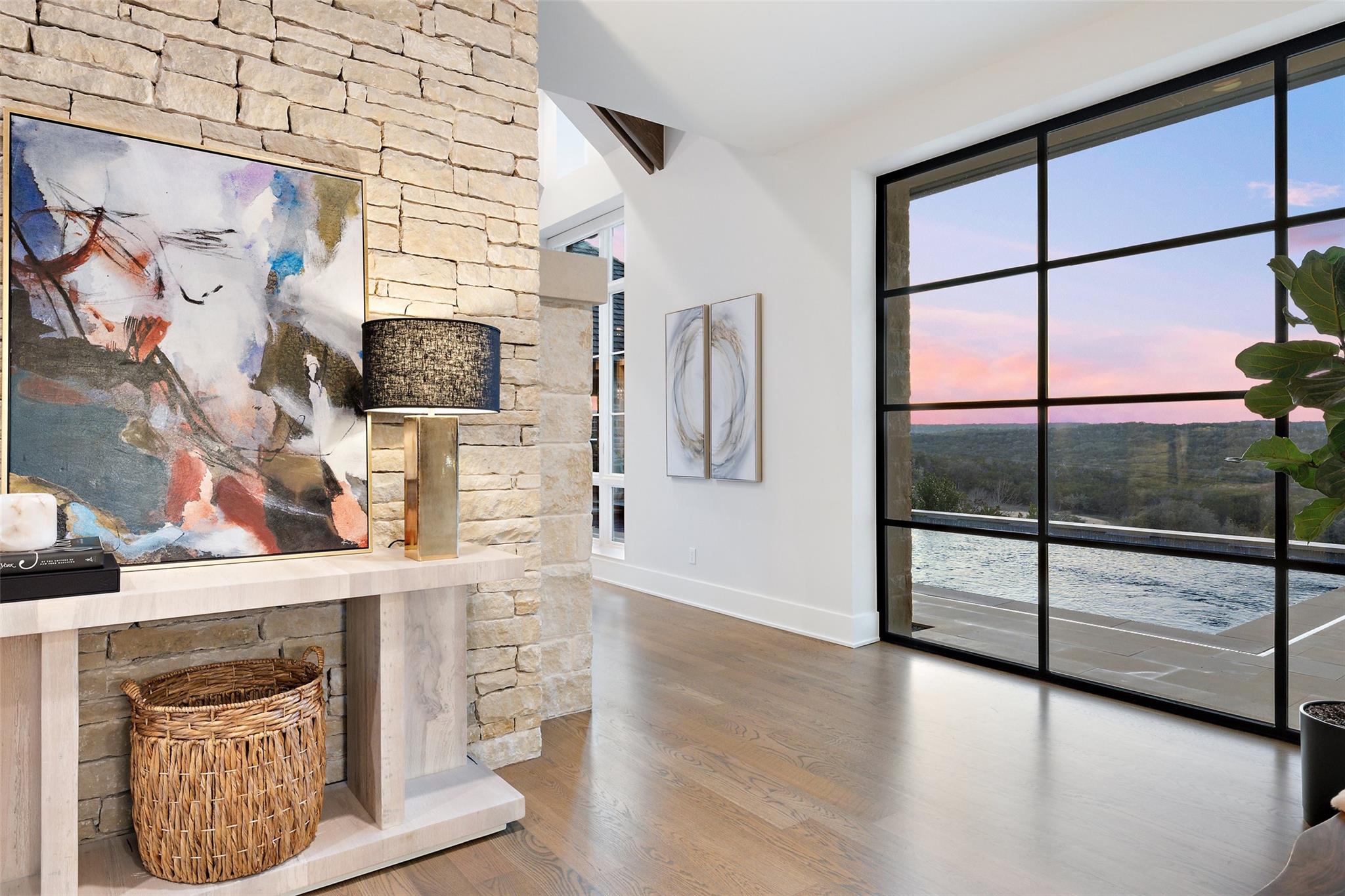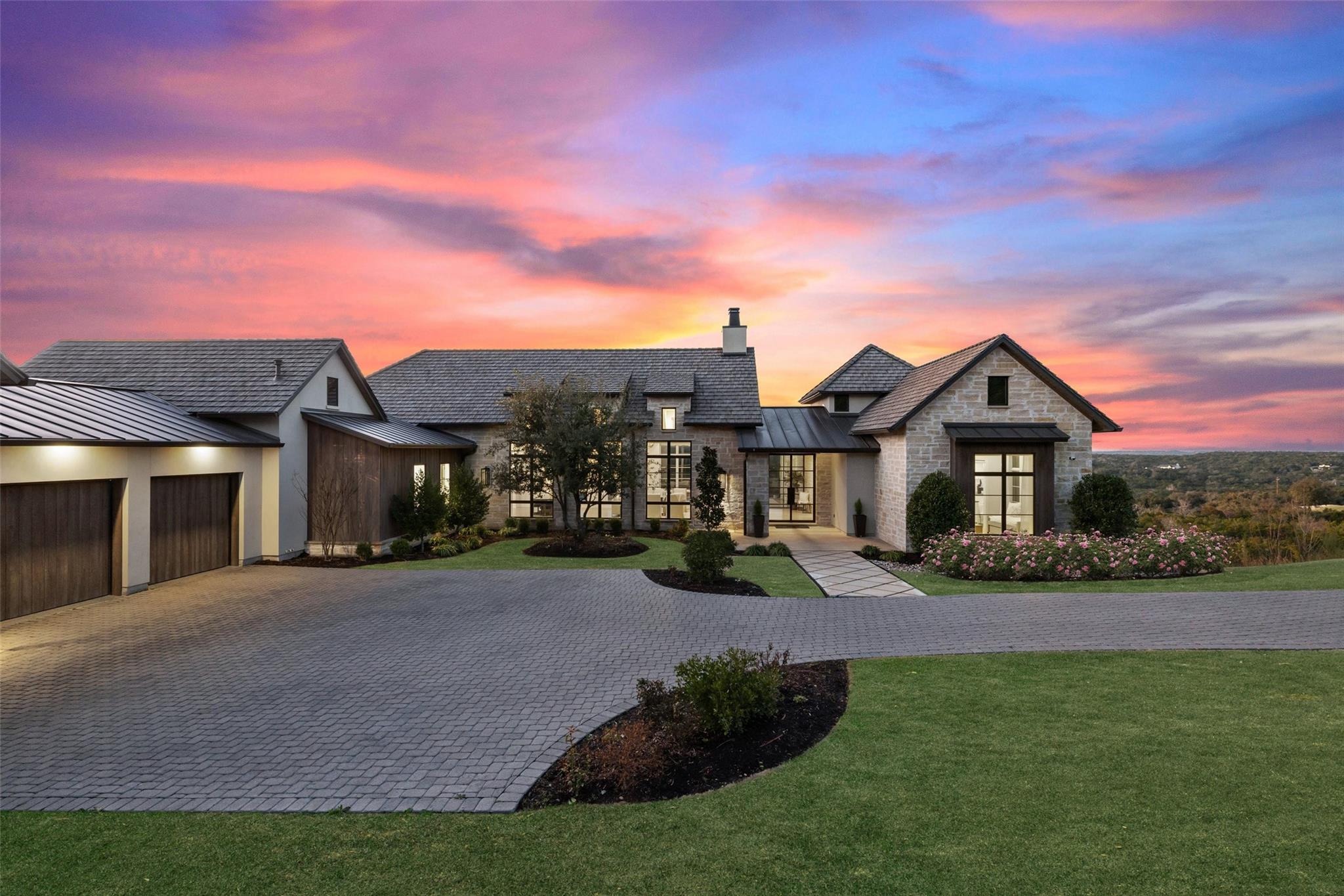 Beautiful showplace home in the highly sought after and acclaimed gated neighborhood of Amarra. Comprising 2.7 lush acres, this property is one of the largest in the neighborhood and overlooks the 16th hole of the Barton Creek Fazio Canyons Golf Course. The siting of the home on the lot creates exceptional privacy, as the entrance is set below a landscaped bluff shielding the home from passers-by. The view out through the back wall of windows is of verdant unobstructed rolling hills and green belt views; neighbors are almost invisible to either side. Originally the model for luxury home builder Heyl Homes, this estate features high-end custom finishes, including grain-matched walnut cabinetry, hand-finished hardwood floors, elevated stonework and the single-story home features soaring ceilings in the great room, with walls of windows bracketing the space and filling it with warm light and green views during the day and spectacular sunsets at sundown. Wood trusses and native Texas limestone bring organic elements to the room. The sleek kitchen is outfitted with gourmet subzero appliances and enjoys a view out over the landscape as well. A second living area opens to the summer kitchen and pool, allowing an unimpeded flow from indoors out. Set privately behind a separate hallway, the primary suite opens to the pool and terrace from the opposite side of the outdoor living space and overlooking the spectacular Hill Country views. A marble-clad bath with soaking tub and two walk-in closets makes getting ready in the morning a joy. This wing also features a massive, dedicated office plus en-suite bedroom that offers flexibility as a guest room, second office space or even a workout room. Two additional en-suite bedrooms lie on the opposite wing, allowing some quiet and privacy for all family members. Additional luxuries include a three-car, epoxy-floored garage, large laundry room, ample storage and in-home cocktail bar for entertaining family and friends.