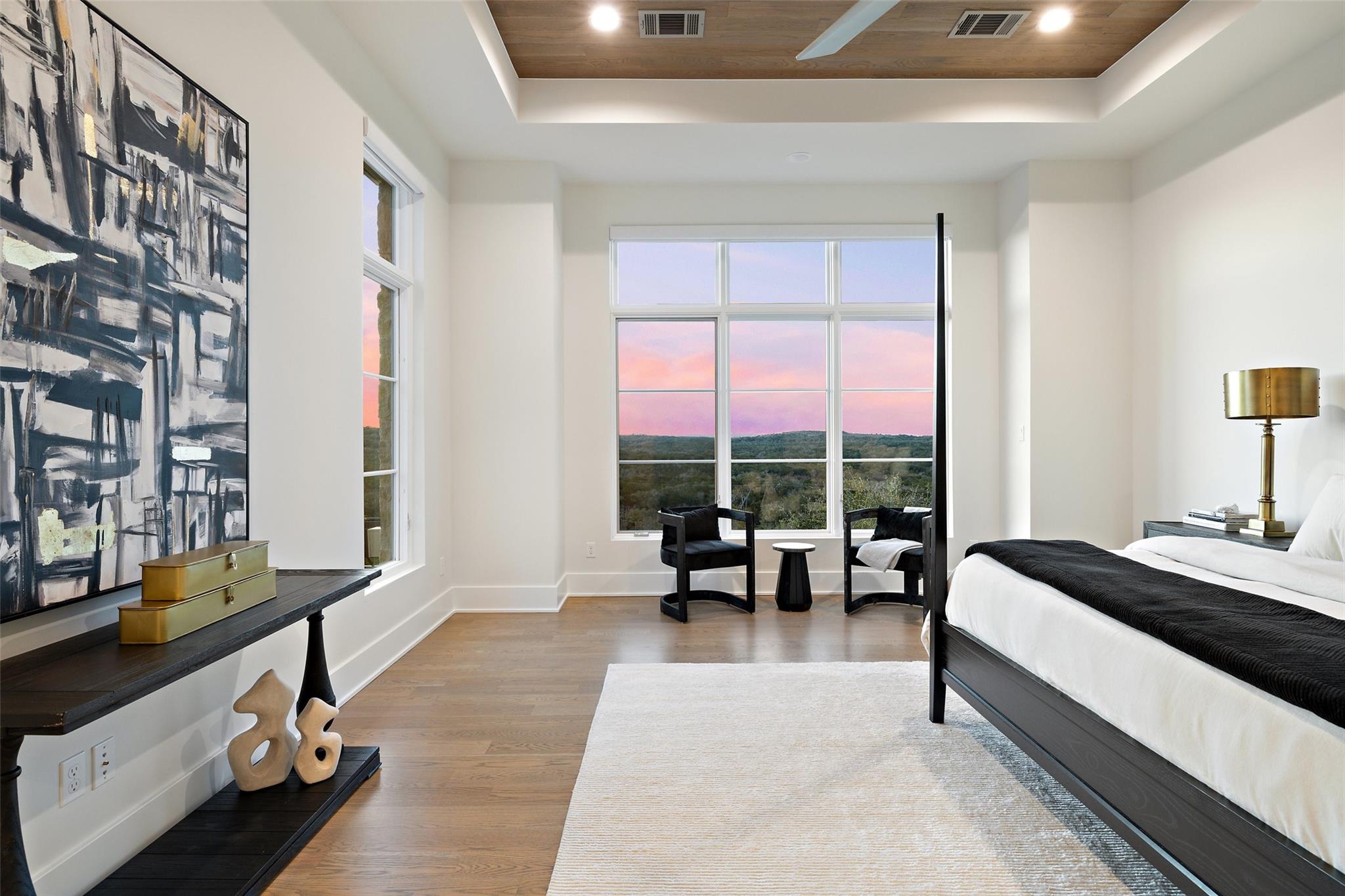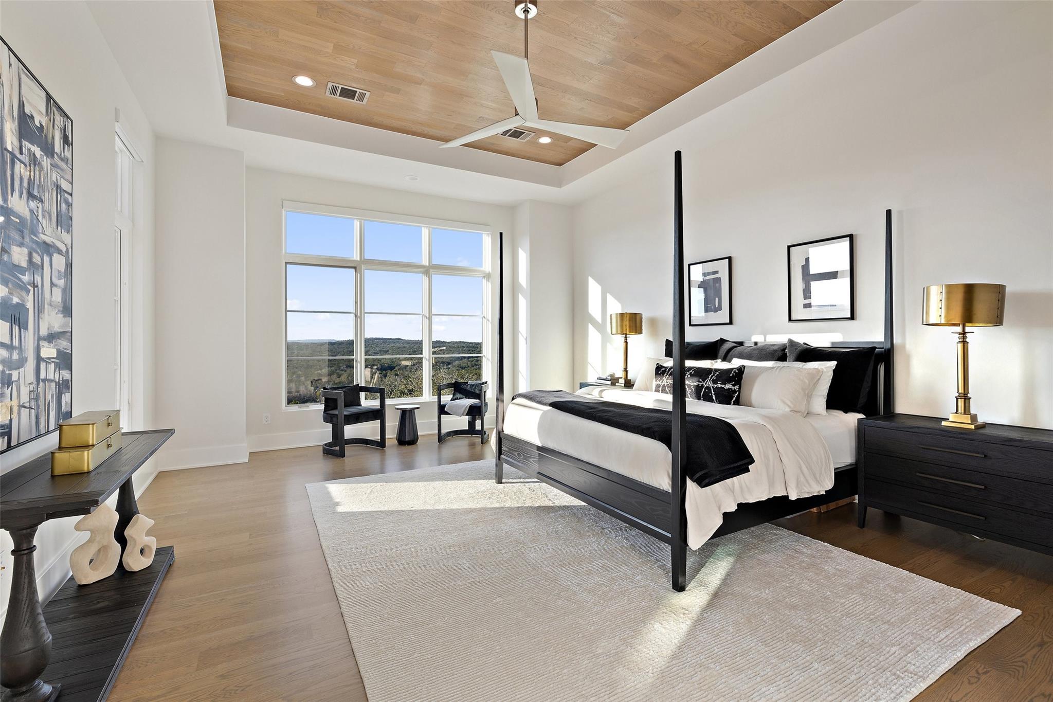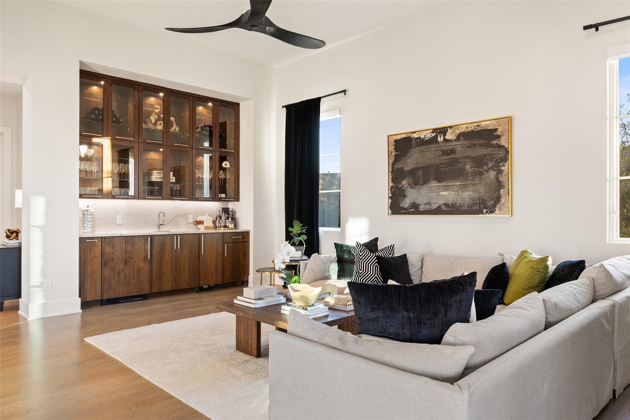 Beautiful showplace home in the highly sought after and acclaimed gated neighborhood of Amarra. Comprising 2.7 lush acres, this property is one of the largest in the neighborhood and overlooks the 16th hole of the Barton Creek Fazio Canyons Golf Course. The siting of the home on the lot creates exceptional privacy, as the entrance is set below a landscaped bluff shielding the home from passers-by. The view out through the back wall of windows is of verdant unobstructed rolling hills and green belt views; neighbors are almost invisible to either side. Originally the model for luxury home builder Heyl Homes, this estate features high-end custom finishes, including grain-matched walnut cabinetry, hand-finished hardwood floors, elevated stonework and the single-story home features soaring ceilings in the great room, with walls of windows bracketing the space and filling it with warm light and green views during the day and spectacular sunsets at sundown. Wood trusses and native Texas limestone bring organic elements to the room. The sleek kitchen is outfitted with gourmet subzero appliances and enjoys a view out over the landscape as well. A second living area opens to the summer kitchen and pool, allowing an unimpeded flow from indoors out. Set privately behind a separate hallway, the primary suite opens to the pool and terrace from the opposite side of the outdoor living space and overlooking the spectacular Hill Country views. A marble-clad bath with soaking tub and two walk-in closets makes getting ready in the morning a joy. This wing also features a massive, dedicated office plus en-suite bedroom that offers flexibility as a guest room, second office space or even a workout room. Two additional en-suite bedrooms lie on the opposite wing, allowing some quiet and privacy for all family members. Additional luxuries include a three-car, epoxy-floored garage, large laundry room, ample storage and in-home cocktail bar for entertaining family and friends.