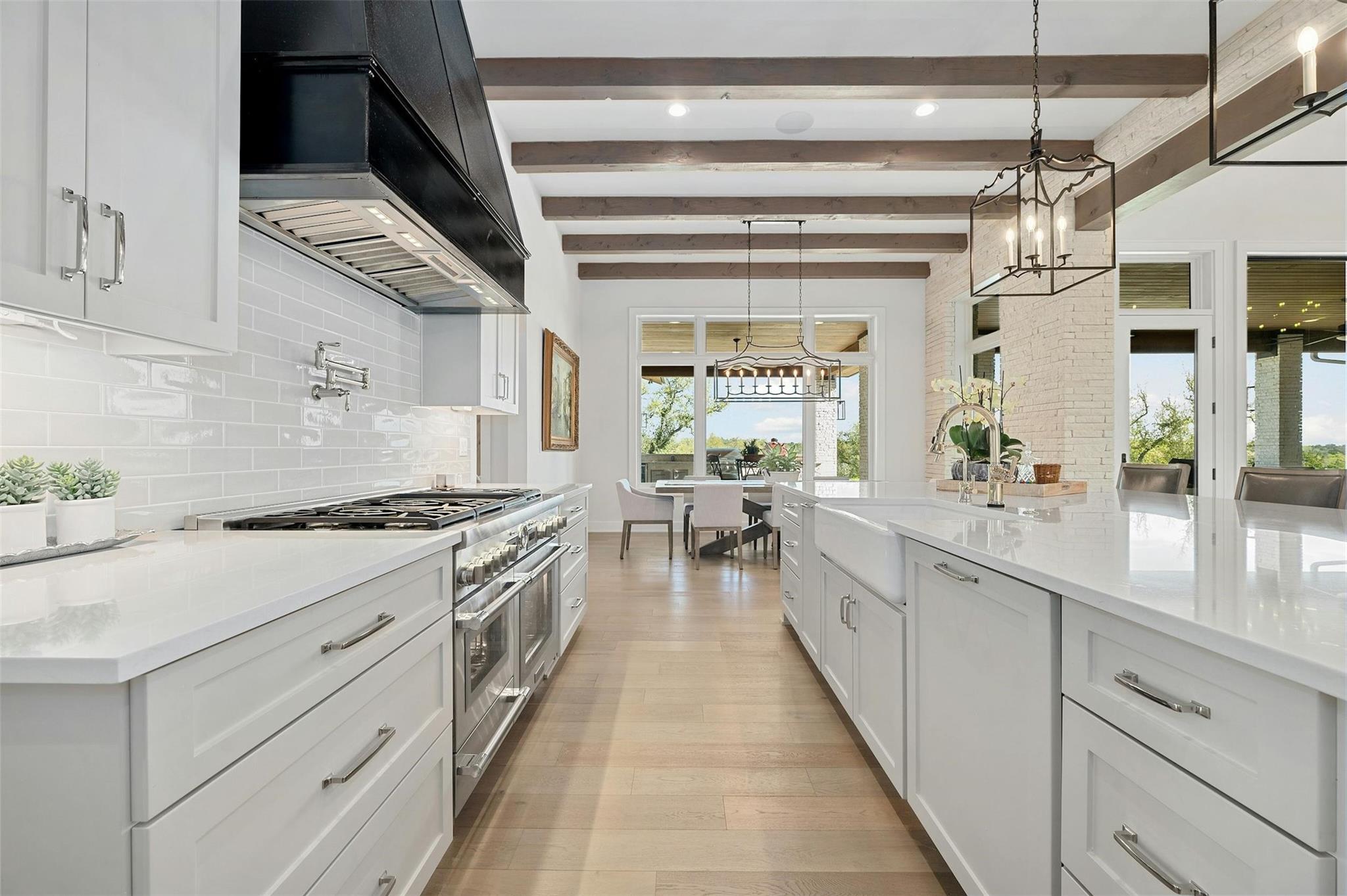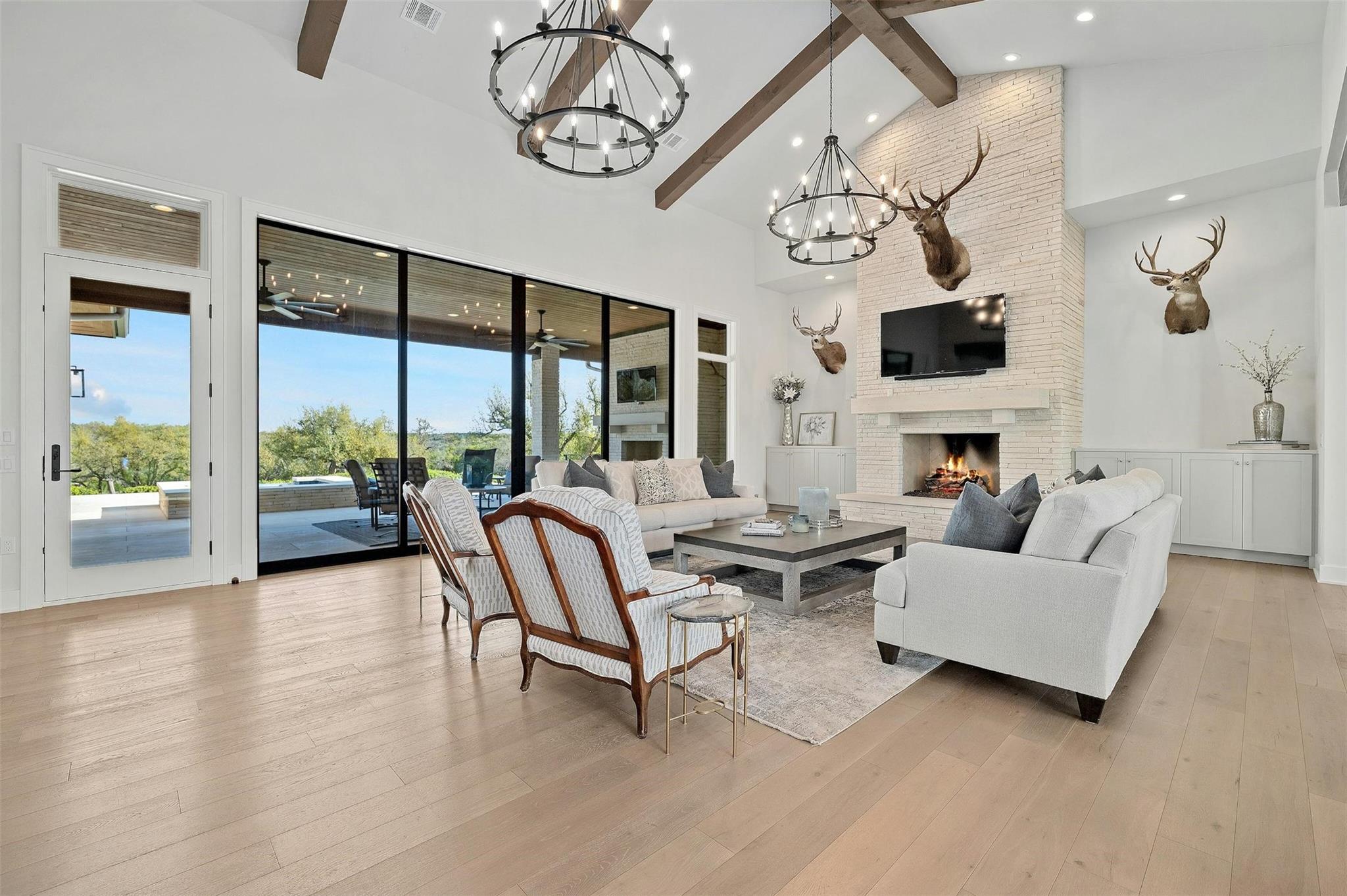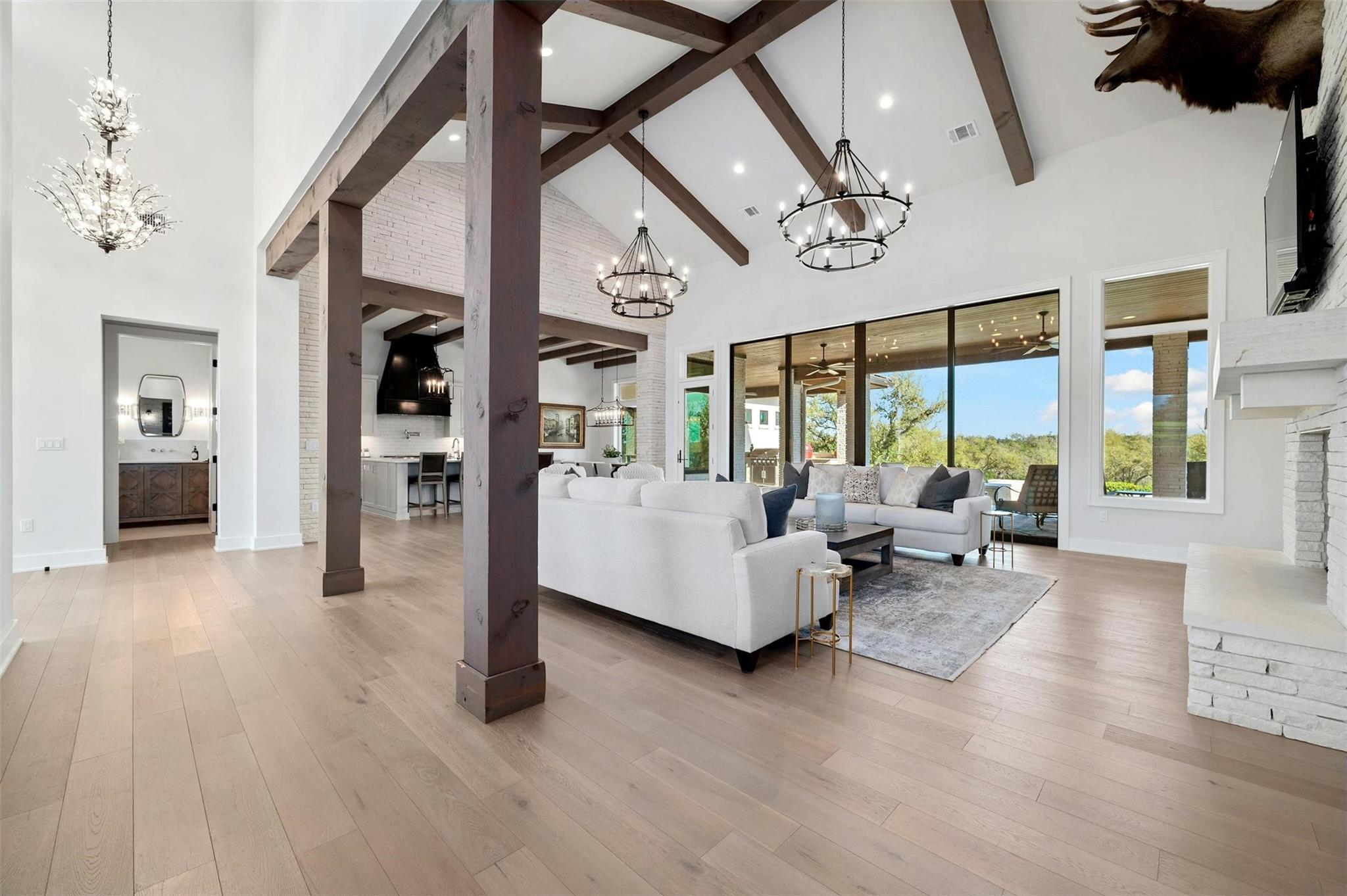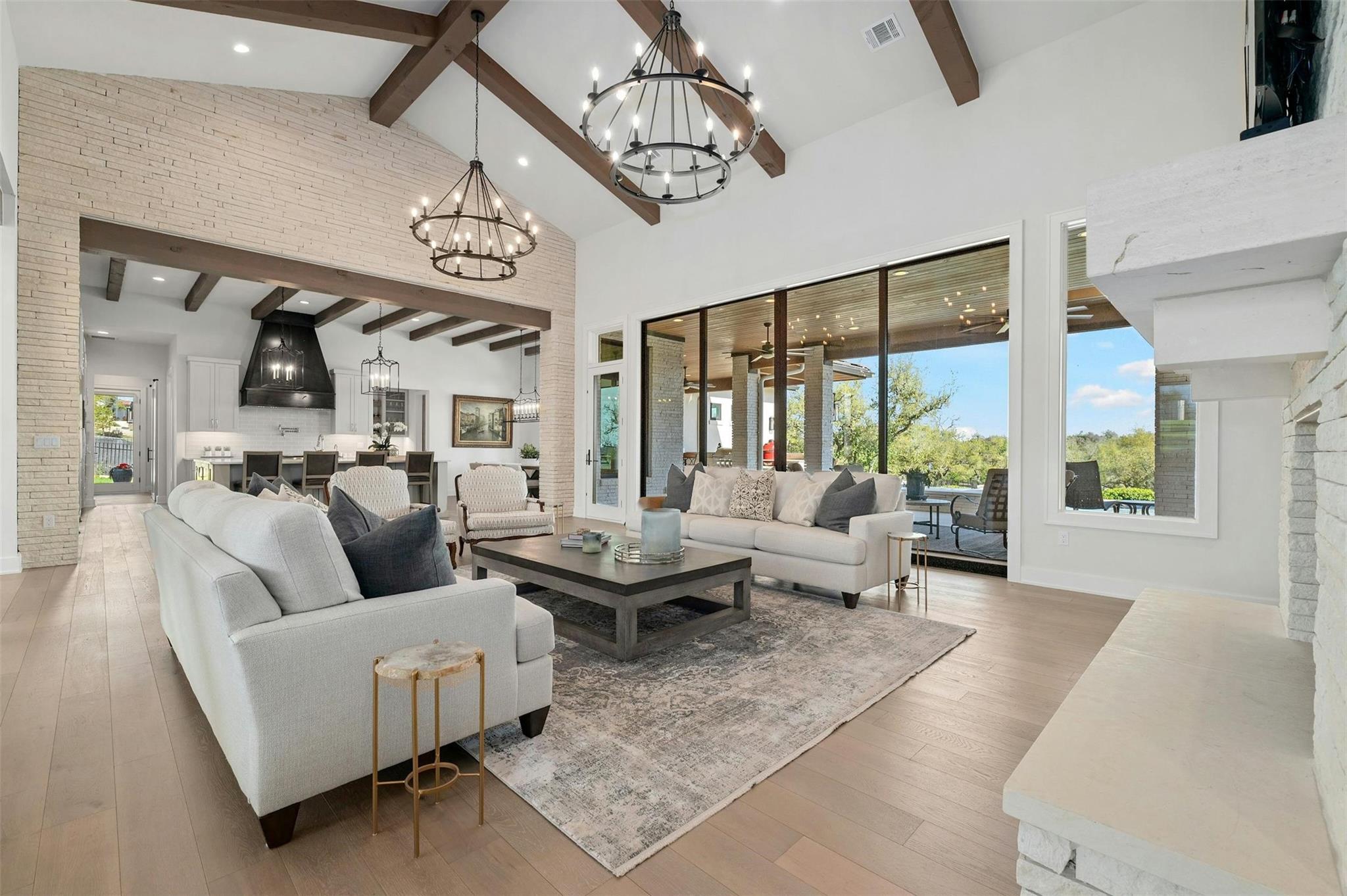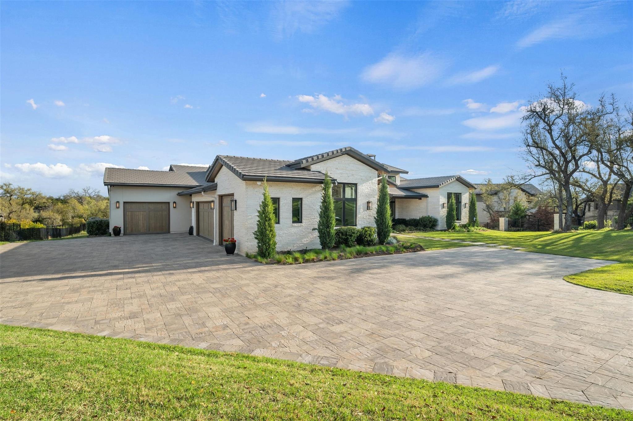 Located in the prestigious gated community of Belvedere, this single story 4-bedroom home has beautiful hill country views and is located on a quiet cul-de-sac. Built by award winning Arbogast homes and designed by Kai Geske, this gated property sits on 2.5 acres with many live oaks. The open concept living area is spacious and bright with large windows that allow for natural light. The high ceilings are complemented with large wood beams. The chef's kitchen includes an oversized island, professional grade Thermador stainless steel appliances, gas cooking and a built in Miele coffee machine. The spacious primary suite offers beautiful views, a spacious walk-in shower, and soaking tub. The outdoor kitchen is perfect for entertaining with a covered patio, outdoor living area, fireplace and pool. The four-car garage includes an airconditioned bay with an interior safe room, full stair access to the attic and automatic lift to load heavy items. Belvedere is an award winning community which includes a lazy river, kids splash pad, community sport court, natural trails, fishing pond and 80 acres of nature preserve. Belvedere is under 20 miles from Downtown Austin and just minutes from Bee Cave, Lakeway, and Dripping Springs