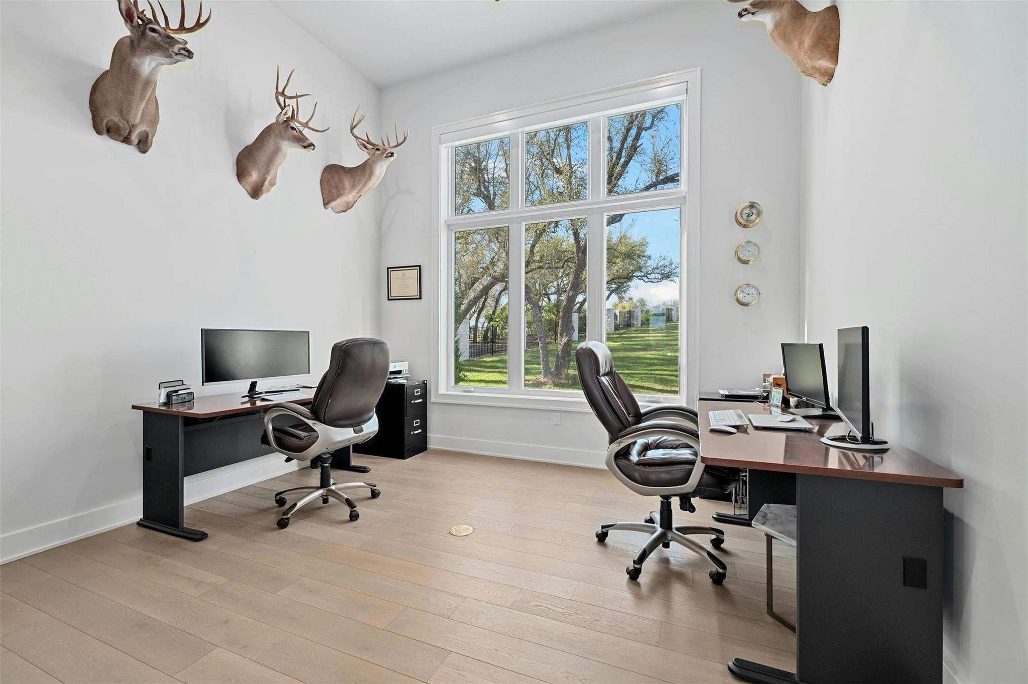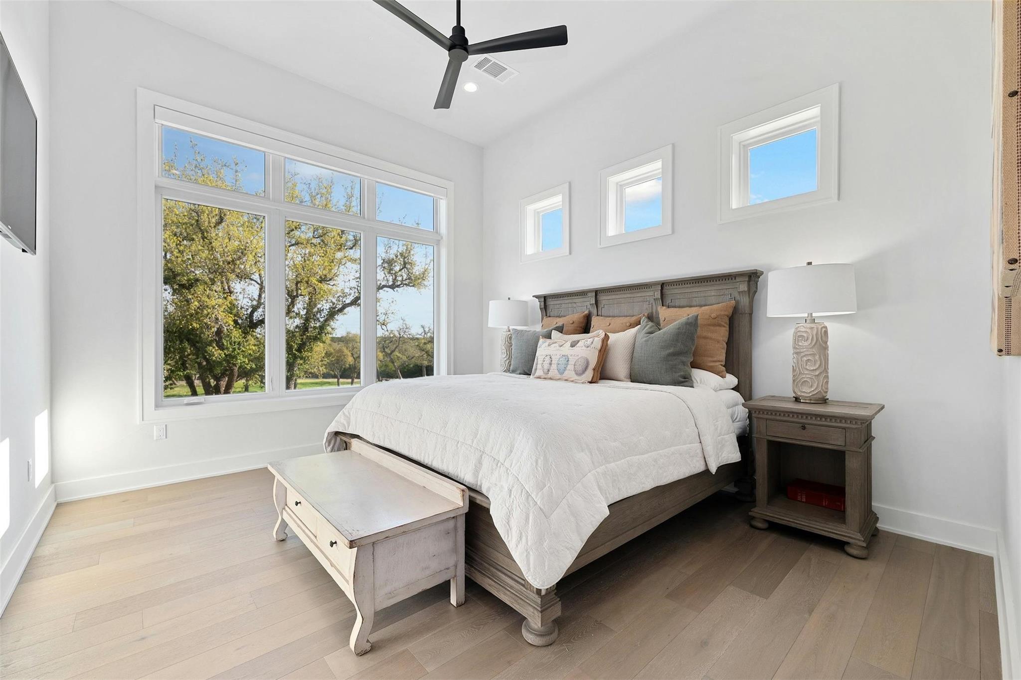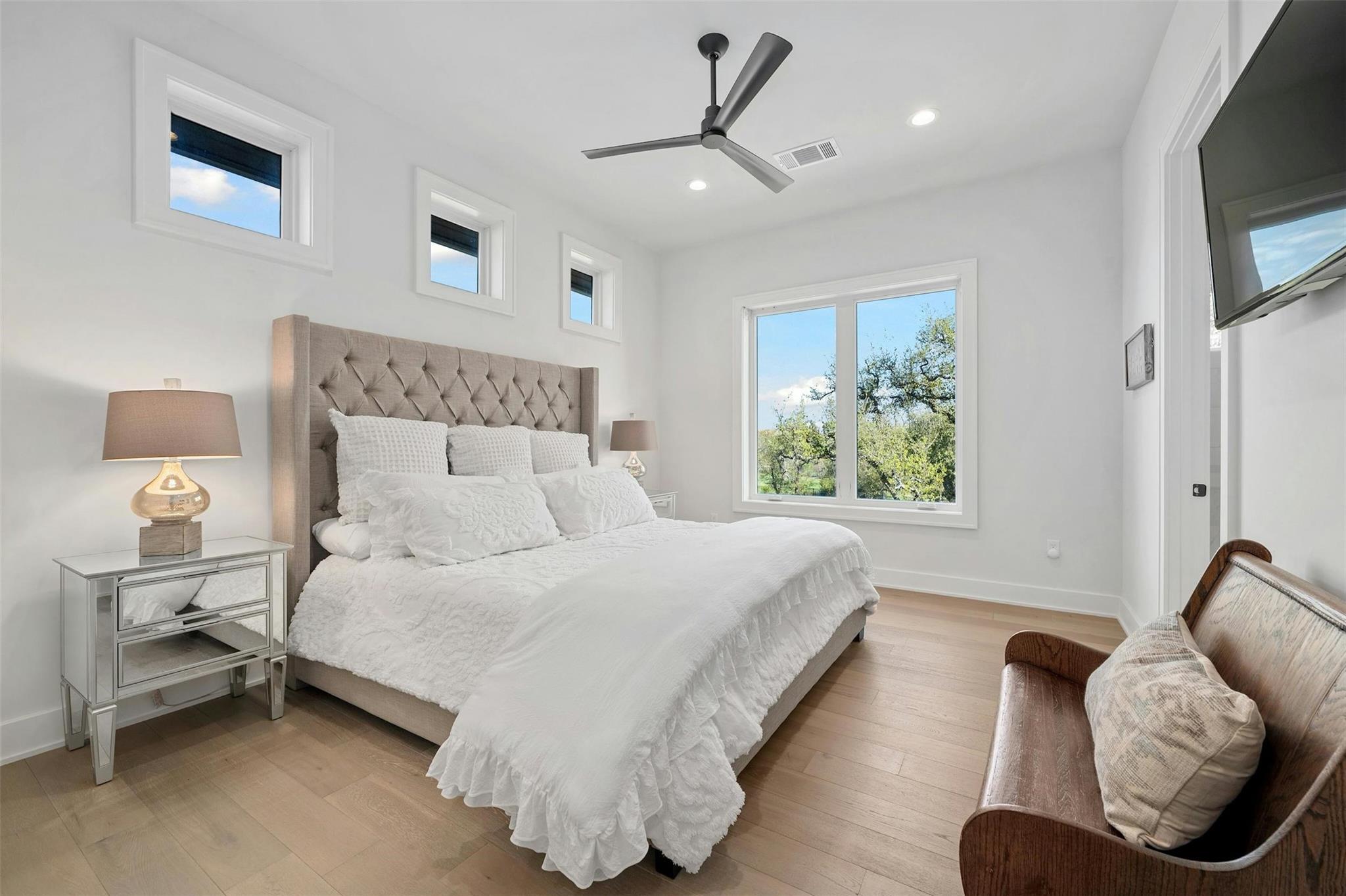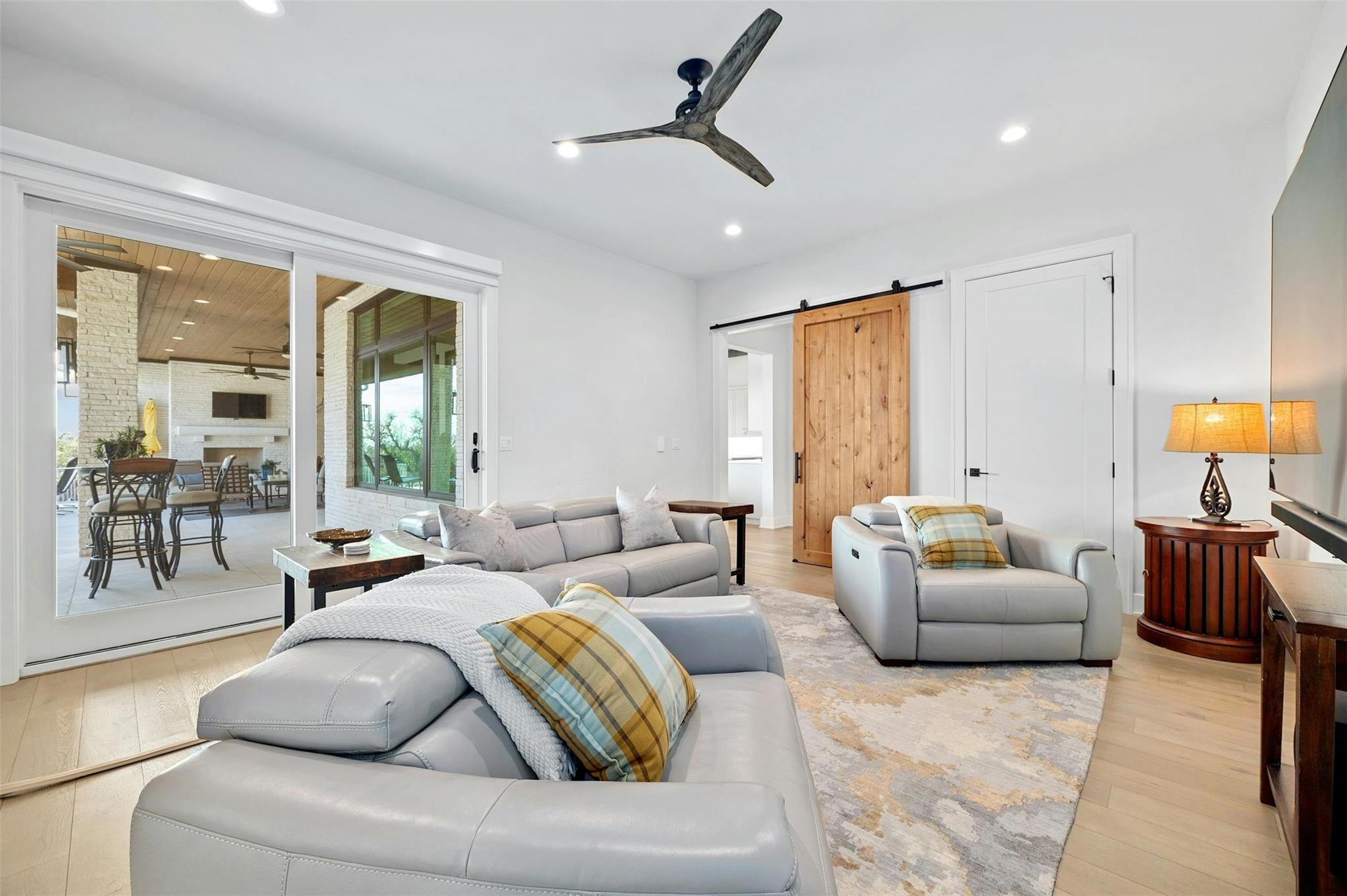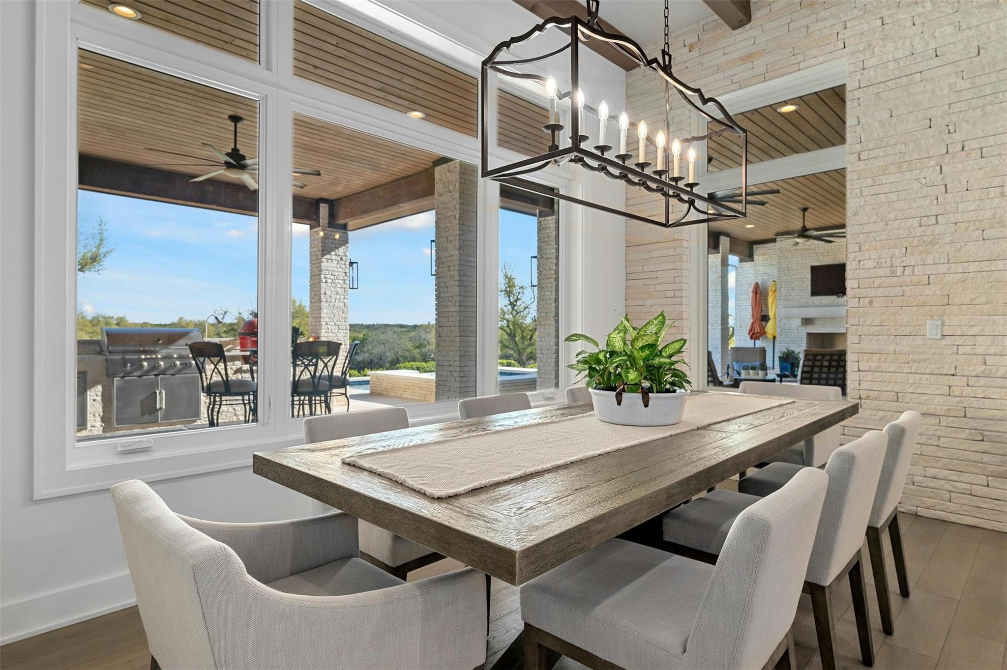 Located in the prestigious gated community of Belvedere, this single story 4-bedroom home has beautiful hill country views and is located on a quiet cul-de-sac. Built by award winning Arbogast homes and designed by Kai Geske, this gated property sits on 2.5 acres with many live oaks. The open concept living area is spacious and bright with large windows that allow for natural light. The high ceilings are complemented with large wood beams. The chef's kitchen includes an oversized island, professional grade Thermador stainless steel appliances, gas cooking and a built in Miele coffee machine. The spacious primary suite offers beautiful views, a spacious walk-in shower, and soaking tub. The outdoor kitchen is perfect for entertaining with a covered patio, outdoor living area, fireplace and pool. The four-car garage includes an airconditioned bay with an interior safe room, full stair access to the attic and automatic lift to load heavy items. Belvedere is an award winning community which includes a lazy river, kids splash pad, community sport court, natural trails, fishing pond and 80 acres of nature preserve. Belvedere is under 20 miles from Downtown Austin and just minutes from Bee Cave, Lakeway, and Dripping Springs