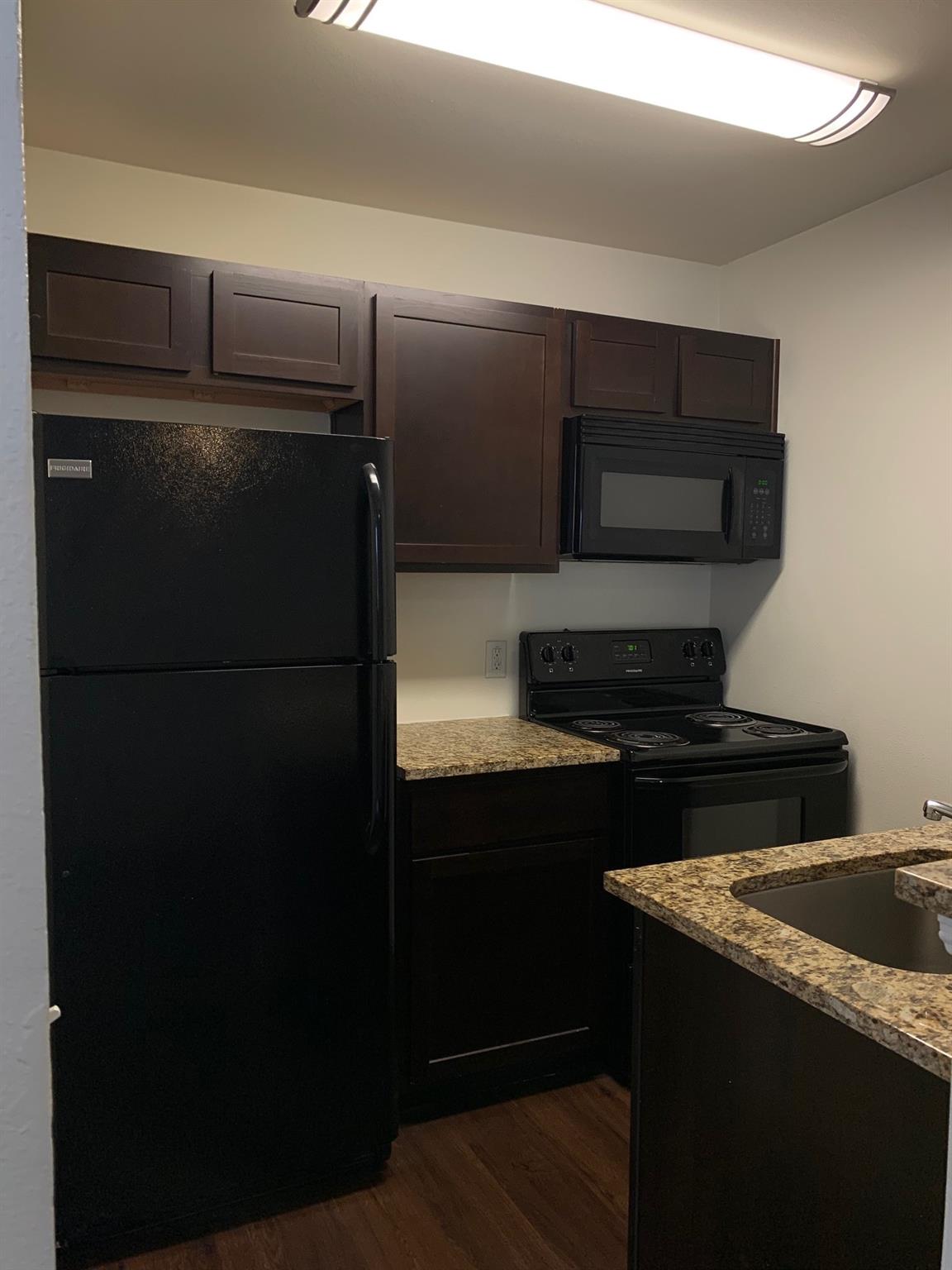 This 1st floor studio apartment features vaulted granite counter tops, black appliances, vinyl plank wood floors throughout, is Google Fiber ready and is right next door to Gillis Park !