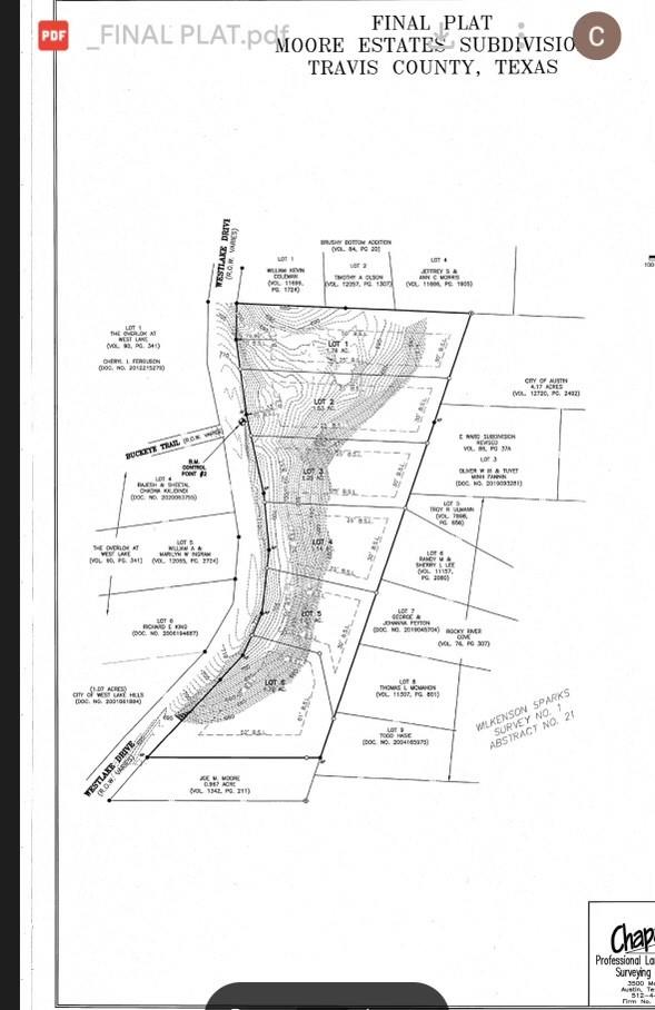A unique opportunity to buy a 1.76 acre lot with privacy in Eanes School District. Close to everything and easily accessible. City sewer and water are available - lot has easy topography for building. This is one of 6 lots that will be situated off a private drive coming off Westlake Dr so each lot can access off this private drive. Very private setting with dry creek in far back of property.