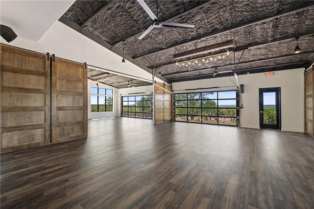 This desirable location with heavy traffic and panoramic long-distant sunset views is perfect for your business. An unrestricted 10 acres with over 400 ft of frontage on Fitzhugh across from Jester King Brewery, near Distillers and outdoor eateries. Currently used for events and yoga studio, this property offers numerous opportunities such as a wedding venue, tasting room, spa retreat center- the possibilities are endless. Two steel buildings, with stucco facades nestled between trees feature amazing views out the back seen through ample windows and glass motorized doors that brings the Hill Country inside. The larger building is 4,000 sq ft and features 3 separate rooms, with a lobby, 3 full restrooms, 2 showers, a prep kitchen with gas range, washer/dryer combo, sink and refrigerator. All countertops are black leathered granite and showers have black basalt tiles 8’ up the walls. There is a 4-zone audio system with Bluetooth and mic panels in each of the three rooms and all rooms are separated by large double barn doors including from the central room to the lobby allowing for the whole place to be opened or separated into any combination. The second building is 2,000 sq ft and has just one large open space with a front counter, 2 bathrooms and a storage room. There is a large artificial turf installation of 2,400 sq ft directly behind the smaller building. A 30,000-gallon rainwater tank connects both buildings with a possible 140,000 gallons that can be caught per year from the average rainfall in the area.