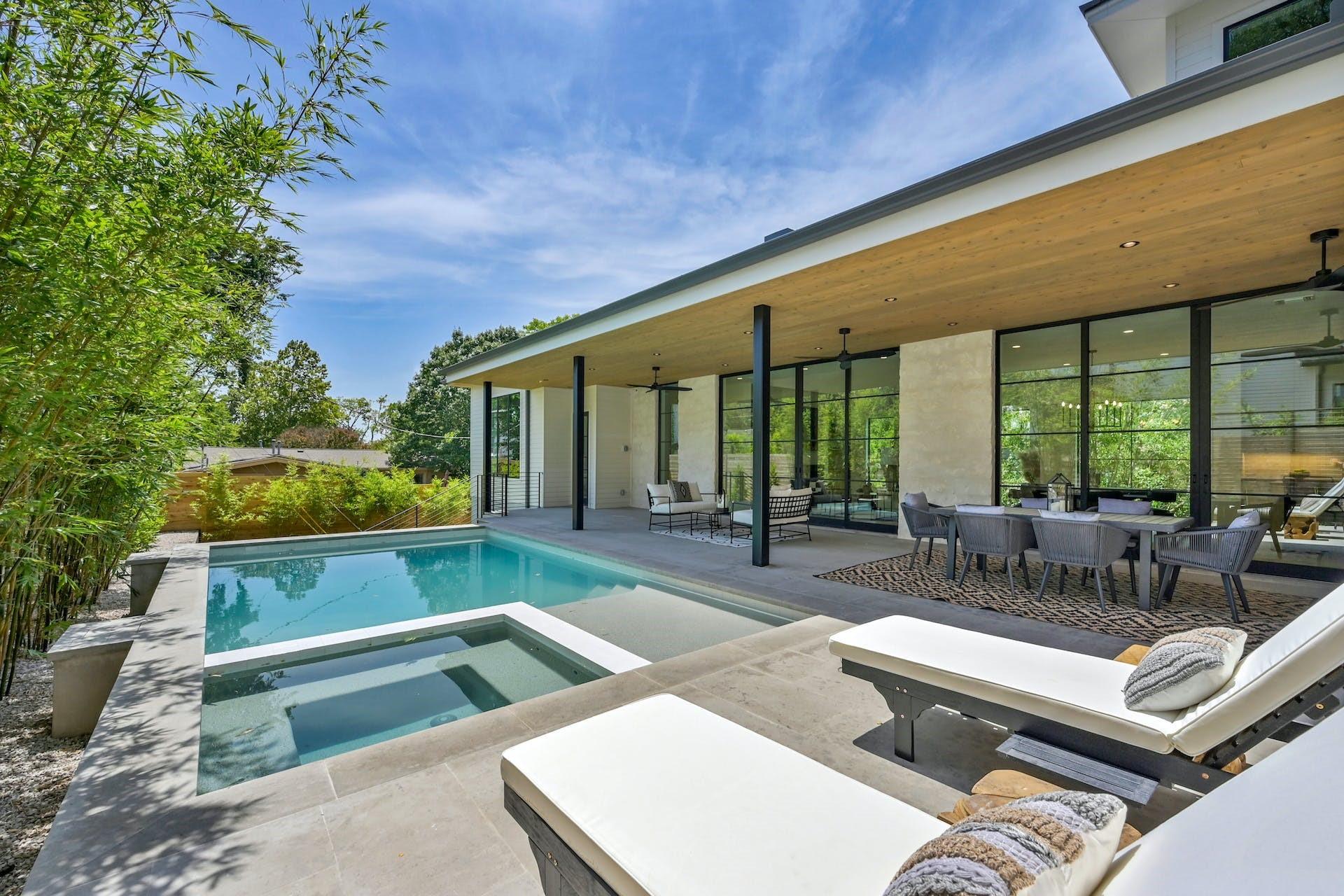 Gorgeous new build by Moazami Homes. This stunning home is located on a quiet street in the heart of Barton Hills. Walk to everything! Big open floorplan perfect for entertaining. Walls of windows and doors flood the home with natural light. The indoors and outdoors connect seamlessly. Main level features master suite, guest suite and office. Upstairs features two oversized en suite beds and a massive game room. Custom features include: Miele appliances, Western sliding door systems, metal roof, stone with slurry, French oak floors, white oak cabinets, soapstone counters, designer plumbing/lighting/tile, expansize outdoor living, custom outdoor kitchen and a sparkling pool & spa. This is rare opportunity to purchase a home built by one of Austin's finest luxury builders.