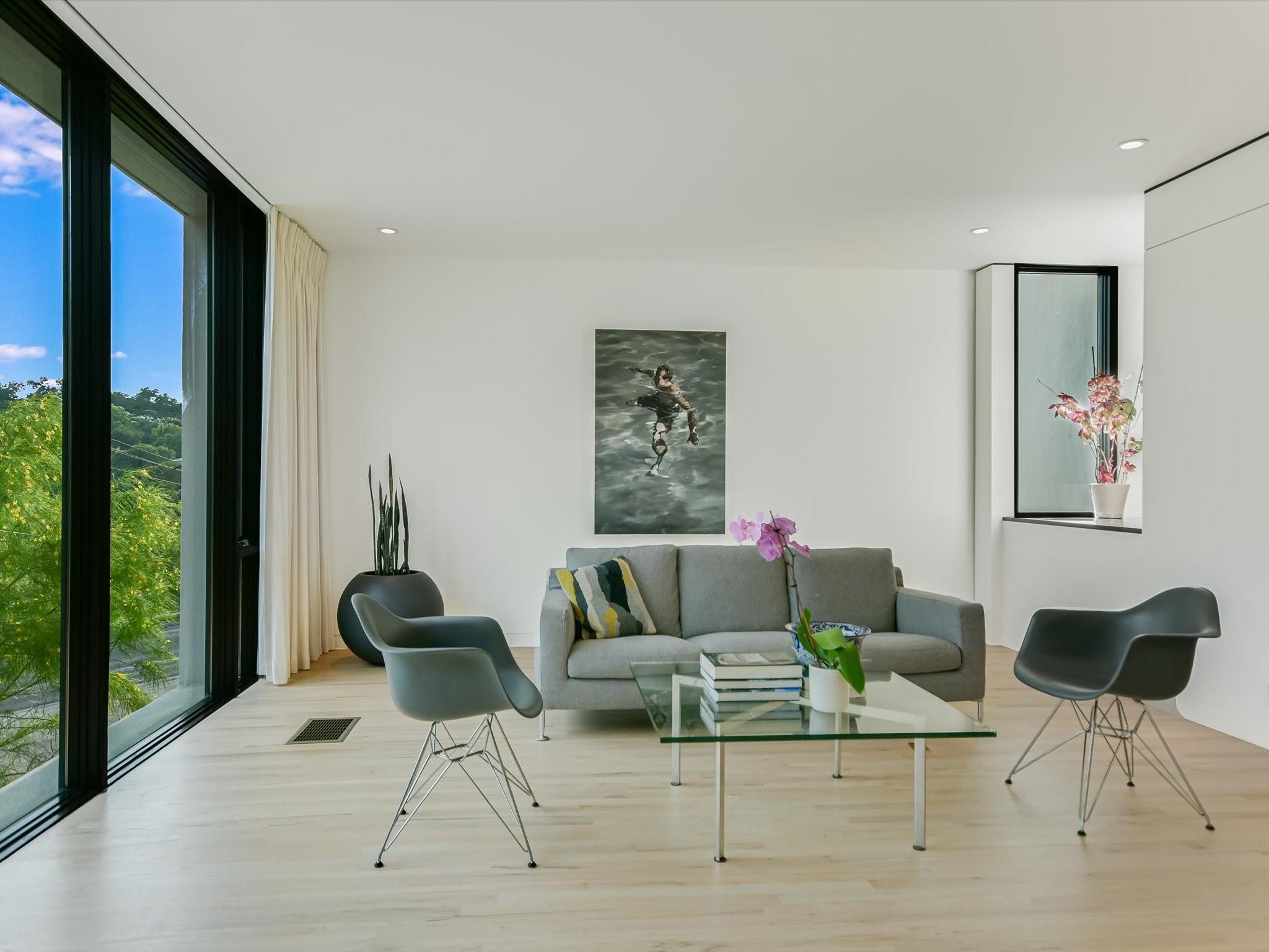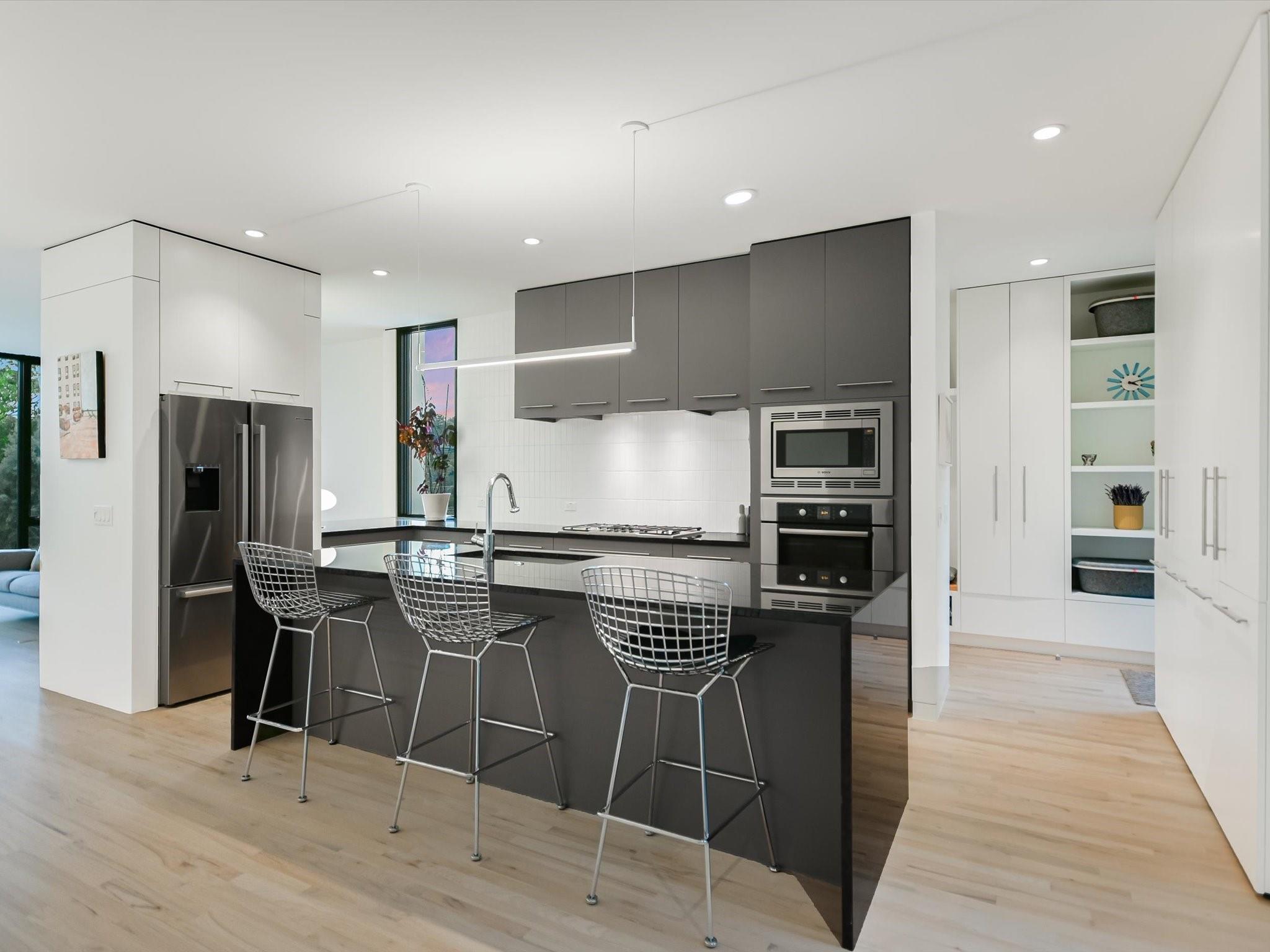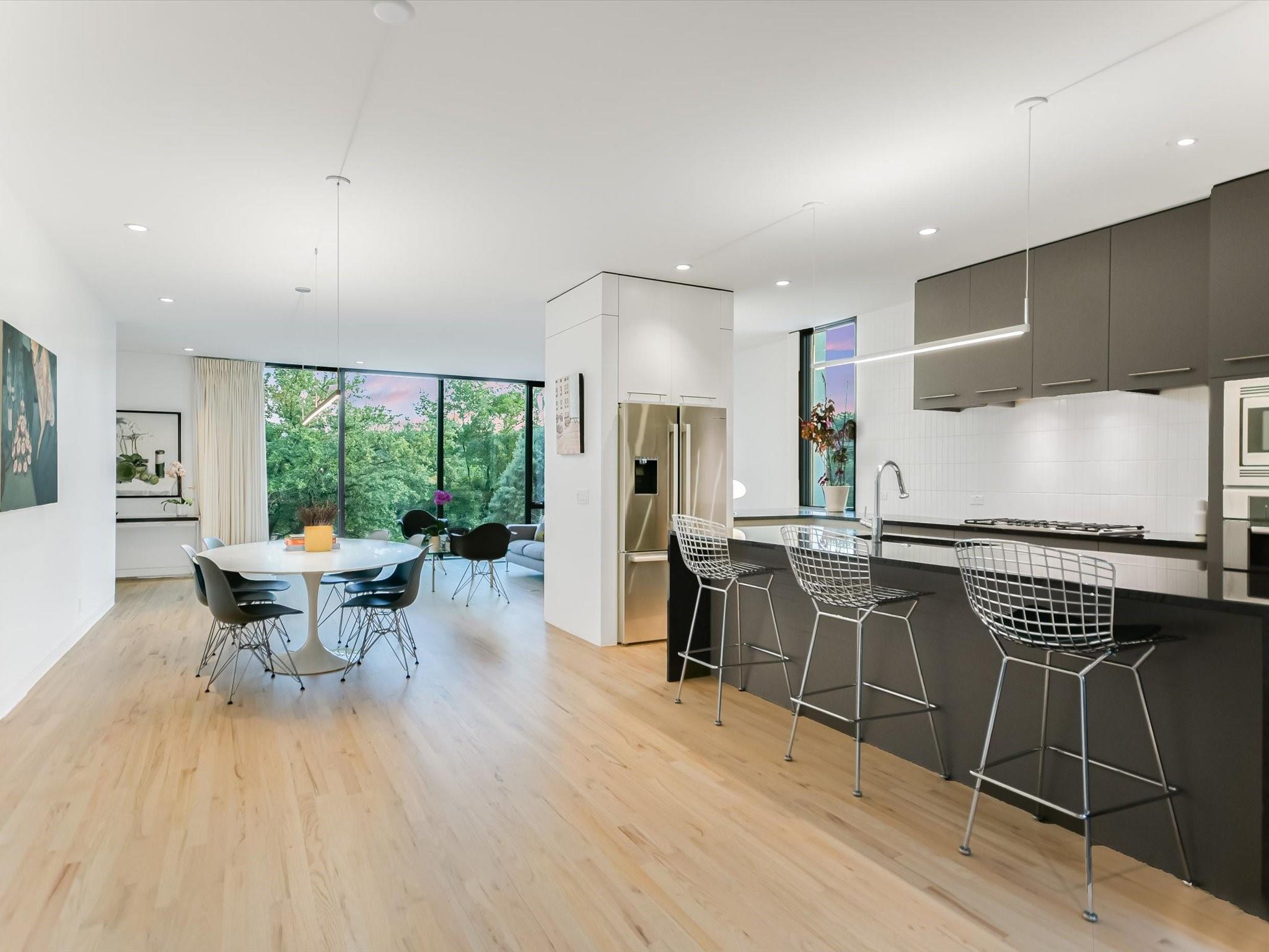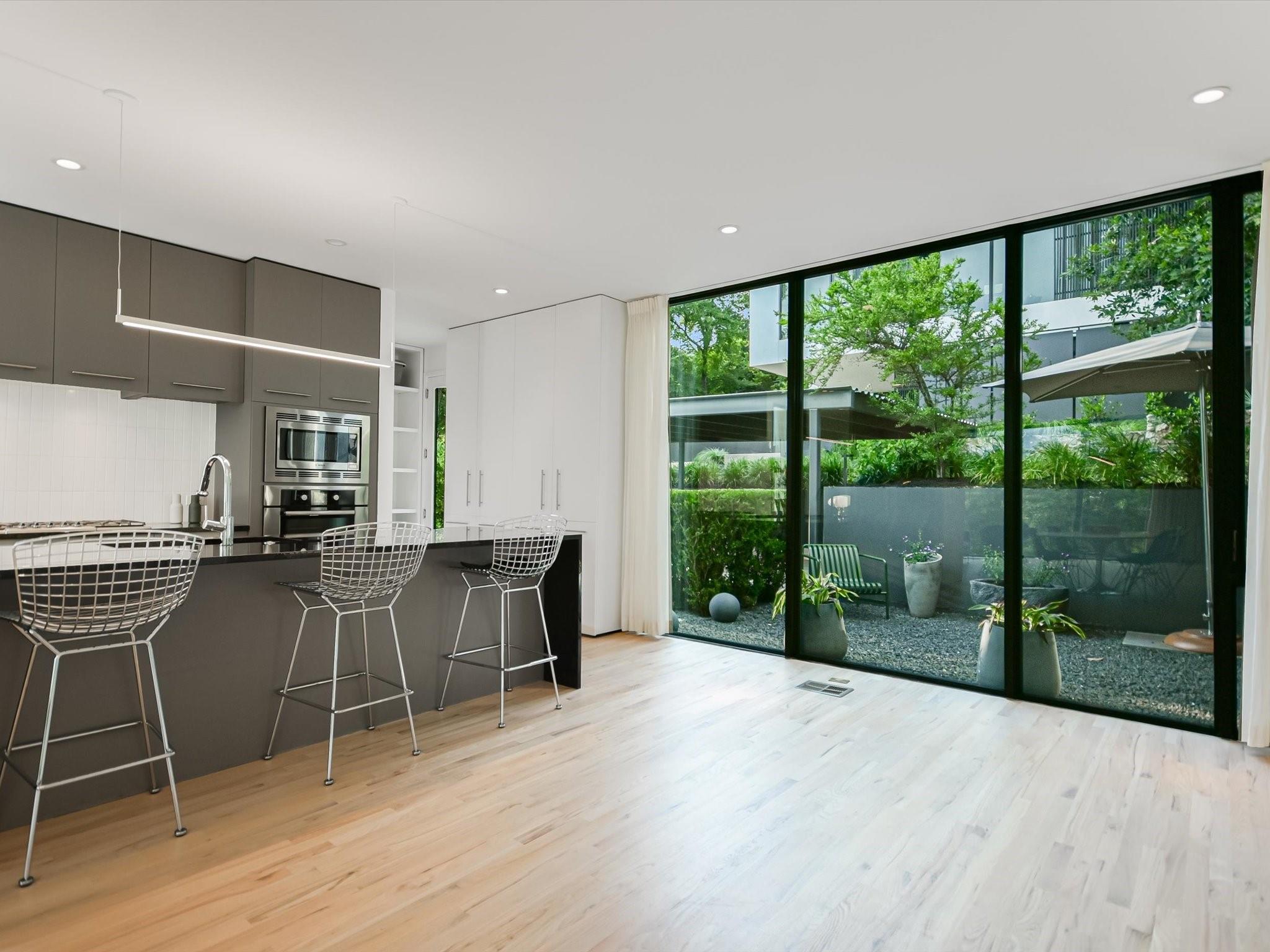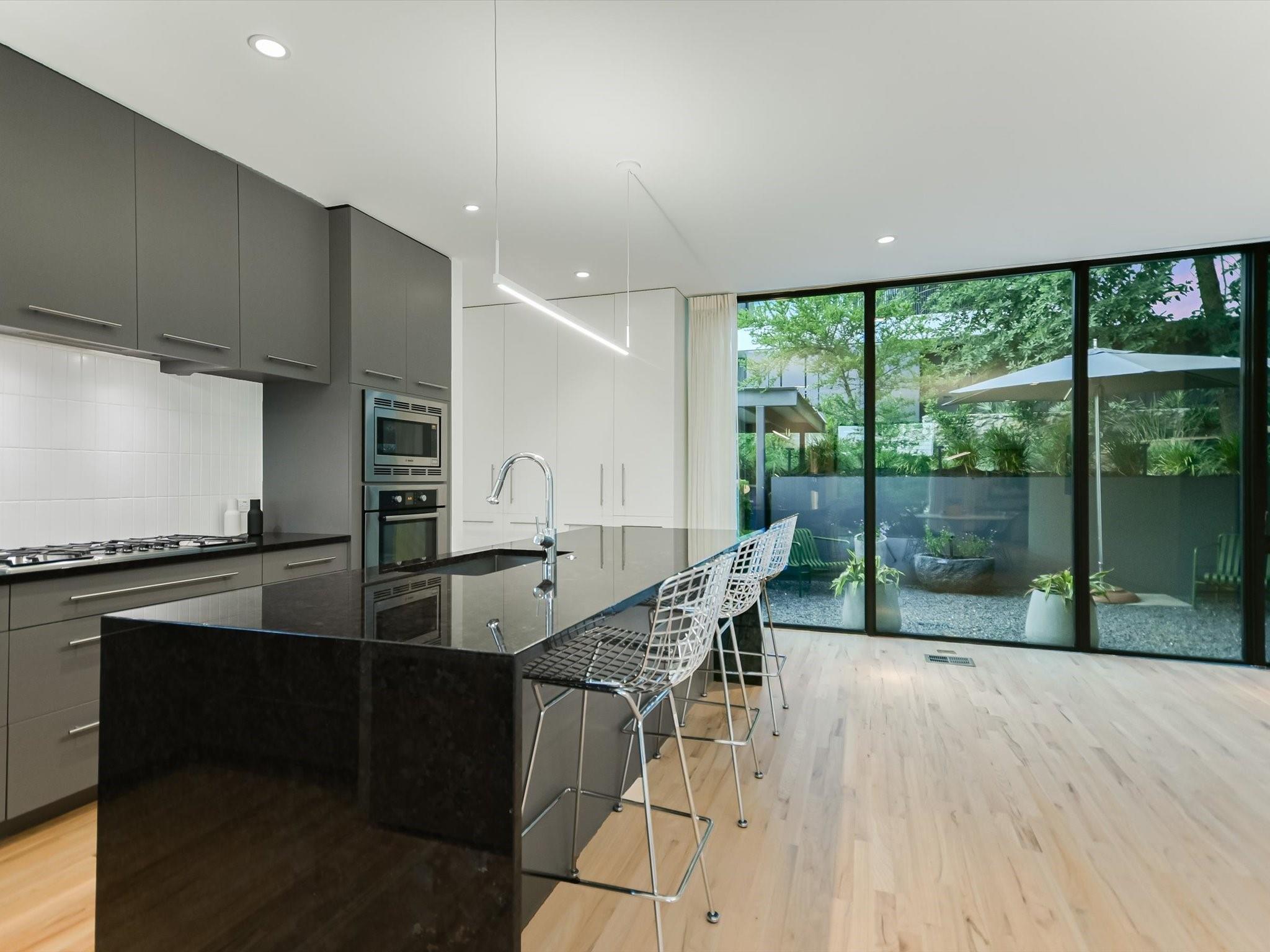Hillside pied-de-terre with stunning downtown skyline and Pease Park views. Winner of a national design award, the home was designed by celebrated architecture firm Alterstudio. Tucked on a private hillside street across from Shoal Creek and surrounded by mature, lush trees you’ll feel secluded by the greenery, yet you are walking distance from downtown, Pease Park and the University of Texas at Austin campus. Designed for a robust, urban lifestyle, the home offers perfect spaces for entertaining, working and relaxing. The main floor living room and kitchen are bracketed front and back by floor-to-ceiling windows that fill the rooms with light. When entertaining, guests can wander out to the secluded back courtyard or up to the shaded garden area; but the ultimate gathering spot is the oversized deck on the second floor which has a stunning view of the downtown skyline and Pease Park. A second living area on the main floor is perfect as a viewing room, den or work-from-home space; two additional bedrooms on this floor offer room for family or guests, complete with a shared bathroom. The upper floor hosts the refined primary suite. The bath features a large shower with a view, soaking tub, double vanities and walk-in closet with custom storage. A sitting room on this floor is perfect for a second office, exercise room or just a relaxation space with treetop views. The interior finishes create a calm, refined place to live, with warm, bleached-oak flooring offering an organic element that is complemented by fresh white walls to display an art collection. Signature architectural elements of the Alterstudio aesthetic include sleek integrated baseboards and built-in cabinetry, subtly luxurious materials and window placement that strategically illuminates each room while maintaining privacy. The European-style kitchen is a beautifully-designed focal point with custom cabinetry, marble countertops and plenty of storage to keep the space looking sleek.
