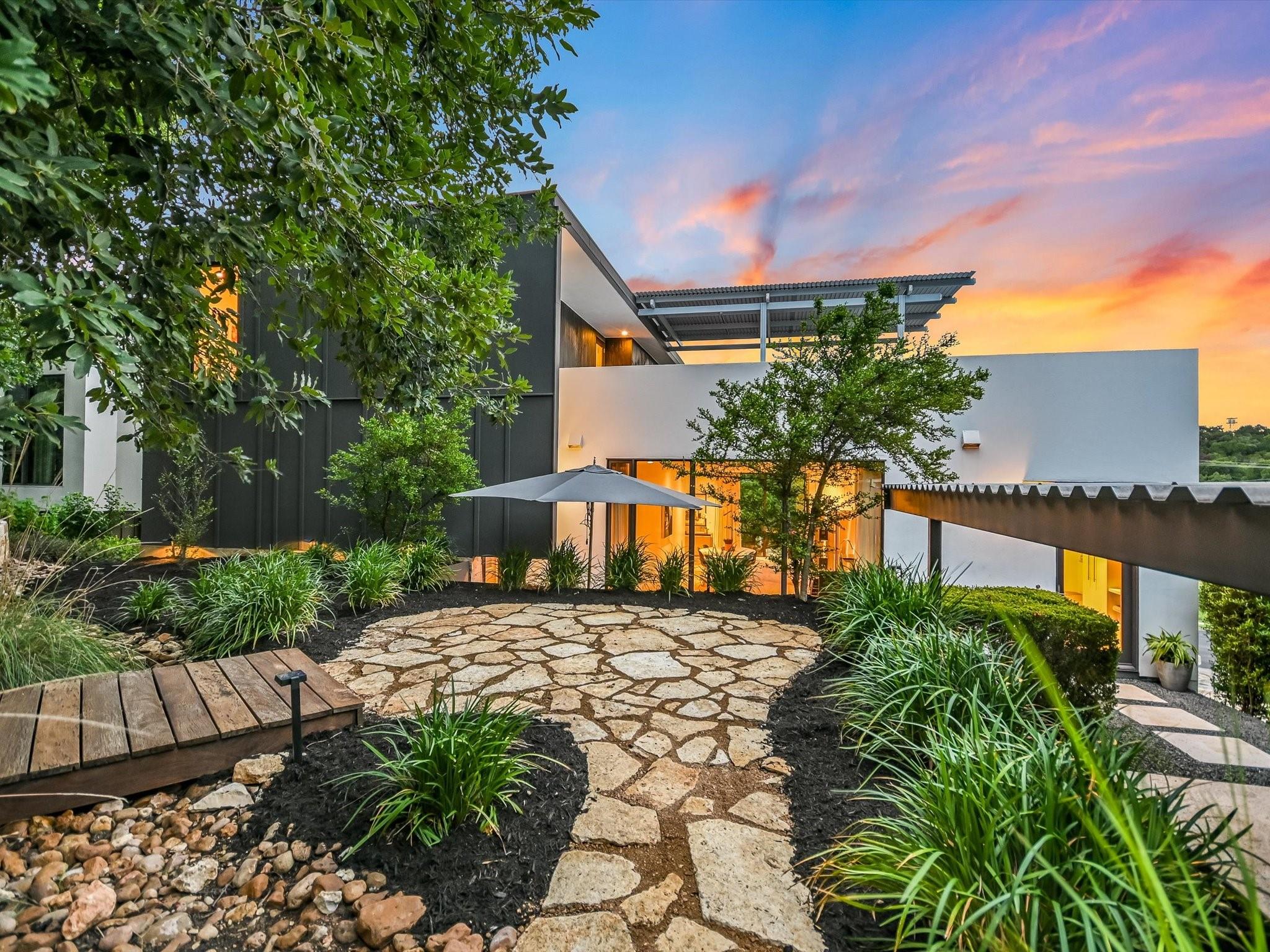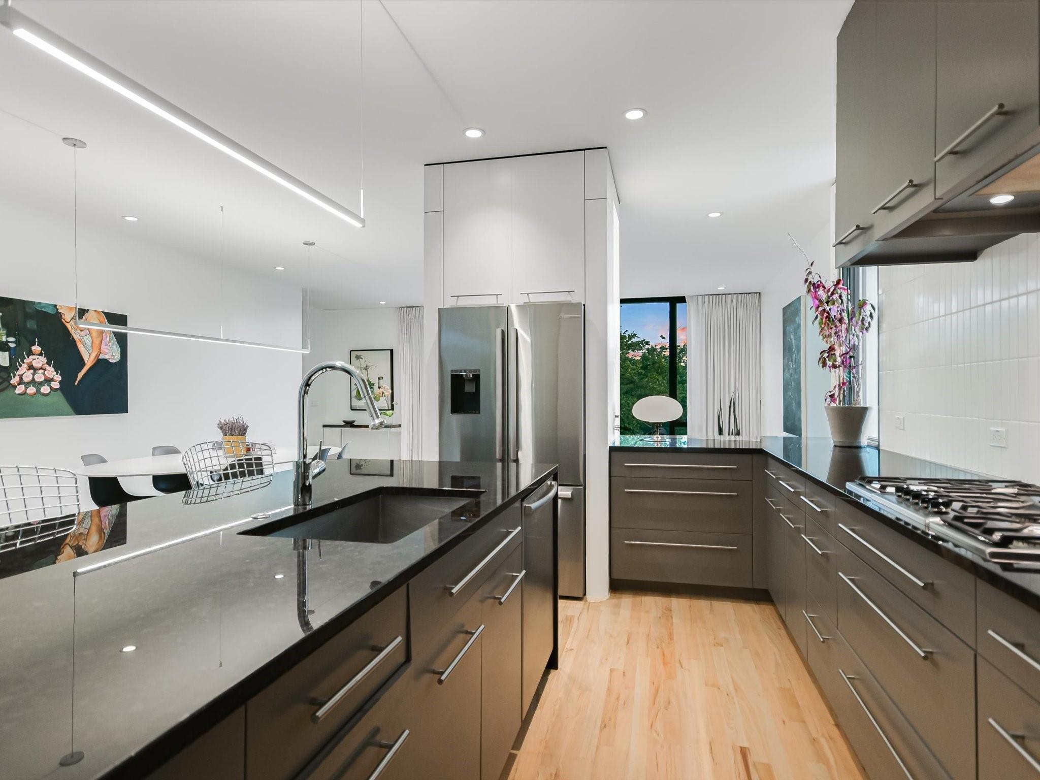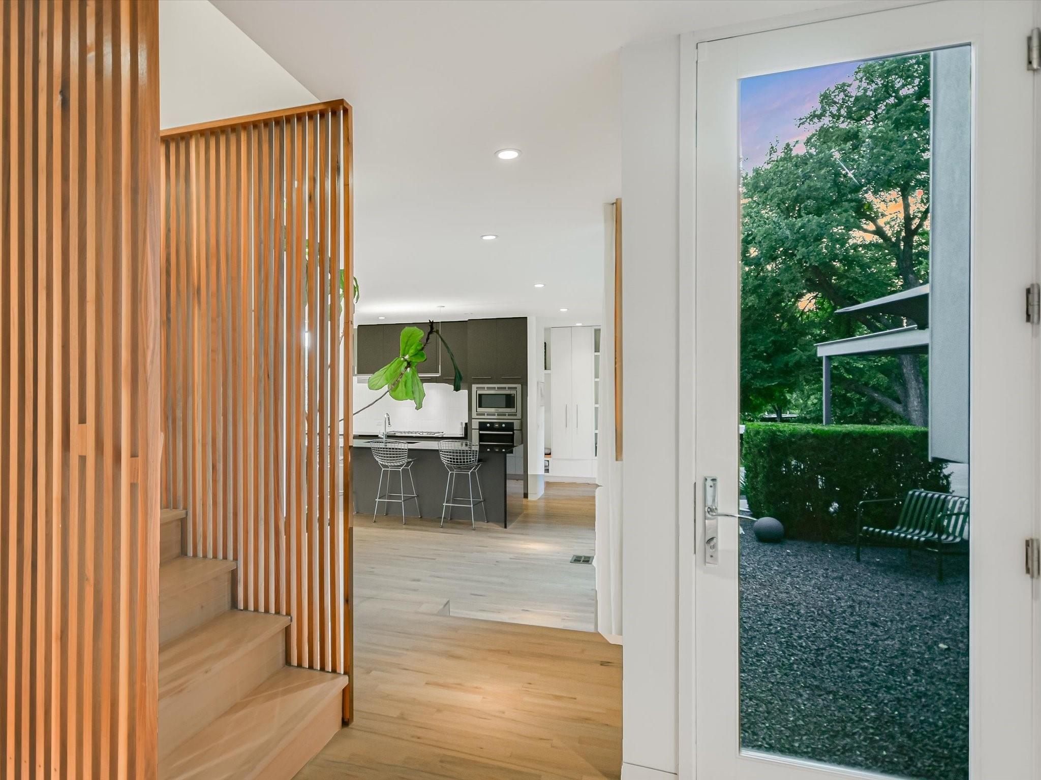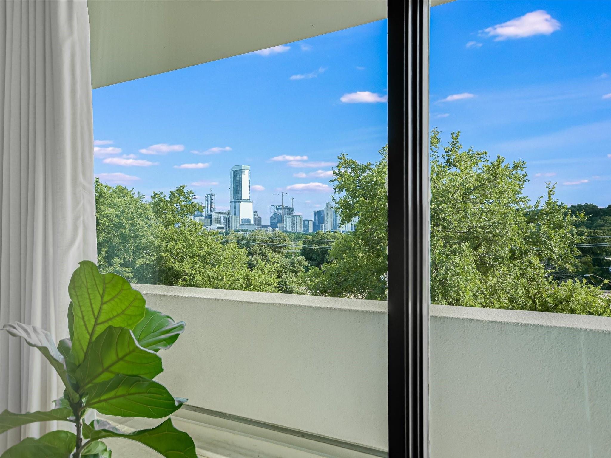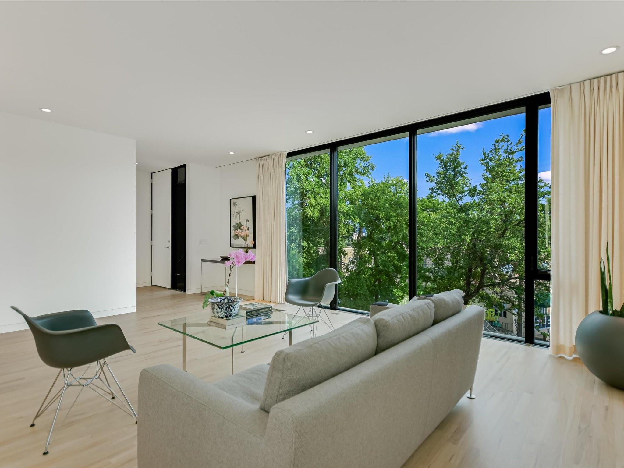 Hillside pied-de-terre with stunning downtown skyline and Pease Park views. Winner of a national design award, the home was designed by celebrated architecture firm Alterstudio. Tucked on a private hillside street across from Shoal Creek and surrounded by mature, lush trees you’ll feel secluded by the greenery, yet you are walking distance from downtown, Pease Park and the University of Texas at Austin campus. Designed for a robust, urban lifestyle, the home offers perfect spaces for entertaining, working and relaxing. The main floor living room and kitchen are bracketed front and back by floor-to-ceiling windows that fill the rooms with light. When entertaining, guests can wander out to the secluded back courtyard or up to the shaded garden area; but the ultimate gathering spot is the oversized deck on the second floor which has a stunning view of the downtown skyline and Pease Park. A second living area on the main floor is perfect as a viewing room, den or work-from-home space; two additional bedrooms on this floor offer room for family or guests, complete with a shared bathroom. The upper floor hosts the refined primary suite. The bath features a large shower with a view, soaking tub, double vanities and walk-in closet with custom storage. A sitting room on this floor is perfect for a second office, exercise room or just a relaxation space with treetop views. The interior finishes create a calm, refined place to live, with warm, bleached-oak flooring offering an organic element that is complemented by fresh white walls to display an art collection. Signature architectural elements of the Alterstudio aesthetic include sleek integrated baseboards and built-in cabinetry, subtly luxurious materials and window placement that strategically illuminates each room while maintaining privacy. The European-style kitchen is a beautifully-designed focal point with custom cabinetry, marble countertops and plenty of storage to keep the space looking sleek.