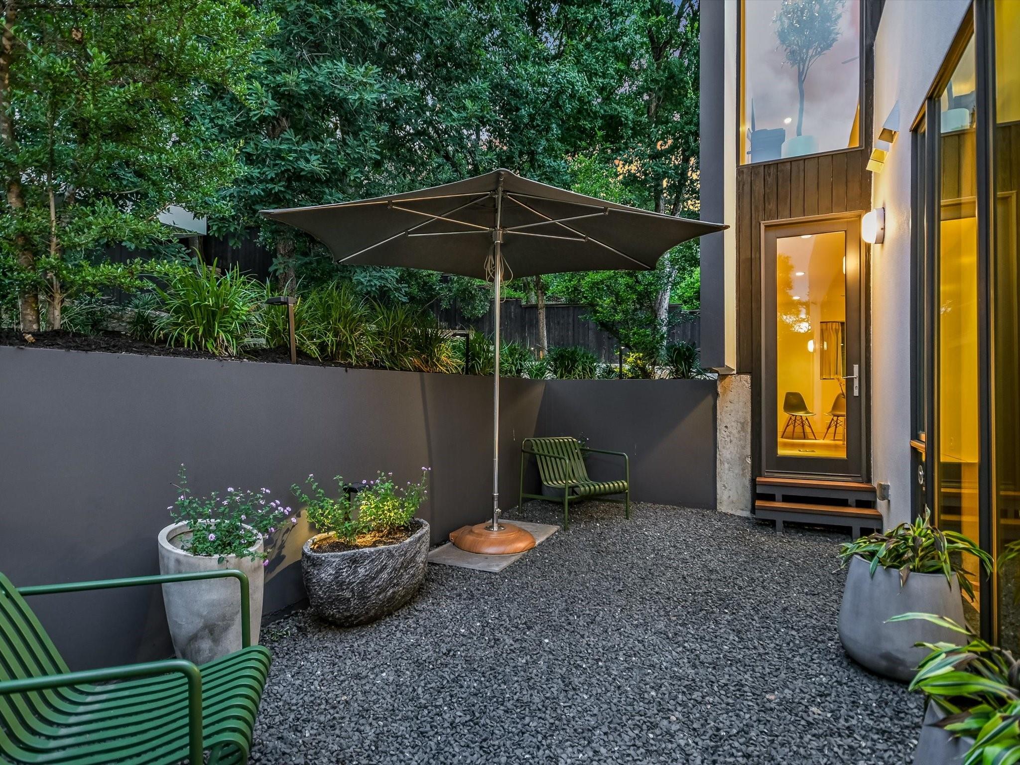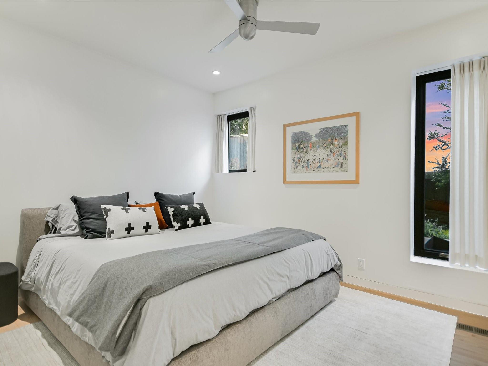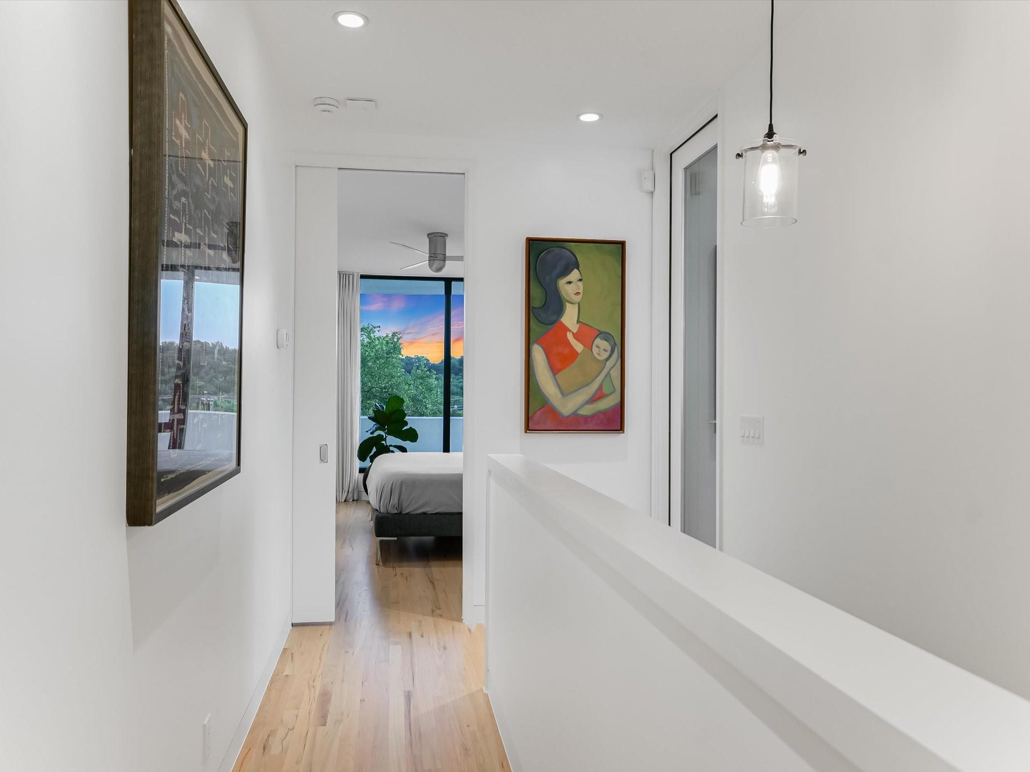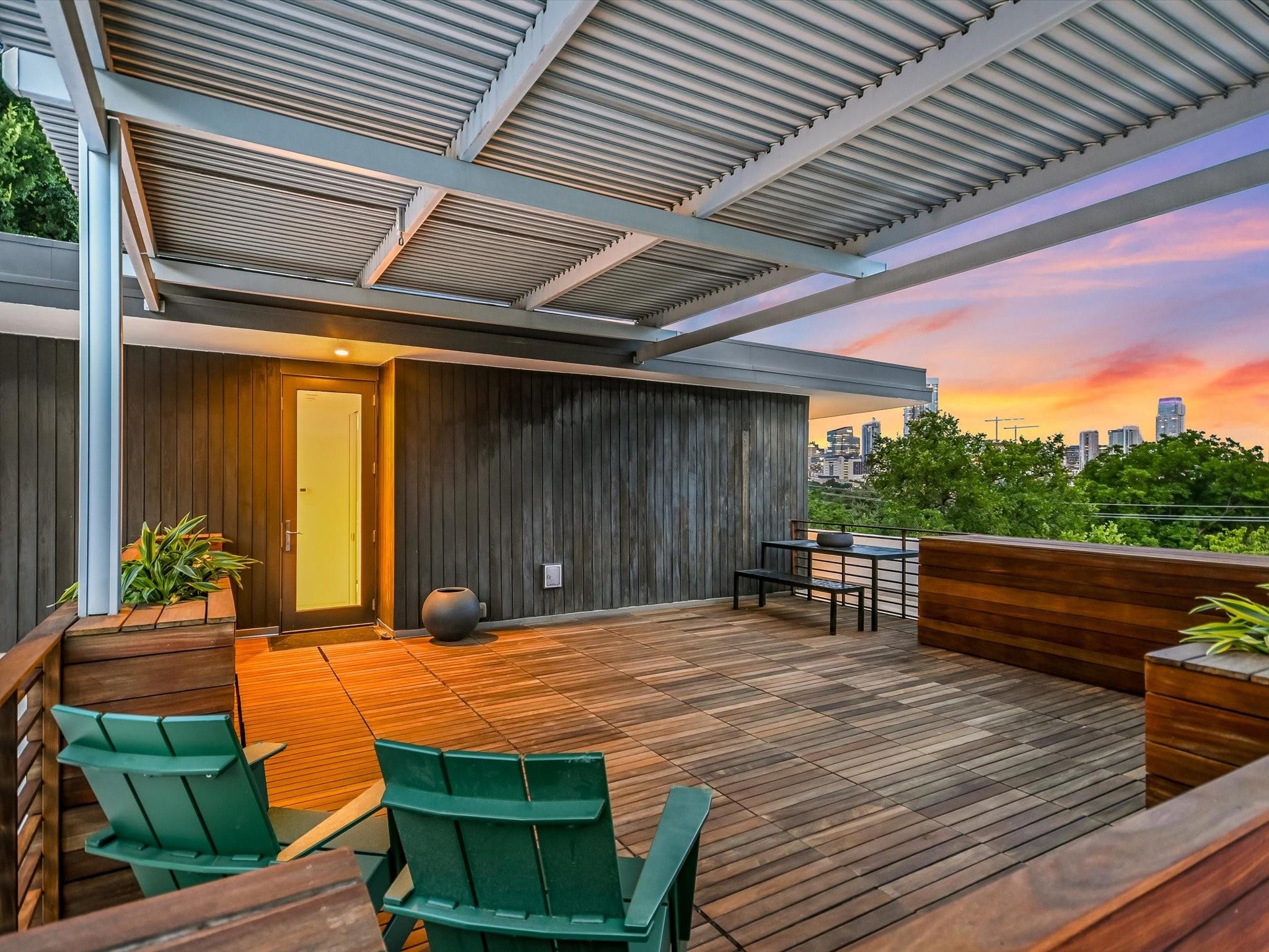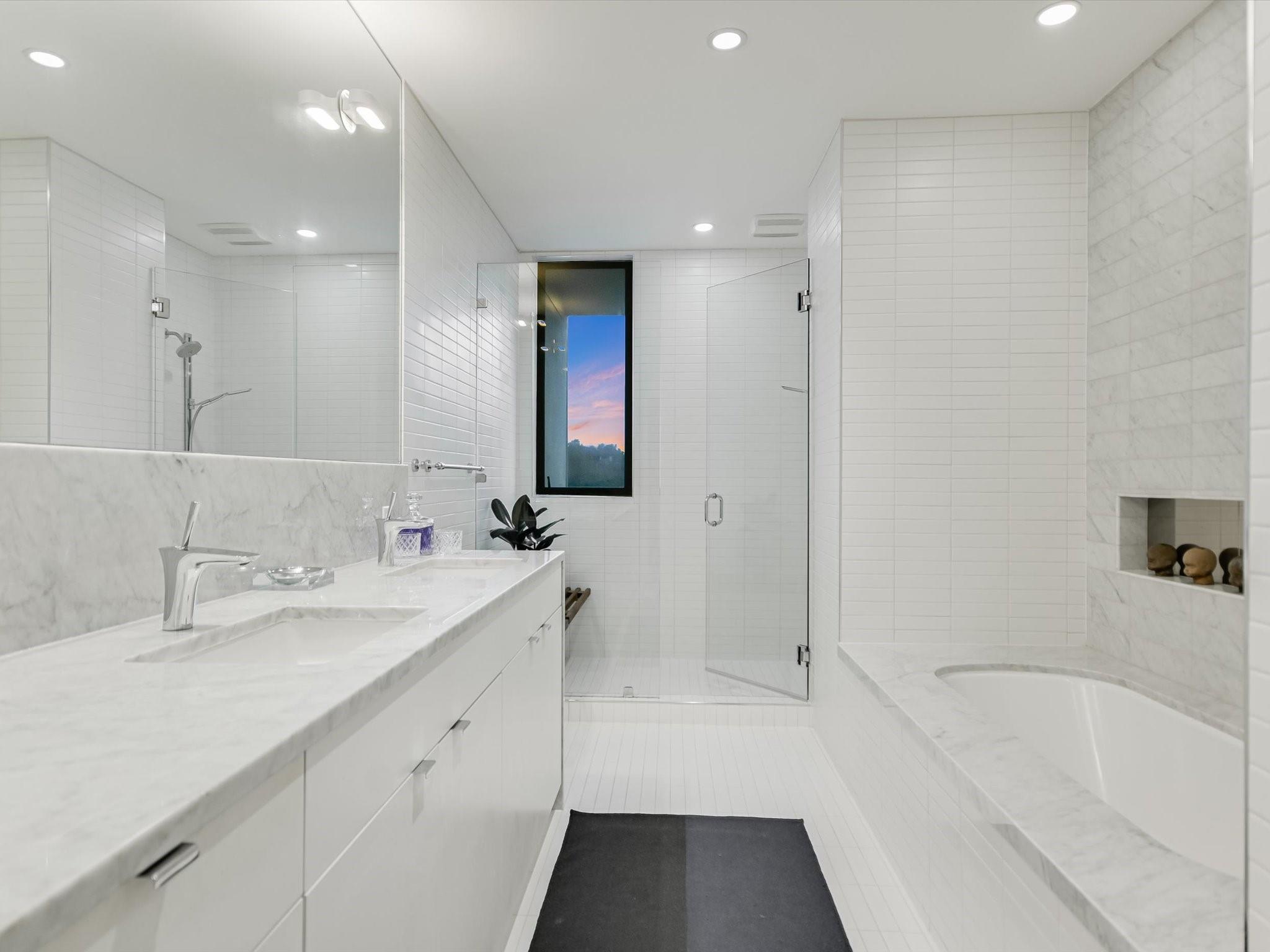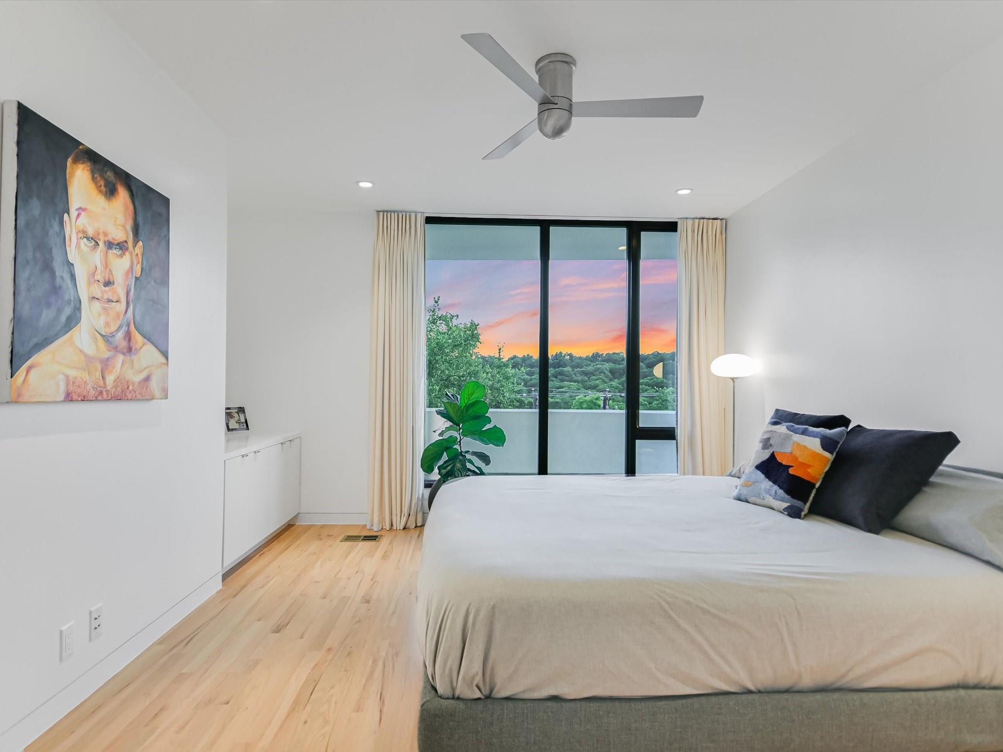 Hillside pied-de-terre with stunning downtown skyline and Pease Park views. Winner of a national design award, the home was designed by celebrated architecture firm Alterstudio. Tucked on a private hillside street across from Shoal Creek and surrounded by mature, lush trees you’ll feel secluded by the greenery, yet you are walking distance from downtown, Pease Park and the University of Texas at Austin campus. Designed for a robust, urban lifestyle, the home offers perfect spaces for entertaining, working and relaxing. The main floor living room and kitchen are bracketed front and back by floor-to-ceiling windows that fill the rooms with light. When entertaining, guests can wander out to the secluded back courtyard or up to the shaded garden area; but the ultimate gathering spot is the oversized deck on the second floor which has a stunning view of the downtown skyline and Pease Park. A second living area on the main floor is perfect as a viewing room, den or work-from-home space; two additional bedrooms on this floor offer room for family or guests, complete with a shared bathroom. The upper floor hosts the refined primary suite. The bath features a large shower with a view, soaking tub, double vanities and walk-in closet with custom storage. A sitting room on this floor is perfect for a second office, exercise room or just a relaxation space with treetop views. The interior finishes create a calm, refined place to live, with warm, bleached-oak flooring offering an organic element that is complemented by fresh white walls to display an art collection. Signature architectural elements of the Alterstudio aesthetic include sleek integrated baseboards and built-in cabinetry, subtly luxurious materials and window placement that strategically illuminates each room while maintaining privacy. The European-style kitchen is a beautifully-designed focal point with custom cabinetry, marble countertops and plenty of storage to keep the space looking sleek.