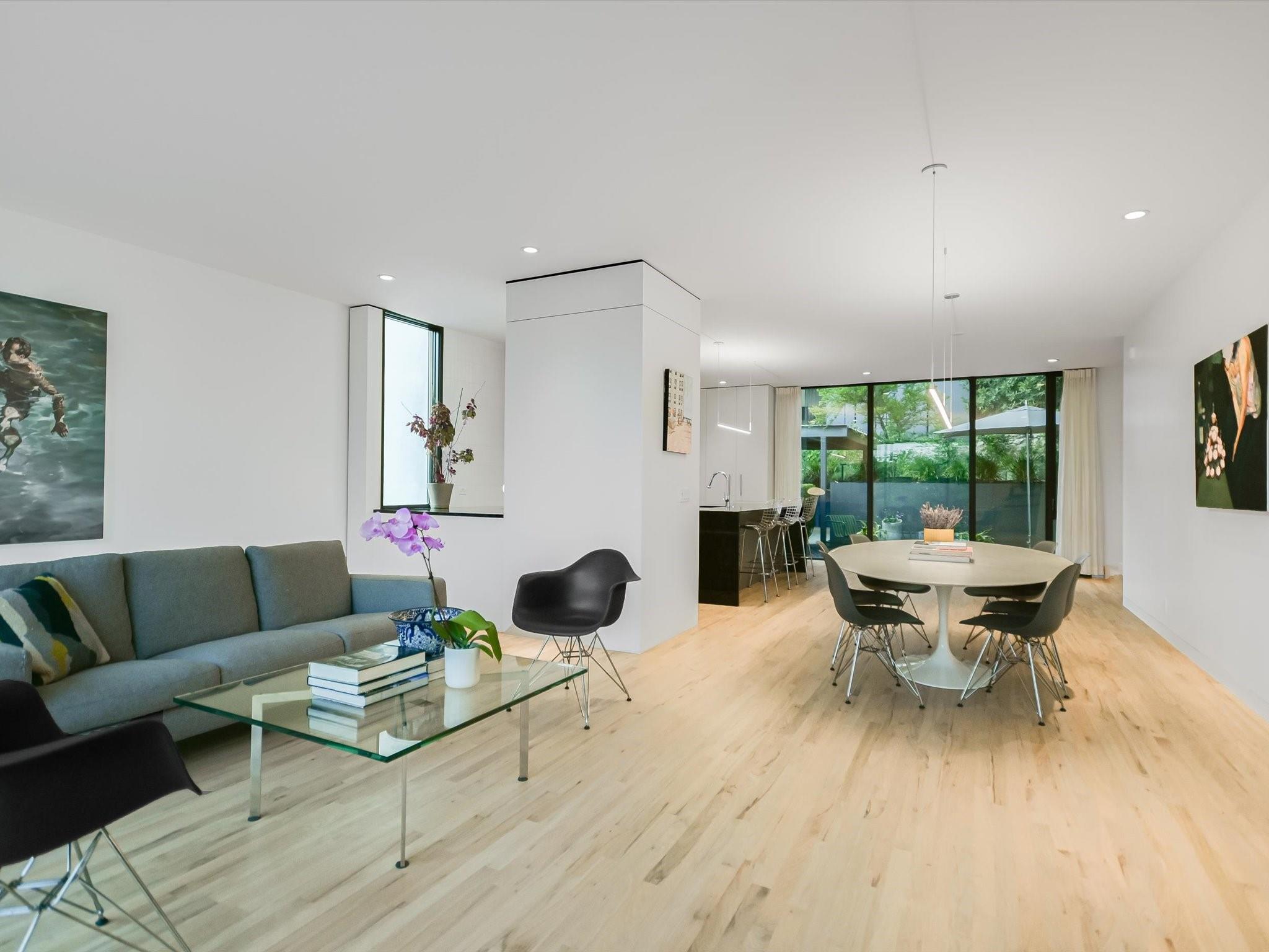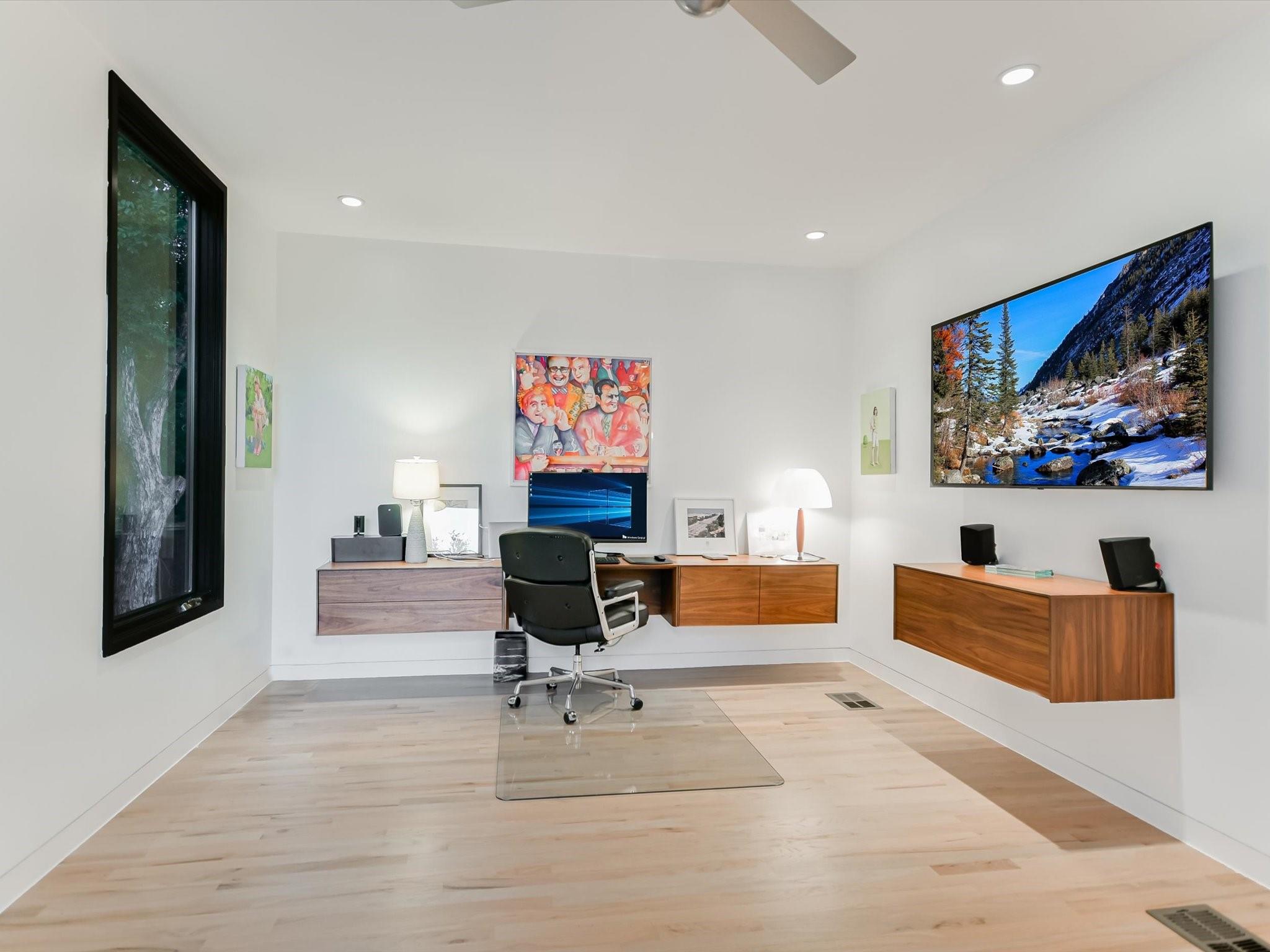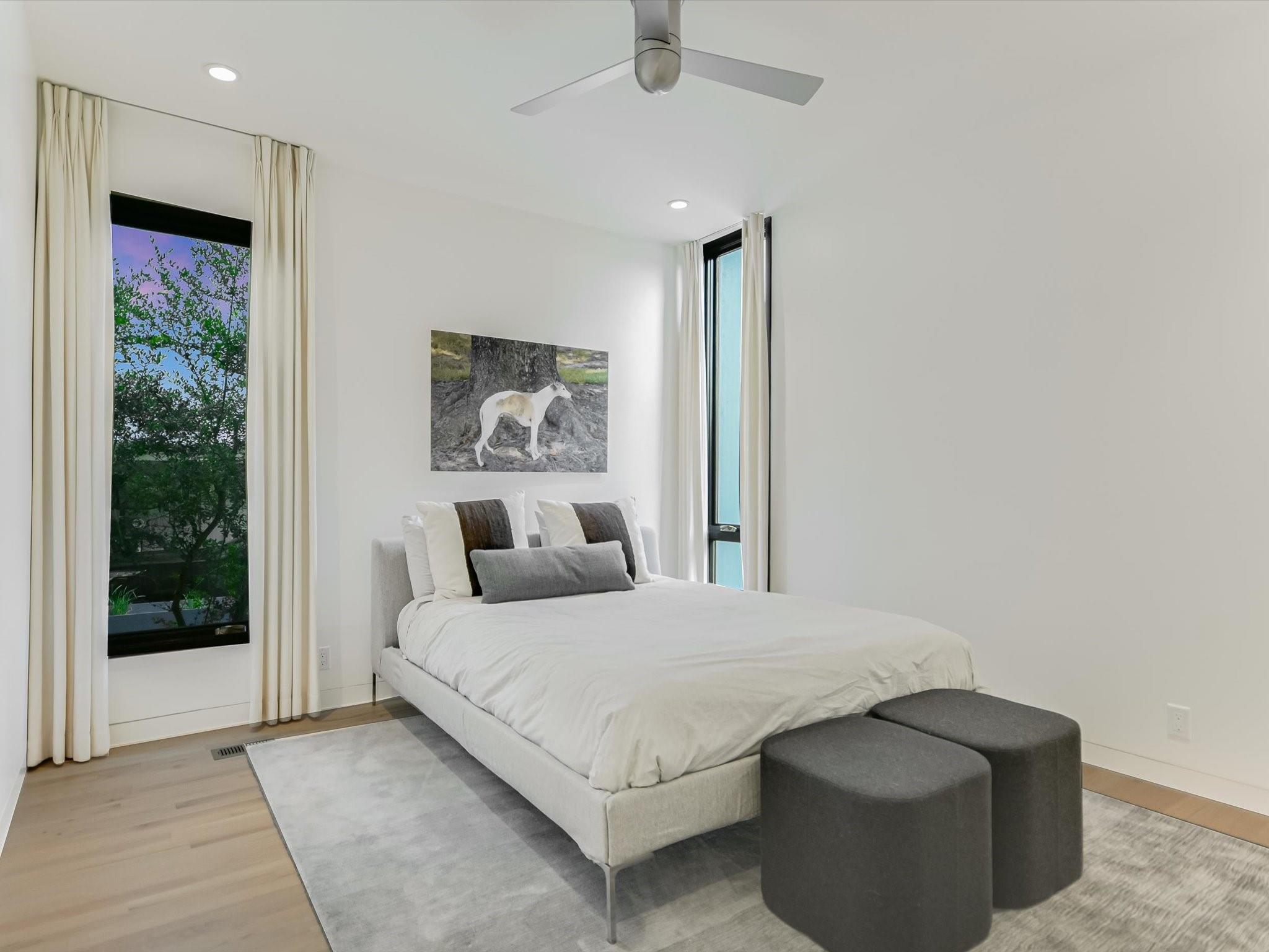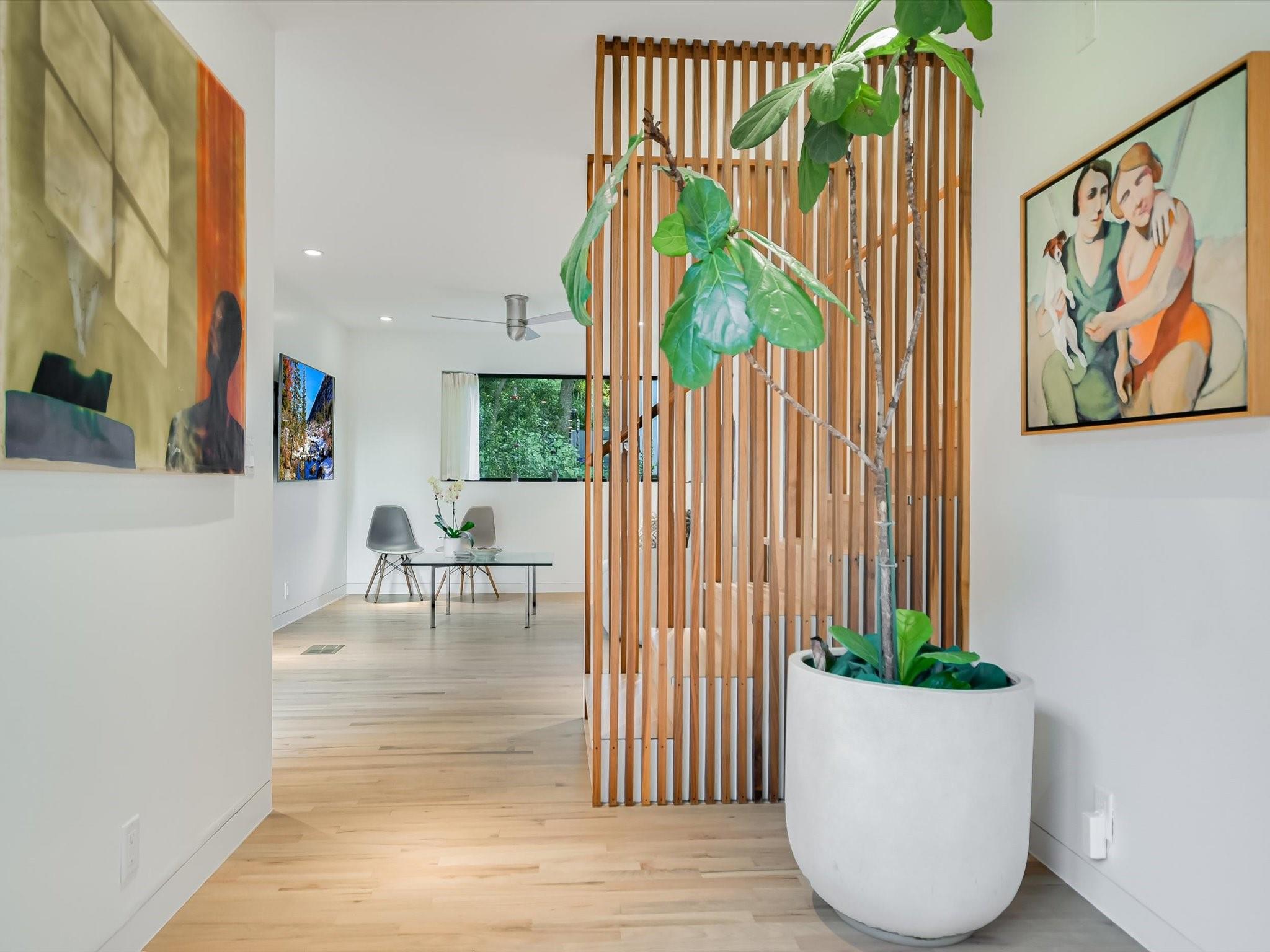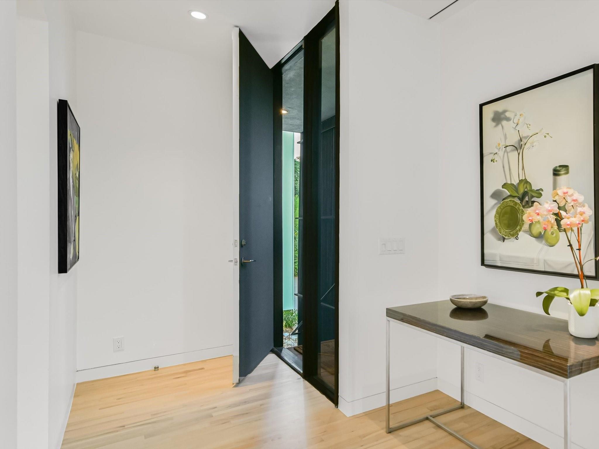 Hillside pied-de-terre with stunning downtown skyline and Pease Park views. Winner of a national design award, the home was designed by celebrated architecture firm Alterstudio. Tucked on a private hillside street across from Shoal Creek and surrounded by mature, lush trees you’ll feel secluded by the greenery, yet you are walking distance from downtown, Pease Park and the University of Texas at Austin campus. Designed for a robust, urban lifestyle, the home offers perfect spaces for entertaining, working and relaxing. The main floor living room and kitchen are bracketed front and back by floor-to-ceiling windows that fill the rooms with light. When entertaining, guests can wander out to the secluded back courtyard or up to the shaded garden area; but the ultimate gathering spot is the oversized deck on the second floor which has a stunning view of the downtown skyline and Pease Park. A second living area on the main floor is perfect as a viewing room, den or work-from-home space; two additional bedrooms on this floor offer room for family or guests, complete with a shared bathroom. The upper floor hosts the refined primary suite. The bath features a large shower with a view, soaking tub, double vanities and walk-in closet with custom storage. A sitting room on this floor is perfect for a second office, exercise room or just a relaxation space with treetop views. The interior finishes create a calm, refined place to live, with warm, bleached-oak flooring offering an organic element that is complemented by fresh white walls to display an art collection. Signature architectural elements of the Alterstudio aesthetic include sleek integrated baseboards and built-in cabinetry, subtly luxurious materials and window placement that strategically illuminates each room while maintaining privacy. The European-style kitchen is a beautifully-designed focal point with custom cabinetry, marble countertops and plenty of storage to keep the space looking sleek.