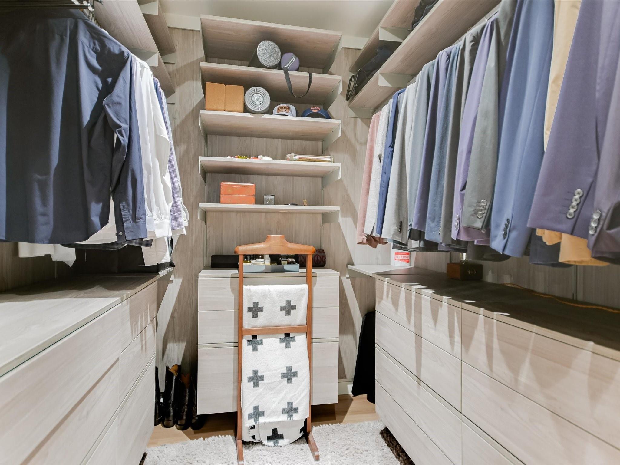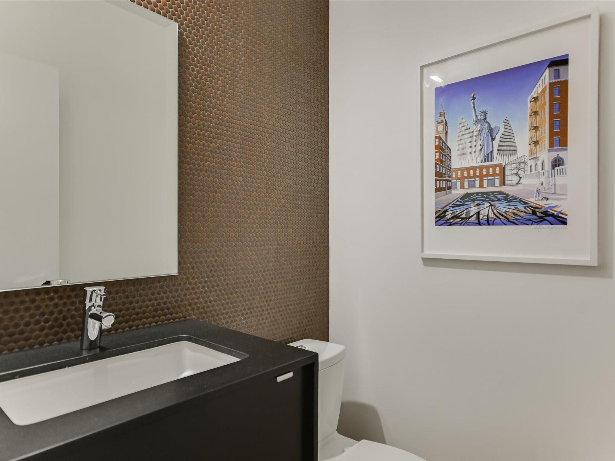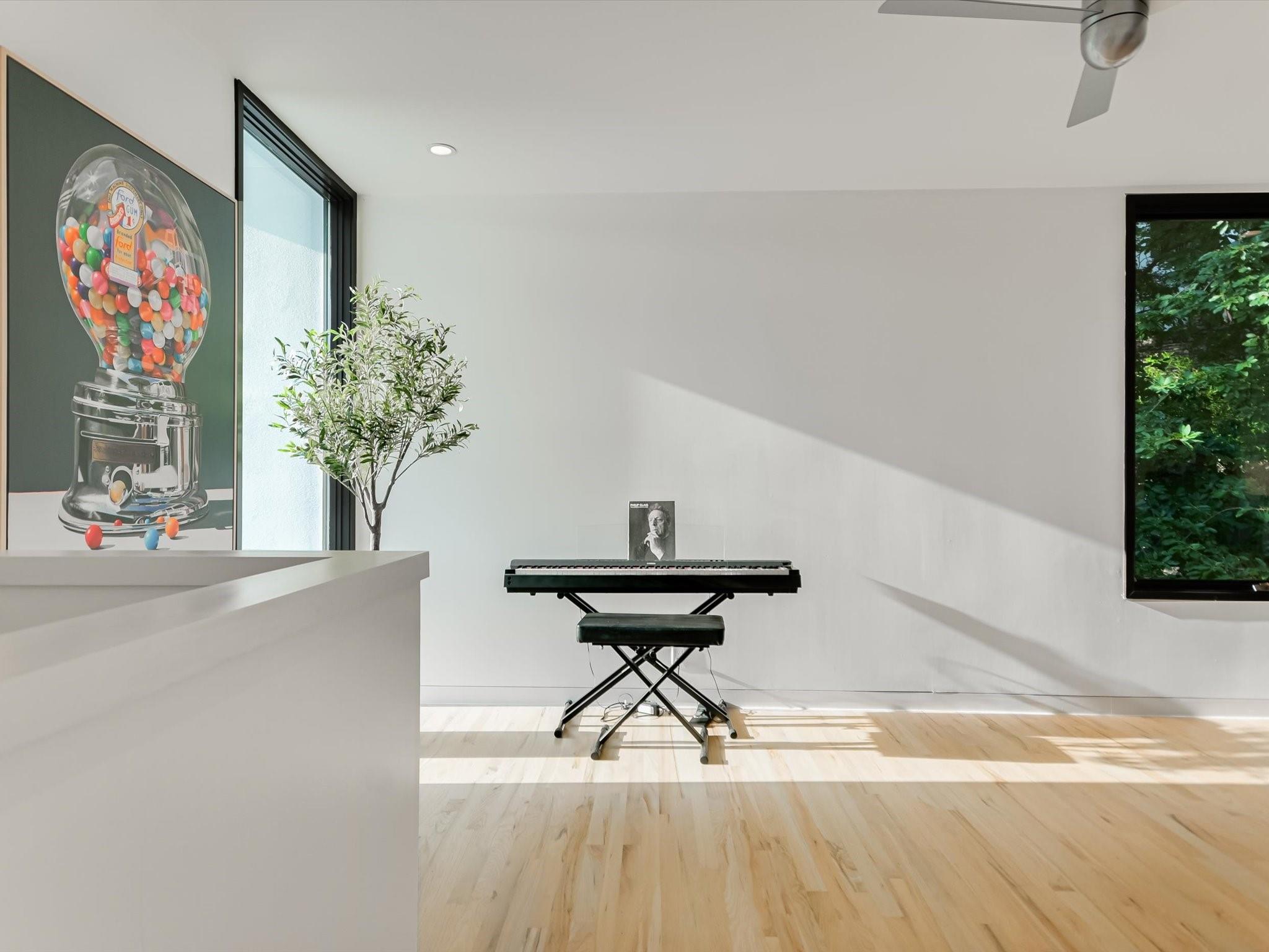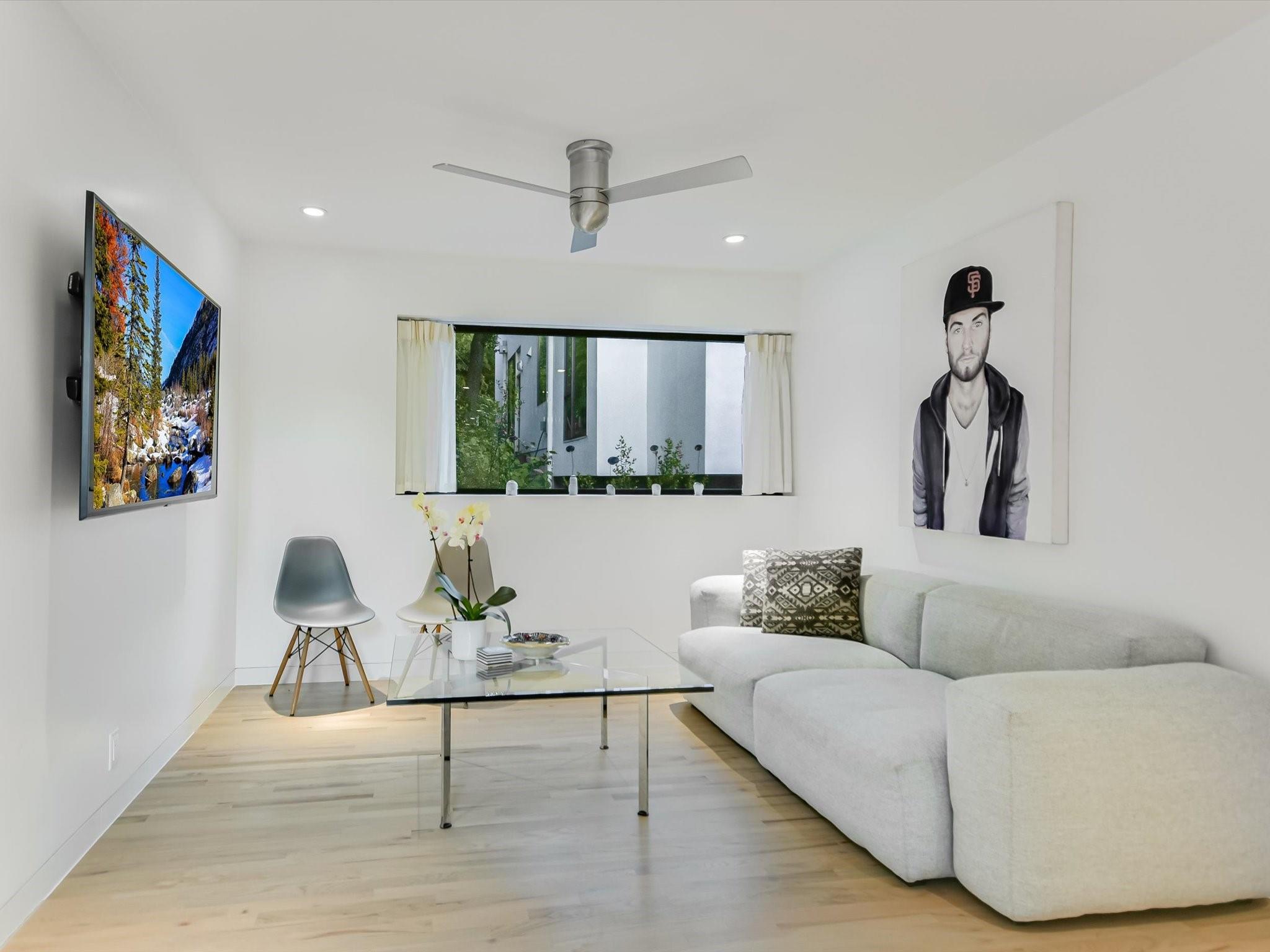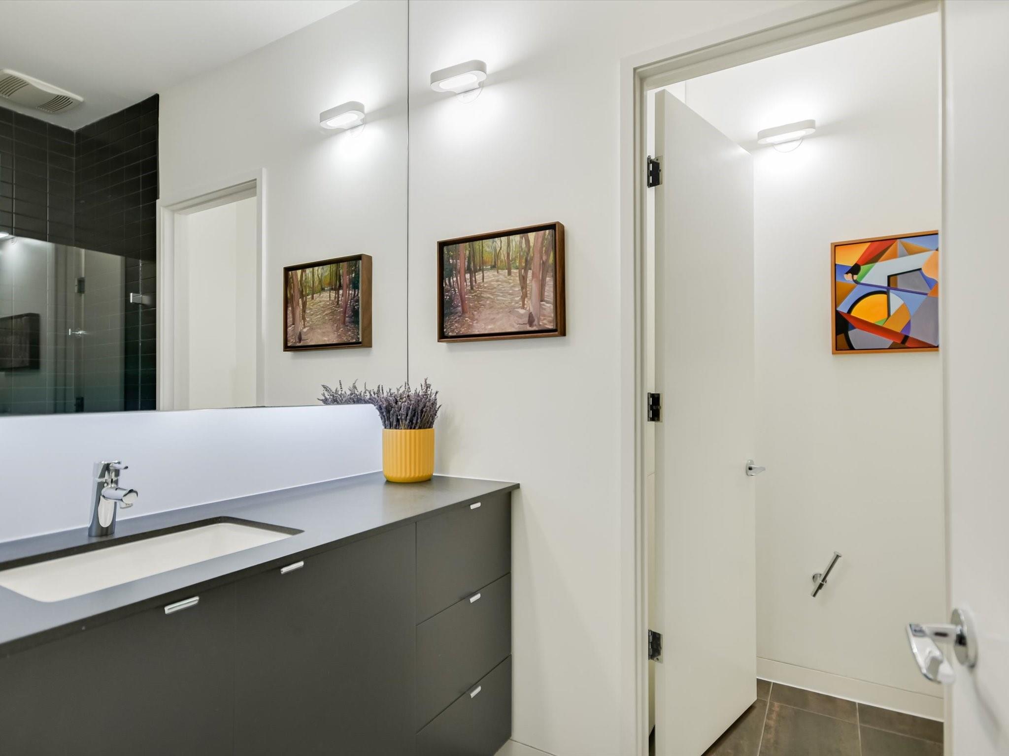 Hillside pied-de-terre with stunning downtown skyline and Pease Park views. Winner of a national design award, the home was designed by celebrated architecture firm Alterstudio. Tucked on a private hillside street across from Shoal Creek and surrounded by mature, lush trees you’ll feel secluded by the greenery, yet you are walking distance from downtown, Pease Park and the University of Texas at Austin campus. Designed for a robust, urban lifestyle, the home offers perfect spaces for entertaining, working and relaxing. The main floor living room and kitchen are bracketed front and back by floor-to-ceiling windows that fill the rooms with light. When entertaining, guests can wander out to the secluded back courtyard or up to the shaded garden area; but the ultimate gathering spot is the oversized deck on the second floor which has a stunning view of the downtown skyline and Pease Park. A second living area on the main floor is perfect as a viewing room, den or work-from-home space; two additional bedrooms on this floor offer room for family or guests, complete with a shared bathroom. The upper floor hosts the refined primary suite. The bath features a large shower with a view, soaking tub, double vanities and walk-in closet with custom storage. A sitting room on this floor is perfect for a second office, exercise room or just a relaxation space with treetop views. The interior finishes create a calm, refined place to live, with warm, bleached-oak flooring offering an organic element that is complemented by fresh white walls to display an art collection. Signature architectural elements of the Alterstudio aesthetic include sleek integrated baseboards and built-in cabinetry, subtly luxurious materials and window placement that strategically illuminates each room while maintaining privacy. The European-style kitchen is a beautifully-designed focal point with custom cabinetry, marble countertops and plenty of storage to keep the space looking sleek.