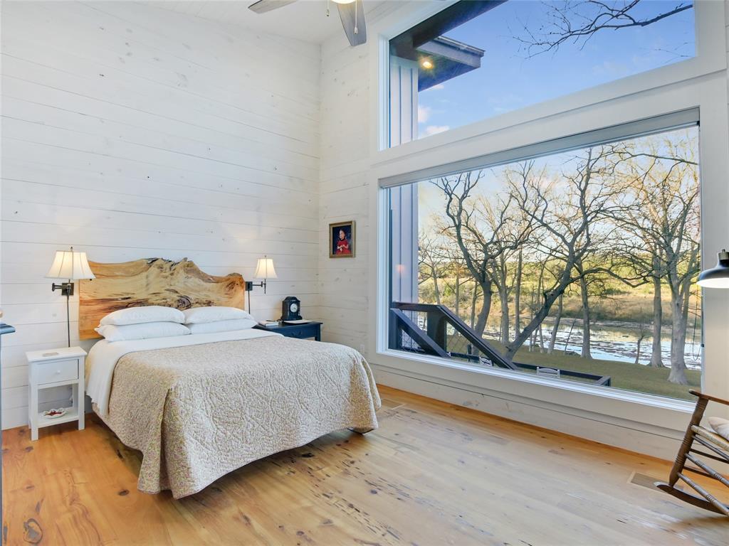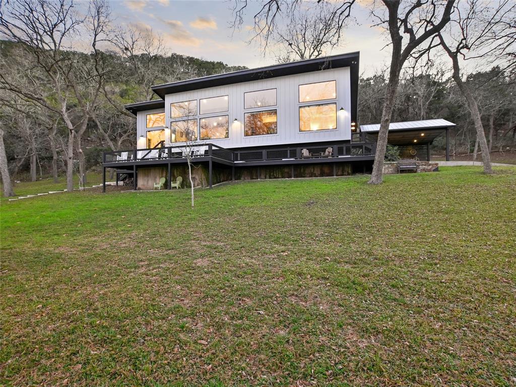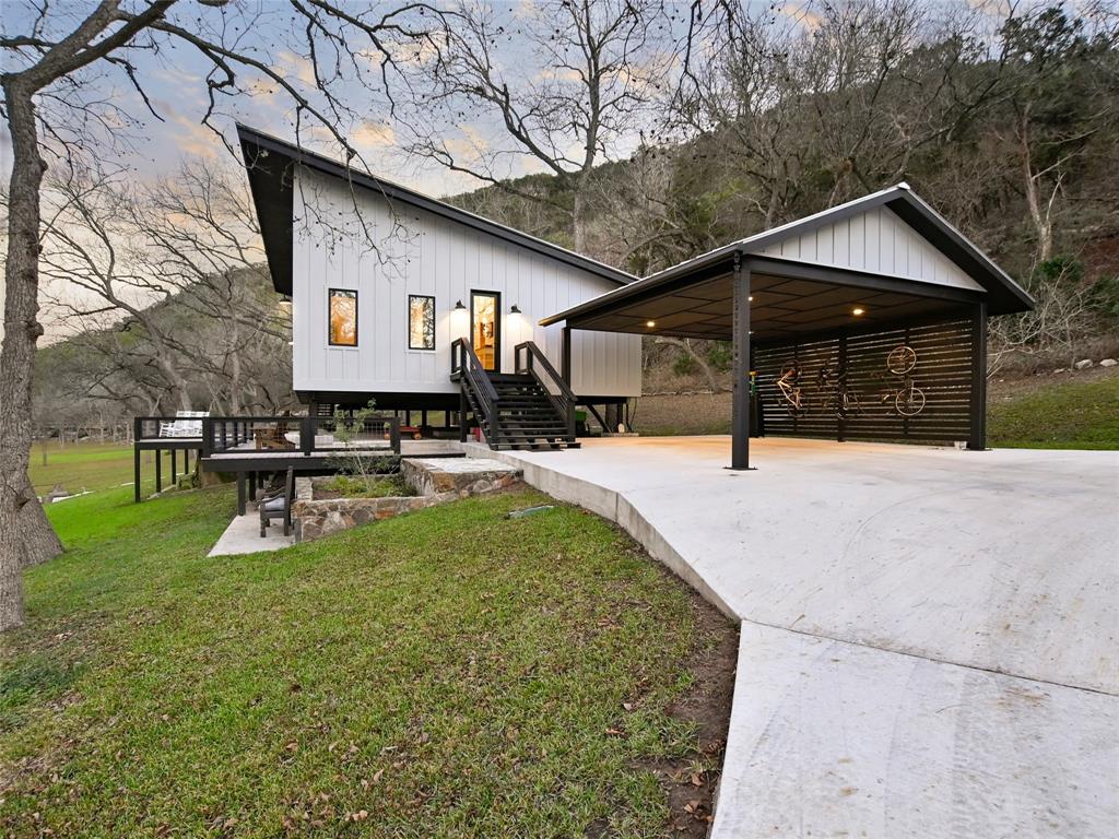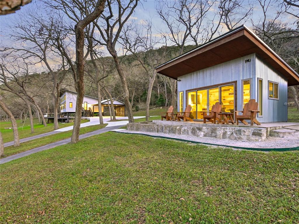 NEW-STARTING IN 2024-AG EVALUATION ON 7 ACRES FOR BEES MEANS LOWER TAXES! Nestled between the Blanco River and the hills of Wimberley is a place that is so serene and private you won't believe such a beautiful property exists a short distance from the historic Wimberley Square. This breathtaking 7.48 acres has over 1200 feet of Cypress and Pecan tree lined river front. The landscape has been meticulously maintained to enhance the views. When you take the private drive across the bridge to enter the property you will see the natural beauty of Wimberley at it's finest. On the right you will see the base of Paradise Hills and to the left the Blanco River. In front of you is an amazing home designed to drink in the views of this awesome setting and a vast green space to enjoy with family and friends. Go for a walk to the massive boulders that line the far boundry or kayak the river under the shade of ancient Cypress trees. The unique custom home was completed in 2020 and was designed and placed to celebrate this outstanding setting. Large picture windows line the front of the house to provide expansive views of the river and manicured grounds. Whether in the kitchen/living area, home office or the front bedrooms you will enjoy unobstructed views of the beauty of nature. The floors are reclaimed Cypress that is perfectly installed and finished. Concrete countertops accentuate natural finishes with understated beauty. The tall ceilings give a sense of space and openness complimented by the massive windows which flood the home with natural light. The interior walls and ceilings are finished in wood and have spray foam insulation which makes for a quiet and energy efficient home. You can use the carport for parking or to host an outdoor gathering. Enjoy the views of the river from the detached cabin. This property is literally at the end of the road with unparalleled privacy and views that almost defy description. Iconic riverfront properties like this are seldom available