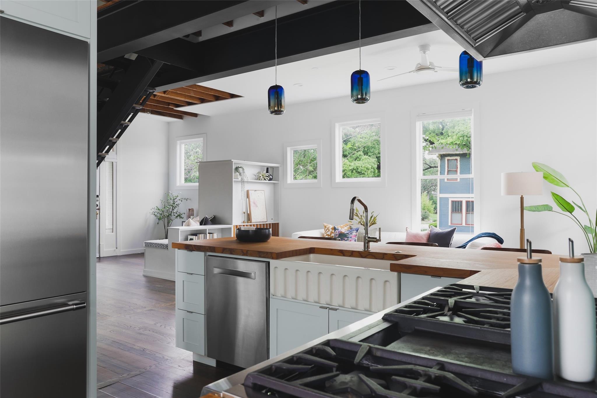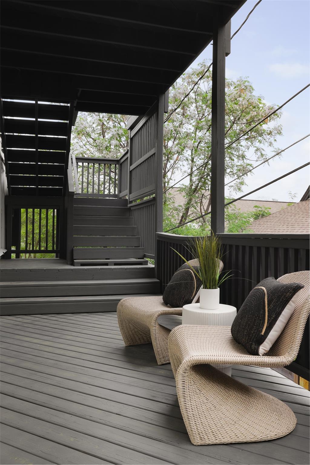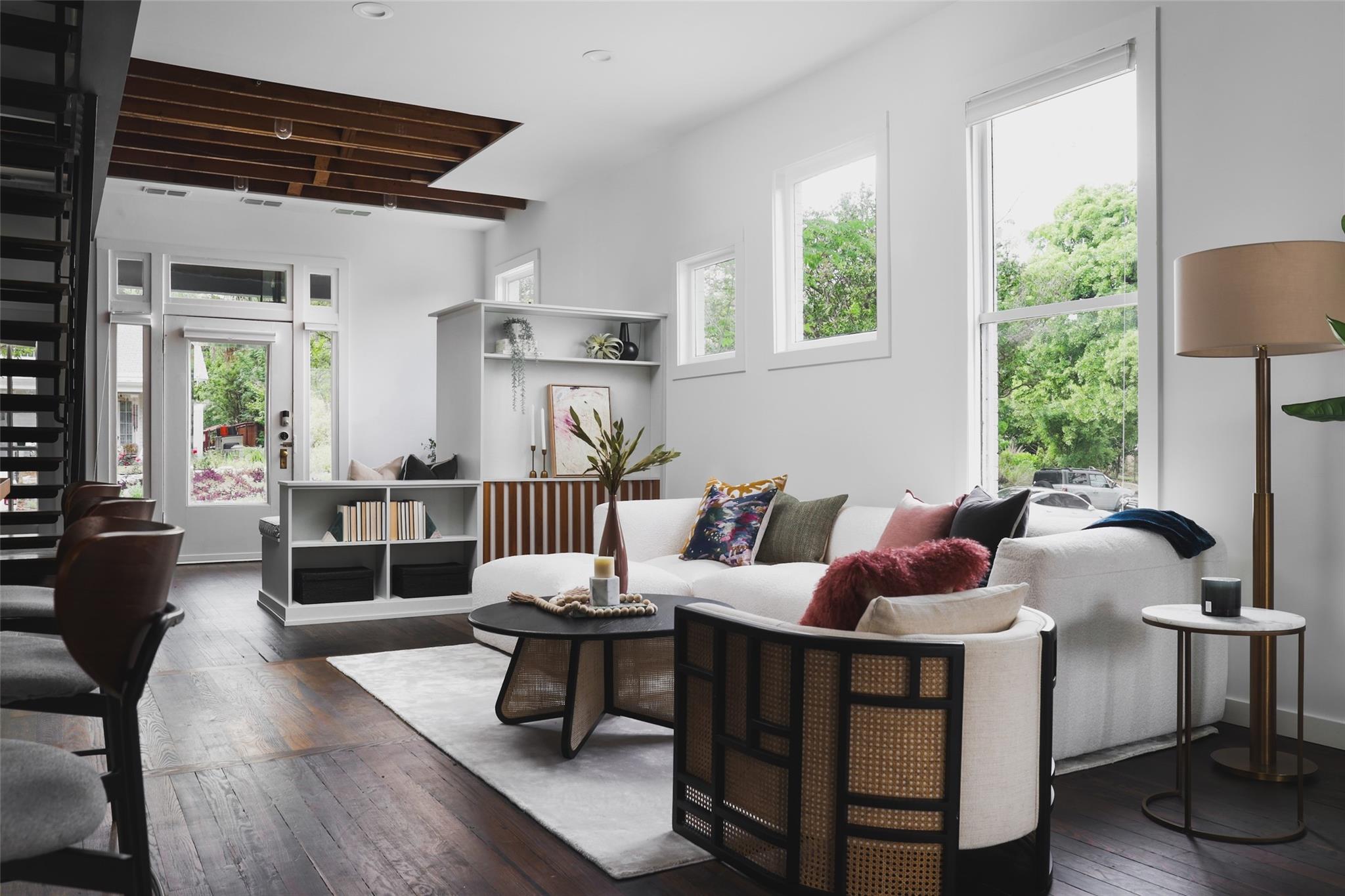 Situated within Austin’s charming Clarksville neighborhood, this luxury residence epitomizes historic elegance while seamlessly being intertwined with modern sophistication. Exuding timeless allure, the home boasts exposed beams, brick accents, and wood detailing, harmonizing effortlessly with contemporary design elements such as floating stairs and expansive 12-foot ceilings, which flood the interiors with natural light. The kitchen boasts a 6-burner Viking range, double ovens, and sleek wood finishes. Retreat to the primary suite offering sweeping city views, an ensuite bath with lavish dual vanities, and a dual-headed glass-enclosed shower. Entertain with ease on the welcoming front porch or covered decks, showcasing captivating views of the downtown skyline. Additionally, the property includes a lower level with a separate entrance, ideal for an office or studio space. Enjoy the convenience of this prime location, just moments away from Austin’s renowned dining and shopping destinations. With two tandem parking spots and no fees in a condominium regime, this single-family adobe offers both luxury and practicality in the heart of Clarksville.
