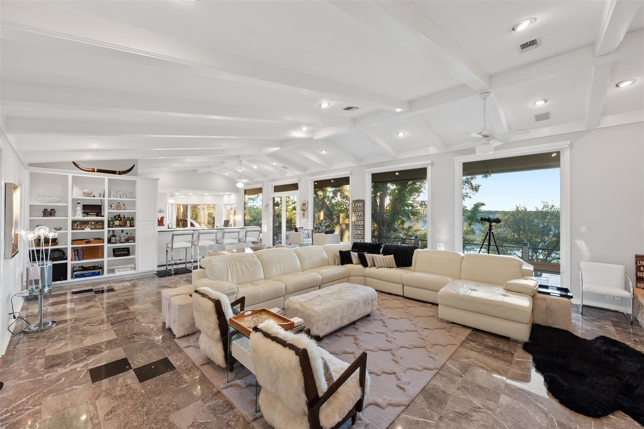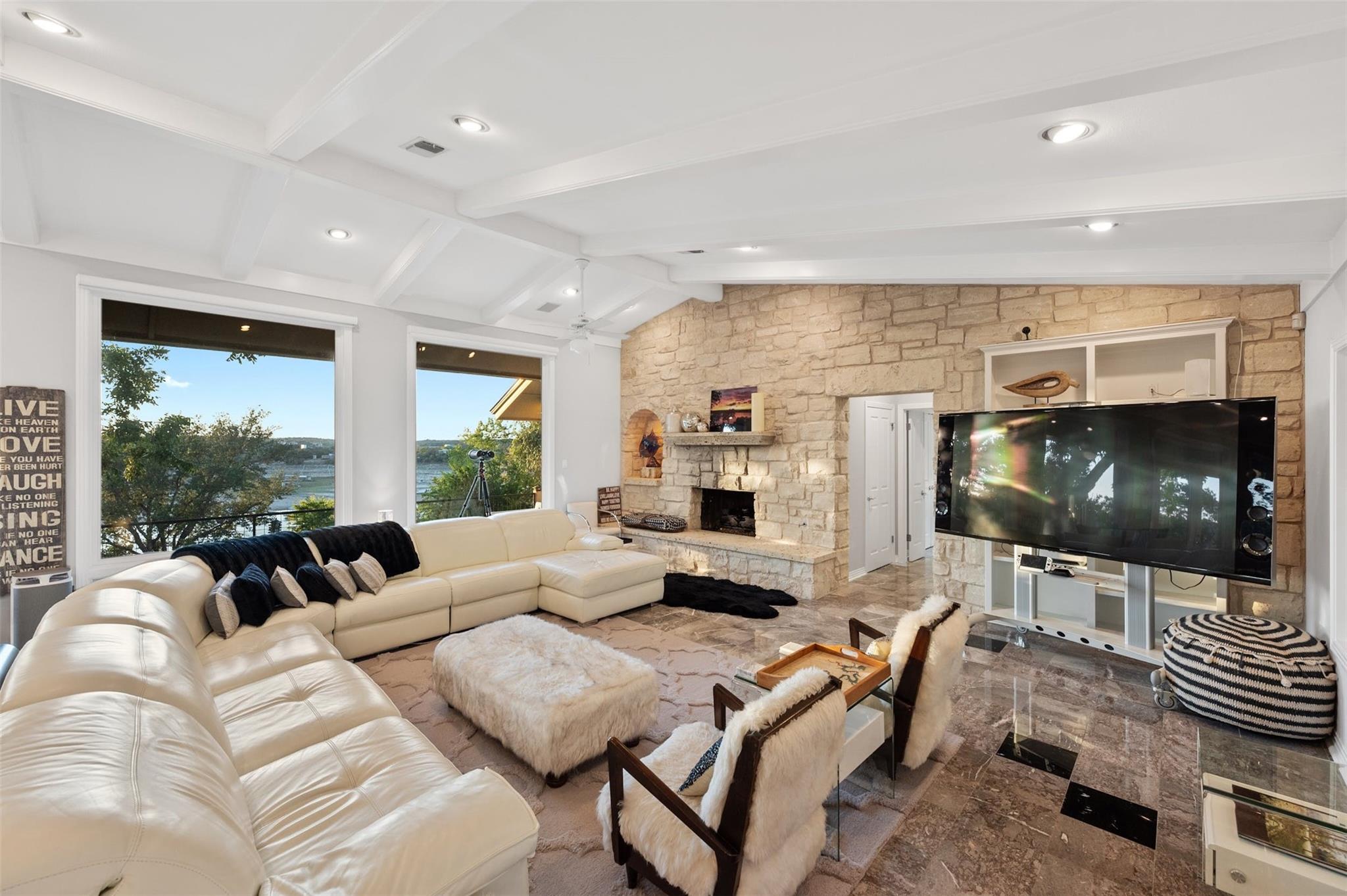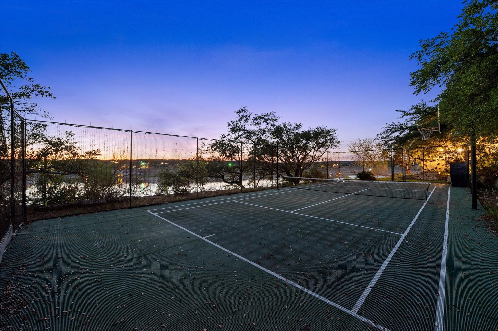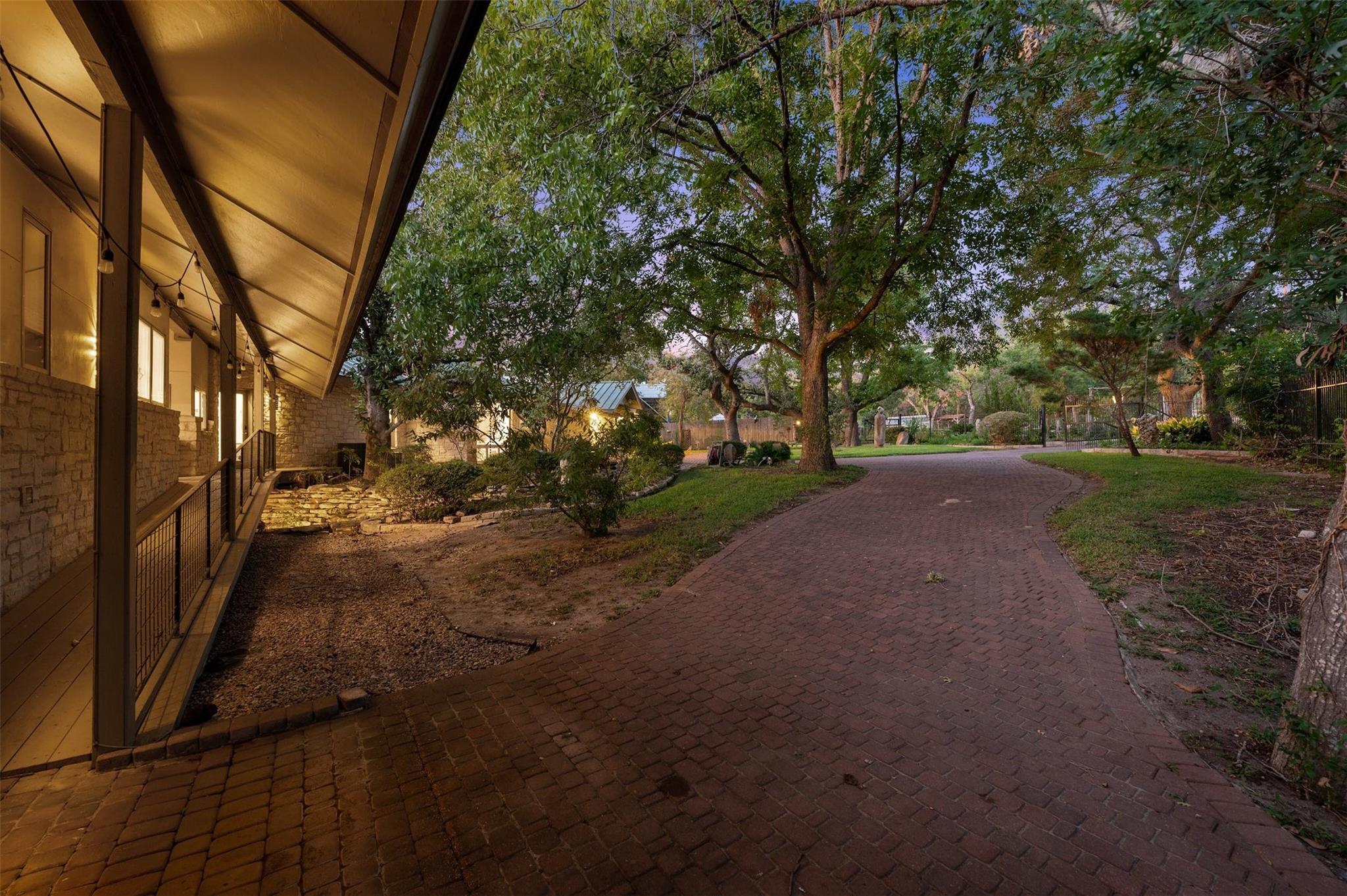 Spectacular Lakefront Oasis on Lake Travis! Situated on 2.23 acres along the Hurst Creek Arm in the well-established Buffalo Gap lakefront community. Consisting of three lots, this sale offers a rare opportunity for possible development. Gorgeous tree-filled property with a full lakefront sports court, shady front and backyards, scenic vistas, several outdoor living spaces, majestic landscaping, and a cascading waterfall. Positioned right on the water, this home comes with a private dock, 400 feet of frontage, and stairs to the water at all lake levels. Frontage is on the no wake, deep water cove, with a depth of 65’ during an average lake level of 681’. The existing home consists of the 2BD/2.5BA main house and a separate 1BD/1BA guest house. There is also a gated back entry with extensive parking, a two-car garage with two glass garage door bays, plus a workshop with two additional glass door bays overlooking the lake. The home features soaring vaulted & beamed ceilings, striking stone fireplaces in the living room and primary suite, sophisticated built-ins, plentiful storage, and a timeless gourmet kitchen with SS appliances. Incredible oversized primary suite with an ensuite bath, walk-in closets, and an attached lake-view office. Downstairs you will find a guest room, a large full bath, a wet room area, a storage room, and the workshop. The 1BD/1BA guest house comes with its own sweeping lake views and is close enough to the main house to be involved but separate enough to give guests a break when needed. Perfect for multi-generational living! This incredible lakefront estate showcases outdoor living at its finest with a deck that runs almost the length of the home overlooking the lake. Featuring lush grounds with enchanting gardens, ponds, a grand lawn, towering mature shade trees, and more. Excellent Lake Travis ISD Schools. Low Tax Rate (1.77). Convenient to both Austin and Lakeway. Come and make your lakefront living dreams a reality today!