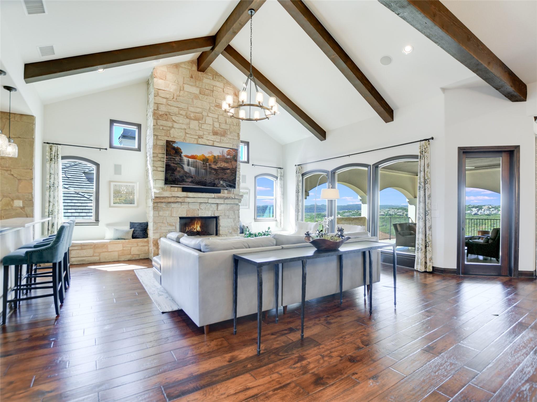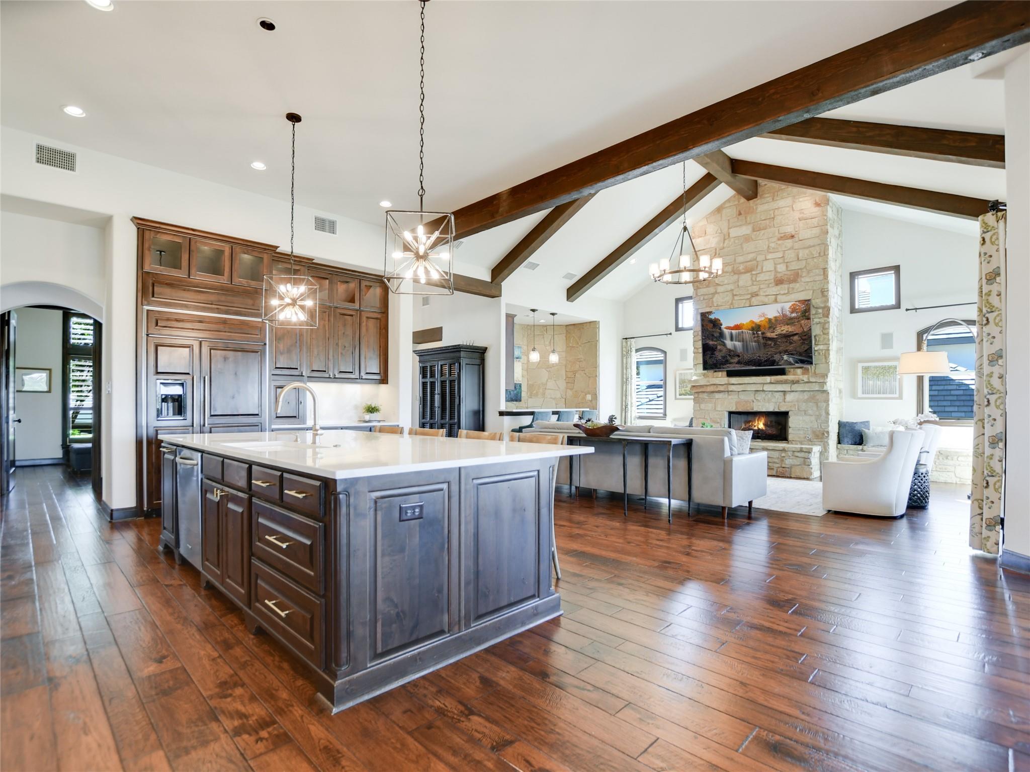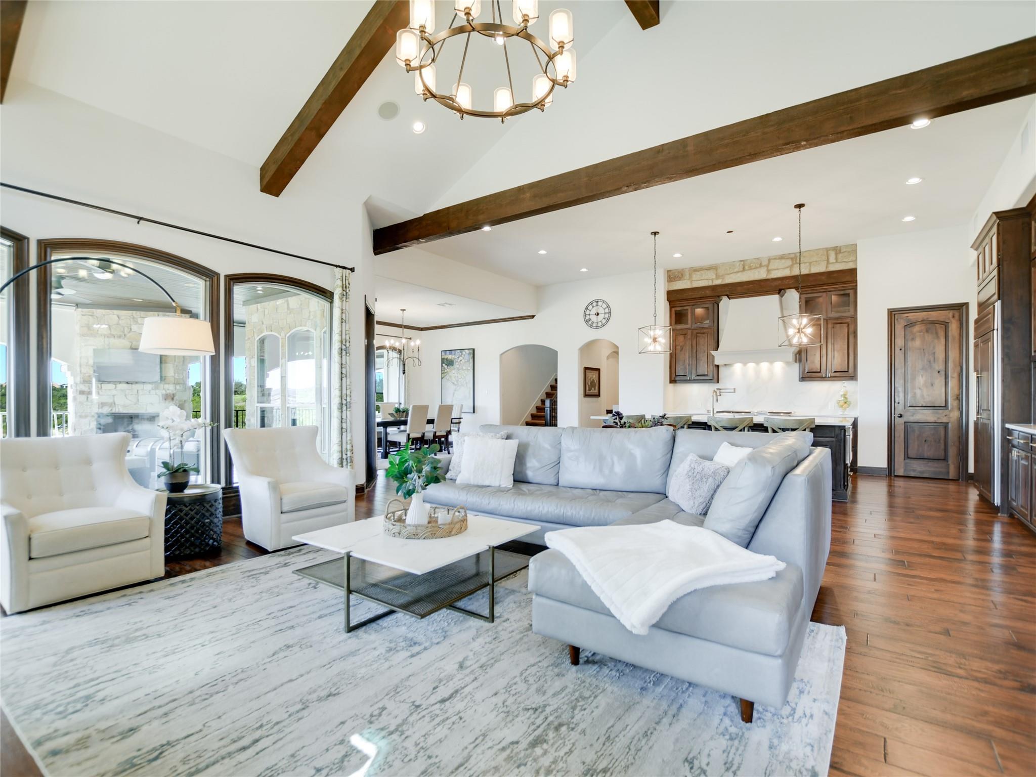 | Interior Features | Two Primary Baths, Breakfast Bar, Ceiling Fan(s), Beamed Ceilings, High Ceilings, Vaulted Ceiling(s), Chandelier, Quartz Counters, Double Vanity, Electric Dryer Hookup, Entrance Foyer, French Doors, Interior Steps, Kitchen Island, Multiple Dining Areas, Multiple Living Areas, Open Floorplan, Pantry, Primary Bedroom on Main, Recessed Lighting, Walk-In Closet(s), Washer Hookup, Wet Bar | |