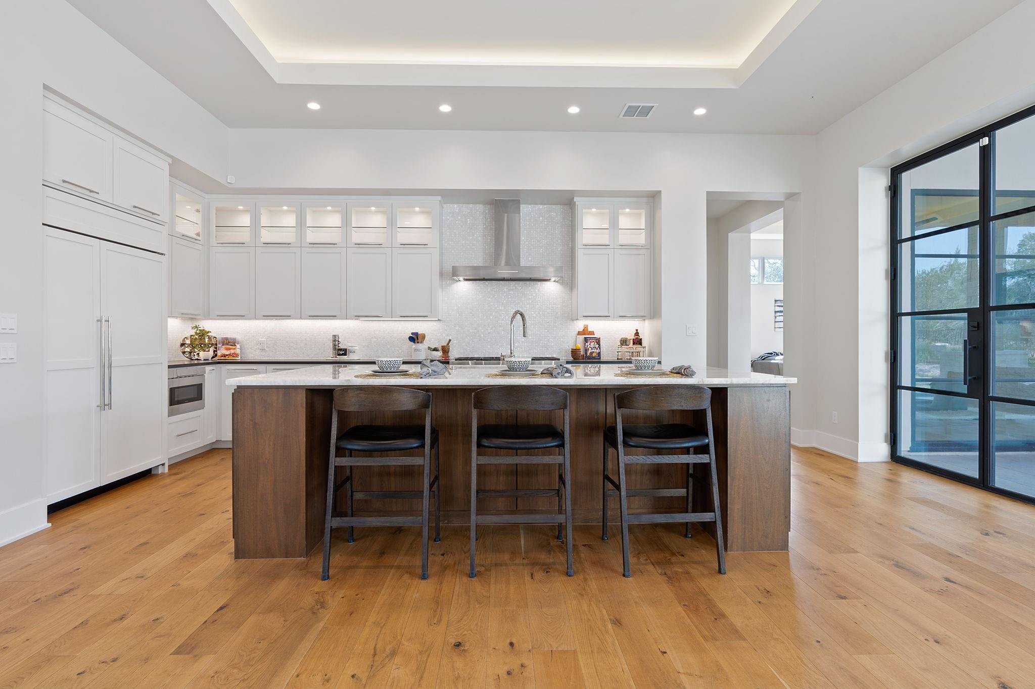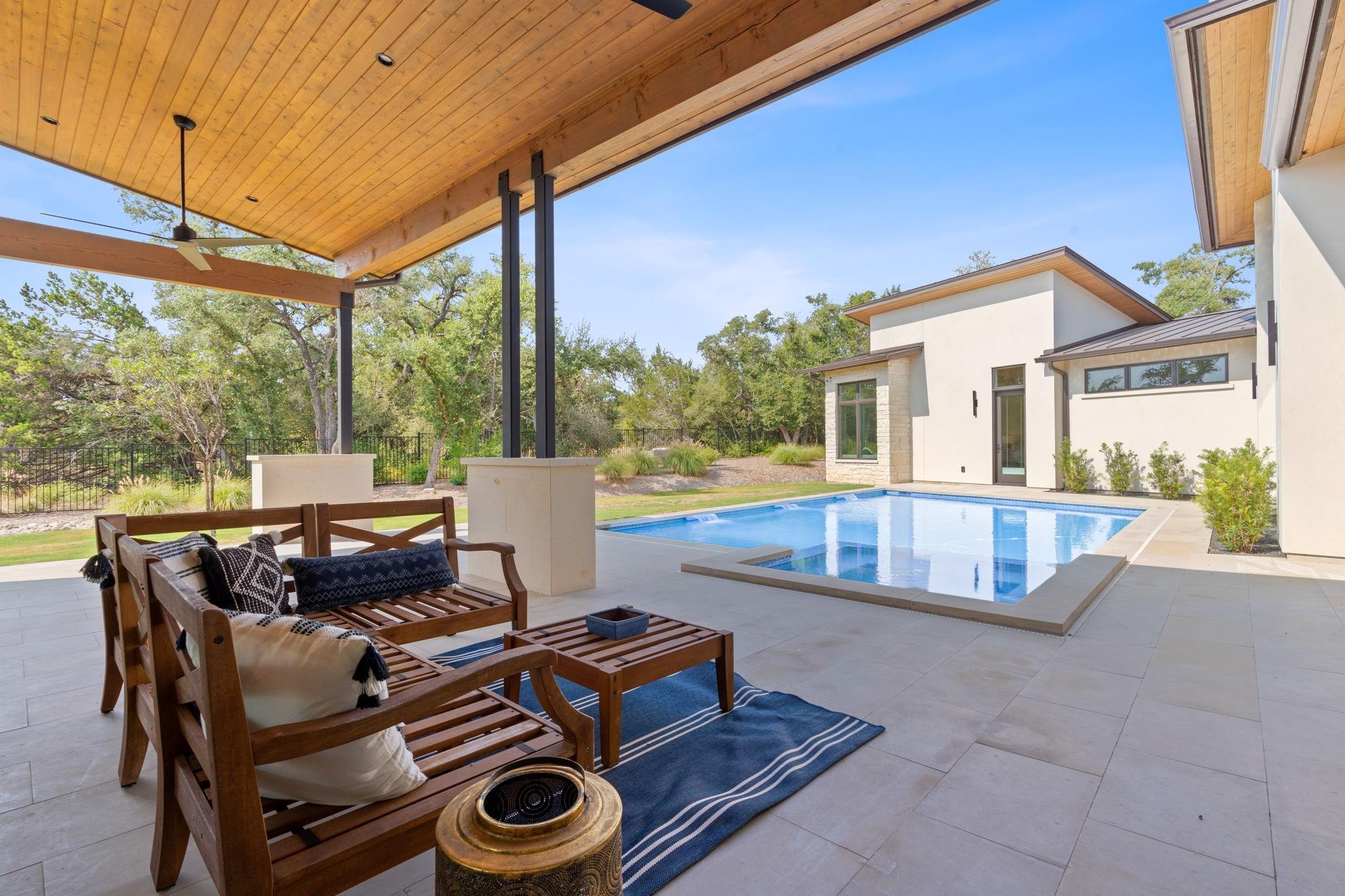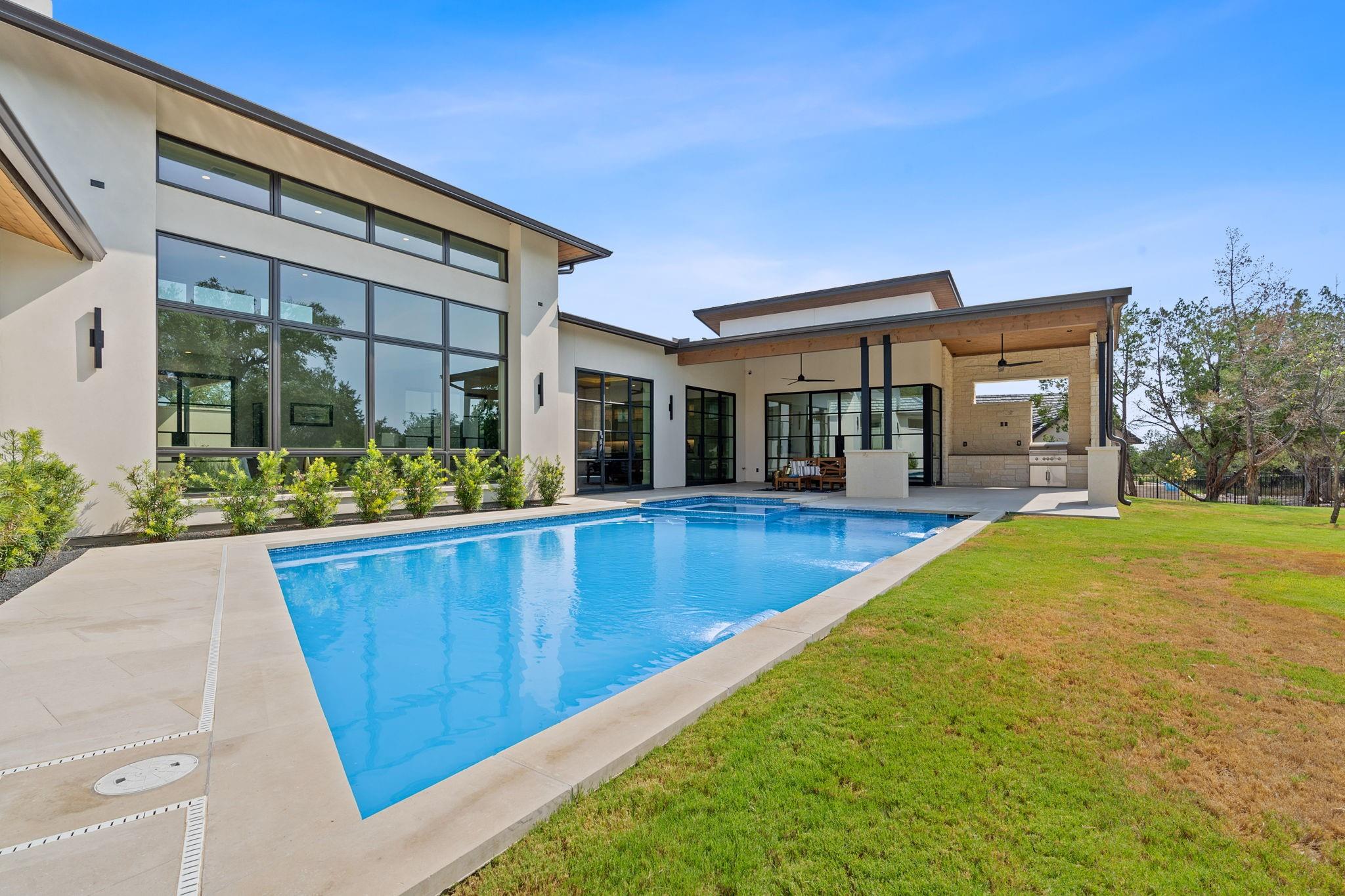 *SELLER FINANCING AVAILABLE AT 5.99%* Stunning 2022 built hill country modern one-story on .6 acre in the gated Reserve section of Reunion Ranch off 1826 ~ Perfect for buyers seeking a quiet oasis a stone's throw from Austin & Dripping Springs! Masterfully designed and built by Heyl Homes in 2022, this luxury home boasts a thoughtful, open floorplan, quality finishes, & protected greenbelt. The property's entrance is through a private, gated courtyard for additional privacy & security with a lovely sitting area and outdoor fireplace. Step inside to a lovely great room with soaring ceilings and wall of windows overlooking the pool and greenbelt. Entertain guests or extended family for the holidays in the spacious dining area and chef's kitchen with oversized island, Sub-Zero refrigerator, Bosch dishwasher, Wolf range, & Sharp pull-out microwave drawer. Retreat to the gameroom w/ stone accent wall, wet bar, and steel windows/doors leading to the covered outdoor patio + kitchen & gorgeous pool/spa! *This home backs to a large acreage property with conservation easement ensuring protected greenbelt and privacy for the long term!* Escape to the private primary wing with spacious primary bedroom & luxurious primary bath with large his/her vanities, his/her closets, free-standing tub, & separate shower. Work from home from spacious dedicated office with abundant natural light. Separate wing with 3 bedrooms all with en-suite bathrooms & spacious closets. The flooring throughout the home is wide plank wood, polished stone, & tile in the bathrooms/utility (no carpet!). This home was built with utility/functionality in mind with 3 car side-entry garage with EV charger, extra space for storage, plus drop zone & large utility/mud room as you enter the home. Enjoy Reunion Ranch's many amenities ~ extensive hike/trail system along Bear Creek, lg pavilion for outdoor gatherings, community pool & lap pool, athletic fields & playscapes. Highly acclaimed Dripping Springs ISD!