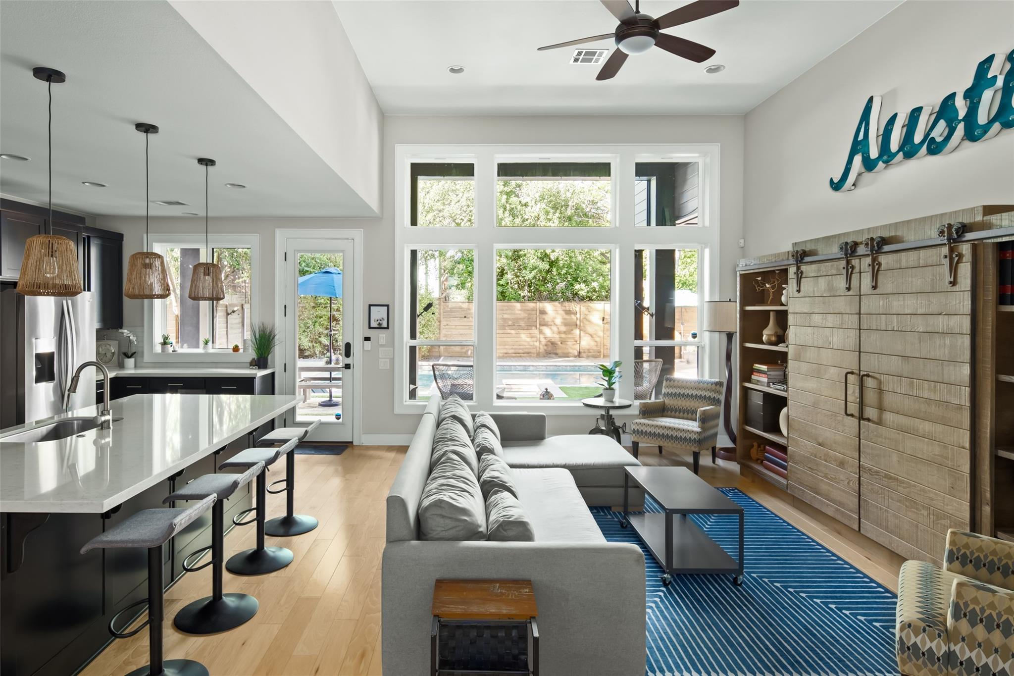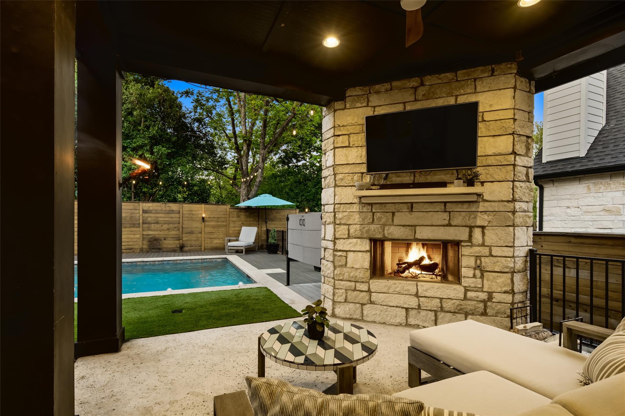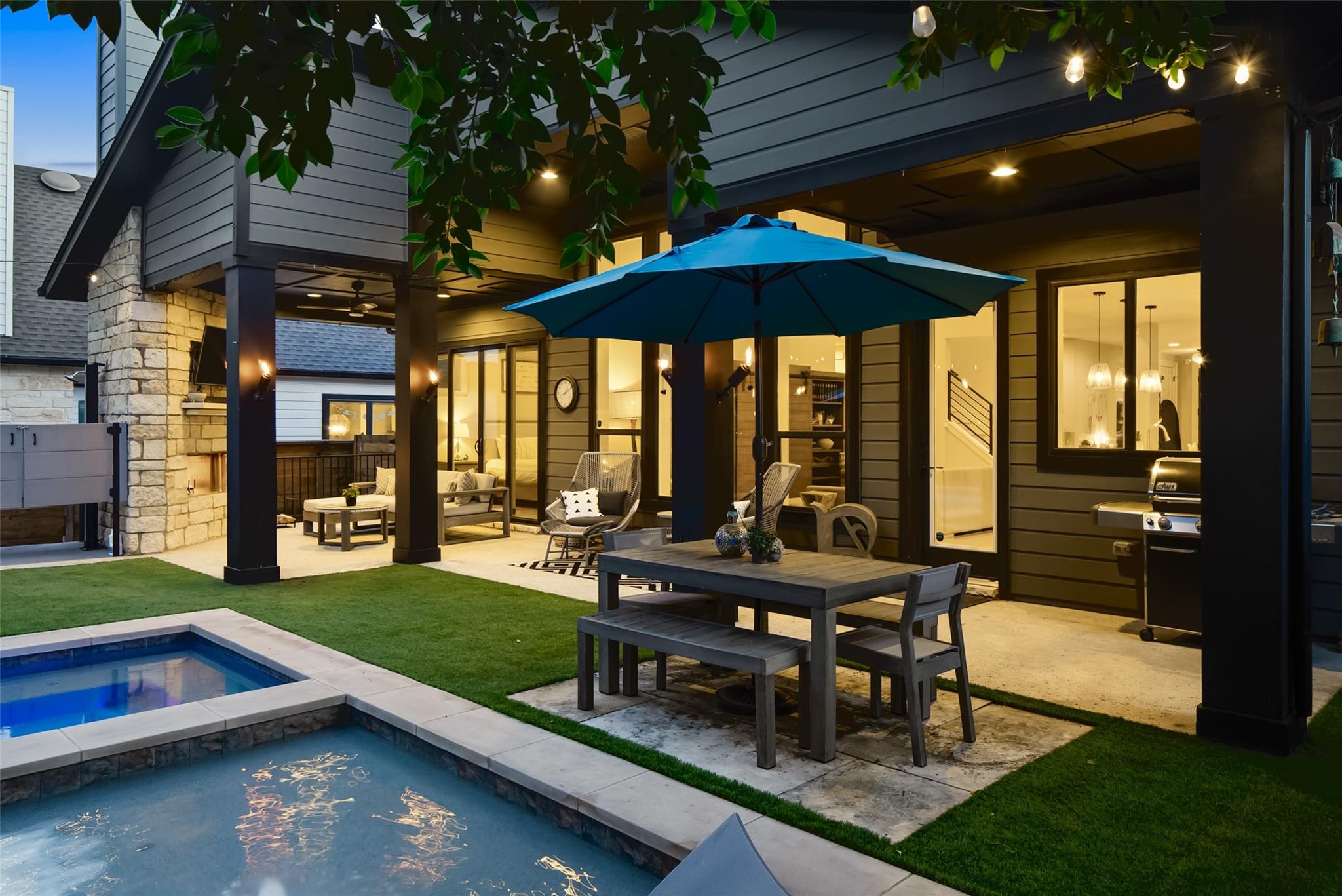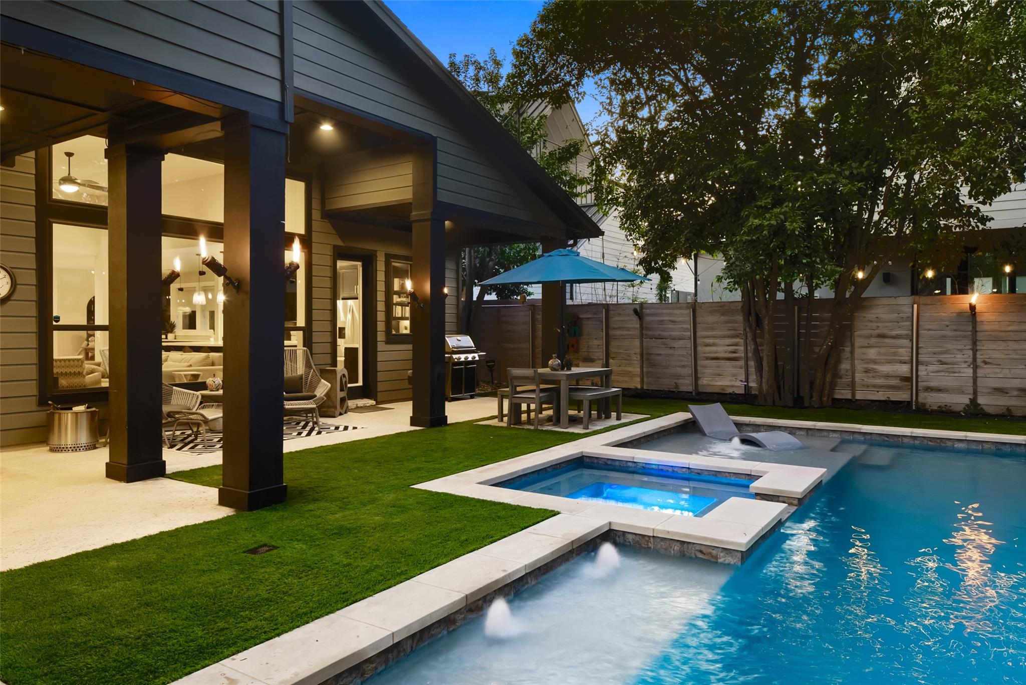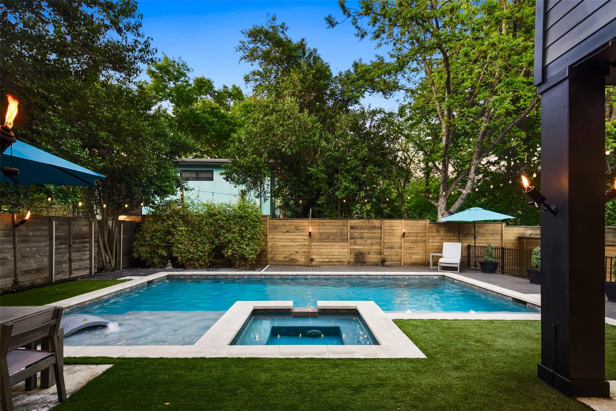 Welcome to your dream oasis in the heart of Austin's coveted Zilker neighborhood! This stunning residence offers unparalleled convenience, just steps away from Zilker Park, Barton Springs, and the vibrant dining and entertainment scene of downtown Austin. The primary suite is a sanctuary, boasting an en suite bathroom, walk-in closet, and direct access to the inviting pool and backyard retreat. Natural light floods the front office on the main level along with the modern open-concept living, dining, and kitchen areas, providing the perfect backdrop for hosting gatherings. Upstairs, two secondary bedrooms, each with en suite bathroom, offer privacy for your family and visitors along with a versatile flex space ideal for a game room or TV lounge. Outside, the backyard is an entertainer's paradise complete with a full-size pool and spa, covered porch and cooling misters, fireplace, tiki torches, a private outdoor shower, and non-toxic mosquito misters ensuring comfort year-round. The fully landscaped front and back yards features no-maintenance, high-performance turf, established plantings, and a bubbling water fountain at the front entrance. Don't miss this opportunity to experience luxury living at its finest in Austin's most desirable neighborhood!