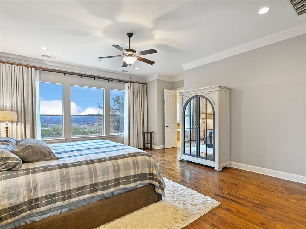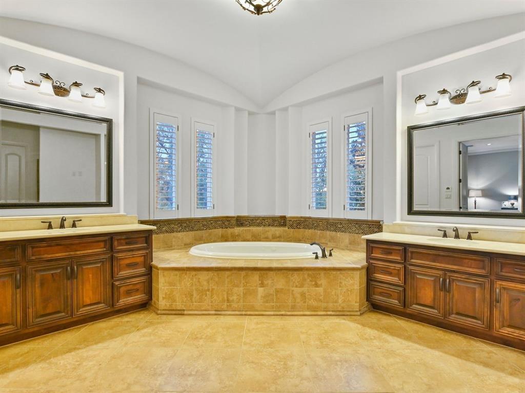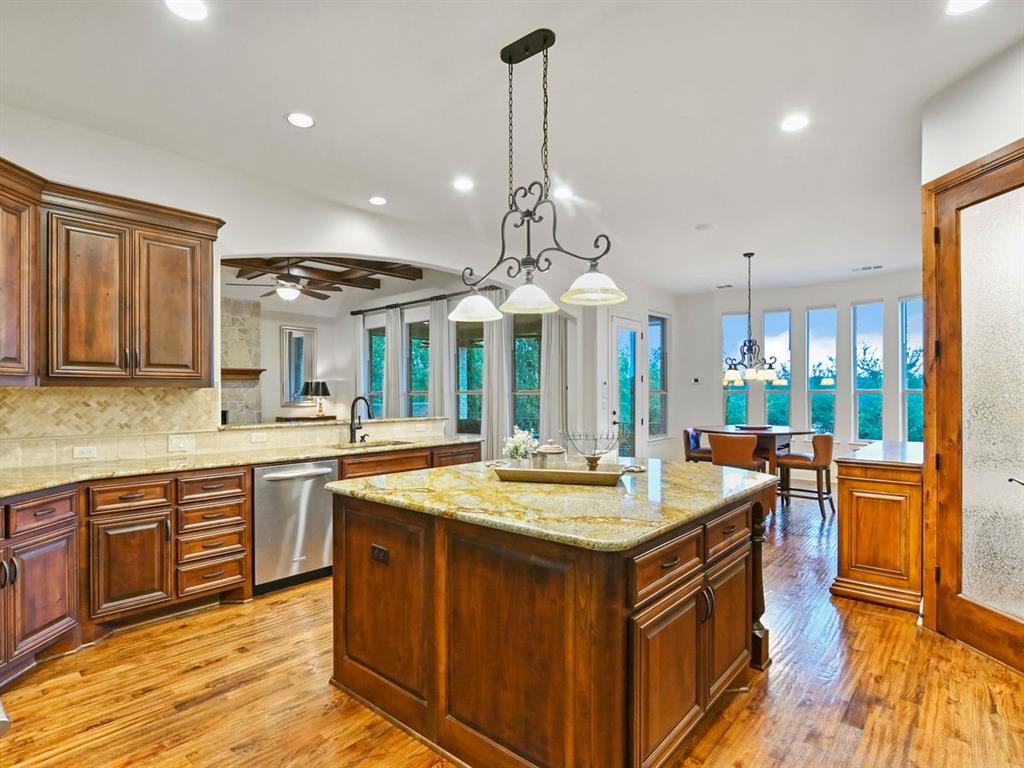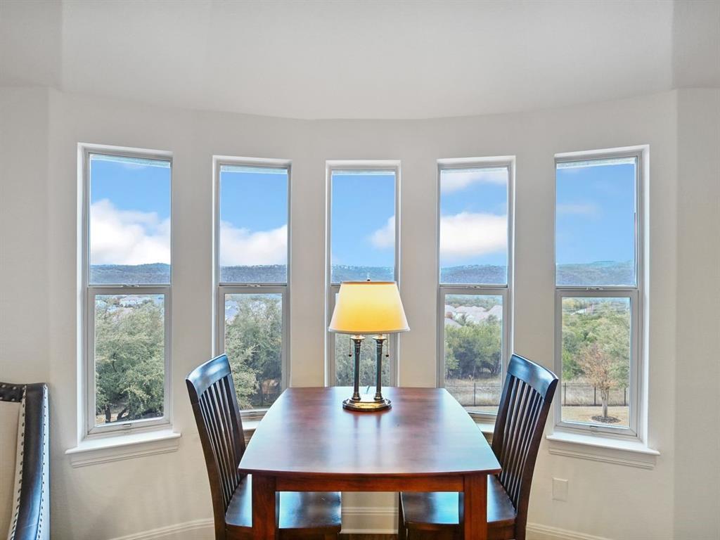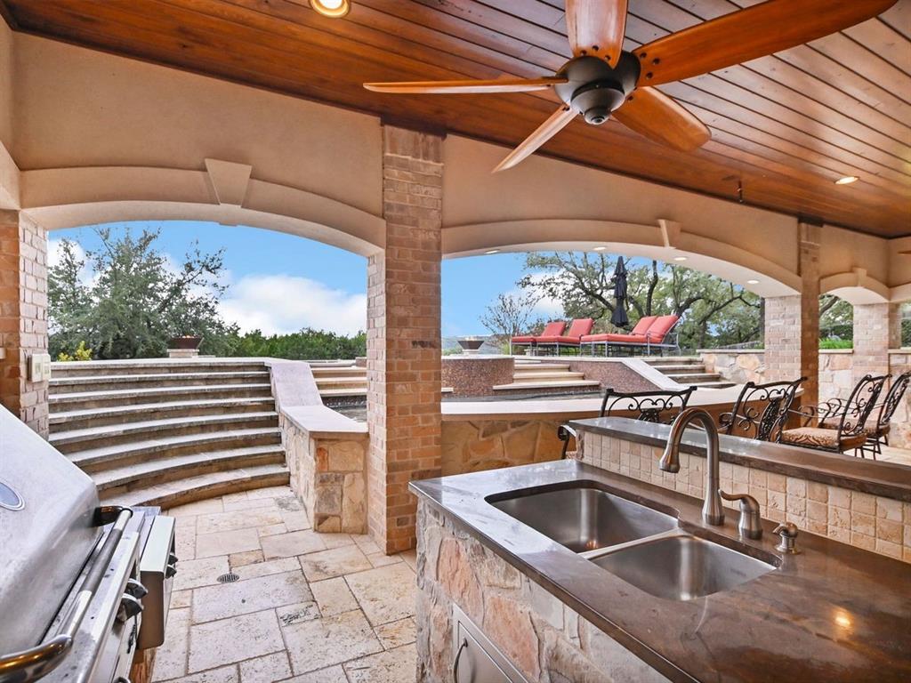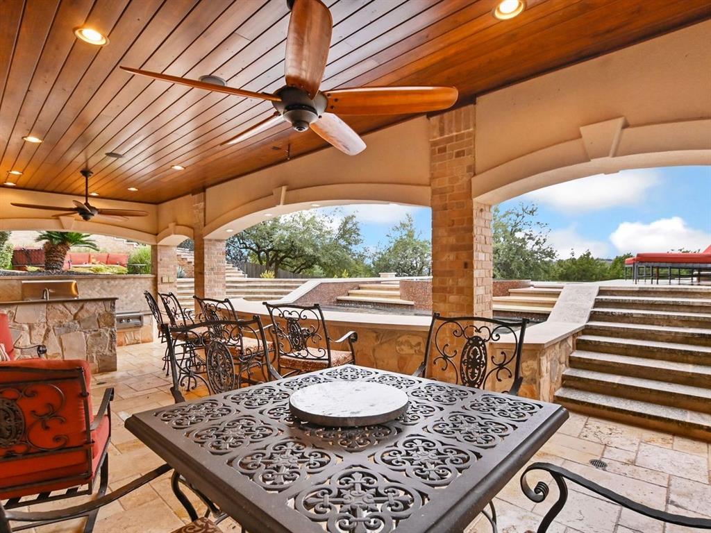 Discover the epitome of luxury living in this stunning estate, meticulously crafted with modern finishes and situated on a sprawling half-acre lot within the prestigious gated community of Santaluz in Steiner Ranch. Surrounded by breathtaking rolling hills and just a stone's throw away from the picturesque Lake Austin, this peaceful neighborhood boasts award-winning schools, local boutiques and restaurants, as well as the UT Golf Club and Lake Travis. From the professionally-designed landscaping, mature trees, and stately brick and stone façade to the impeccably designed interior, this home exudes elegance and sophistication. Upon entry, a grand foyer leads to a formal dining room, elegant home office, main floor media room, and custom bar. The spacious family room, complete with stone-surrounded fireplace and wood beams, welcomes natural light, warmth and comfort, and seamlessly flows into the casual dining room and gourmet chef’s kitchen. Outfitted with top-of-the-line stainless-steel appliances, rich wood cabinetry, and luxurious granite countertops, this culinary haven is sure to impress even the most discerning chef. An entertainer's paradise, the backyard oasis features a covered patio, outdoor kitchen with built-in barbecue and sink, and a built-in fire-pit. The first in-ground pool boasts a swim-up bar, outdoor TV, and comfortable seating for a truly immersive entertainment experience. Upstairs, indulge in the built-in spa and soak in the second in-ground infinity pool, with stunning views of the rolling hills and lush greenery. With every inch of this home exquisitely crafted and meticulously maintained, you’ll feel right at home in this peaceful and private sanctuary.
