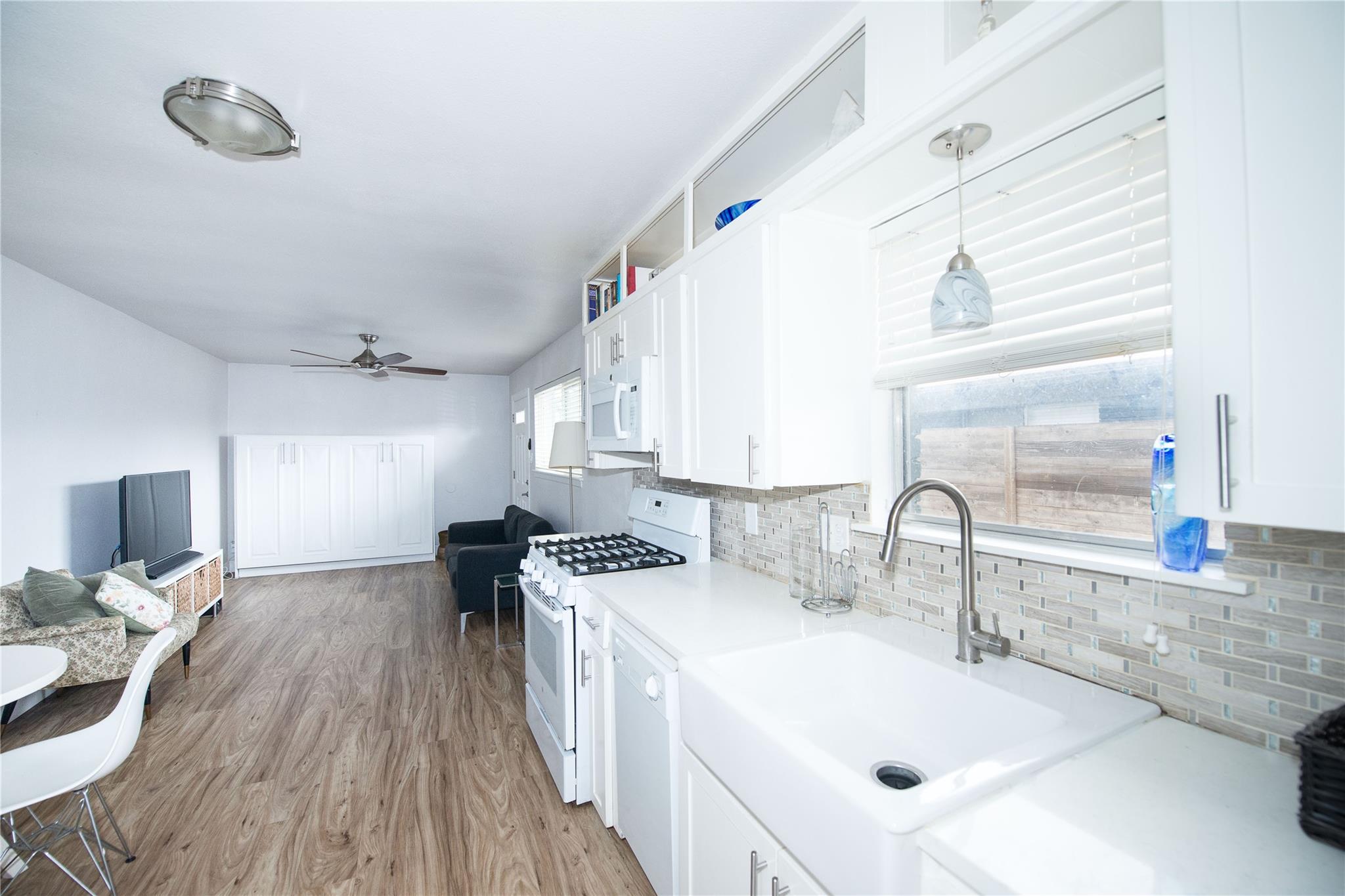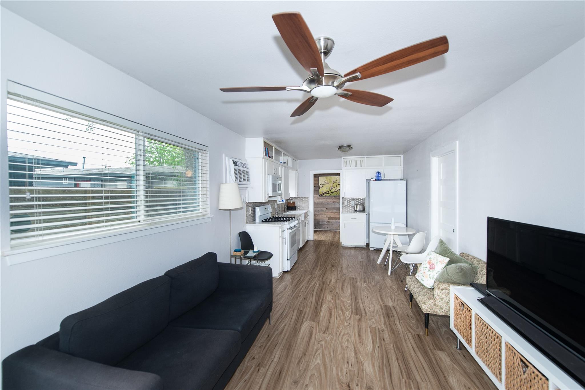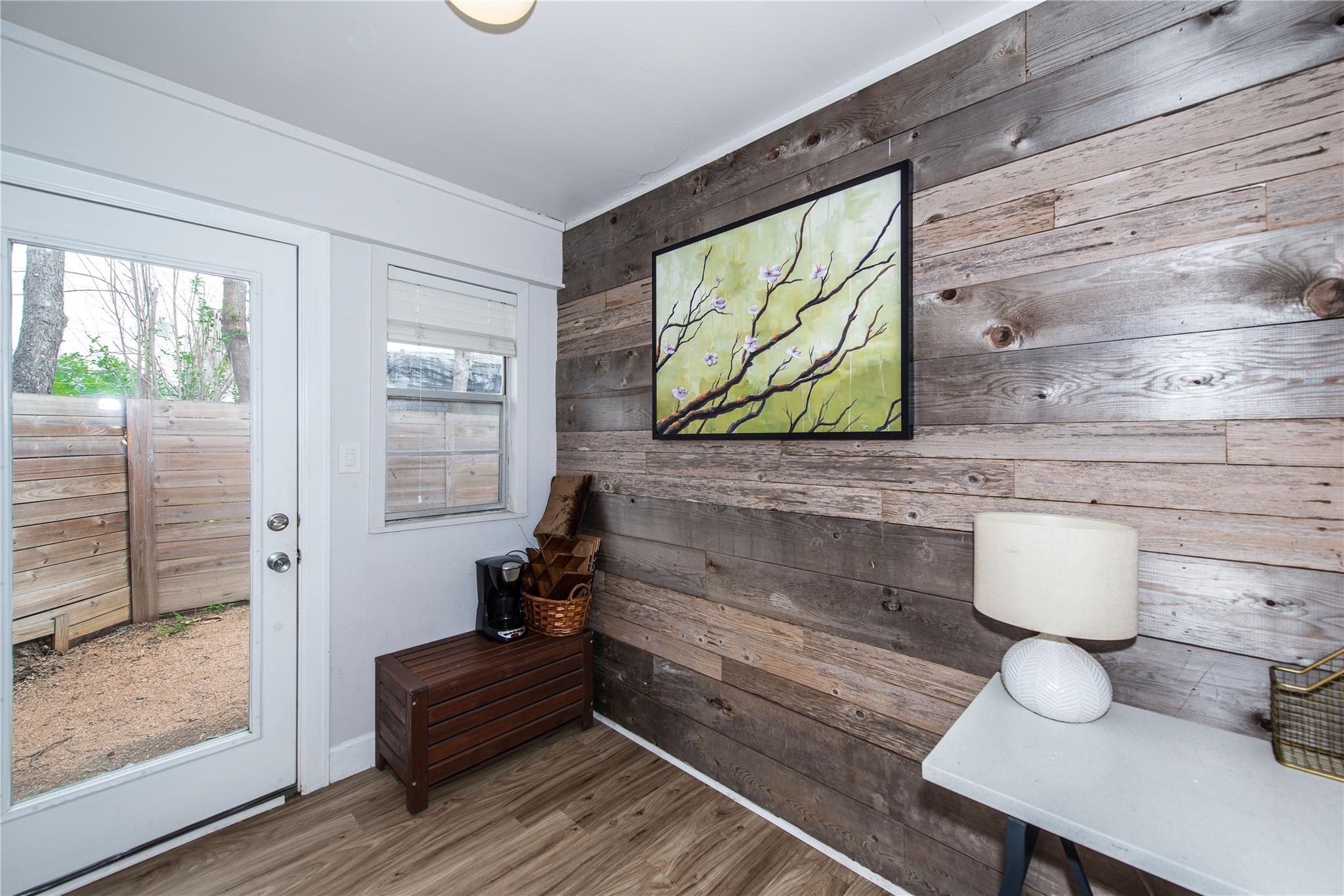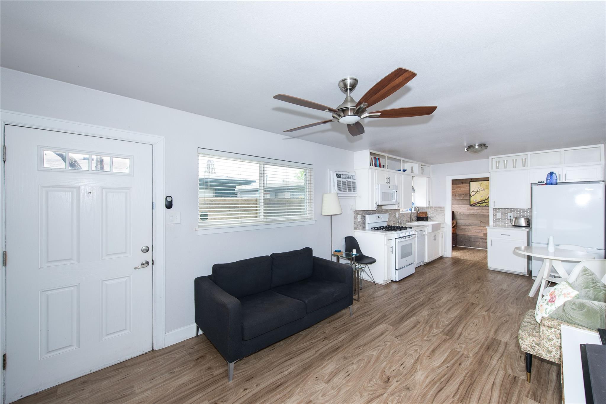 This home has been extensively upgraded and is situated in a highly sought-after area. It features private front and back yards, a carport, and includes a refrigerator, washer, and dryer. The carport offers convenient parking, and the entire home boasts luxury vinyl plank flooring. Quartz countertops adorn both the kitchen and bathroom. The charming outdoor entertainment area is fully fenced, ensuring privacy and offering delightful views. Security is enhanced with fencing around both the front and back yards. Residents can enjoy impressive city views, and the property is equipped with Google Fiber. Although this is a one-bedroom, one-bathroom duplex, it also offers a versatile flex room that can serve as an office, gym, storage space, and more, providing ample flexibility.