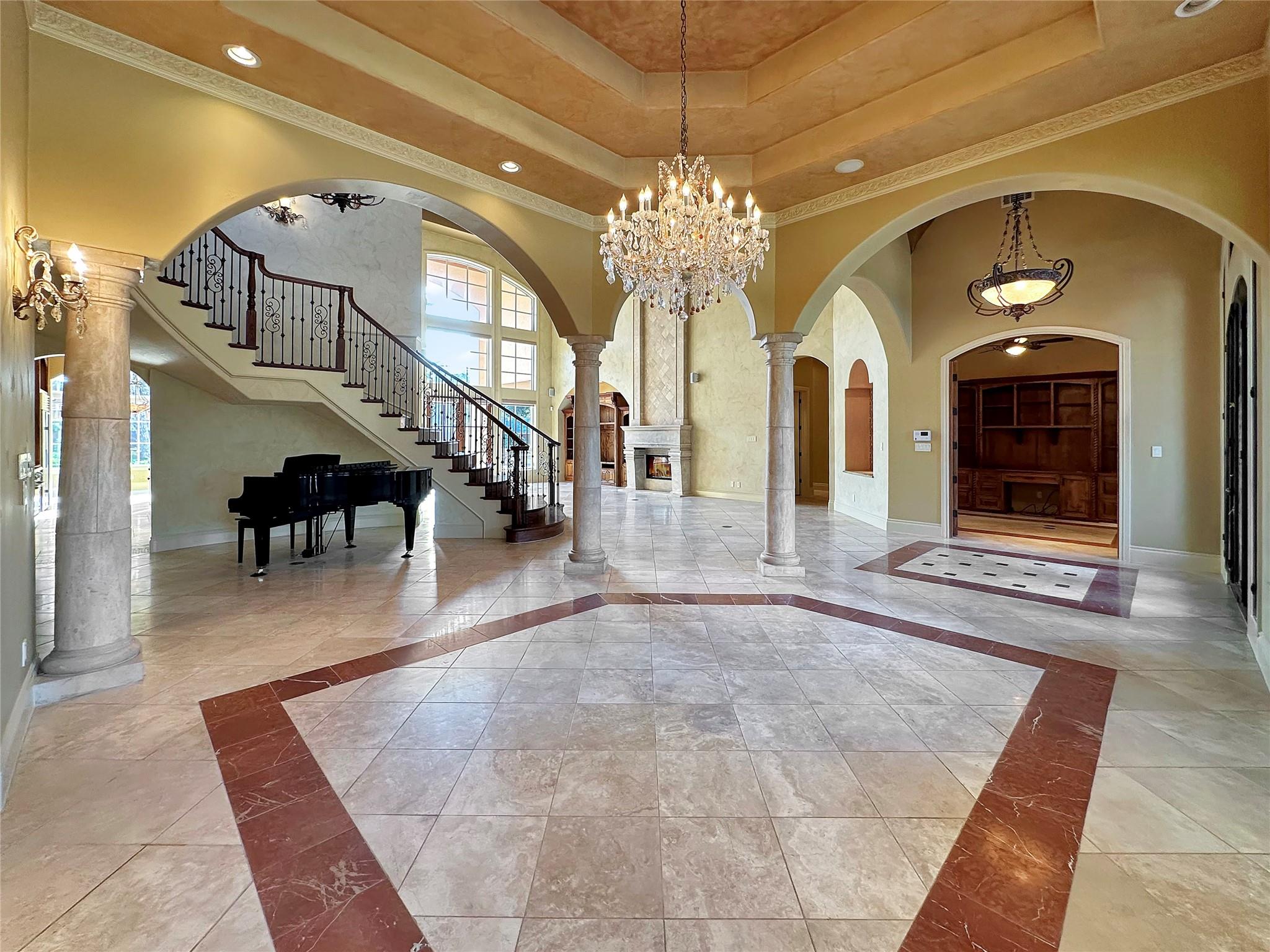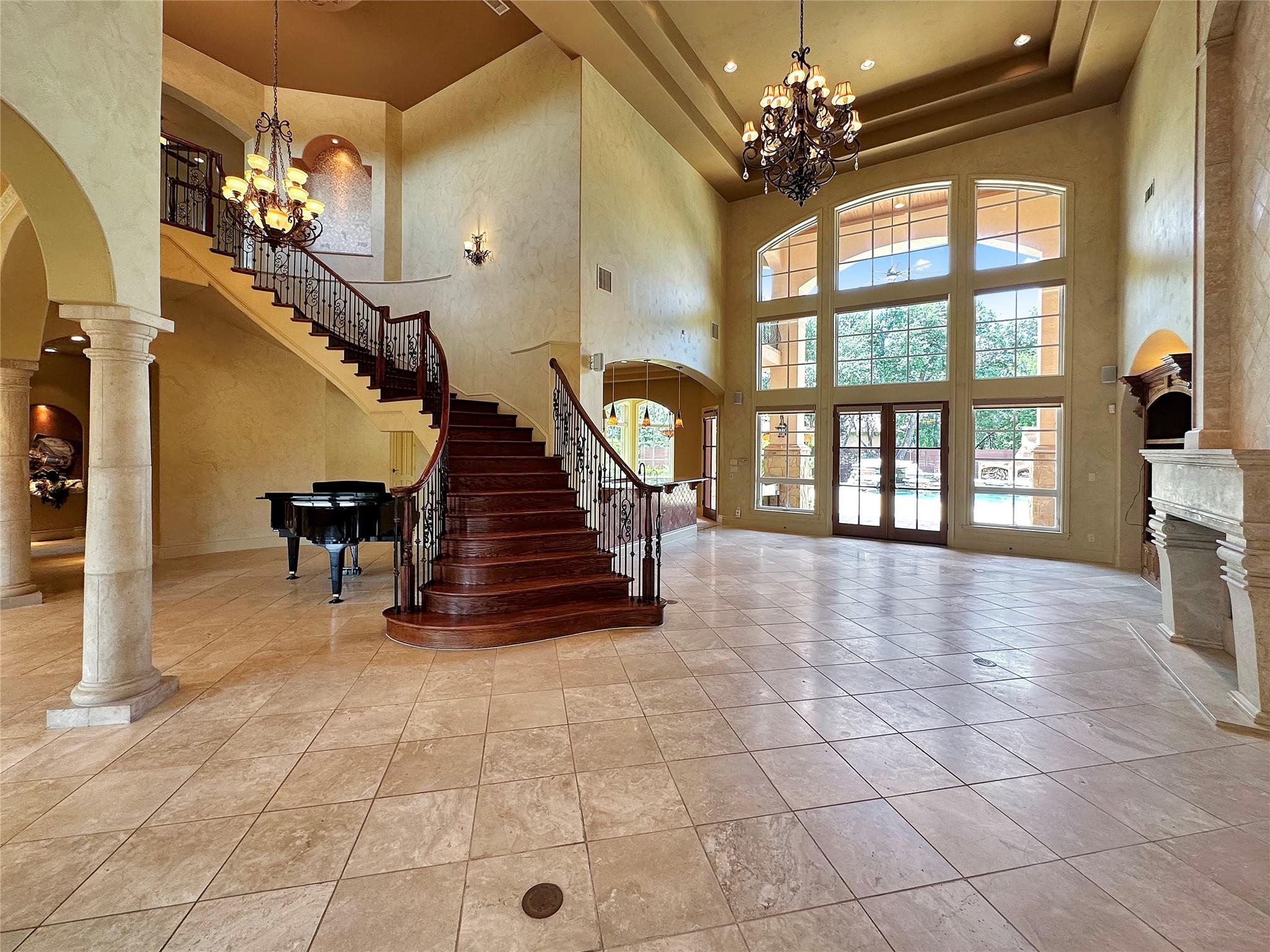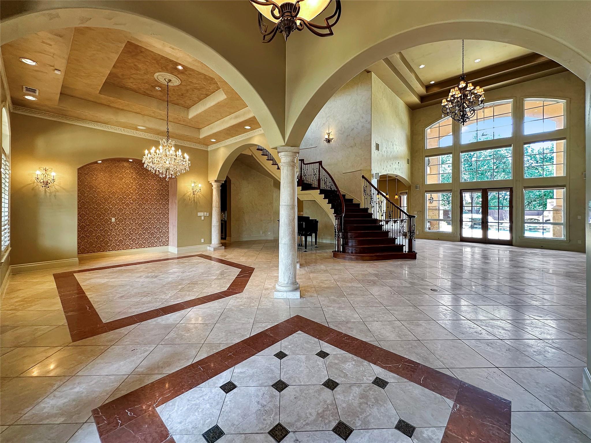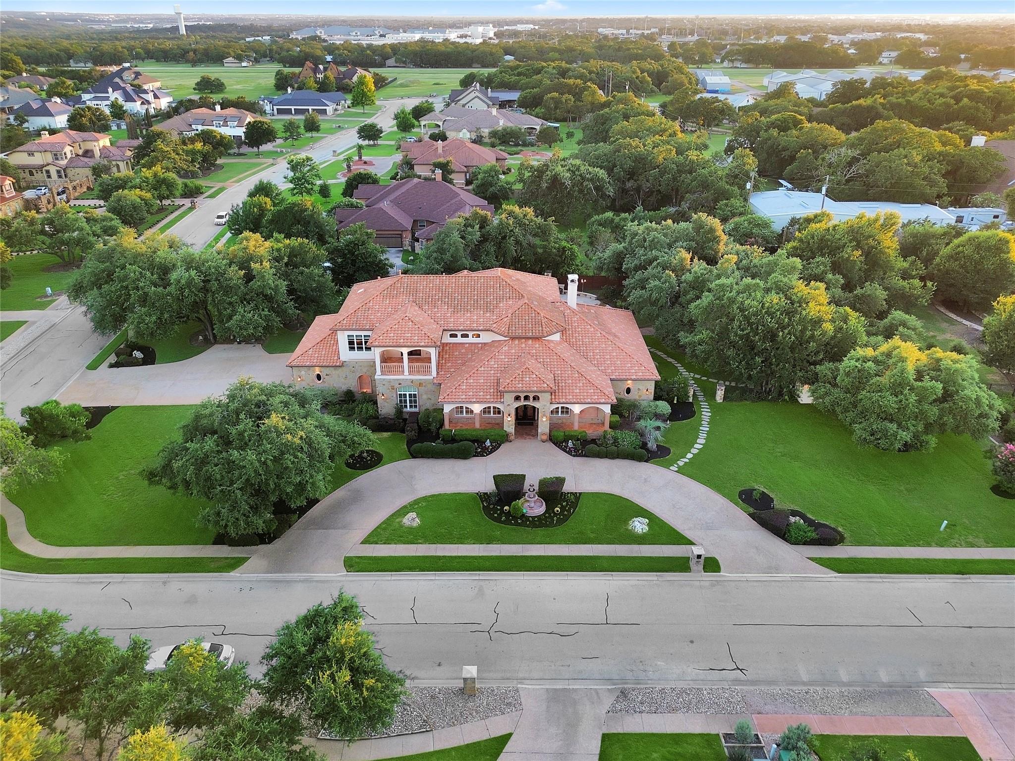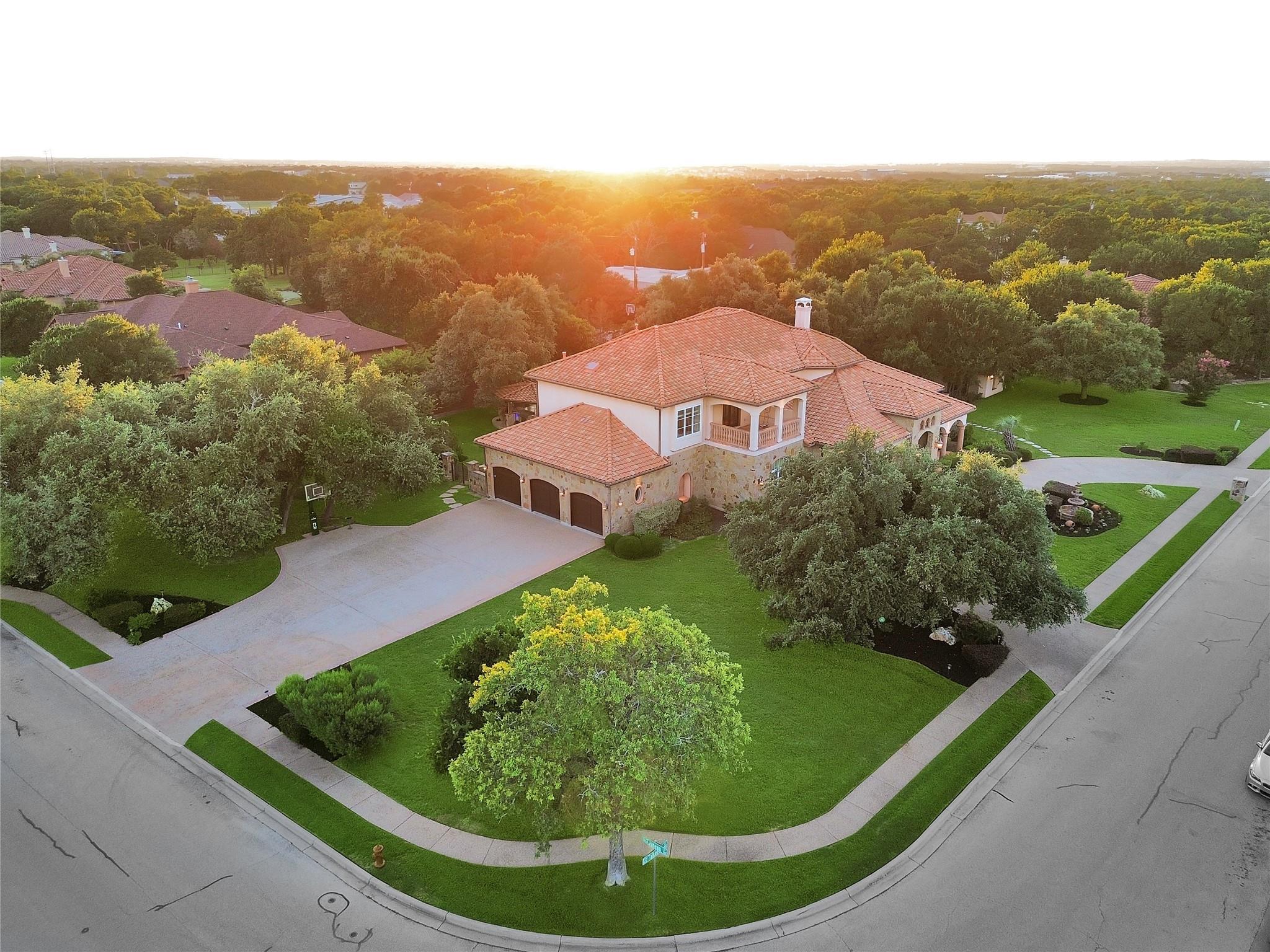 Welcome to this exquisite 5 bed, 6 bath Mediterranean inspired estate on a 1-acre corner lot in the heart of Cedar Park! This masterpiece boasts a captivating blend of Spanish-inspired design elements and modern luxury, offering a lifestyle of unparalleled elegance. As you approach, the eye is drawn to the majestic exterior adorned with Spanish clay roof, meticulously crafted limestone walls, and graceful cantera columns. A driveway at the front welcomes guests, while a secondary expansive driveway leads to the impressive 3-car garage. Step inside and be greeted by an ambiance of grandeur and elegance. High ceilings and abundant windows flood the space with natural light, highlighting the opulent marble pillars, grand fireplace, regal light fixtures, and unmatched staircase that serves as a centerpiece of the home. Luxurious travertine flooring and double tray ceilings adorned with intricate crown molding create an atmosphere of timeless charm. The main level features a thoughtfully designed layout, including a downstairs mother-in-law suite, perfect for accommodating guests in comfort and style. The gourmet kitchen is a chef's dream, equipped with top-of-the-line appliances and ample space for culinary creations. Two wet bars offer effortless entertaining opportunities. Retreat to the lavish primary suite, where a custom "wrap-around" closet provides ample storage, while the en-suite bathroom showcases stunning groin-vaulted ceilings, more marble pillars, and lavish "walk-in" shower. Outside, the backyard paradise beckons with a fully finished out work shed, ideal for hobbies or storage. The covered patio includes soaring ceilings which provide the perfect setting for al fresco dining and relaxation. The pavilion offers granite countertops, built-in sink, grill, and ice maker, creating an outdoor culinary haven. Gather around the chimney fireplace or take a dip in the heated pool and spa, complete with a swim-in grotto waterfall. The epitome of luxury living!