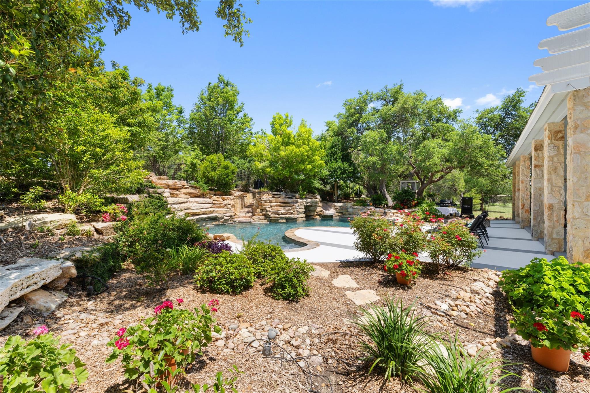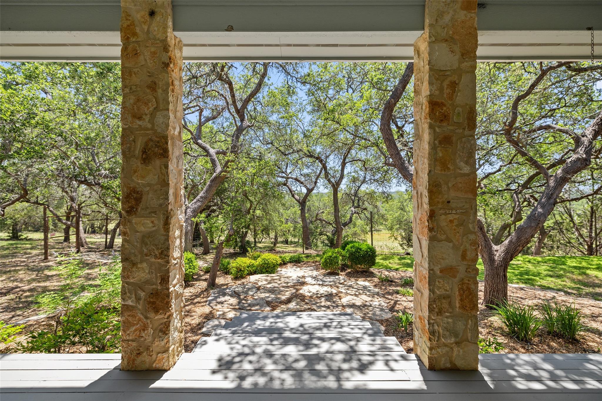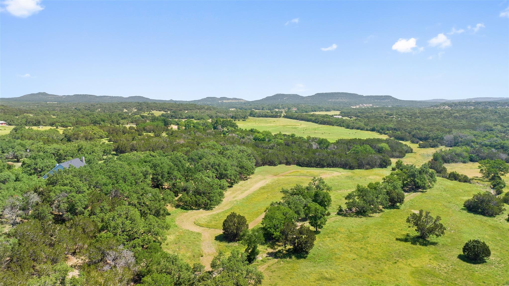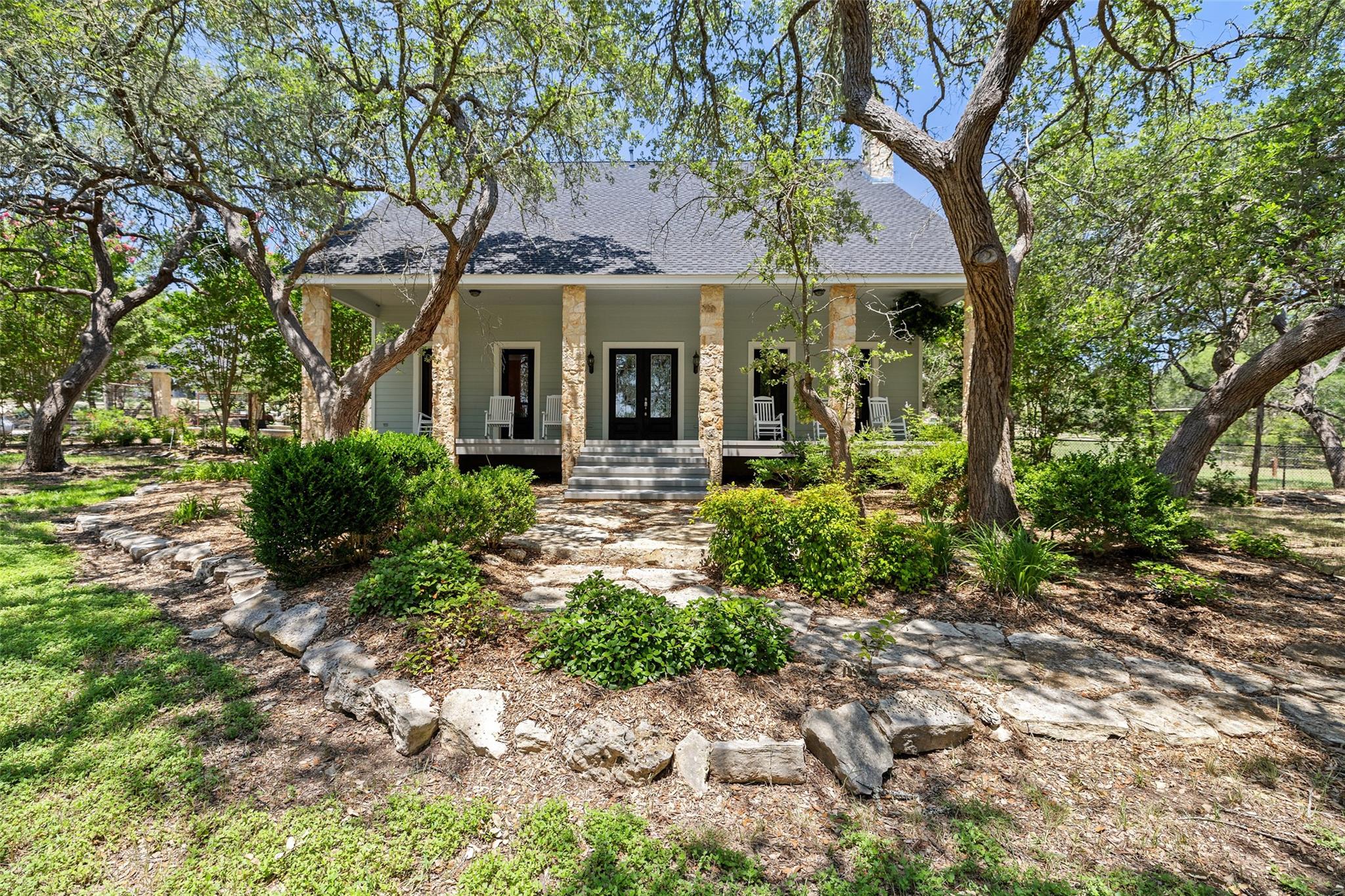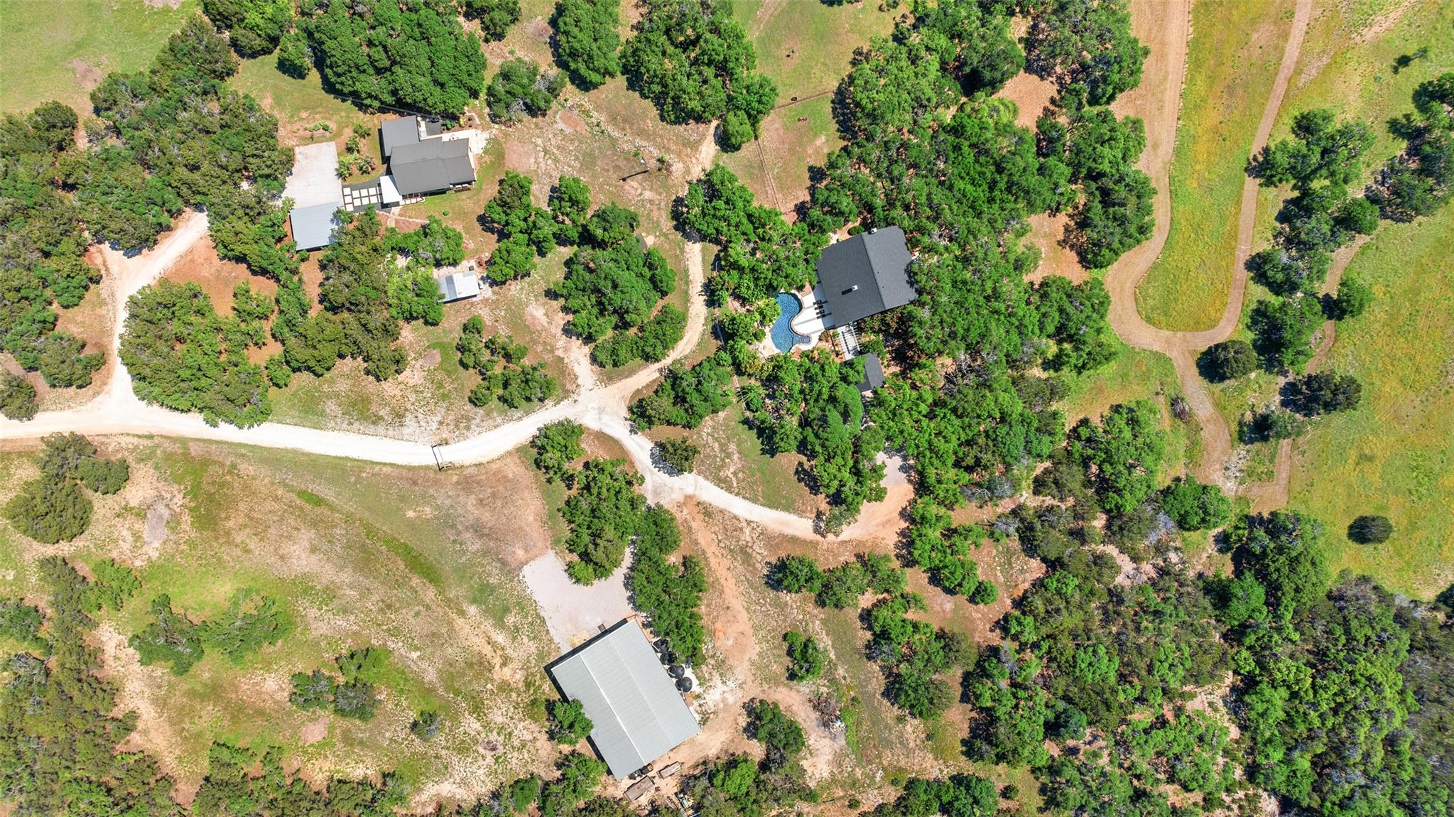 Nestled in the heart of the Texas Hill Country, this breathtaking rural estate spans 25.59+/- acres, offering endless possibilities for enjoyment. The main house, covering 3,200 square feet, features 5 bedrooms and 3.5 baths. With soaring 20 and 9 ceilings and two dining areas, it exudes spaciousness and elegance. A wide front porch overlooks serene, scenic views, perfect for relaxation. Inside, the chef’s kitchen is a dream come true with custom cabinetry, a gas cooktop, quartz countertops, a large island, and a cozy breakfast area with a fireplace. Throughout the home, you'll find beautifully crafted, upscale features. Outside, a covered patio opens to a stunning swimming pool, complete with a rock wall, waterfalls, and a slide. The estate offers multiple outdoor dining and relaxation areas, along with a paved carport. High fencing surrounds the home and pool and home area. The guest house, approximately 2,200 square feet, includes 2 bedrooms, 2 bathrooms, 2 living areas, and a dining area. Custom metal and pine stairs lead to the loft. The kitchen is newly updated with quartz countertops, a large island, pine ceilings, and walls of retractable floor-to-ceiling glass doors that seamlessly blend indoor and outdoor living. Like the main house, the guest house features custom, high-end designs and inviting outdoor areas, along with a nearby 3-car carport. Additional amenities include a 2,400-square-foot metal building with epoxy floors, two overhead doors, 190 square feet of climate-controlled space, and another 2,400 square feet of covered area for RVs, boats, and other equipment. The land boasts a gated entrance, a water well, a 10,000-gallon rainwater collection system, and Middle Creek. It is adorned with mature oak and madrone trees, as well as fruit trees, and is teeming with abundant wildlife. A wildlife agricultural exemption ensures low property taxes.