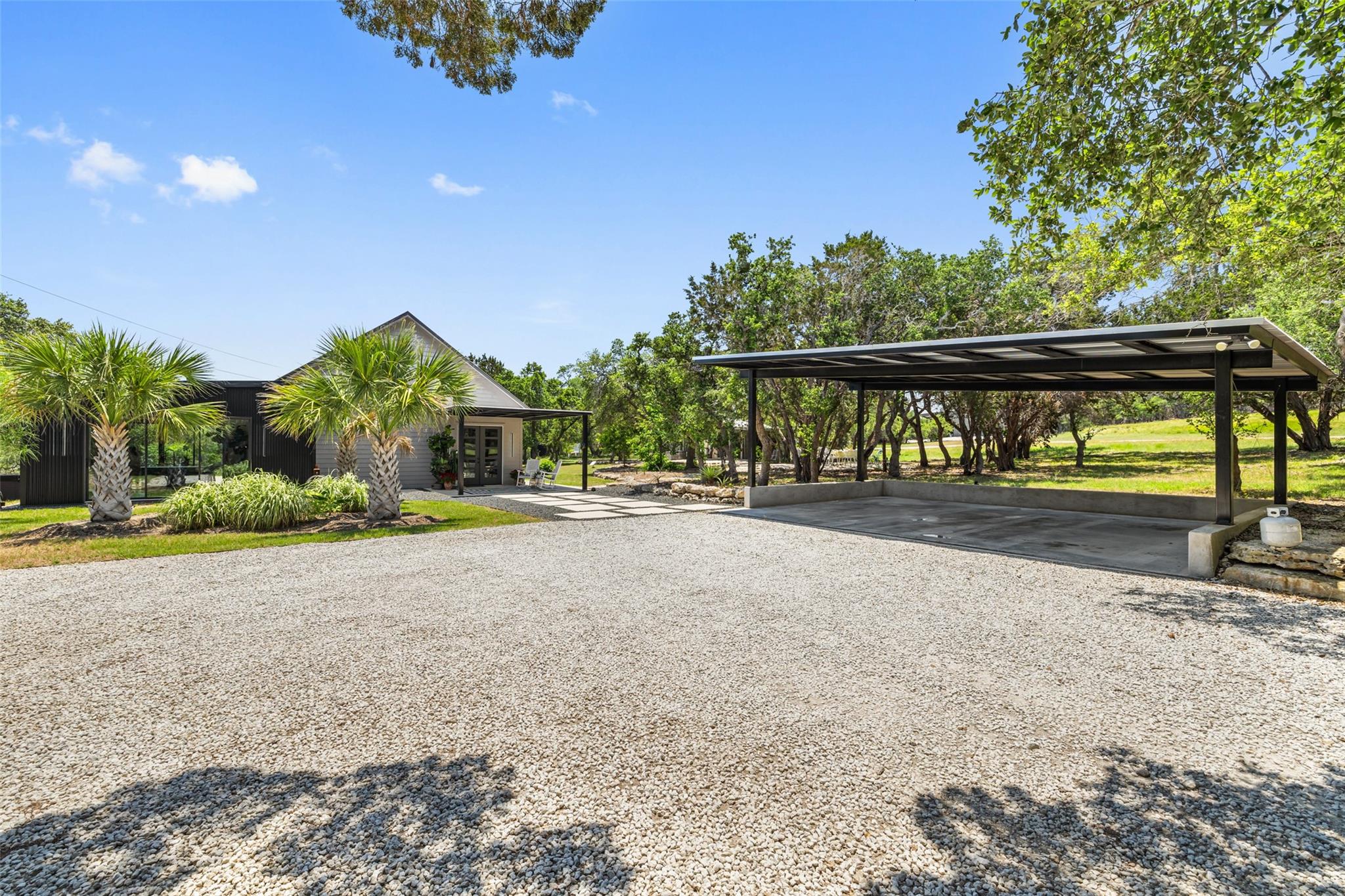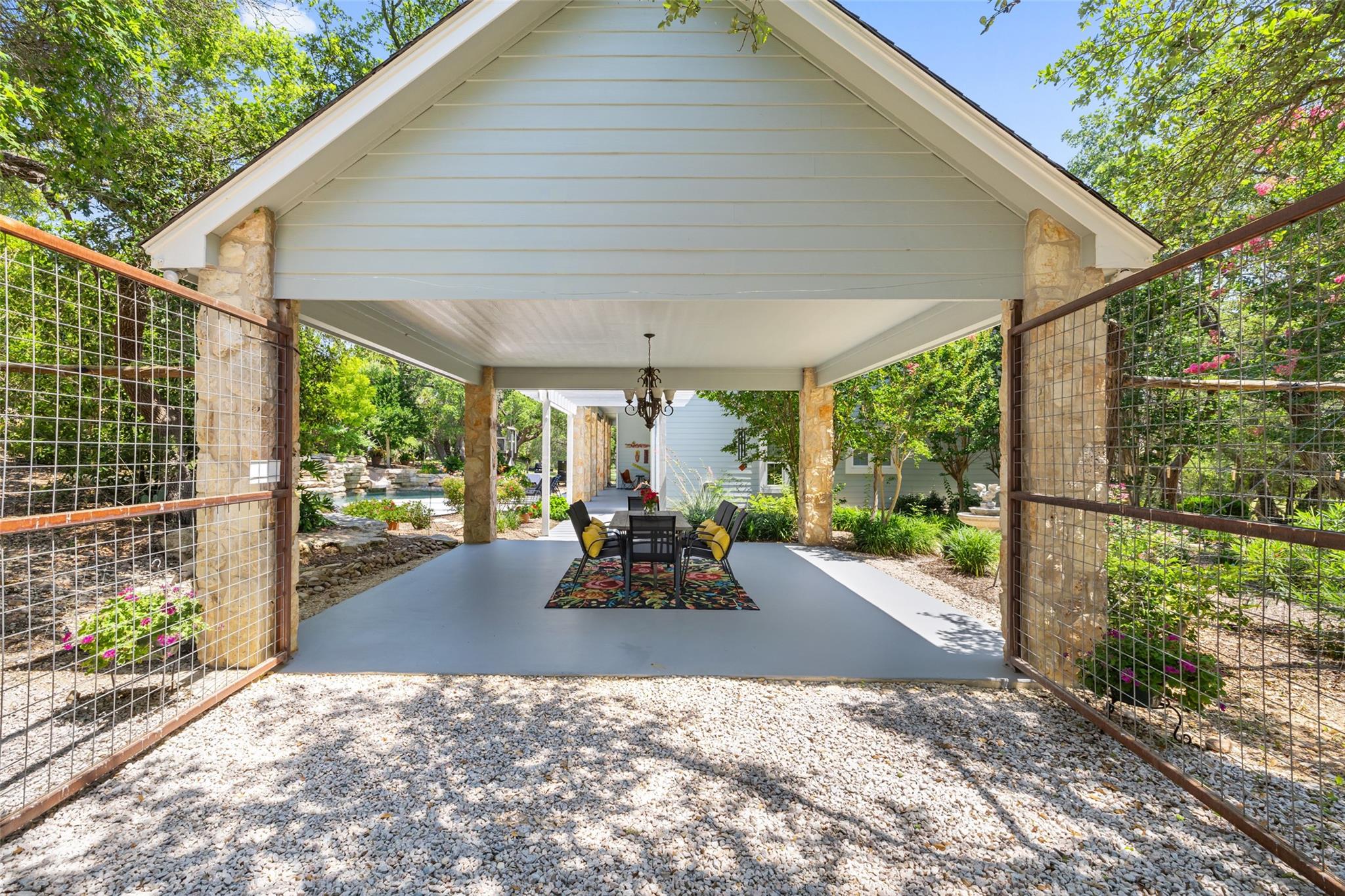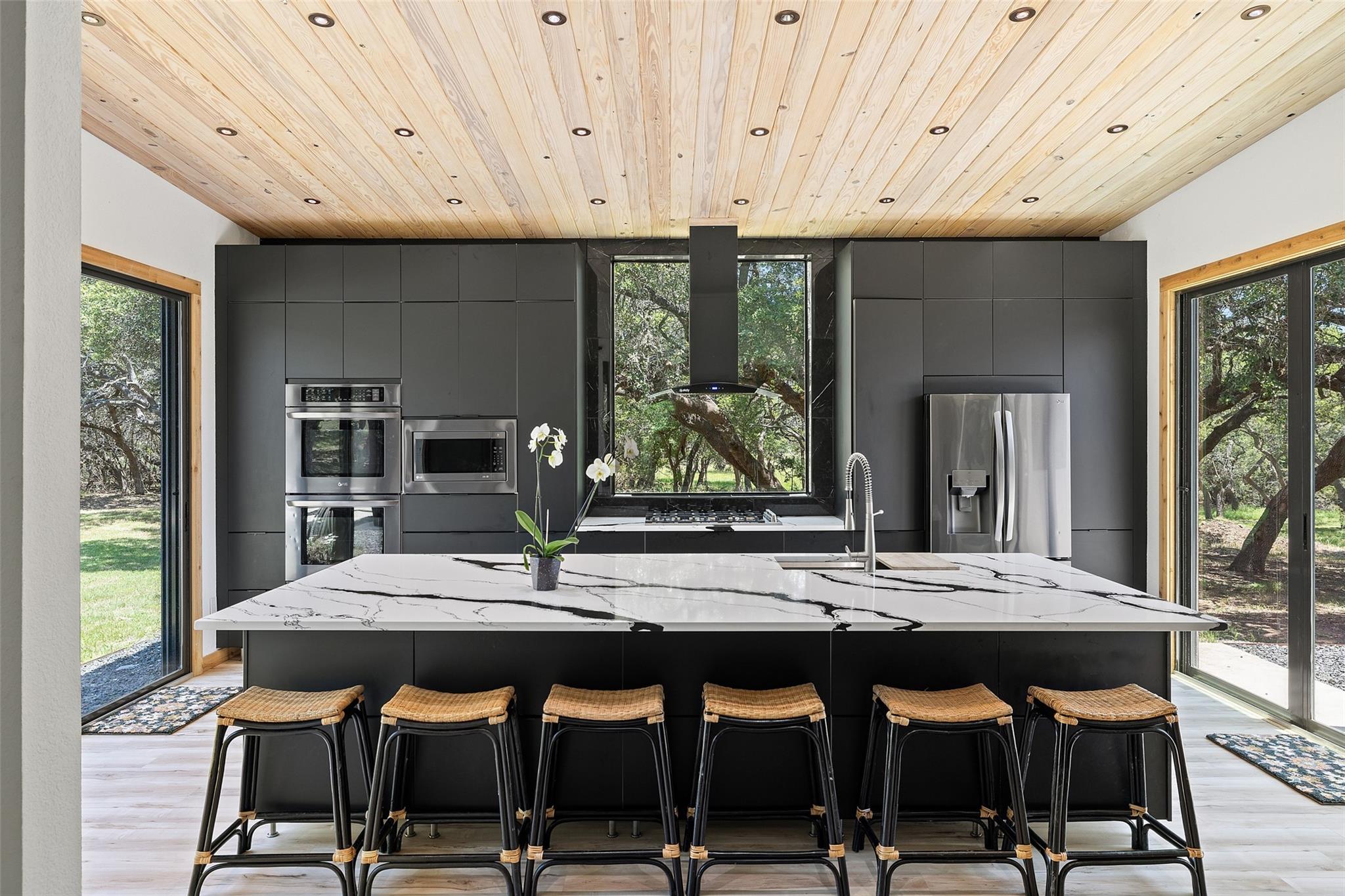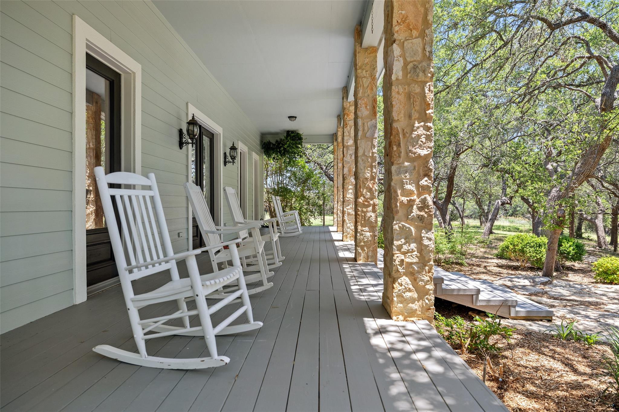Nestled in the heart of the Texas Hill Country, this breathtaking rural estate spans 25.59+/- acres, offering endless possibilities for enjoyment. The main house, covering 3,200 square feet, features 5 bedrooms and 3.5 baths. With soaring 20 and 9 ceilings and two dining areas, it exudes spaciousness and elegance. A wide front porch overlooks serene, scenic views, perfect for relaxation. Inside, the chef’s kitchen is a dream come true with custom cabinetry, a gas cooktop, quartz countertops, a large island, and a cozy breakfast area with a fireplace. Throughout the home, you'll find beautifully crafted, upscale features. Outside, a covered patio opens to a stunning swimming pool, complete with a rock wall, waterfalls, and a slide. The estate offers multiple outdoor dining and relaxation areas, along with a paved carport. High fencing surrounds the home and pool and home area. The guest house, approximately 2,200 square feet, includes 2 bedrooms, 2 bathrooms, 2 living areas, and a dining area. Custom metal and pine stairs lead to the loft. The kitchen is newly updated with quartz countertops, a large island, pine ceilings, and walls of retractable floor-to-ceiling glass doors that seamlessly blend indoor and outdoor living. Like the main house, the guest house features custom, high-end designs and inviting outdoor areas, along with a nearby 3-car carport. Additional amenities include a 2,400-square-foot metal building with epoxy floors, two overhead doors, 190 square feet of climate-controlled space, and another 2,400 square feet of covered area for RVs, boats, and other equipment. The land boasts a gated entrance, a water well, a 10,000-gallon rainwater collection system, and Middle Creek. It is adorned with mature oak and madrone trees, as well as fruit trees, and is teeming with abundant wildlife. A wildlife agricultural exemption ensures low property taxes.