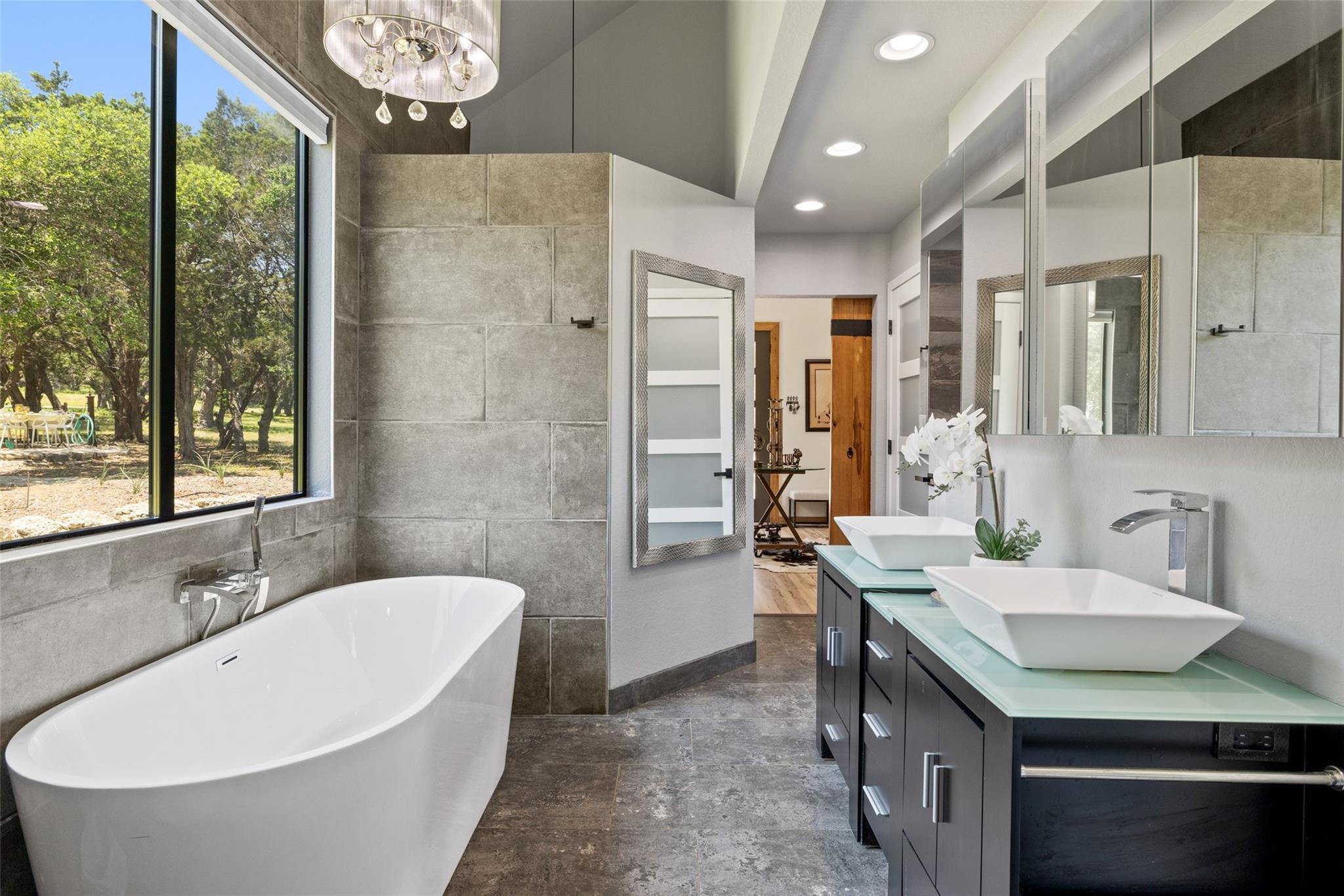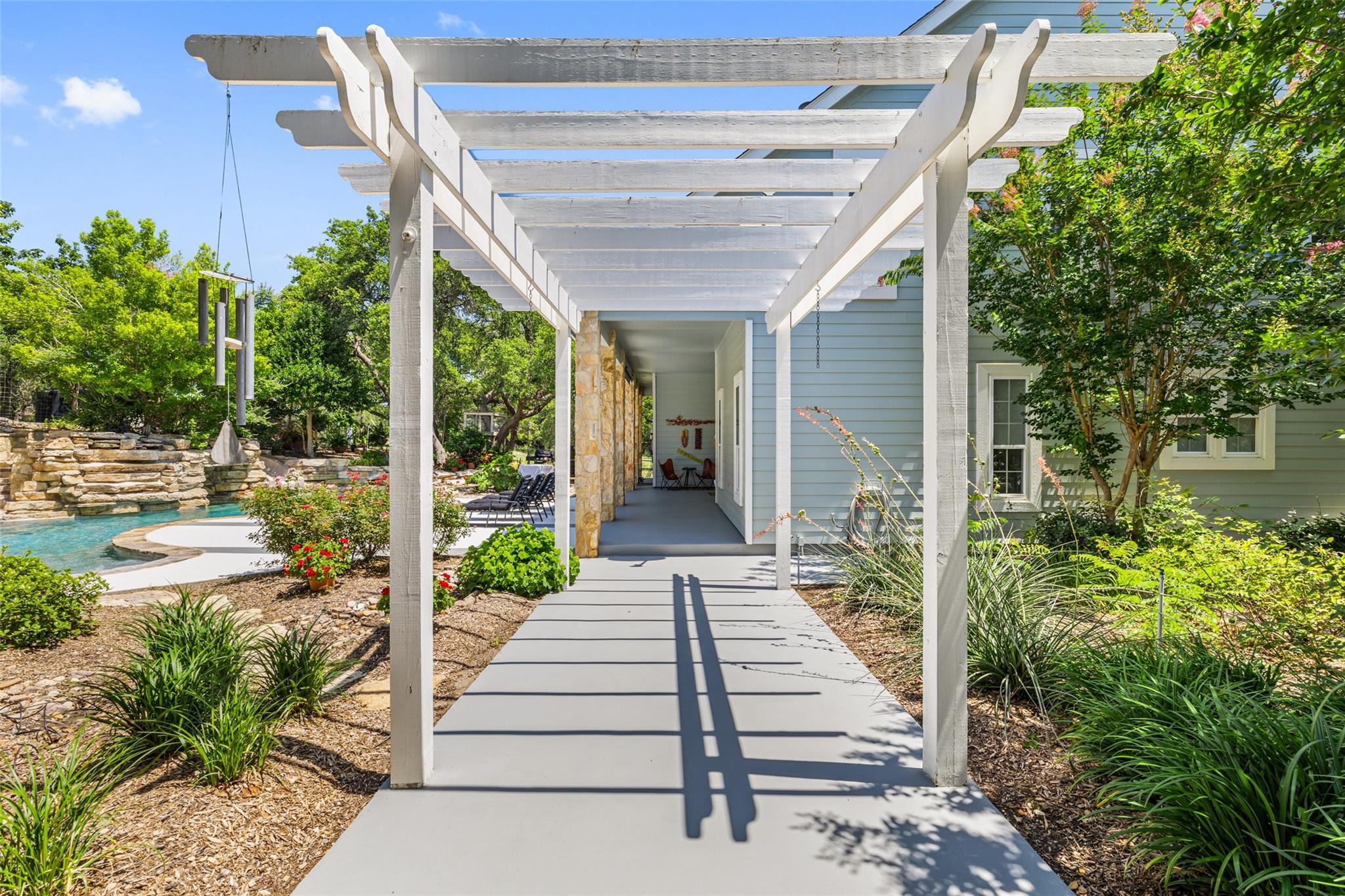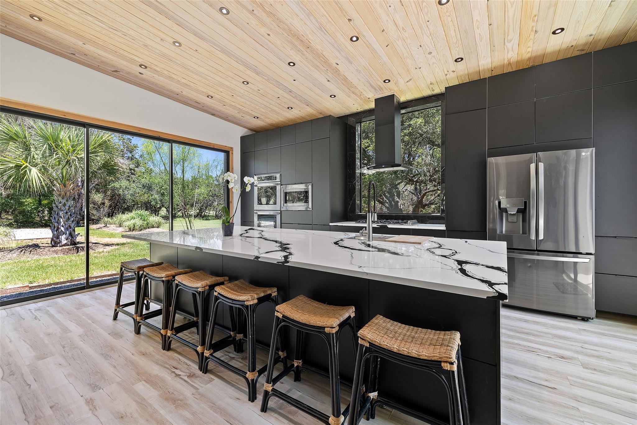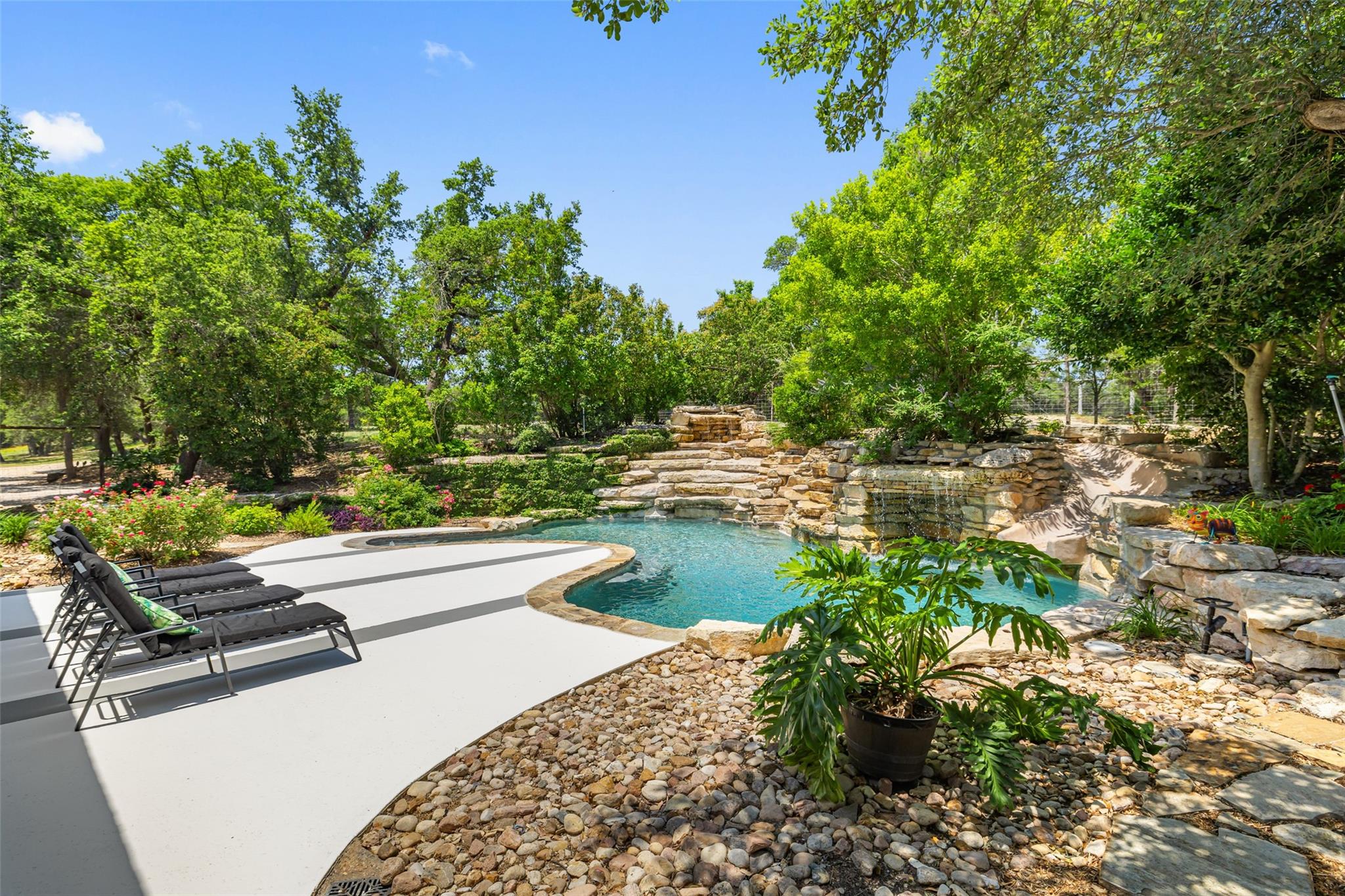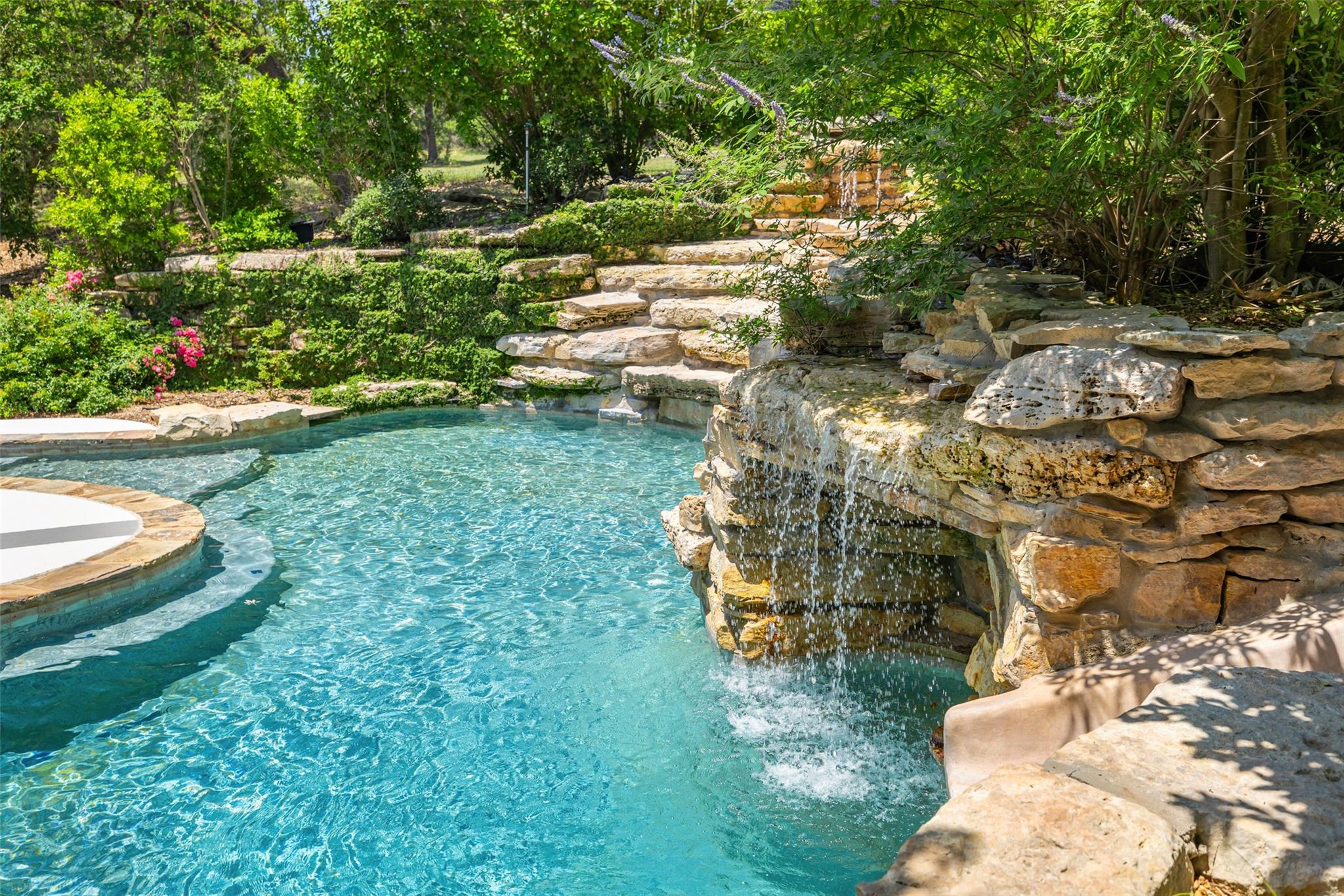 Nestled in the heart of the Texas Hill Country, this breathtaking rural estate spans 25.59+/- acres, offering endless possibilities for enjoyment. The main house, covering 3,200 square feet, features 5 bedrooms and 3.5 baths. With soaring 20 and 9 ceilings and two dining areas, it exudes spaciousness and elegance. A wide front porch overlooks serene, scenic views, perfect for relaxation. Inside, the chef’s kitchen is a dream come true with custom cabinetry, a gas cooktop, quartz countertops, a large island, and a cozy breakfast area with a fireplace. Throughout the home, you'll find beautifully crafted, upscale features. Outside, a covered patio opens to a stunning swimming pool, complete with a rock wall, waterfalls, and a slide. The estate offers multiple outdoor dining and relaxation areas, along with a paved carport. High fencing surrounds the home and pool and home area. The guest house, approximately 2,200 square feet, includes 2 bedrooms, 2 bathrooms, 2 living areas, and a dining area. Custom metal and pine stairs lead to the loft. The kitchen is newly updated with quartz countertops, a large island, pine ceilings, and walls of retractable floor-to-ceiling glass doors that seamlessly blend indoor and outdoor living. Like the main house, the guest house features custom, high-end designs and inviting outdoor areas, along with a nearby 3-car carport. Additional amenities include a 2,400-square-foot metal building with epoxy floors, two overhead doors, 190 square feet of climate-controlled space, and another 2,400 square feet of covered area for RVs, boats, and other equipment. The land boasts a gated entrance, a water well, a 10,000-gallon rainwater collection system, and Middle Creek. It is adorned with mature oak and madrone trees, as well as fruit trees, and is teeming with abundant wildlife. A wildlife agricultural exemption ensures low property taxes.