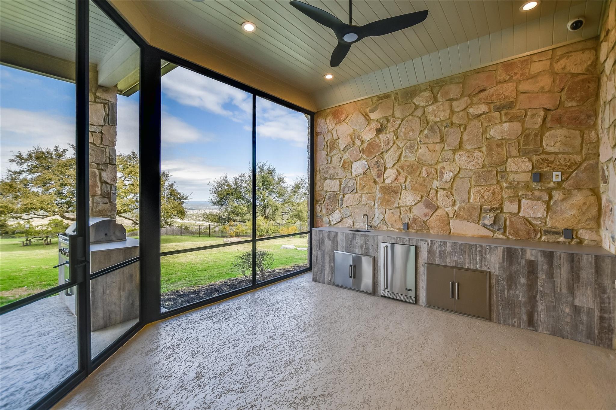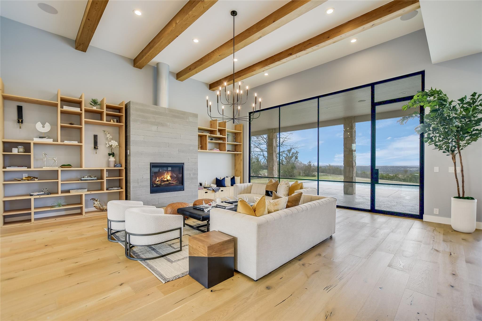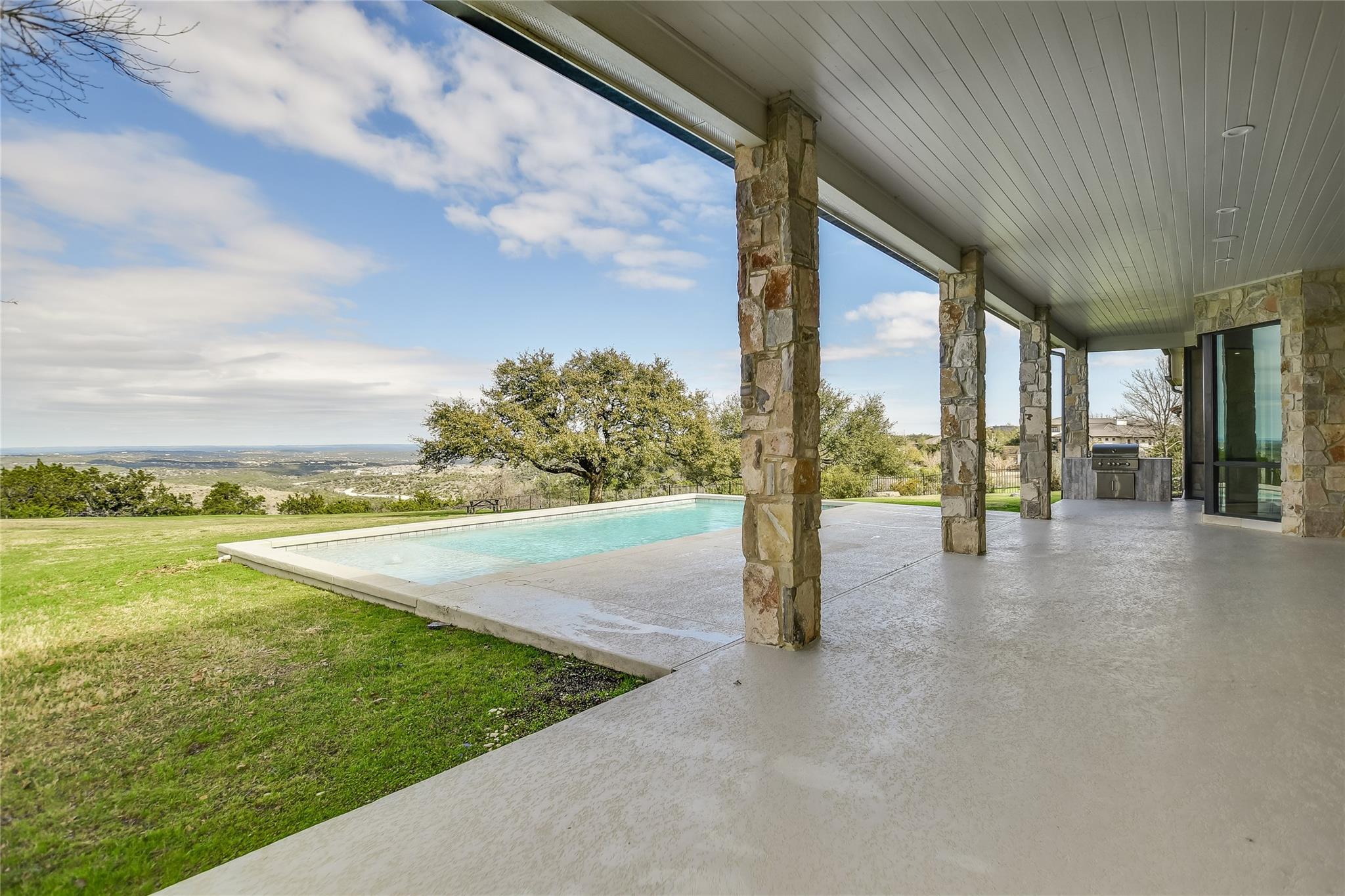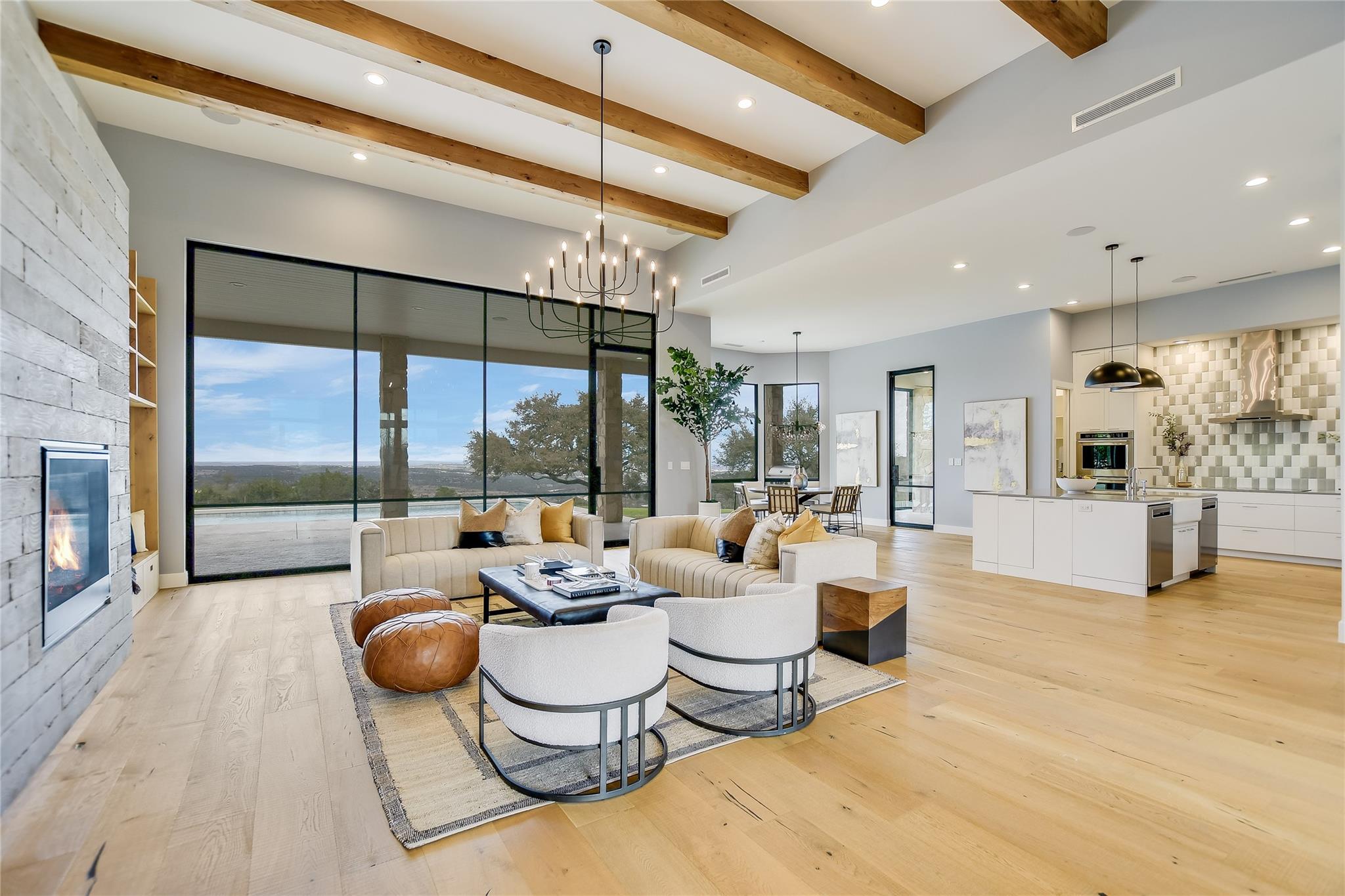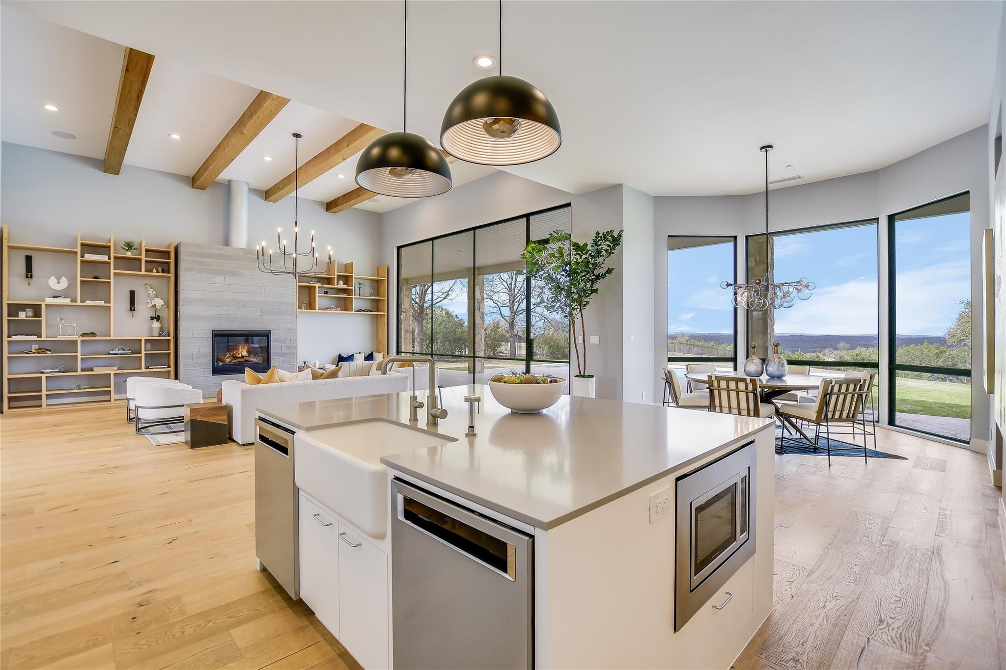 Your dream of quiet peaceful living with amazing Hill Country Views starts here! Step inside the front door and fall in love with the magical yard, the mesmerizing light blue water pool and views for miles. The sellers spent nearly $1 million transforming the 2006 construction into a modern, energy efficient dream home. The simplistic European modern design was created by Nana Kim 9 Square Studio and Zbranek & Holt Custom Homes. Pool constructed by Athena Pools. The large living room is anchored with the industrial design fireplace and custom shelving with bench and features expansive windows that allows for a lot of natural light and brings the calm of nature into the space. The sleek design of the home continues in the kitchen which is open to the living area making it perfect for entertaining. The spacious primary bedroom also takes advantage of the views with floor to ceiling windows, access to the back patio pool, a spa like bathroom and double walk-in closets. Other highlights include a screened in patio with outdoor kitchen, a home office, a dedicated exercise room with its own AC, oversized laundry/mudroom off the garage, fully owned solar system, electric car charger, and Control4 home automation system.