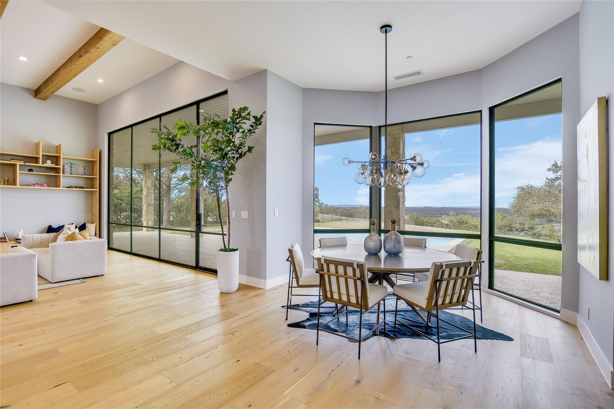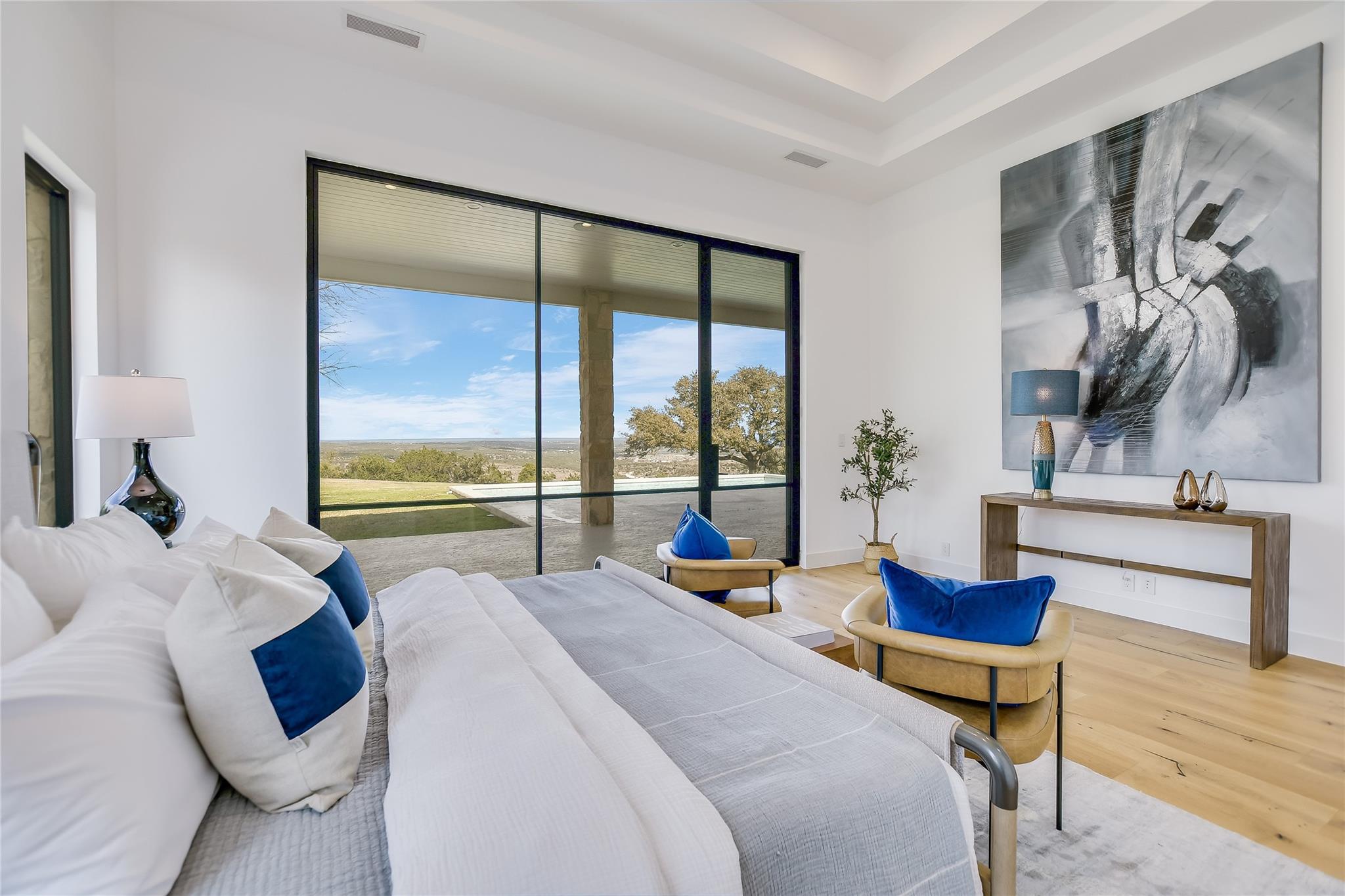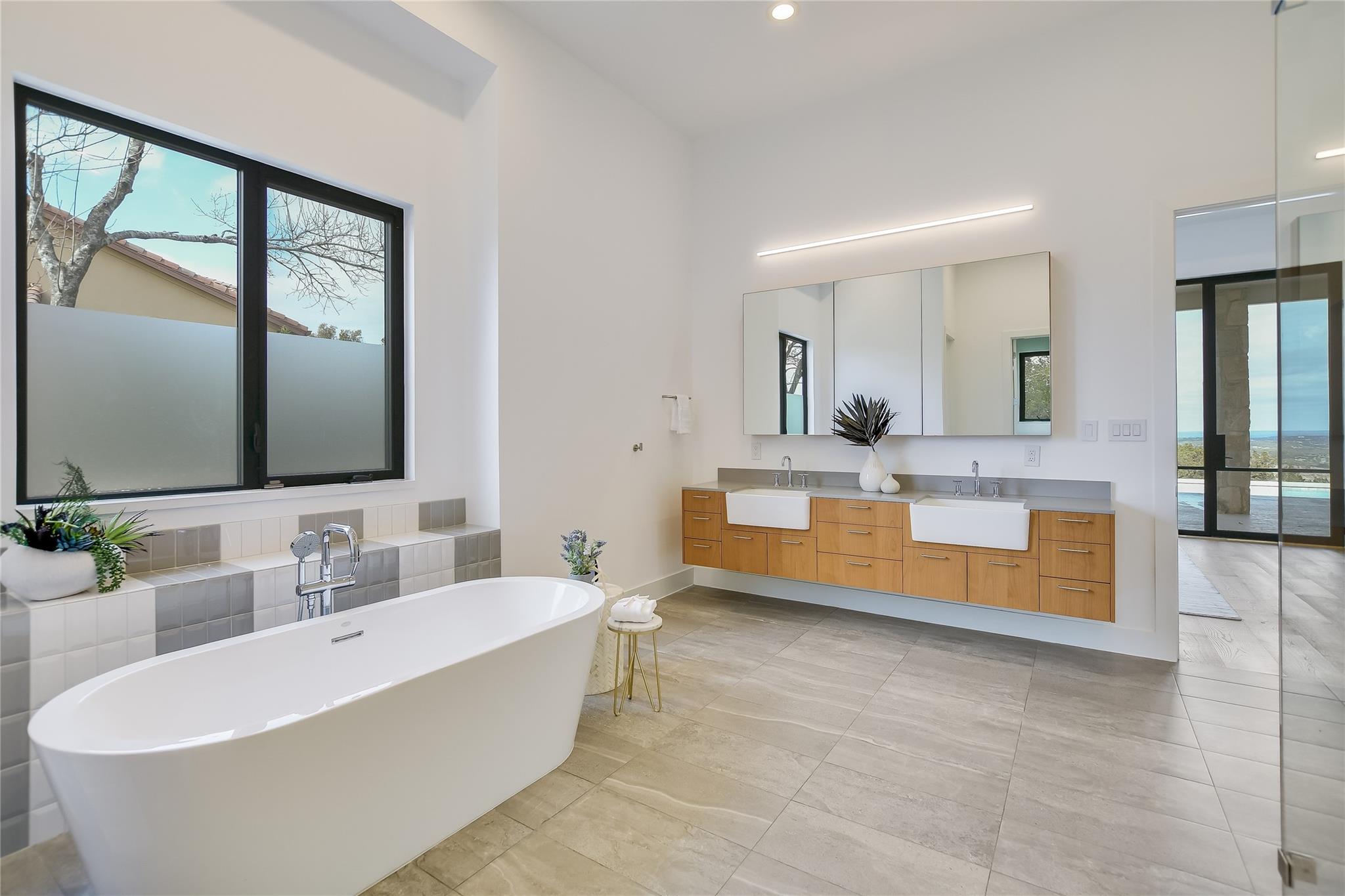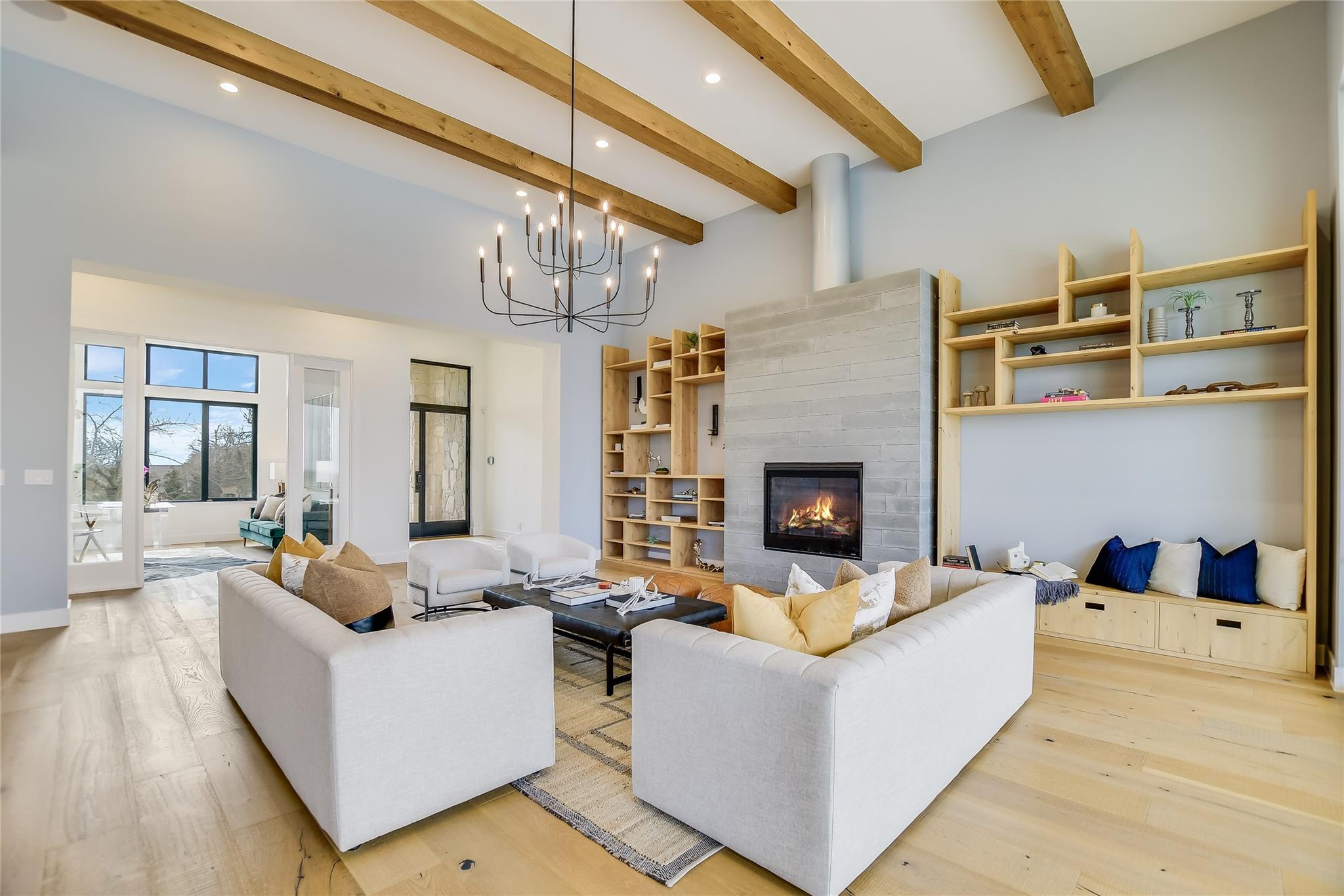 Your dream of quiet peaceful living with amazing Hill Country Views starts here! Step inside the front door and fall in love with the magical yard, the mesmerizing light blue water pool and views for miles. The sellers spent nearly $1 million transforming the 2006 construction into a modern, energy efficient dream home. The simplistic European modern design was created by Nana Kim 9 Square Studio and Zbranek & Holt Custom Homes. Pool constructed by Athena Pools. The large living room is anchored with the industrial design fireplace and custom shelving with bench and features expansive windows that allows for a lot of natural light and brings the calm of nature into the space. The sleek design of the home continues in the kitchen which is open to the living area making it perfect for entertaining. The spacious primary bedroom also takes advantage of the views with floor to ceiling windows, access to the back patio pool, a spa like bathroom and double walk-in closets. Other highlights include a screened in patio with outdoor kitchen, a home office, a dedicated exercise room with its own AC, oversized laundry/mudroom off the garage, fully owned solar system, electric car charger, and Control4 home automation system.