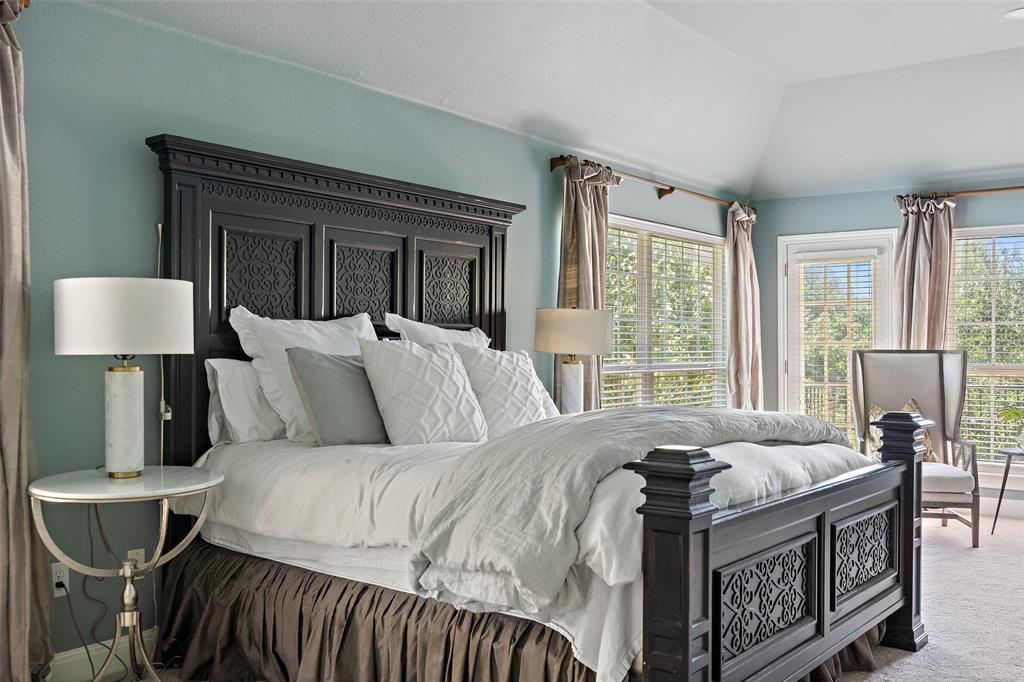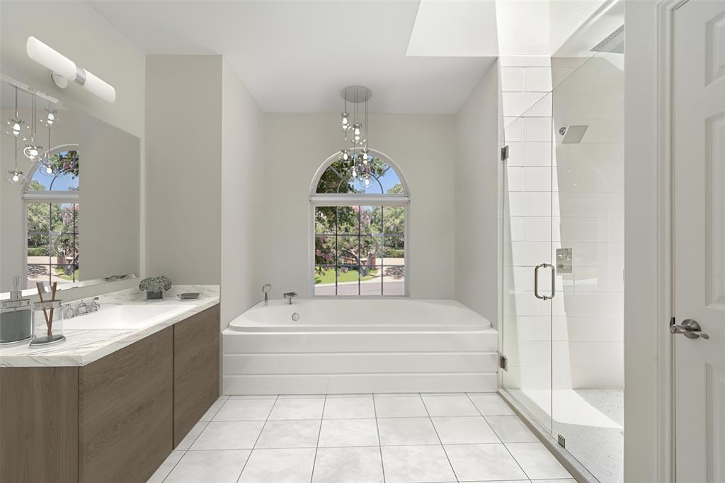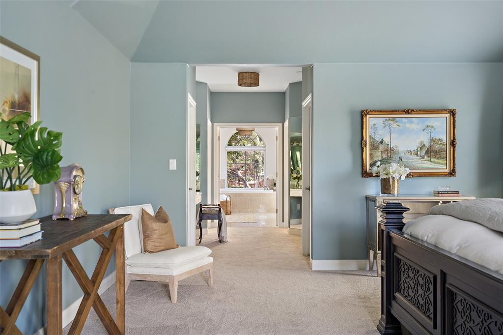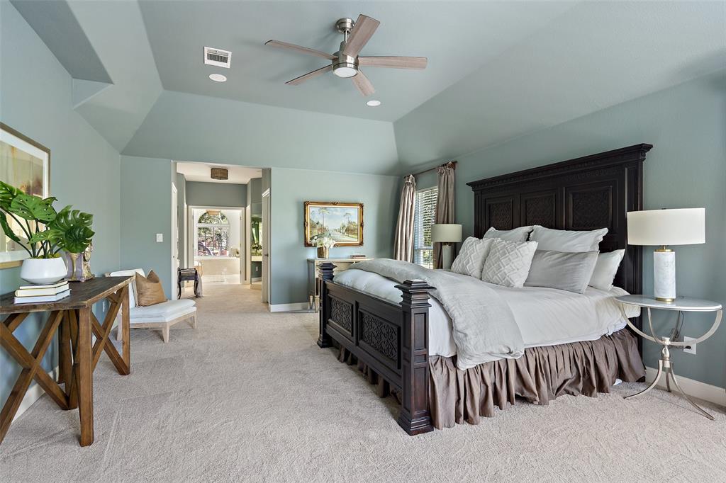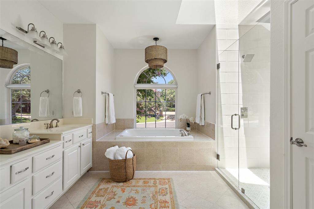 Retreat to the expansive primary suite, which showcases two oversized walk-in closets, an attached office, and a private balcony overlooking the greenbelt and pool. The en-suite primary bath offers ample counter space, double vanities, soothing soaking tub, walk-in shower, and a separate vanity area, providing a luxurious haven for relaxation and pampering.