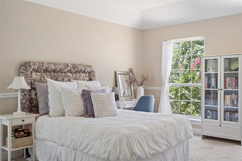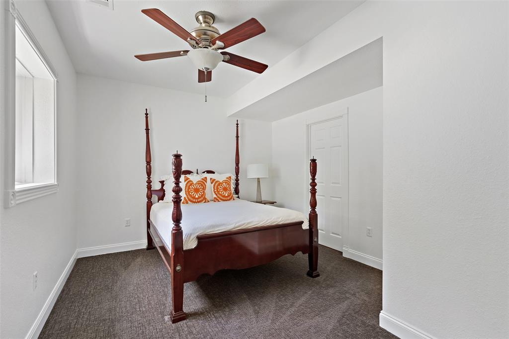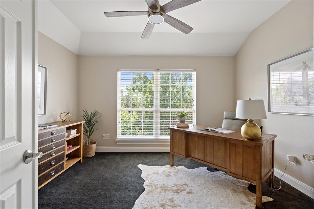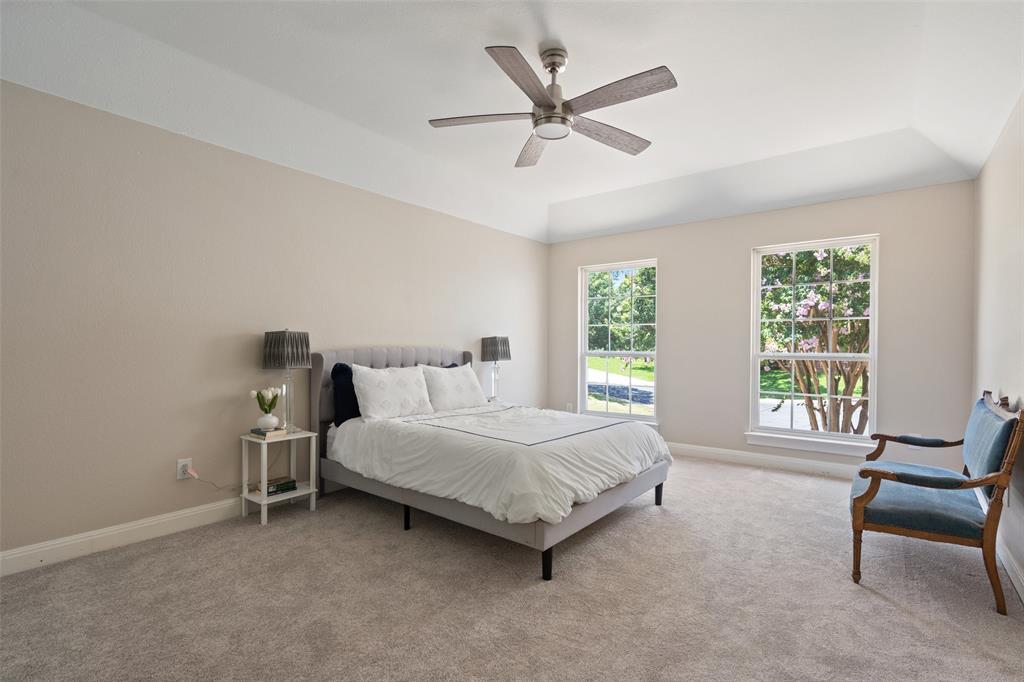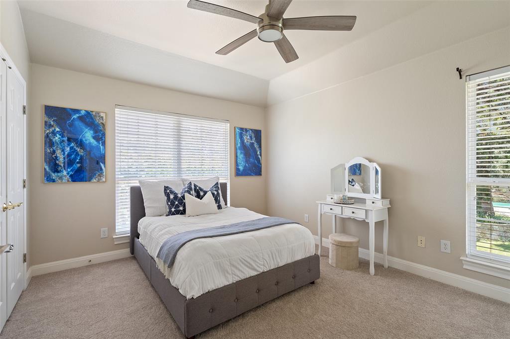 Retreat to the expansive primary suite, which showcases two oversized walk-in closets, an attached office, and a private balcony overlooking the greenbelt and pool. The en-suite primary bath offers ample counter space, double vanities, soothing soaking tub, walk-in shower, and a separate vanity area, providing a luxurious haven for relaxation and pampering.