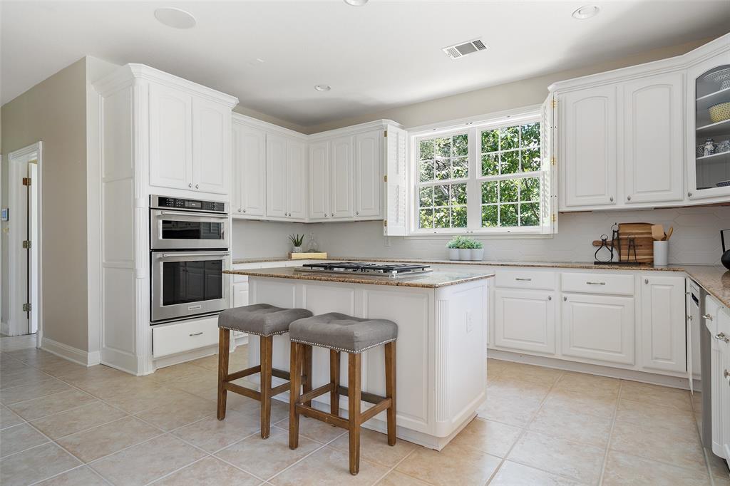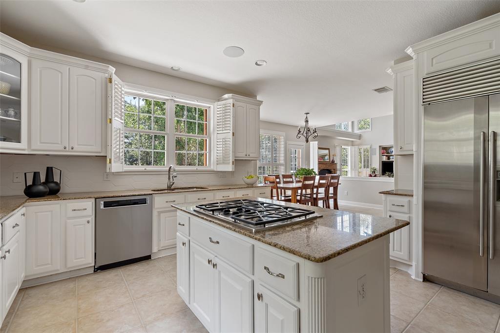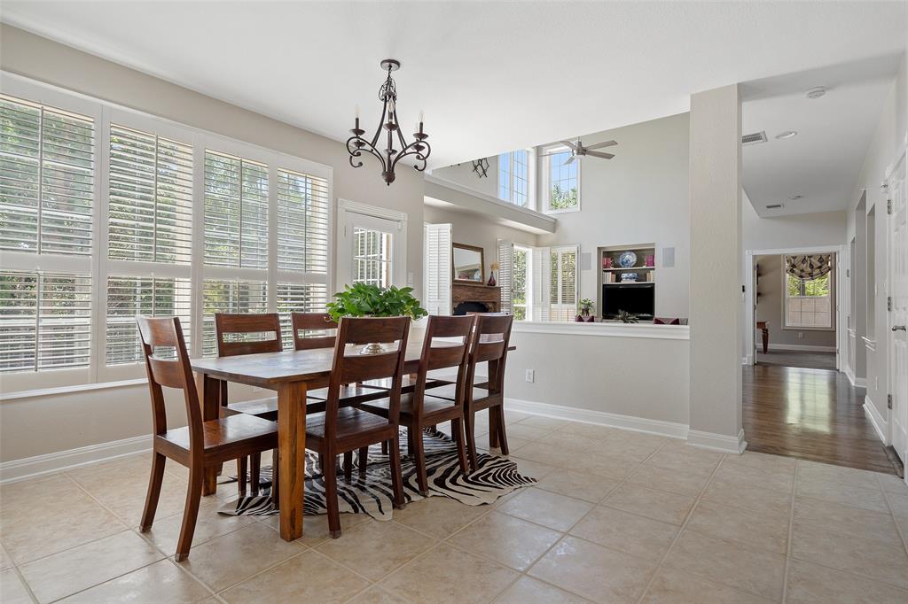 The expansive living and dining areas are adorned with high ceilings, abundant natural light, interior plantation shutters, real hardwood floors, and tasteful built-ins, exuding elegance and warmth. The main-level kitchen, complete with stainless steel appliances and granite countertops, serves as the heart of the home, seamlessly connecting the breakfast area and main living space. Whether it's a cozy meal or a grand celebration, the formal dining room and living room provide the perfect backdrop for any occasion.