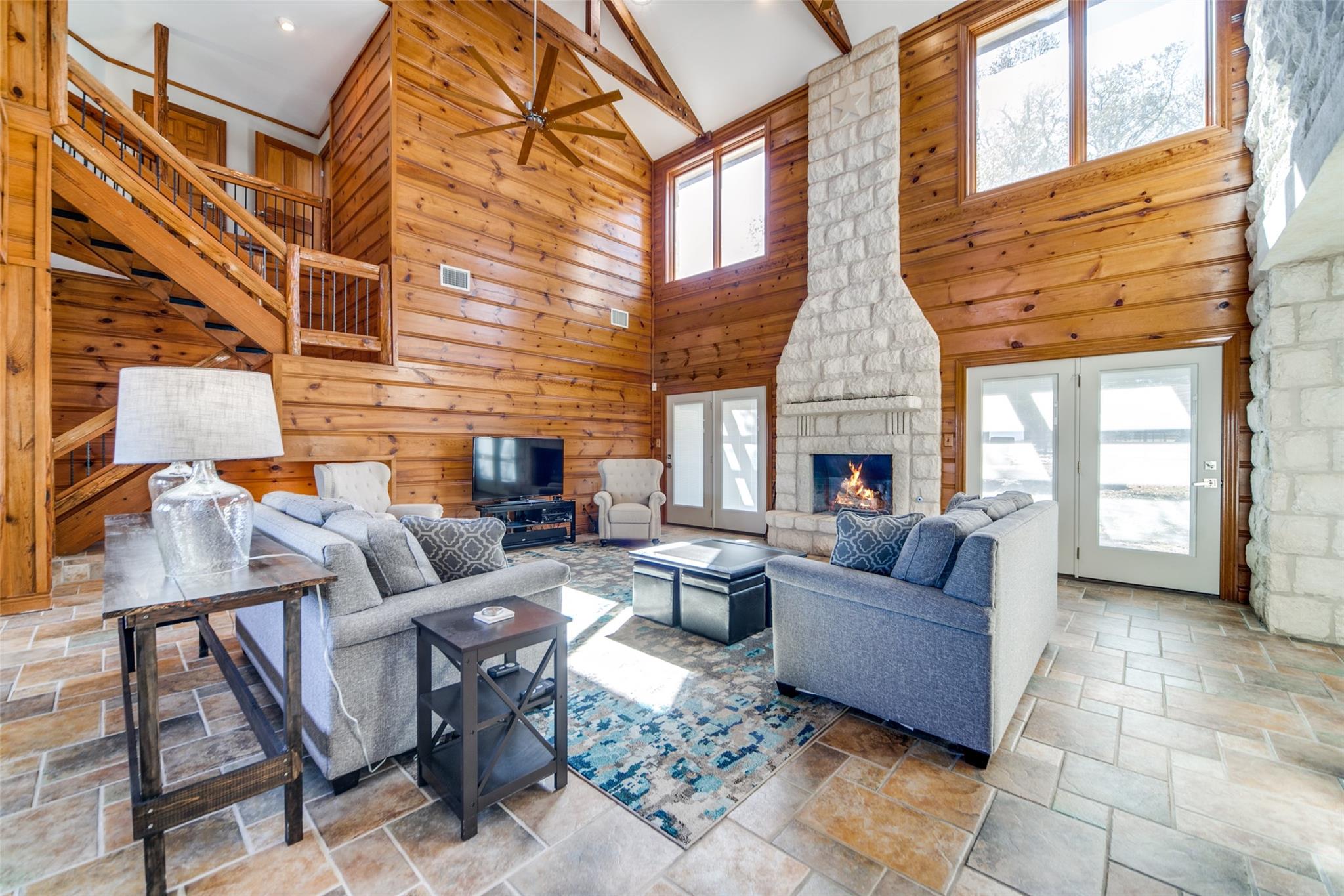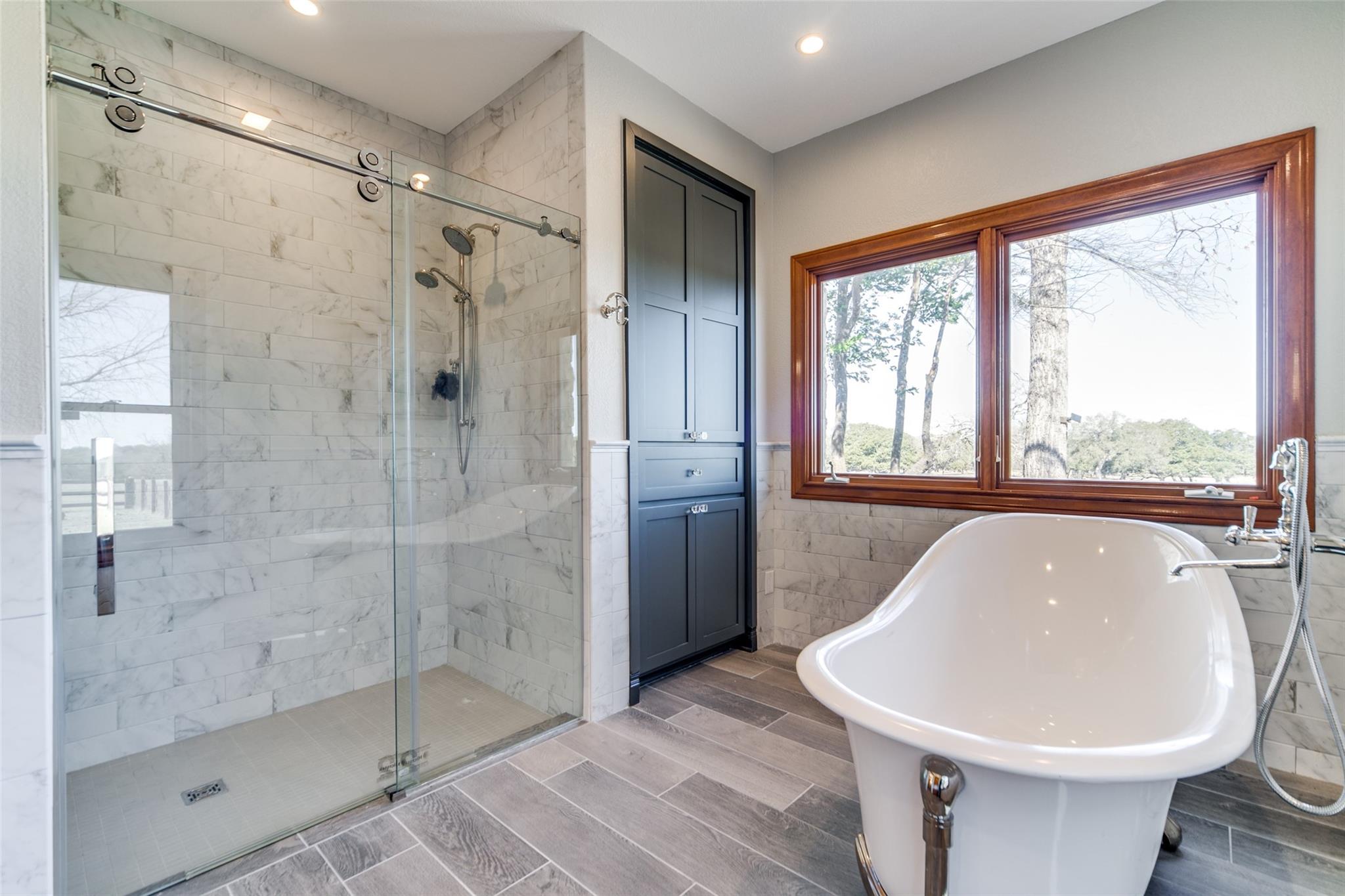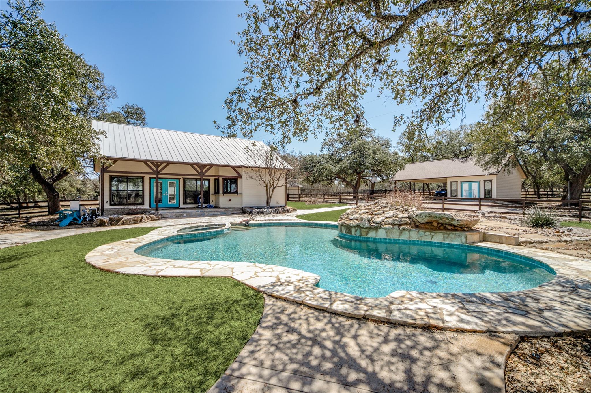 WILDLIFE exempt! UNRESTICTED! There is a luxurious lodge style main home, a pool house and a guest house totaling 7,022 sqft of living space! WOW is the best way to describe this completely updated Hill Country beauty with a separate updated guest house. The 4193 sqft main home features gorgeous wood and rock with a soaring rock fireplace in this dramatic lodge style living room with exposed wood beams. A completely remodeled kitchen with Thermador appliances, gas cool top with 6 burners & griddle, quartz counter tops, tile flooring, soft close cabinets, wine cooler and an ice maker. The master bath has been remodeled with a wonderful soaking tub and a great walk in shower. Guest house features a rock fireplace and an updated kitchen with all new appliances, no carpet, 3/2 with porch overlooking the property. The pool house has a full kitchen with 2 bathrooms. There is an old barn with turn out stalls and a feed room. There is an arena, 3 wells, a stock tank (dry right now), another room which would ne a great workout room, covered 2 covered carports, a storage building with roll up door for lawn mowers, etc. The possibilities of this property is ENDLESS! A multi-family compound, vineyard, equine center, cattle ranch, corporate retreat and much more. Bring you imagination and make it yours!!