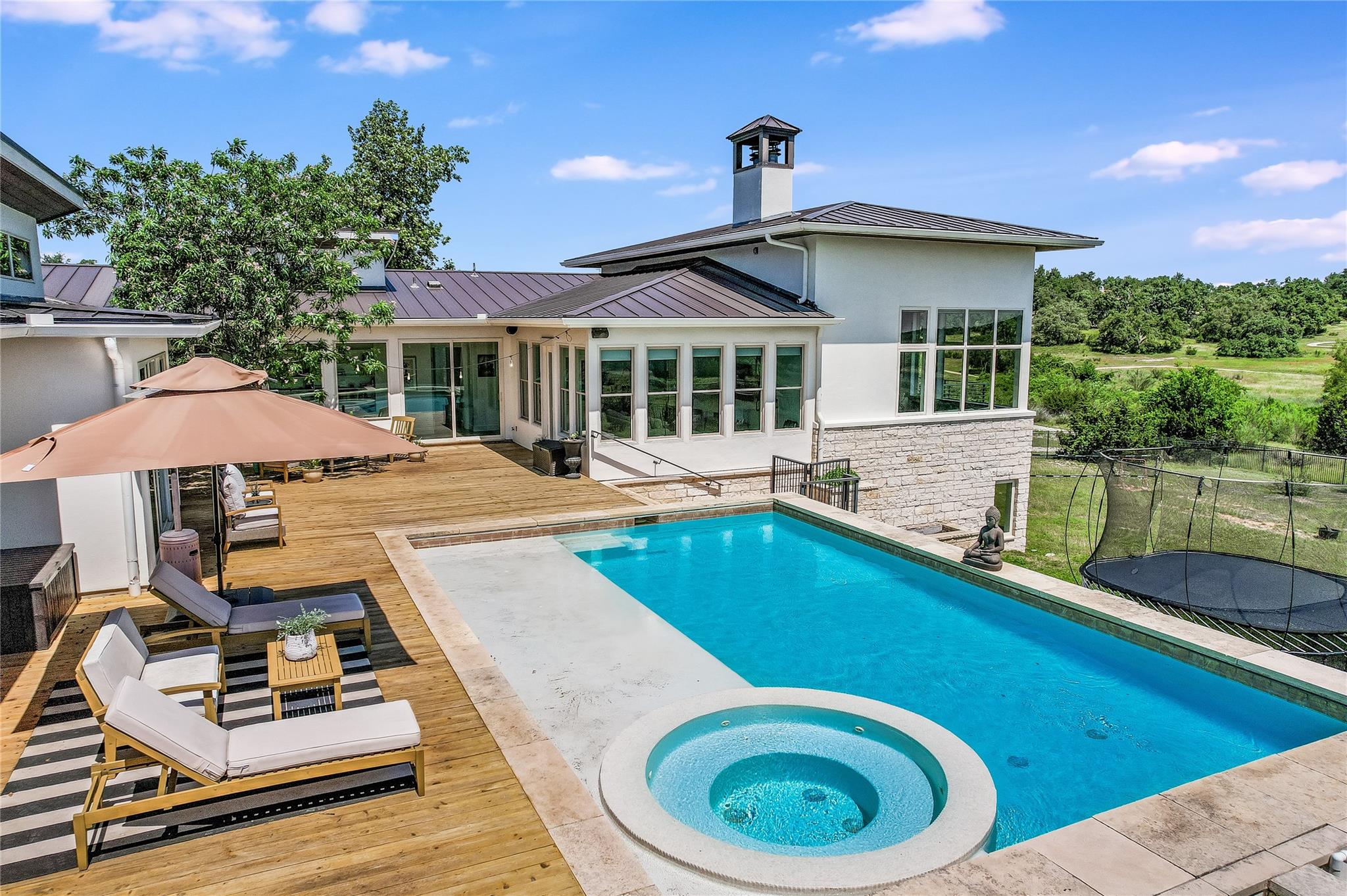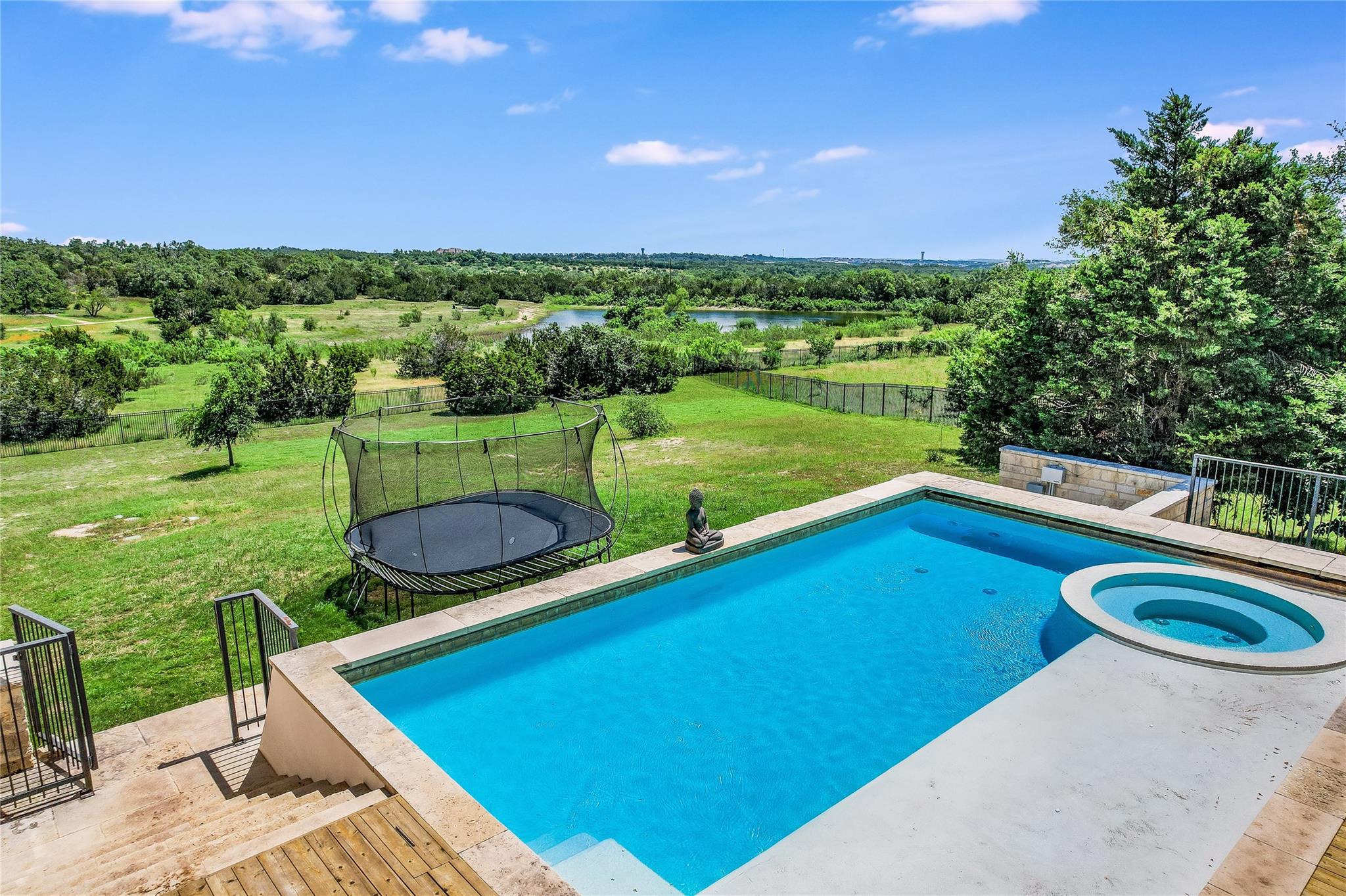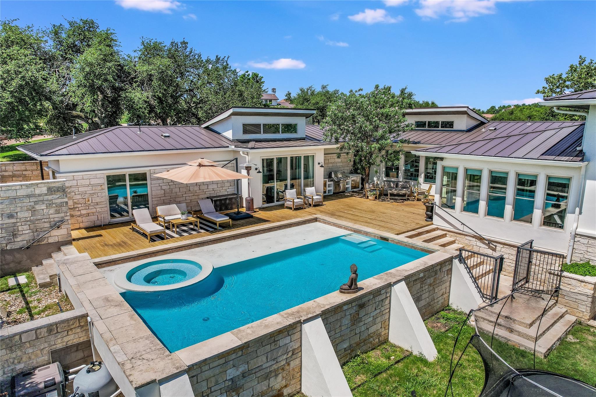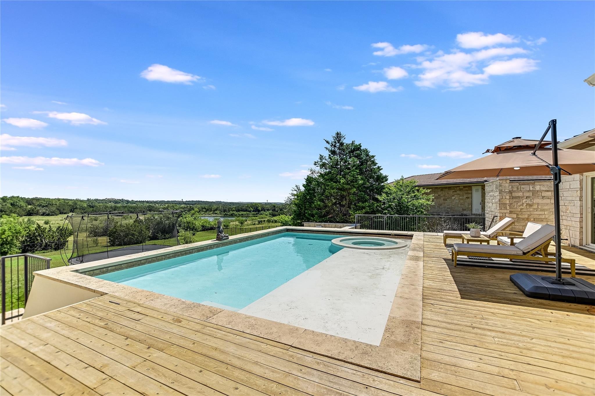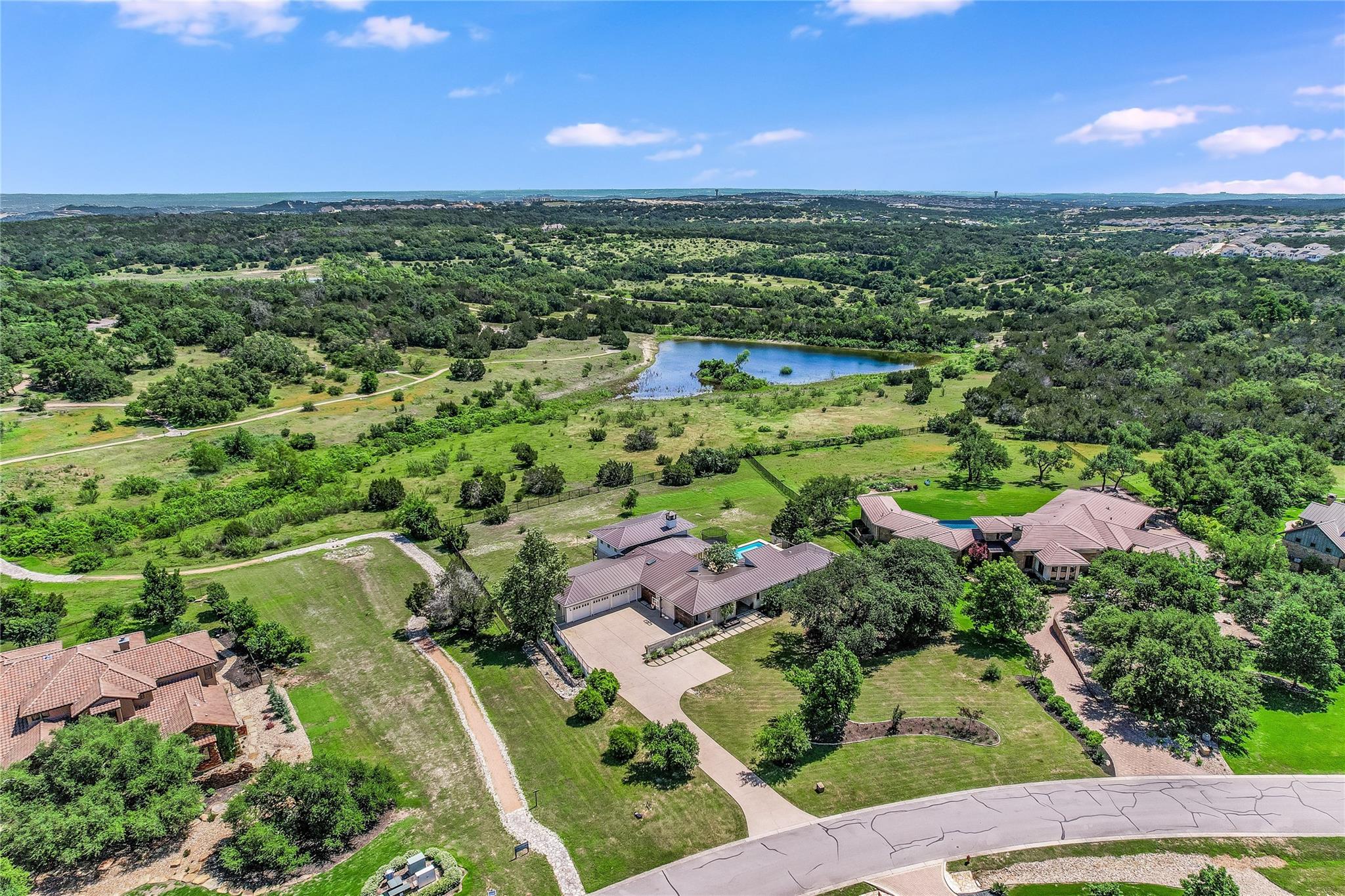 The back patio is perfect for alfresco dining with a built-in summer kitchen, infinity pool and spa, and stunning greenbelt and lake views. The expansive backyard offers space for a garden, pickleball court, or playground.