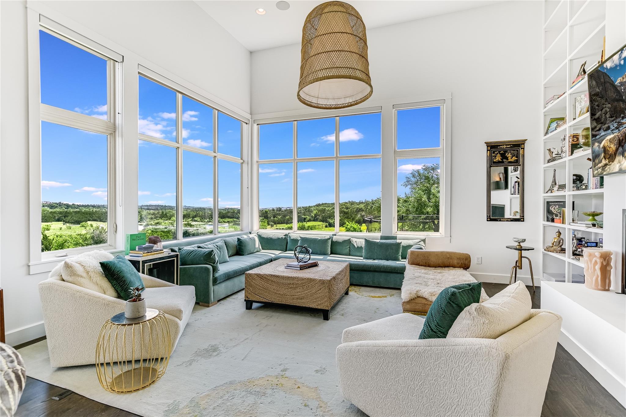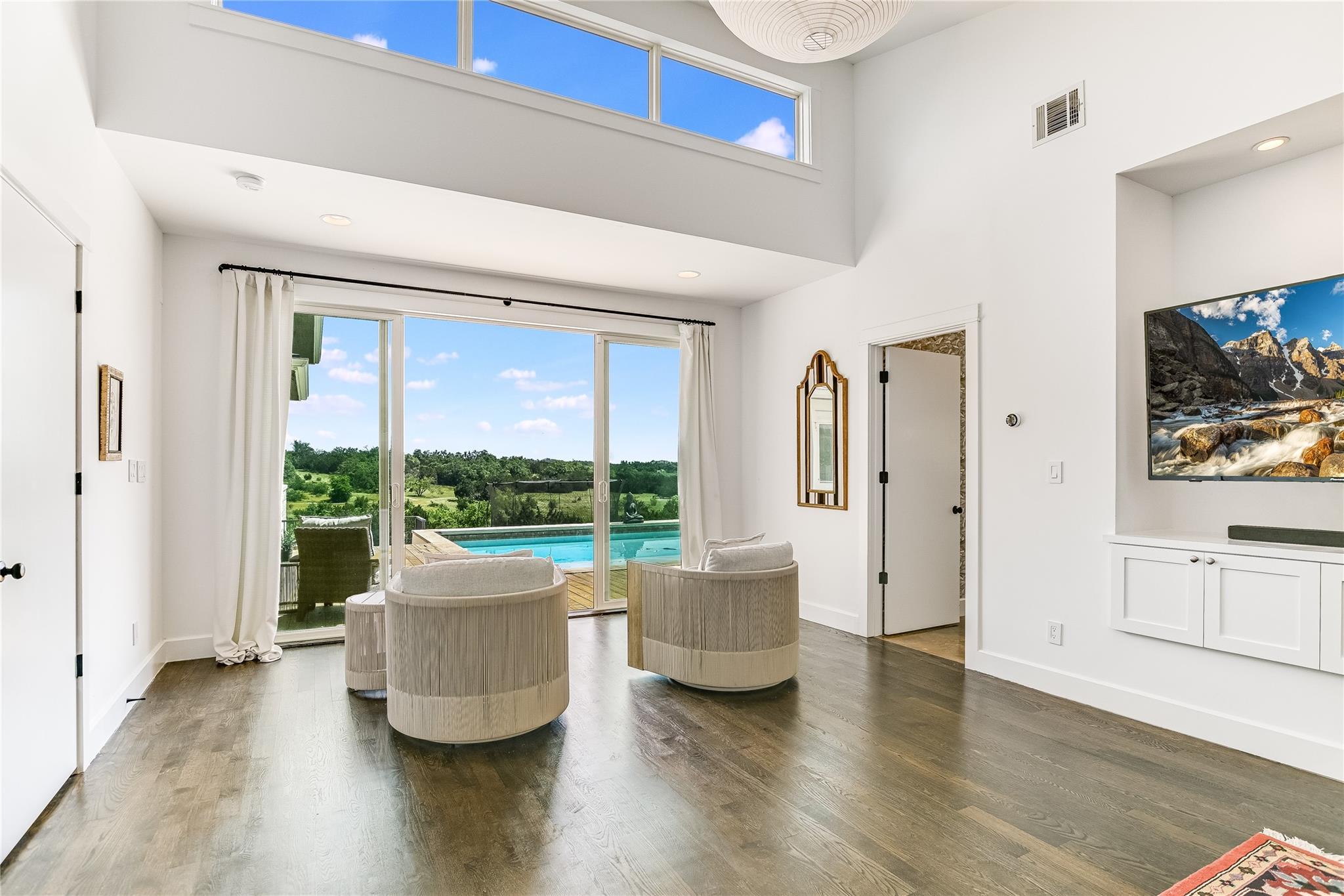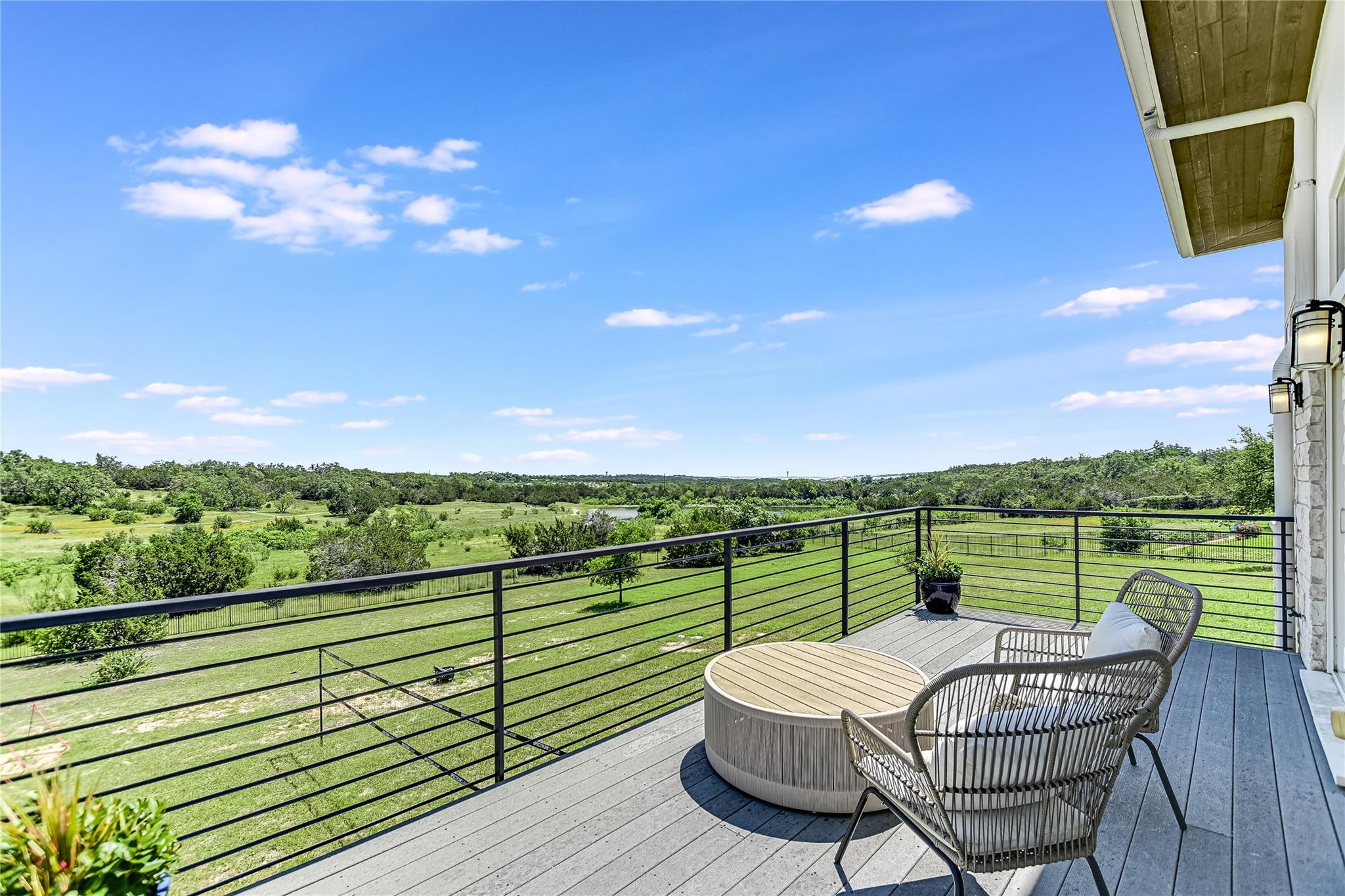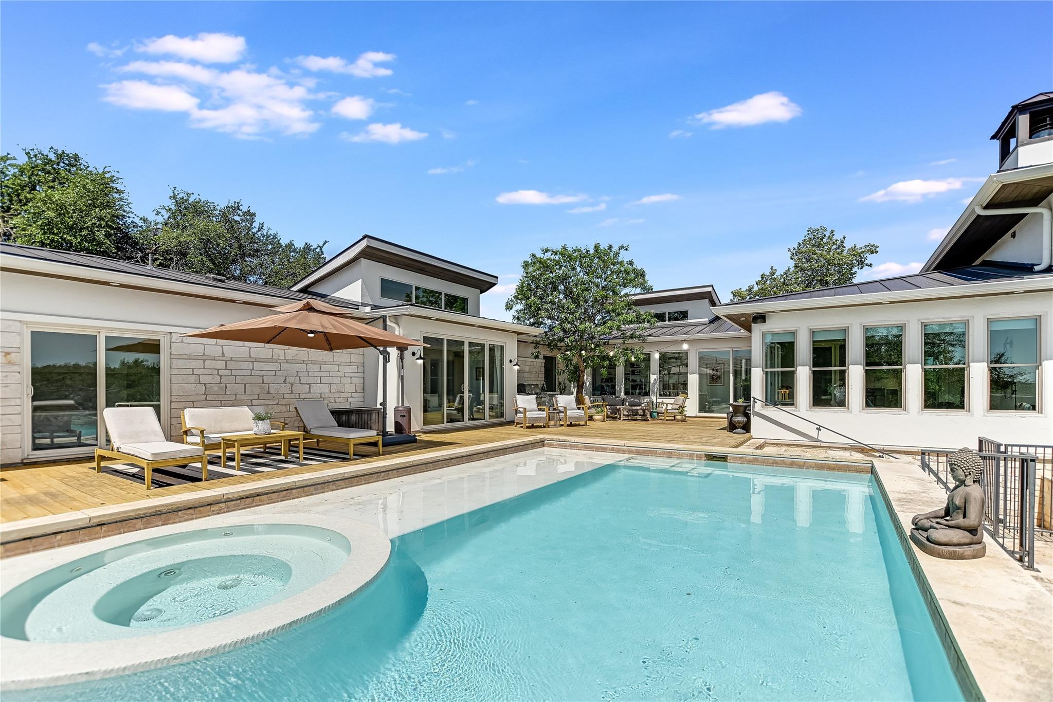 The back patio is perfect for alfresco dining with a built-in summer kitchen, infinity pool and spa, and stunning greenbelt and lake views. The expansive backyard offers space for a garden, pickleball court, or playground.