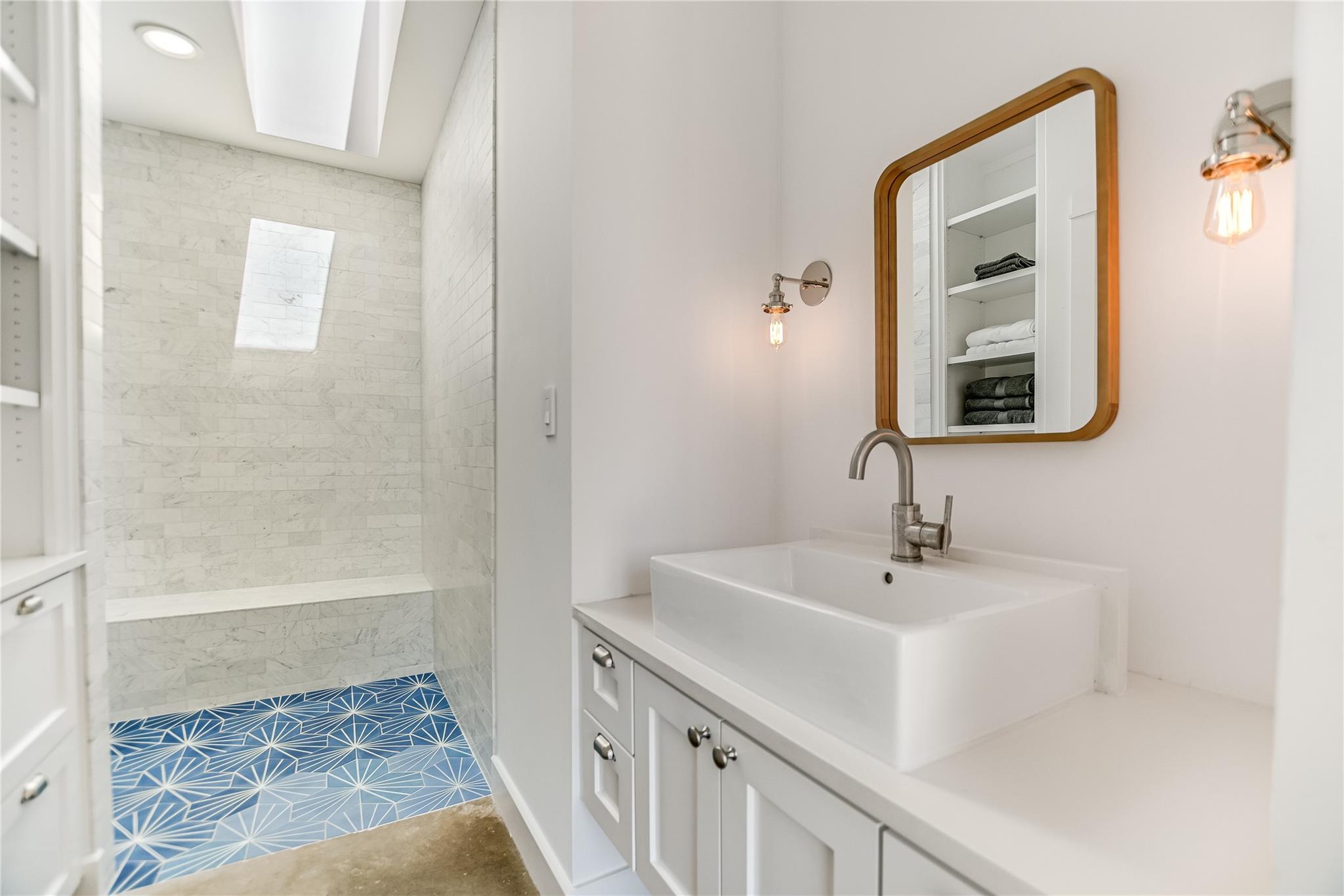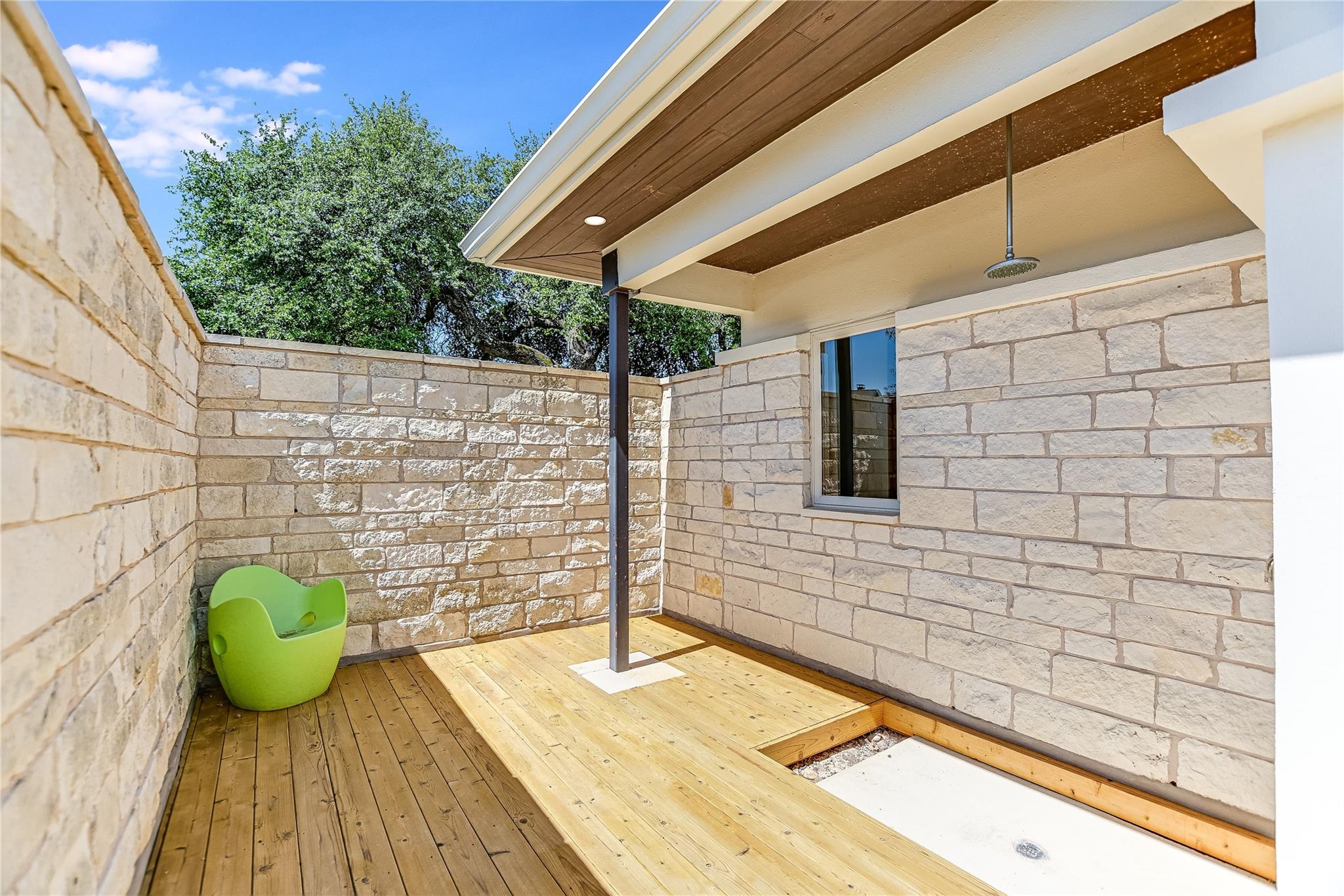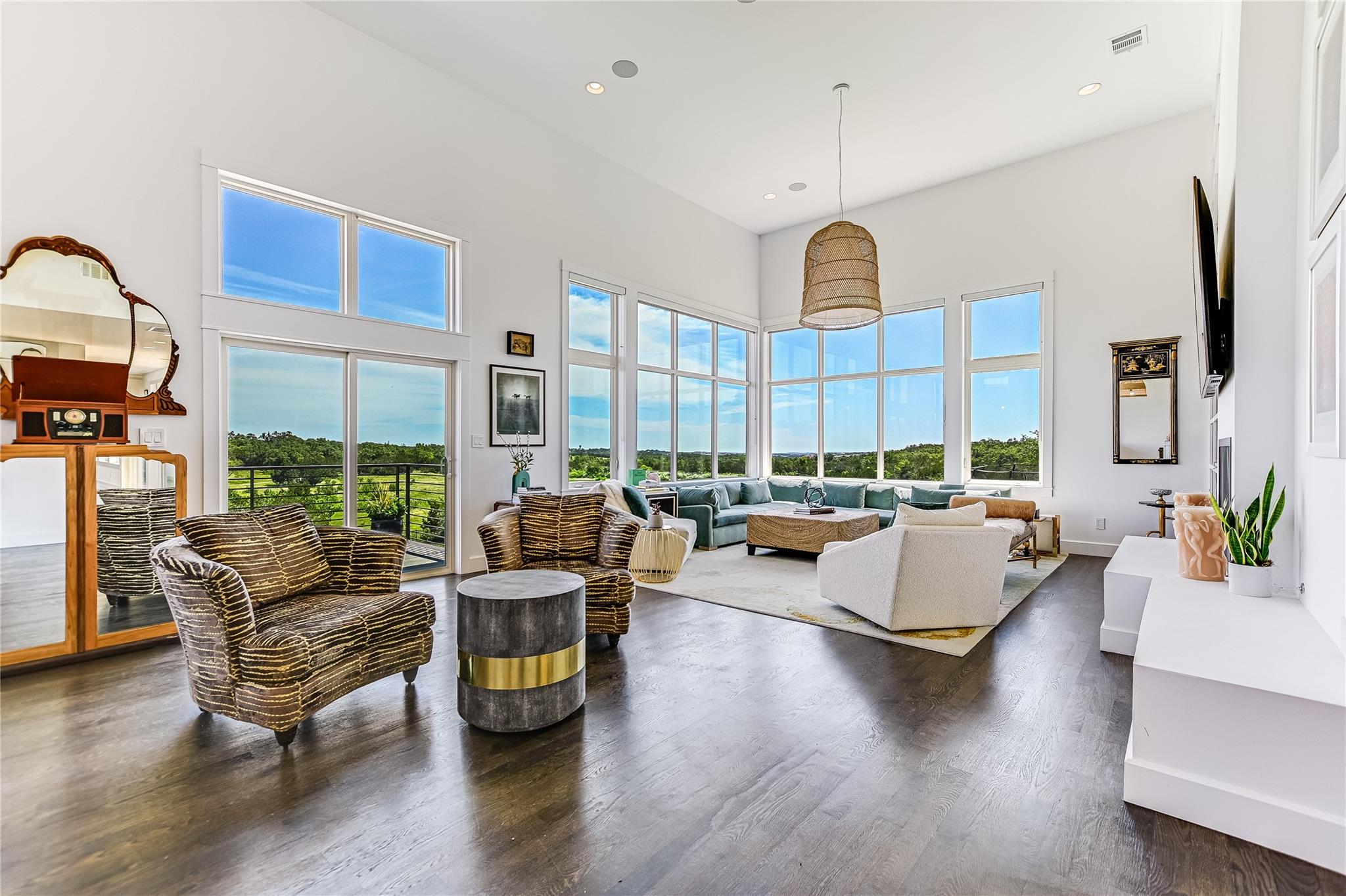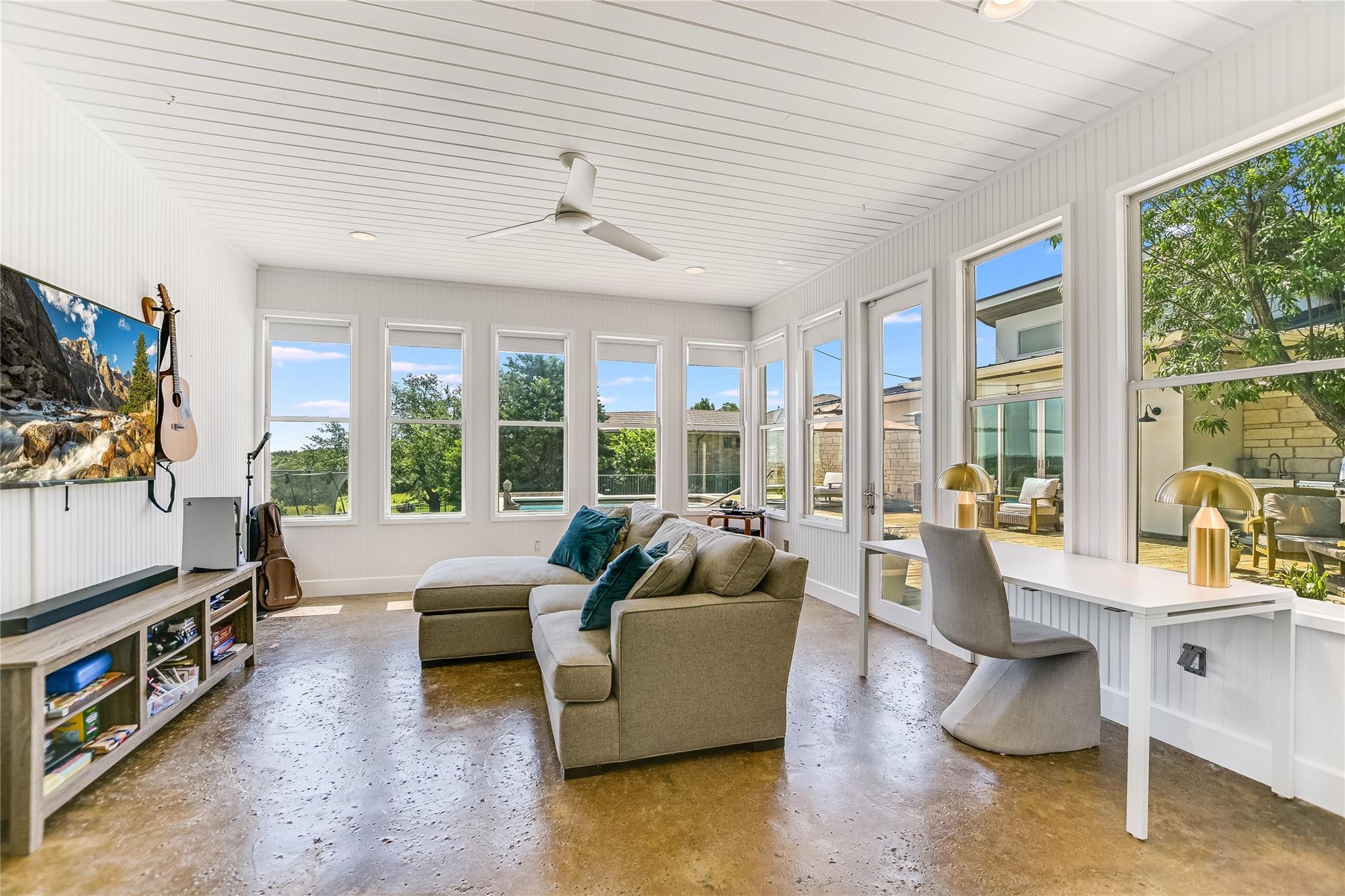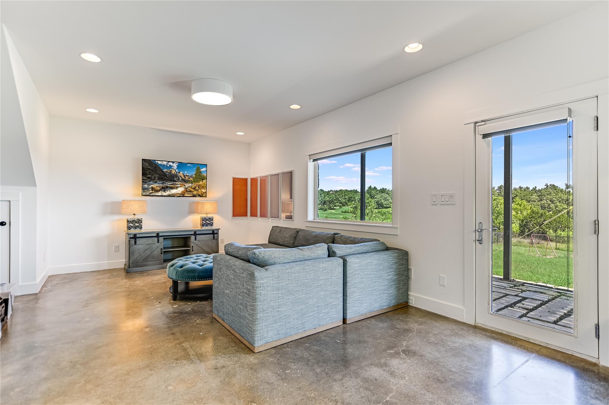 The back patio is perfect for alfresco dining with a built-in summer kitchen, infinity pool and spa, and stunning greenbelt and lake views. The expansive backyard offers space for a garden, pickleball court, or playground.