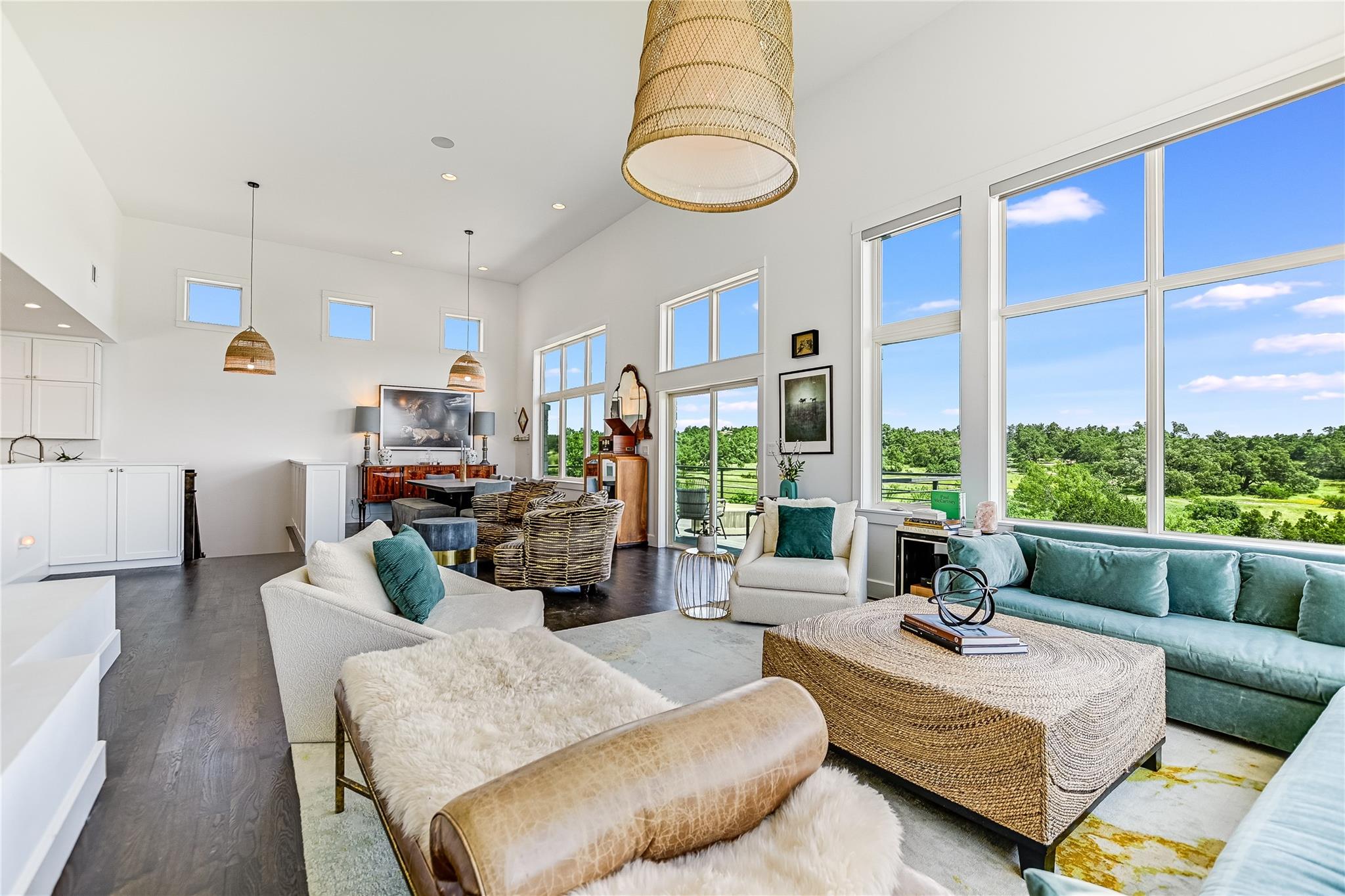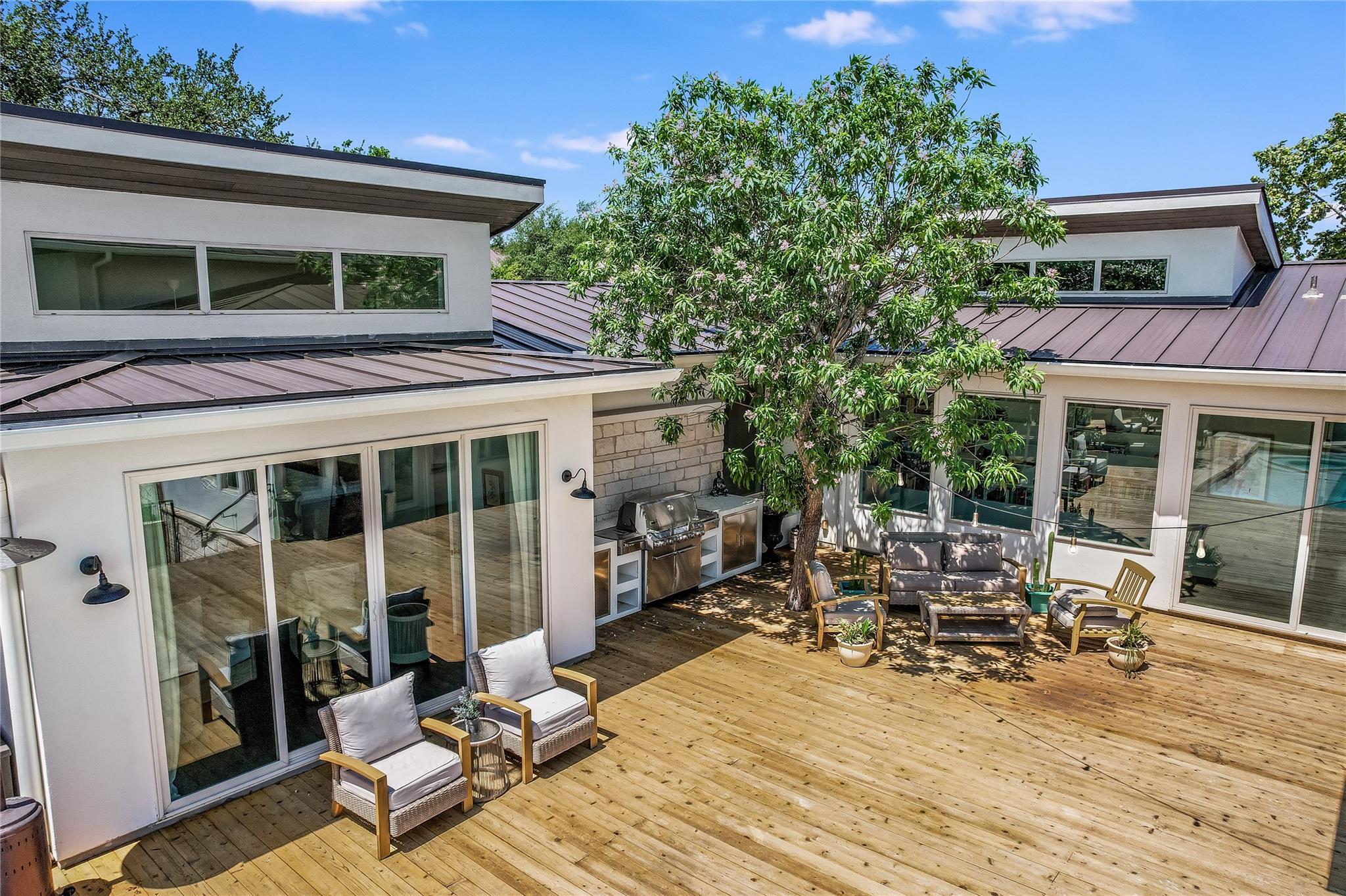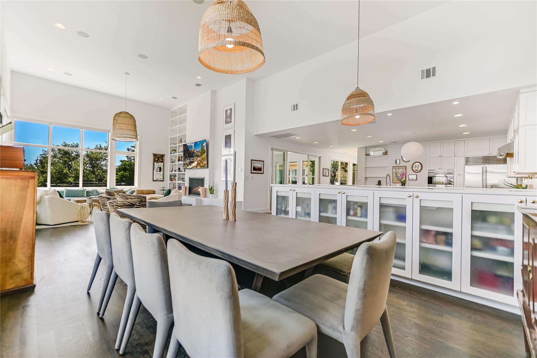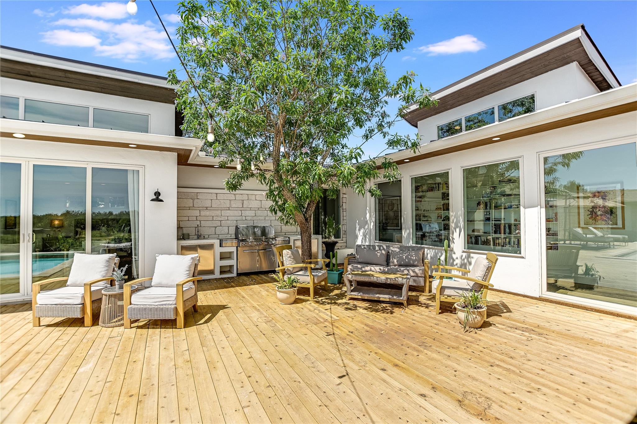 Inside, the bright and airy open floor plan seamlessly connects the living, dining, kitchen, and patio areas, perfect for entertaining or family time. Oversized windows and skylights flood the home with natural light. The chef’s kitchen features high-end appliances, Wolf cooktop, double ovens, Sub-zero refrigerator, a large center island, and ample cabinet space. Enjoy the formal dining room, spacious living room, and a sunroom overlooking the pool. Multiple decks and terraces offer residents endless opportunities to enjoy the surrounding nature.