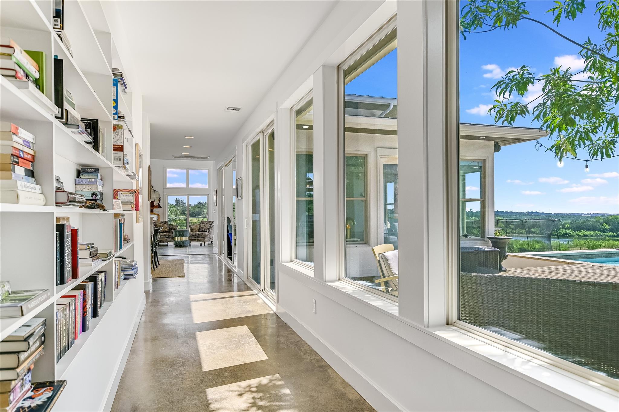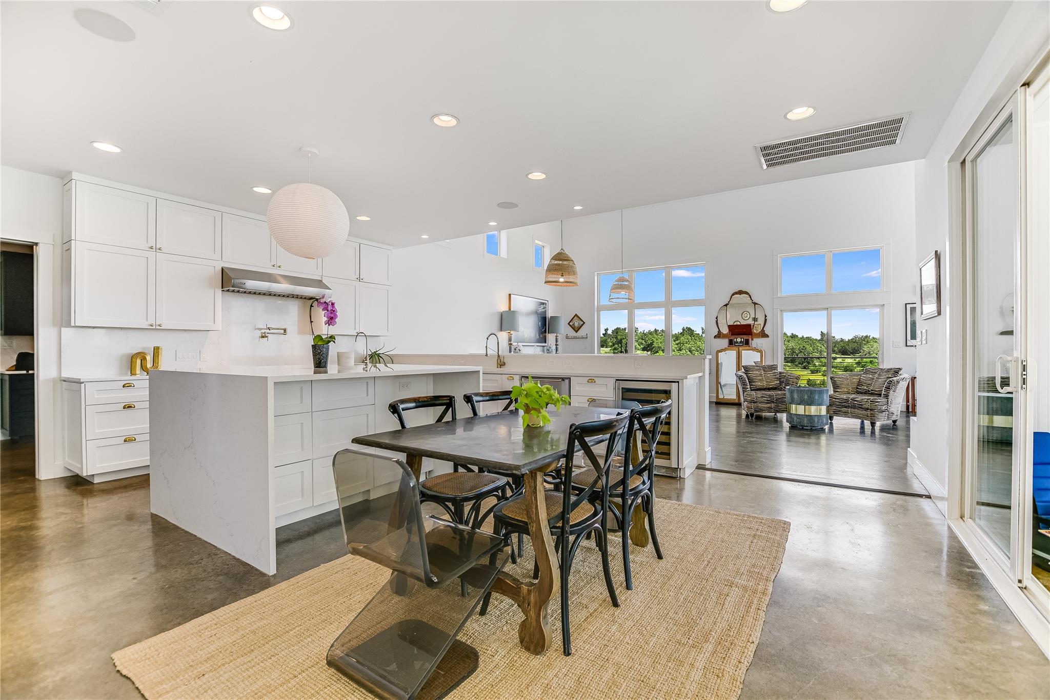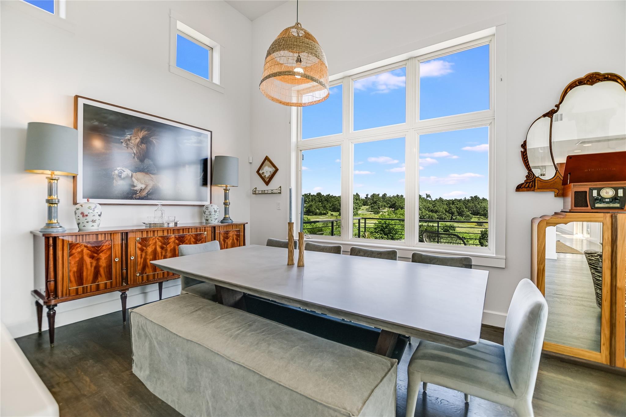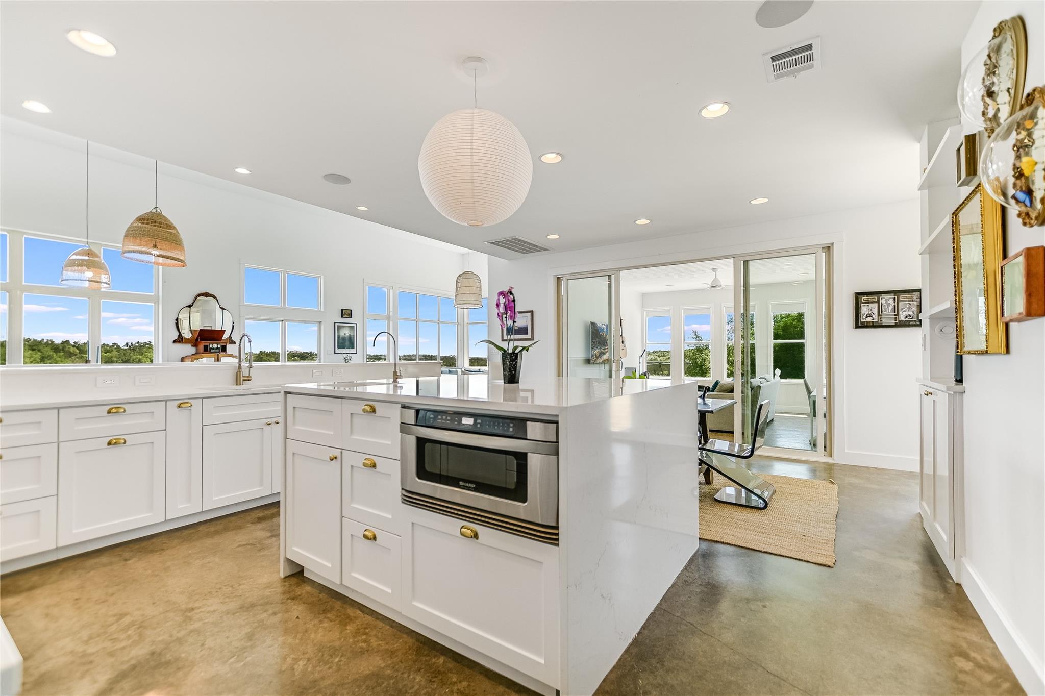 Inside, the bright and airy open floor plan seamlessly connects the living, dining, kitchen, and patio areas, perfect for entertaining or family time. Oversized windows and skylights flood the home with natural light. The chef’s kitchen features high-end appliances, Wolf cooktop, double ovens, Sub-zero refrigerator, a large center island, and ample cabinet space. Enjoy the formal dining room, spacious living room, and a sunroom overlooking the pool. Multiple decks and terraces offer residents endless opportunities to enjoy the surrounding nature.