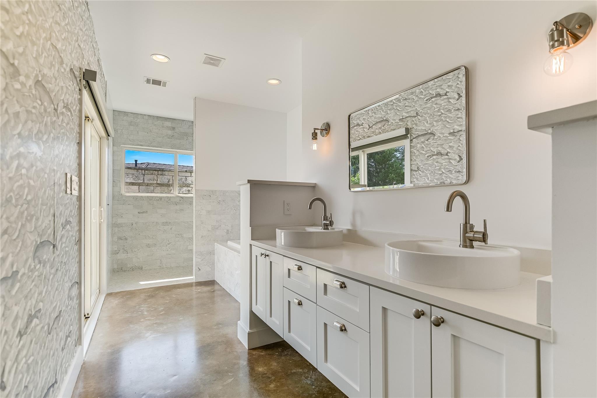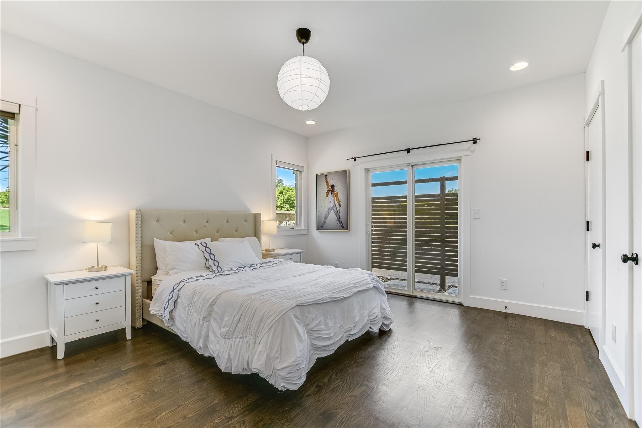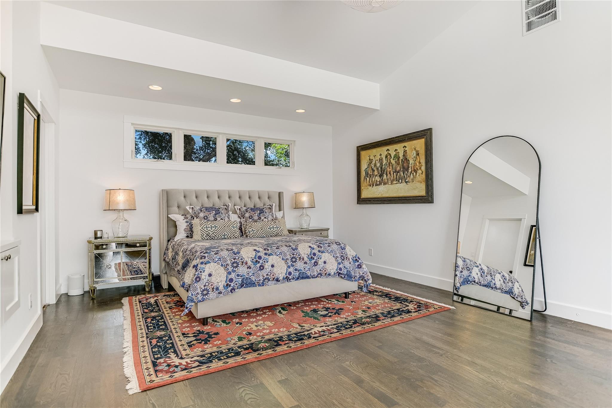 The secluded master suite includes a spa-like ensuite bathroom with a soaking tub, walk-in shower, dual vanities, and a generous walk-in closet with custom built-ins. Downstairs, additional living space with a wet bar, bedroom, and full bath ensures guest privacy.
