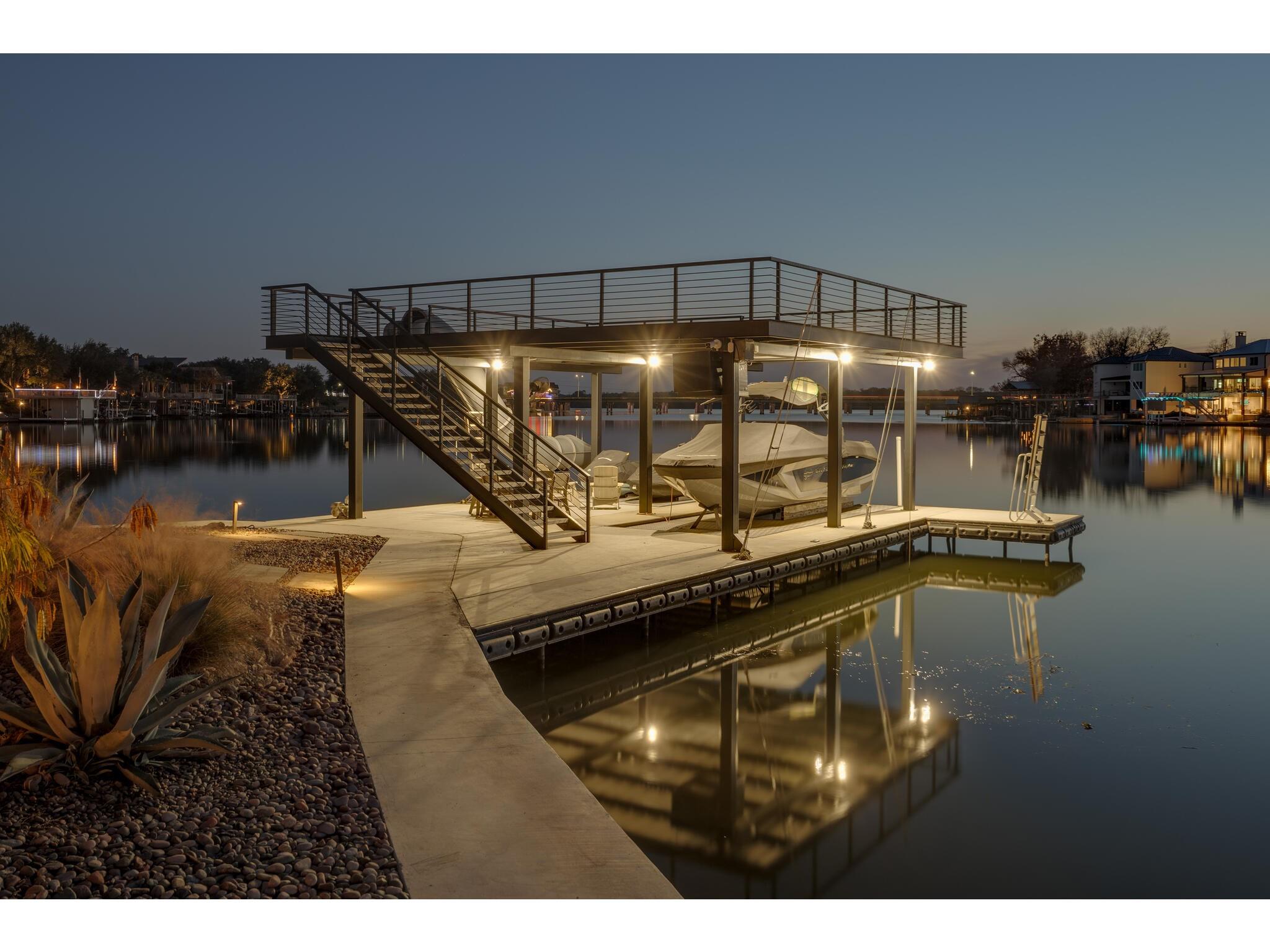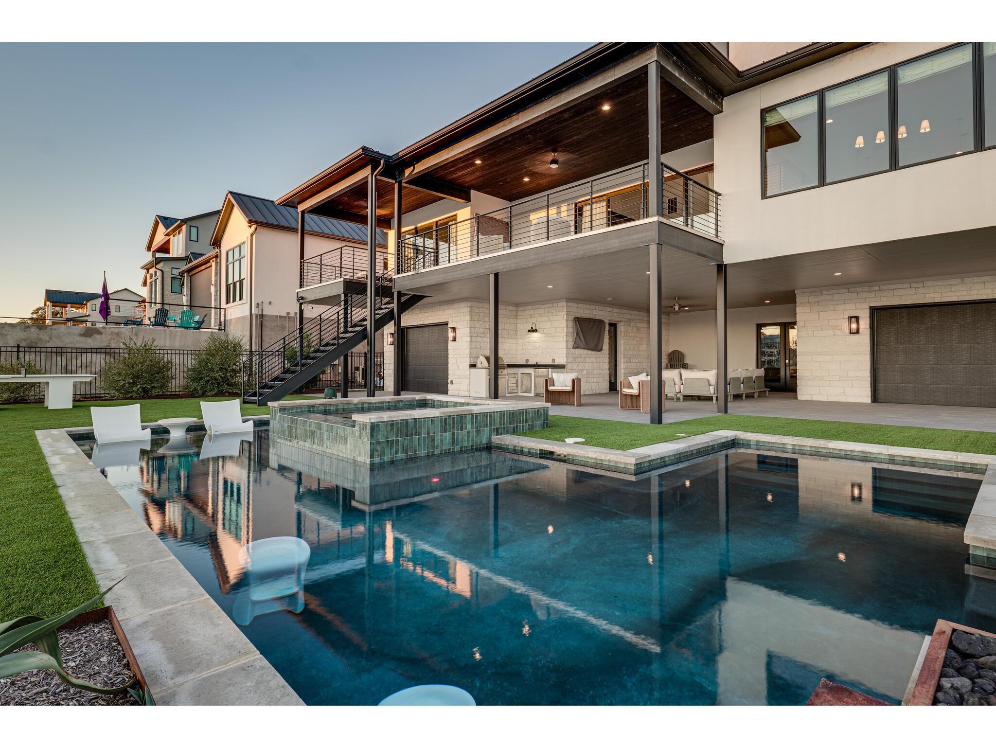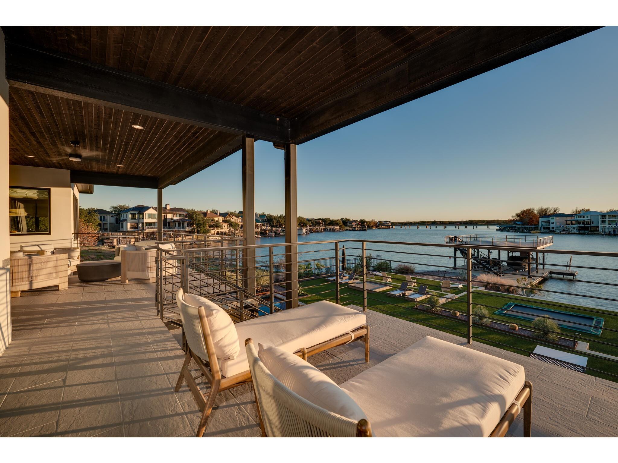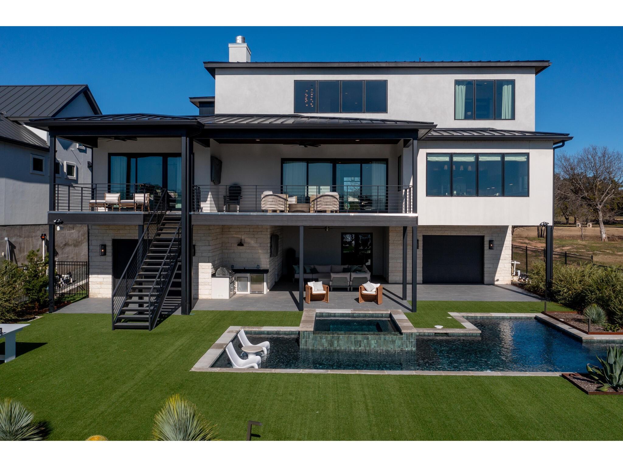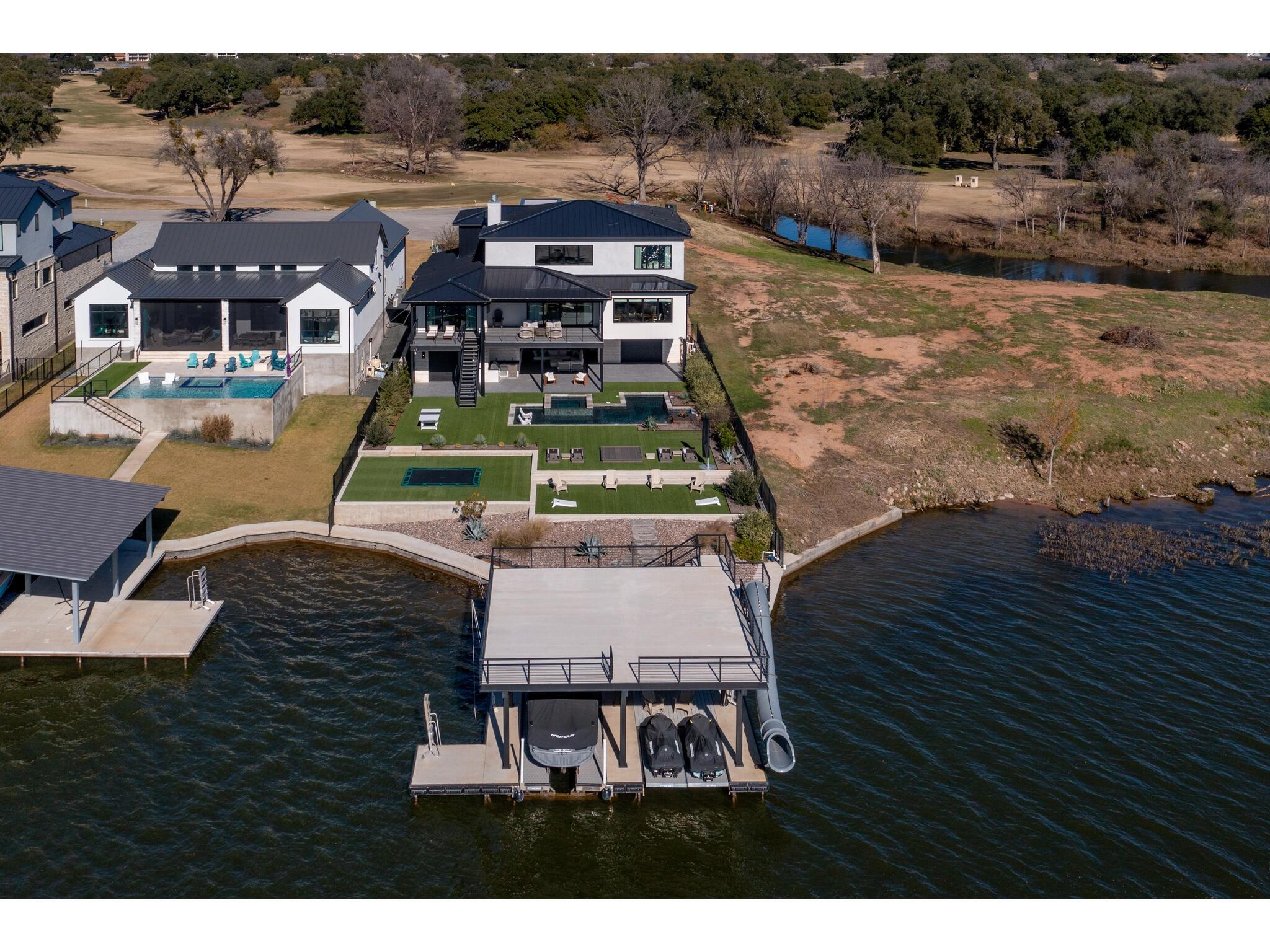 Exceptional waterfront property in Gated Legendary Estates on Lake LBJ blends modern lifestyle with sophisticated casual elegance. Located on private cul-de-sac with amazing views of Lake LBJ from expansive windows. 5,329 SF per Floor Plan Graphics. Designed with entertaining in mind, this masterfully designed home with wood flooring throughout has detailed finishes & intricate attention to detail. Sliding wall of windows in living area & primary bedroom brings the outdoors in. Relax on large covered deck with views of the amazing backyard oasis & playground. Cozy fireplace in living area encased in stone with glass front built-ins on each side. Enter office through glass and iron doors. Ideal for working remotely. Spacious kitchen is a chef's delight with high-end stainless Thermador appliances, double kitchen islands, beautiful cabinetry & expansive windows to enjoy lake views. Dining area with service bar next to kitchen with endless views. Primary suite adjacent to office on main level offers privacy & comfort. Spa-like primary bath w/ modern soaking tub & large frameless walk-in shower for complete relaxation. Additional bedroom suite on main level. 3 luxurious bedroom suites upstairs, one bedroom with queen bunk beds great for children to enjoy. Outdoor oasis with permeable turf includes boat slip, 2 wave runner slips, sundeck with slide, incredible pool and spa, built in trampoline, lounging areas, grill and summer kitchen. An unforgettable outdoor adventure for all to enjoy in this scenic Hill Country backdrop. Elevator for easy assess to all 3 levels, large laundry room on main level, stackable washer/dryer upstairs provides convenience. State of the art A/V System. 3 Car tandem garage plus large storage room. The Legends Golf Club located nearby. Walk across the street onto the golf course. Come experience the best of Lake and Hill Country living in this stunning modern resort-style waterfront home. Furniture negotiable