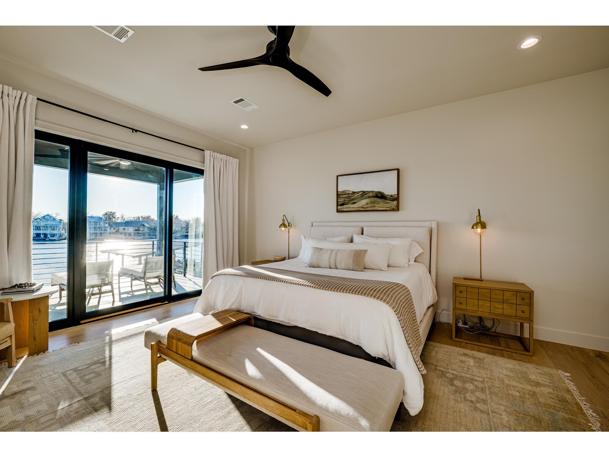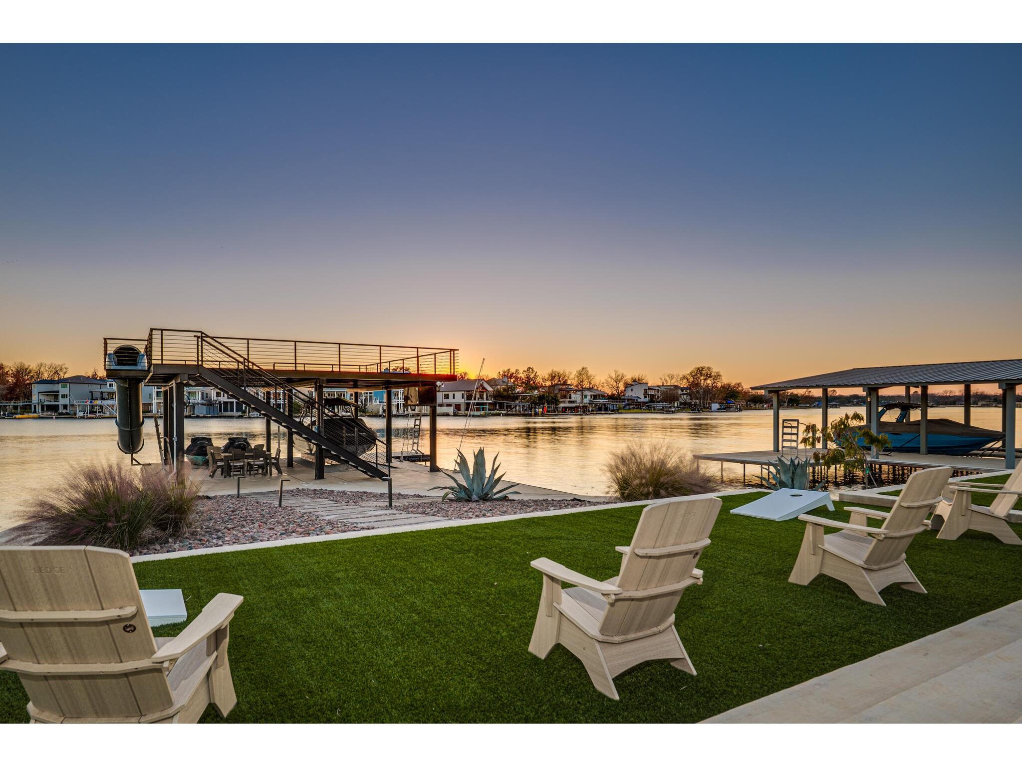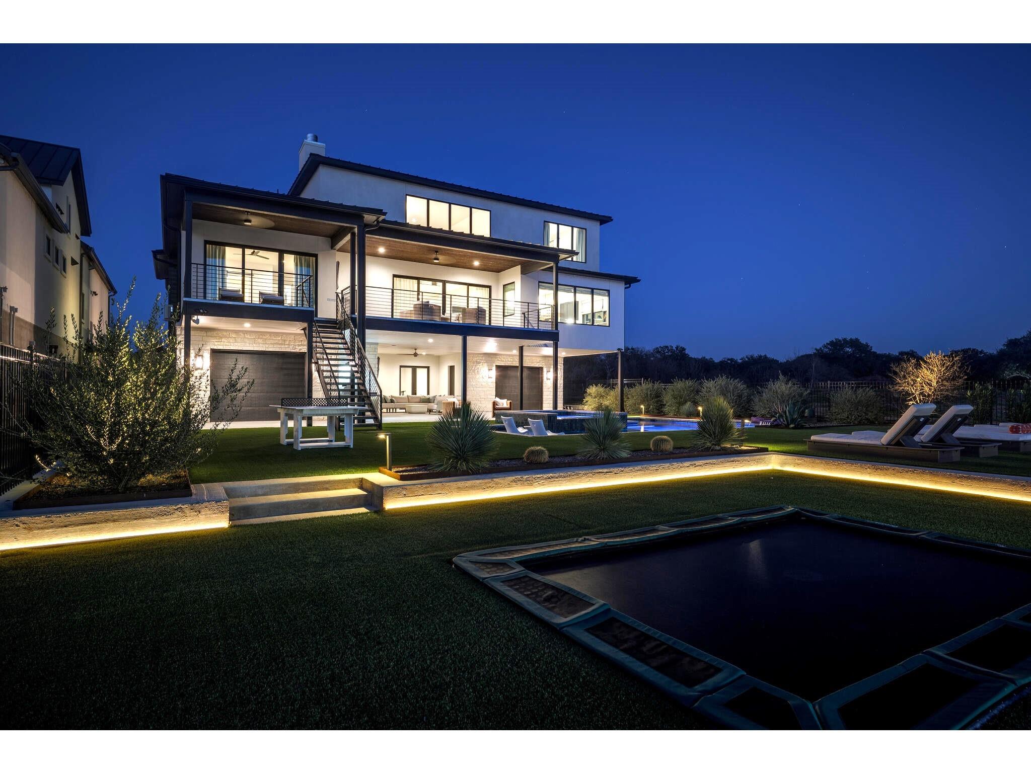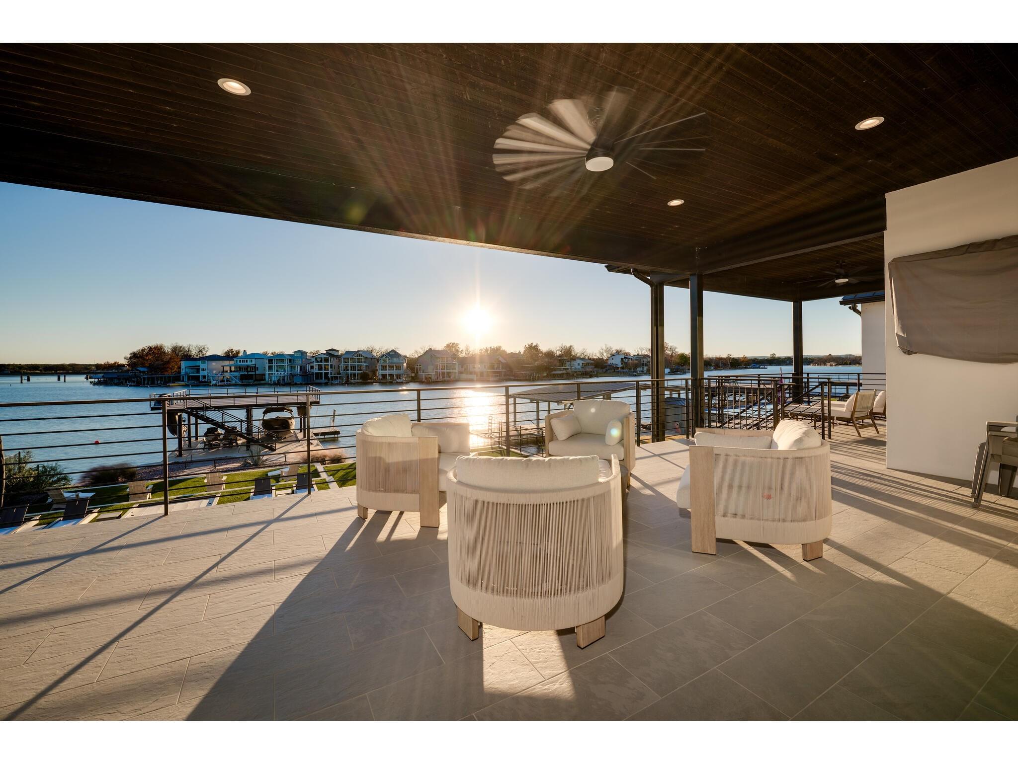 Exceptional waterfront property in Gated Legendary Estates on Lake LBJ blends modern lifestyle with sophisticated casual elegance. Located on private cul-de-sac with amazing views of Lake LBJ from expansive windows. 5,329 SF per Floor Plan Graphics. Designed with entertaining in mind, this masterfully designed home with wood flooring throughout has detailed finishes & intricate attention to detail. Sliding wall of windows in living area & primary bedroom brings the outdoors in. Relax on large covered deck with views of the amazing backyard oasis & playground. Cozy fireplace in living area encased in stone with glass front built-ins on each side. Enter office through glass and iron doors. Ideal for working remotely. Spacious kitchen is a chef's delight with high-end stainless Thermador appliances, double kitchen islands, beautiful cabinetry & expansive windows to enjoy lake views. Dining area with service bar next to kitchen with endless views. Primary suite adjacent to office on main level offers privacy & comfort. Spa-like primary bath w/ modern soaking tub & large frameless walk-in shower for complete relaxation. Additional bedroom suite on main level. 3 luxurious bedroom suites upstairs, one bedroom with queen bunk beds great for children to enjoy. Outdoor oasis with permeable turf includes boat slip, 2 wave runner slips, sundeck with slide, incredible pool and spa, built in trampoline, lounging areas, grill and summer kitchen. An unforgettable outdoor adventure for all to enjoy in this scenic Hill Country backdrop. Elevator for easy assess to all 3 levels, large laundry room on main level, stackable washer/dryer upstairs provides convenience. State of the art A/V System. 3 Car tandem garage plus large storage room. The Legends Golf Club located nearby. Walk across the street onto the golf course. Come experience the best of Lake and Hill Country living in this stunning modern resort-style waterfront home. Furniture negotiable