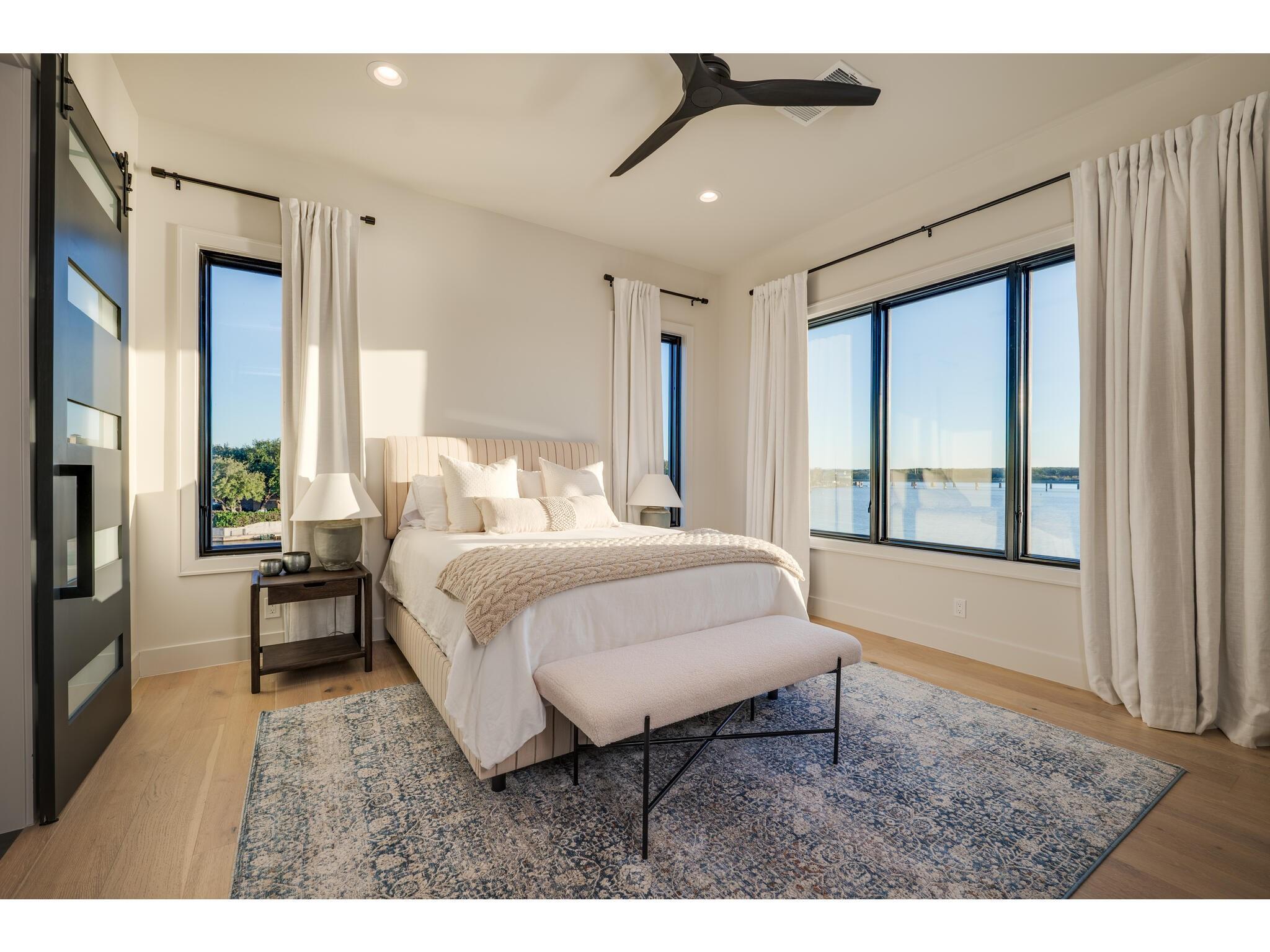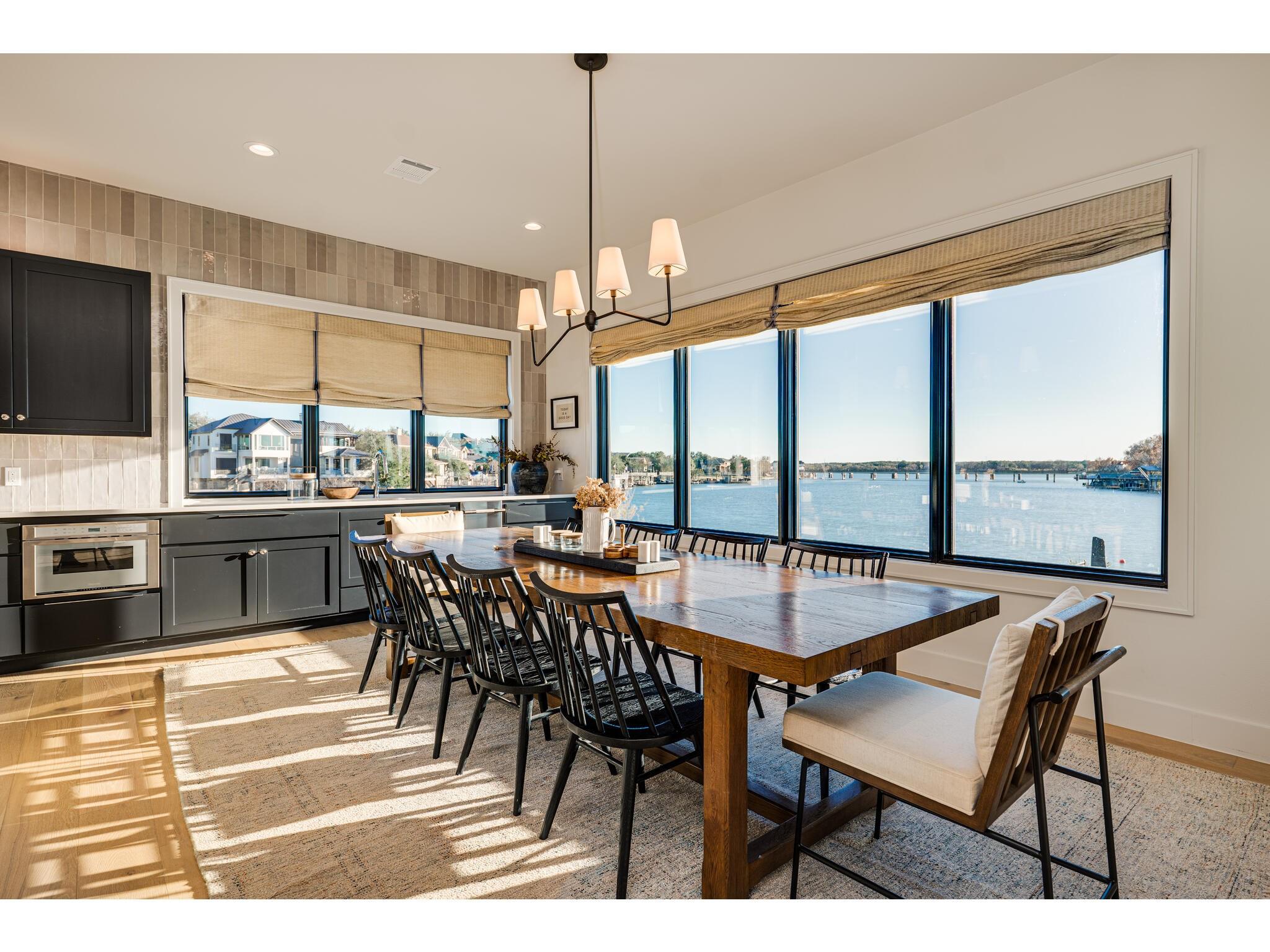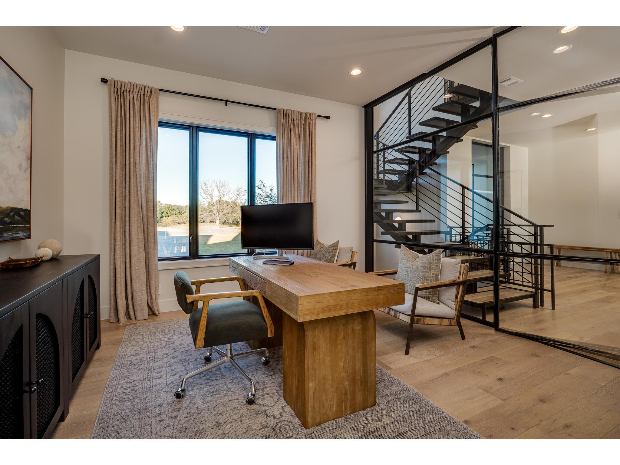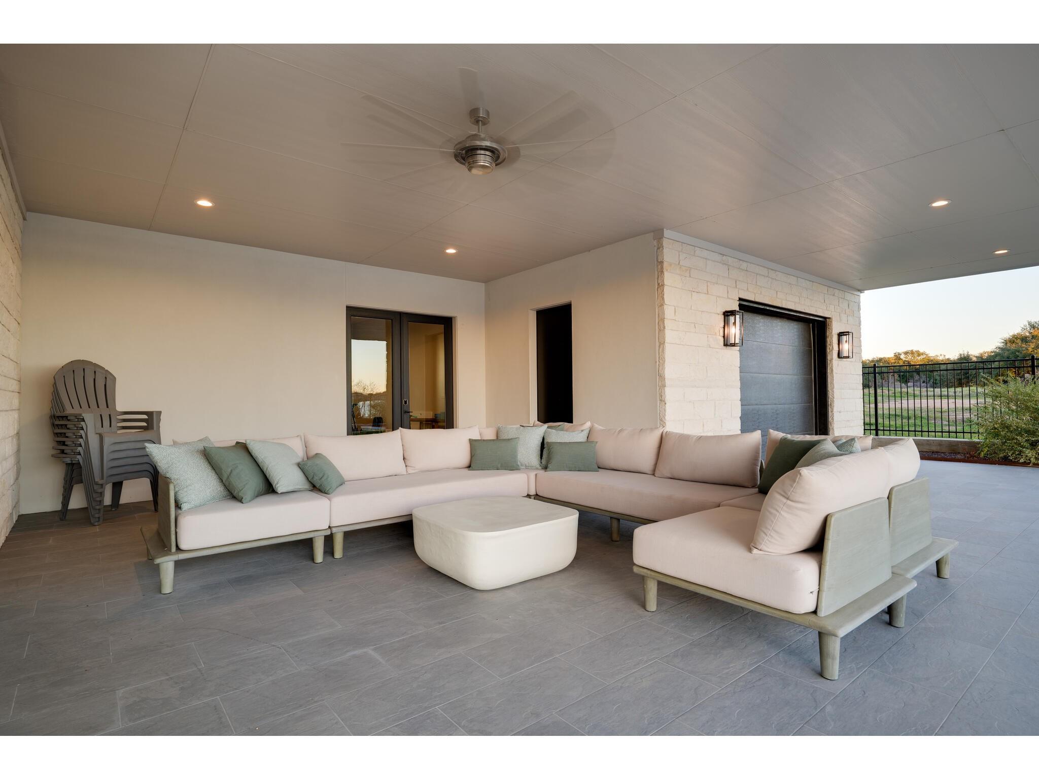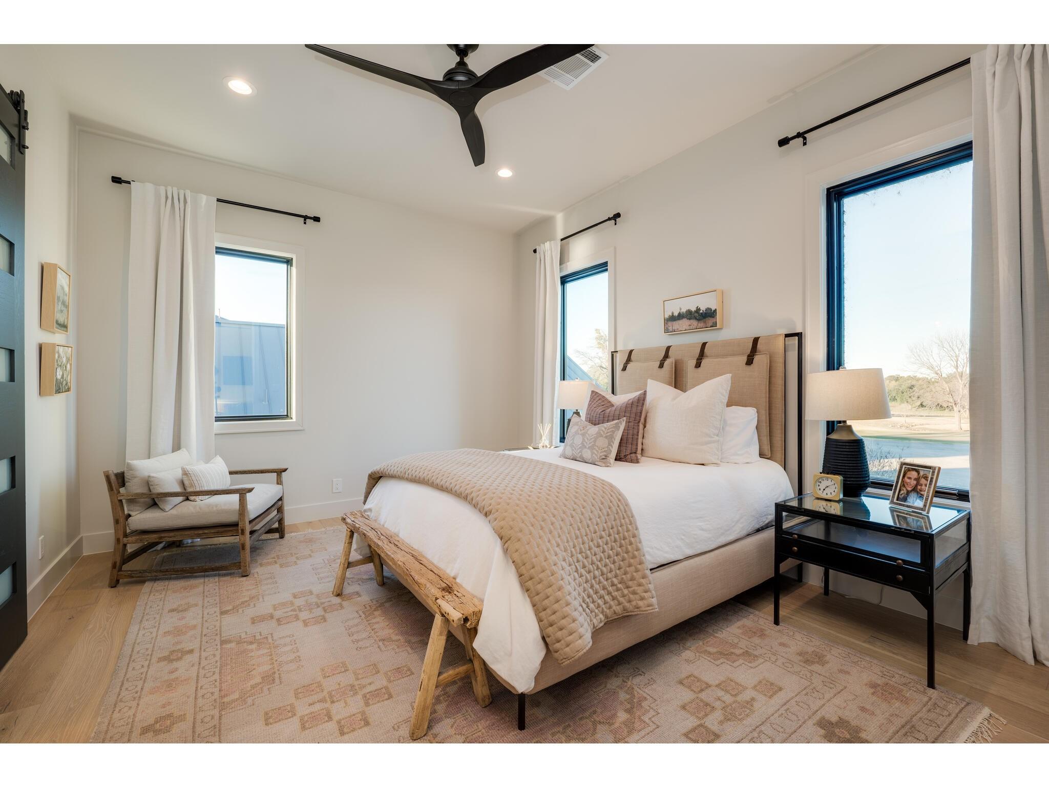 Exceptional waterfront property in Gated Legendary Estates on Lake LBJ blends modern lifestyle with sophisticated casual elegance. Located on private cul-de-sac with amazing views of Lake LBJ from expansive windows. 5,329 SF per Floor Plan Graphics. Designed with entertaining in mind, this masterfully designed home with wood flooring throughout has detailed finishes & intricate attention to detail. Sliding wall of windows in living area & primary bedroom brings the outdoors in. Relax on large covered deck with views of the amazing backyard oasis & playground. Cozy fireplace in living area encased in stone with glass front built-ins on each side. Enter office through glass and iron doors. Ideal for working remotely. Spacious kitchen is a chef's delight with high-end stainless Thermador appliances, double kitchen islands, beautiful cabinetry & expansive windows to enjoy lake views. Dining area with service bar next to kitchen with endless views. Primary suite adjacent to office on main level offers privacy & comfort. Spa-like primary bath w/ modern soaking tub & large frameless walk-in shower for complete relaxation. Additional bedroom suite on main level. 3 luxurious bedroom suites upstairs, one bedroom with queen bunk beds great for children to enjoy. Outdoor oasis with permeable turf includes boat slip, 2 wave runner slips, sundeck with slide, incredible pool and spa, built in trampoline, lounging areas, grill and summer kitchen. An unforgettable outdoor adventure for all to enjoy in this scenic Hill Country backdrop. Elevator for easy assess to all 3 levels, large laundry room on main level, stackable washer/dryer upstairs provides convenience. State of the art A/V System. 3 Car tandem garage plus large storage room. The Legends Golf Club located nearby. Walk across the street onto the golf course. Come experience the best of Lake and Hill Country living in this stunning modern resort-style waterfront home. Furniture negotiable