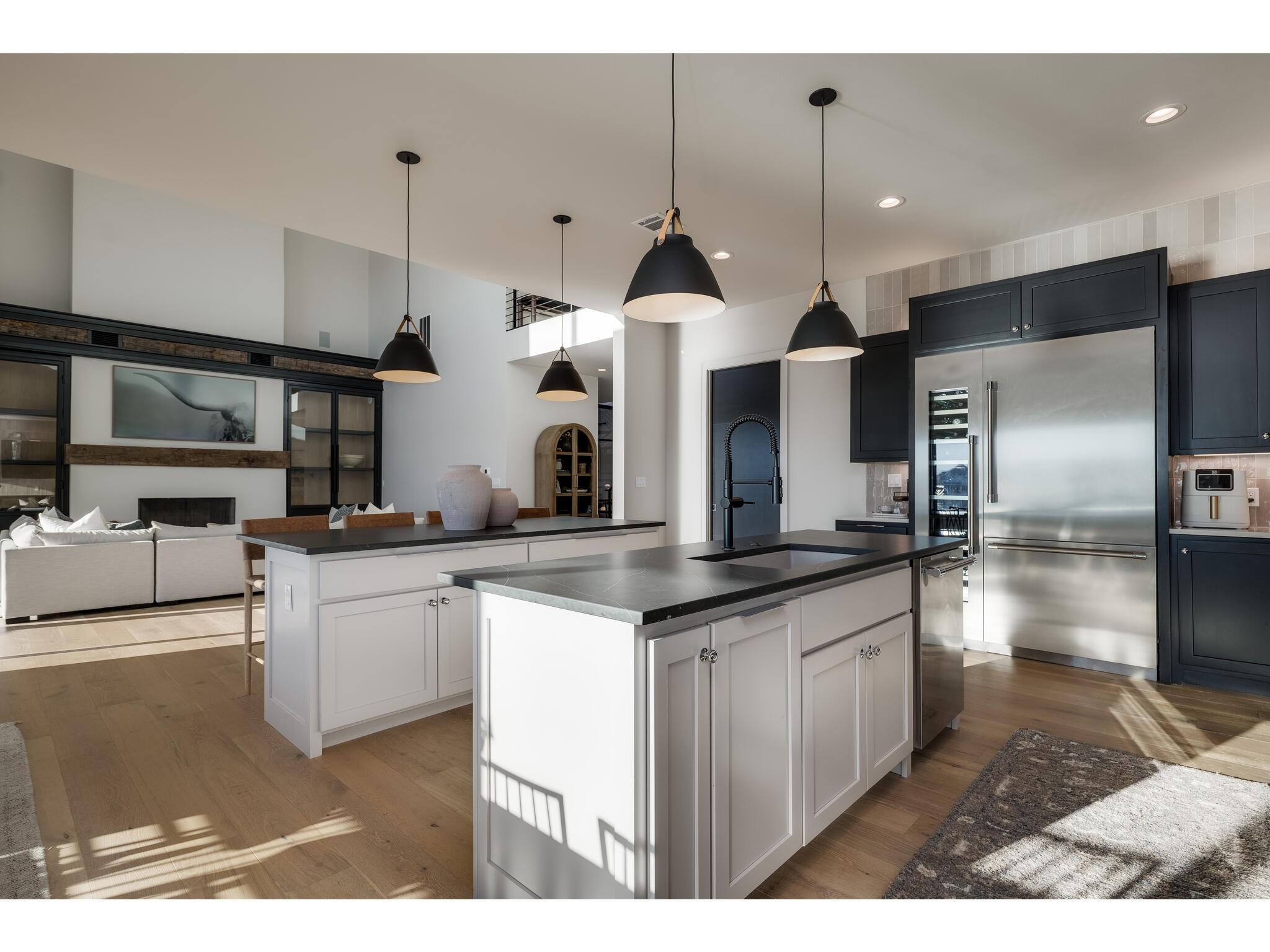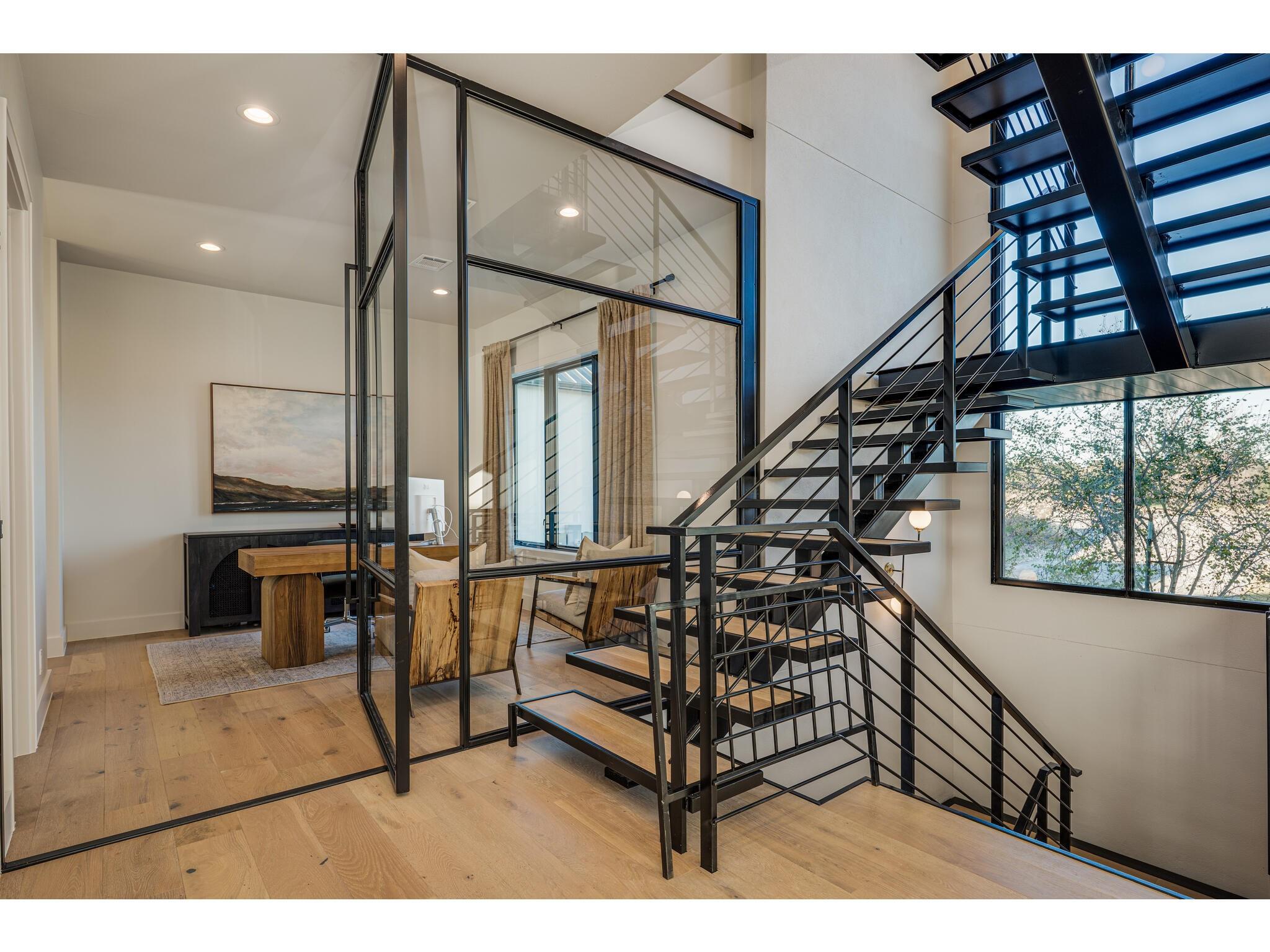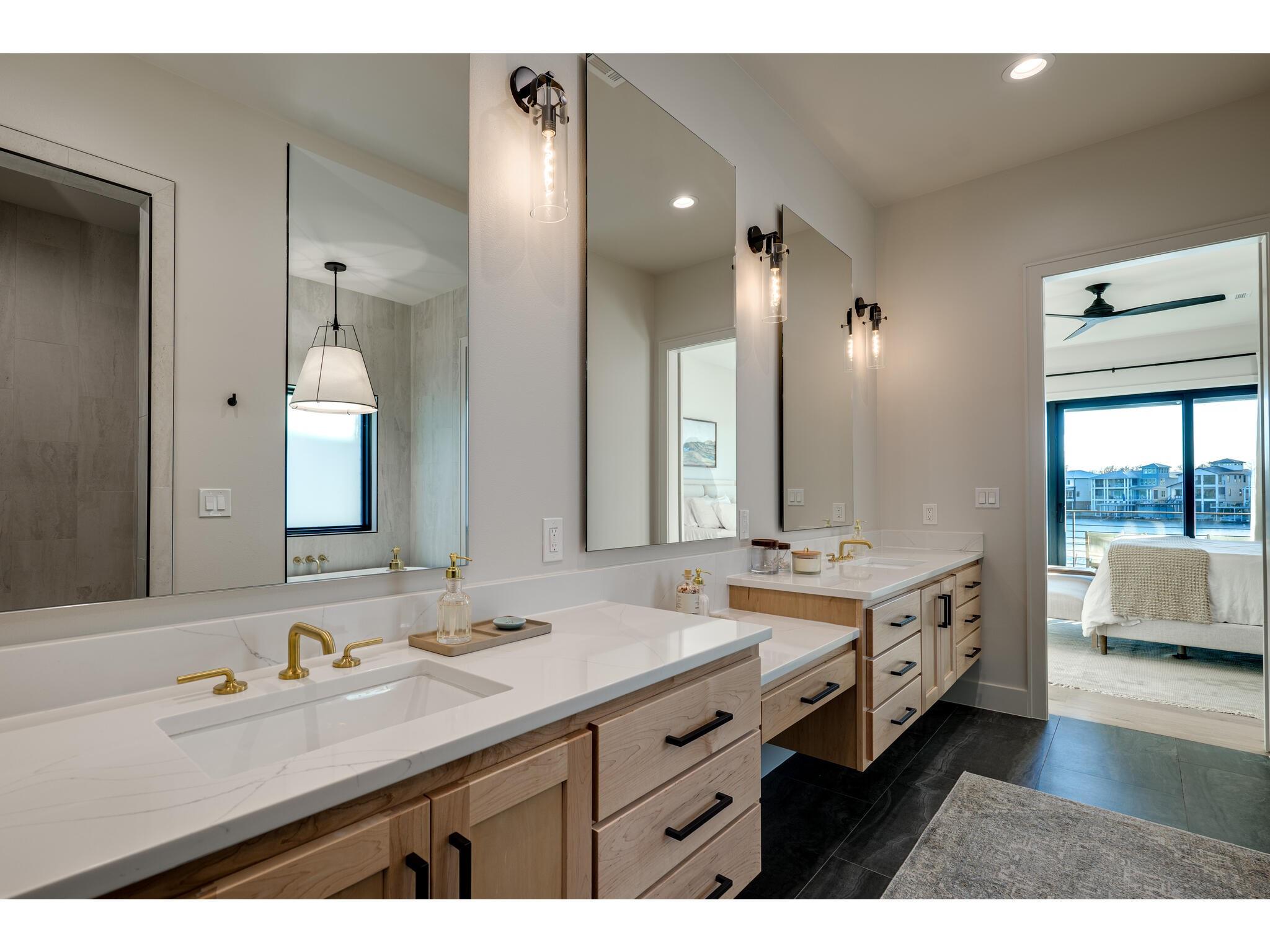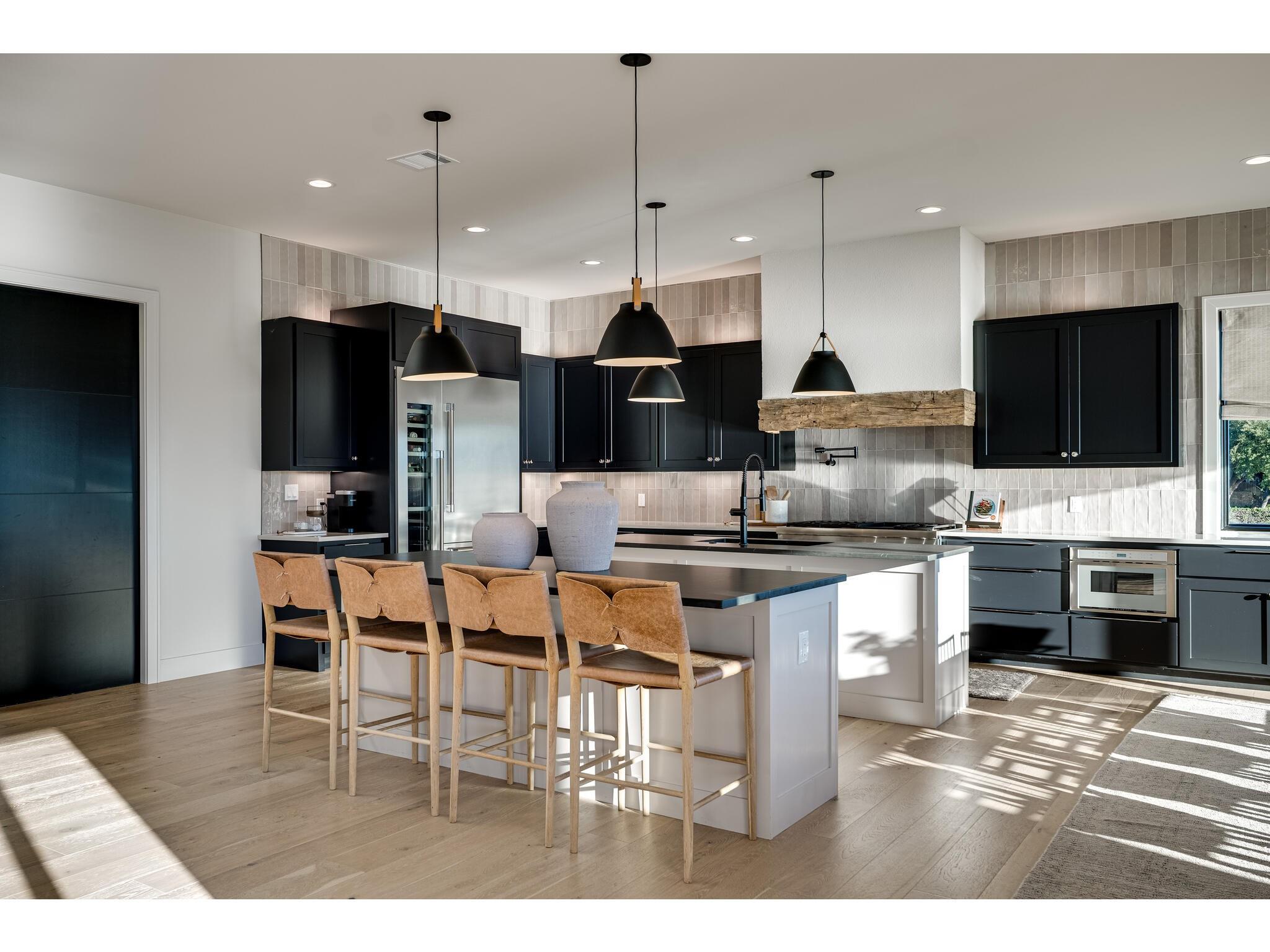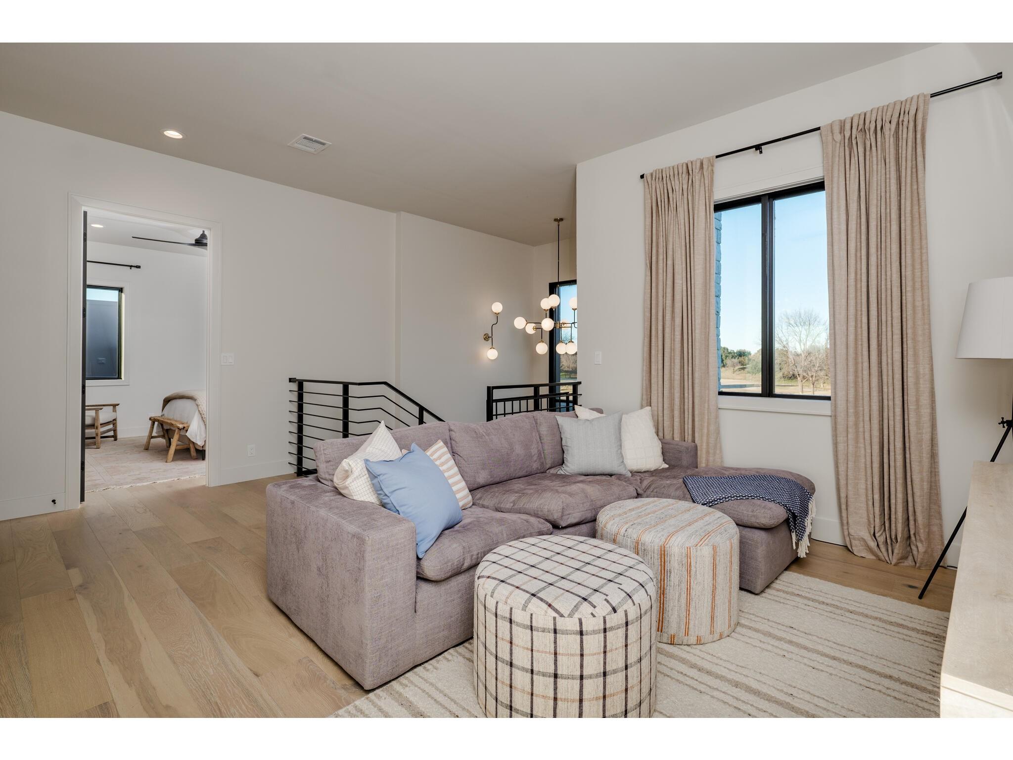 Exceptional waterfront property in Gated Legendary Estates on Lake LBJ blends modern lifestyle with sophisticated casual elegance. Located on private cul-de-sac with amazing views of Lake LBJ from expansive windows. 5,329 SF per Floor Plan Graphics. Designed with entertaining in mind, this masterfully designed home with wood flooring throughout has detailed finishes & intricate attention to detail. Sliding wall of windows in living area & primary bedroom brings the outdoors in. Relax on large covered deck with views of the amazing backyard oasis & playground. Cozy fireplace in living area encased in stone with glass front built-ins on each side. Enter office through glass and iron doors. Ideal for working remotely. Spacious kitchen is a chef's delight with high-end stainless Thermador appliances, double kitchen islands, beautiful cabinetry & expansive windows to enjoy lake views. Dining area with service bar next to kitchen with endless views. Primary suite adjacent to office on main level offers privacy & comfort. Spa-like primary bath w/ modern soaking tub & large frameless walk-in shower for complete relaxation. Additional bedroom suite on main level. 3 luxurious bedroom suites upstairs, one bedroom with queen bunk beds great for children to enjoy. Outdoor oasis with permeable turf includes boat slip, 2 wave runner slips, sundeck with slide, incredible pool and spa, built in trampoline, lounging areas, grill and summer kitchen. An unforgettable outdoor adventure for all to enjoy in this scenic Hill Country backdrop. Elevator for easy assess to all 3 levels, large laundry room on main level, stackable washer/dryer upstairs provides convenience. State of the art A/V System. 3 Car tandem garage plus large storage room. The Legends Golf Club located nearby. Walk across the street onto the golf course. Come experience the best of Lake and Hill Country living in this stunning modern resort-style waterfront home. Furniture negotiable