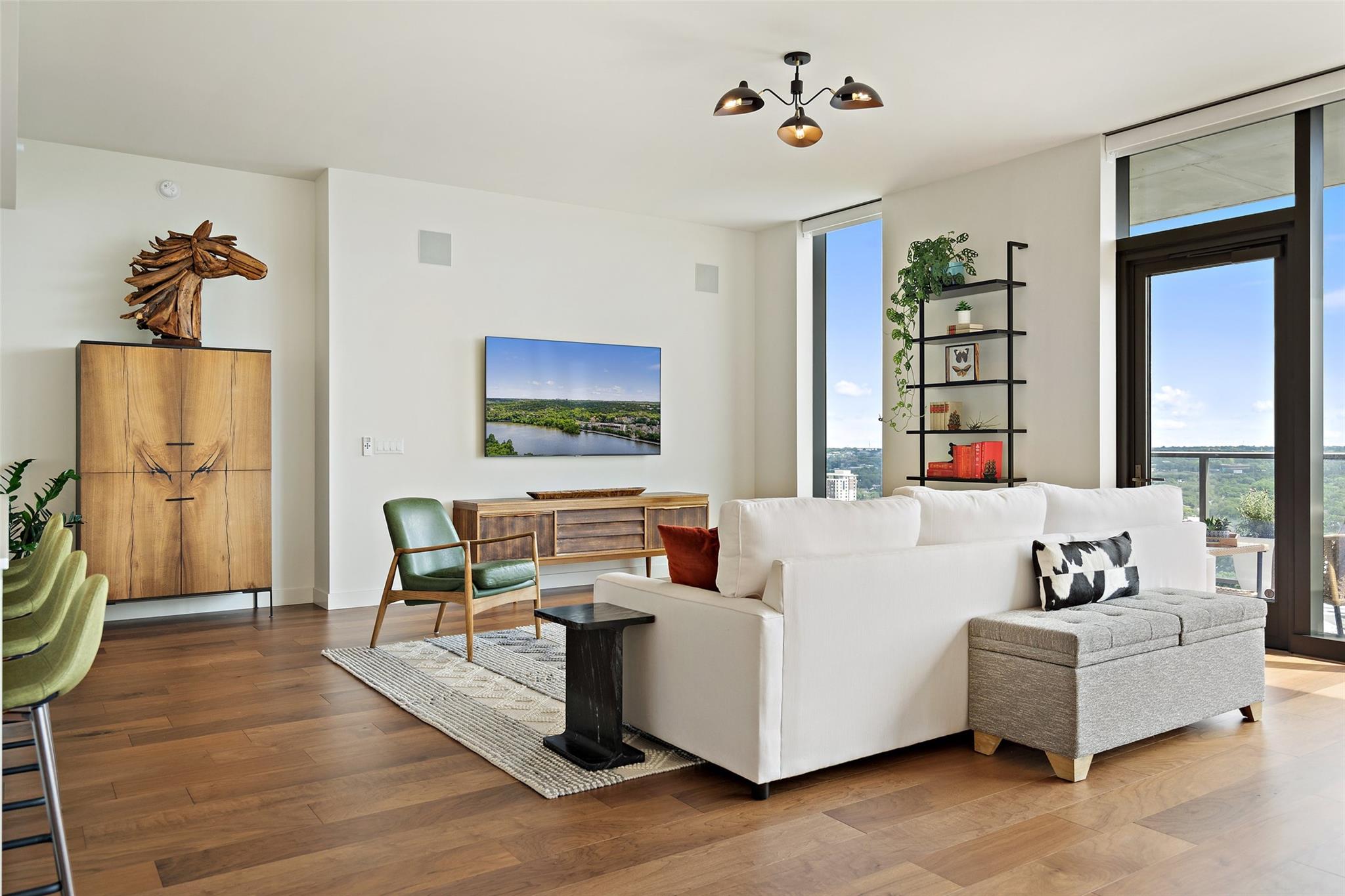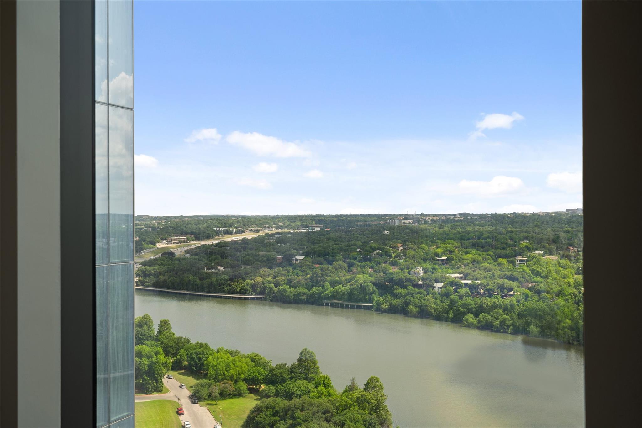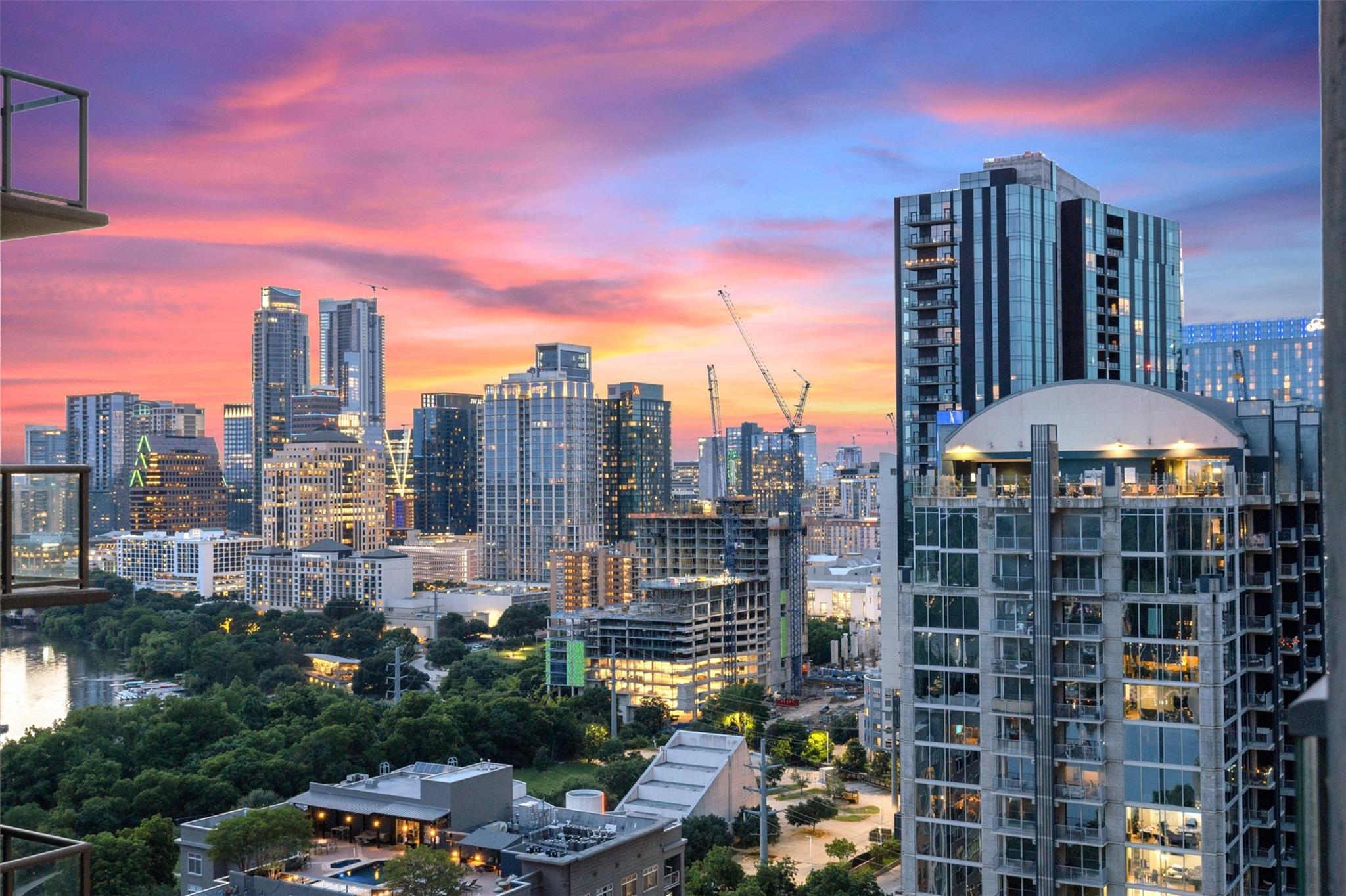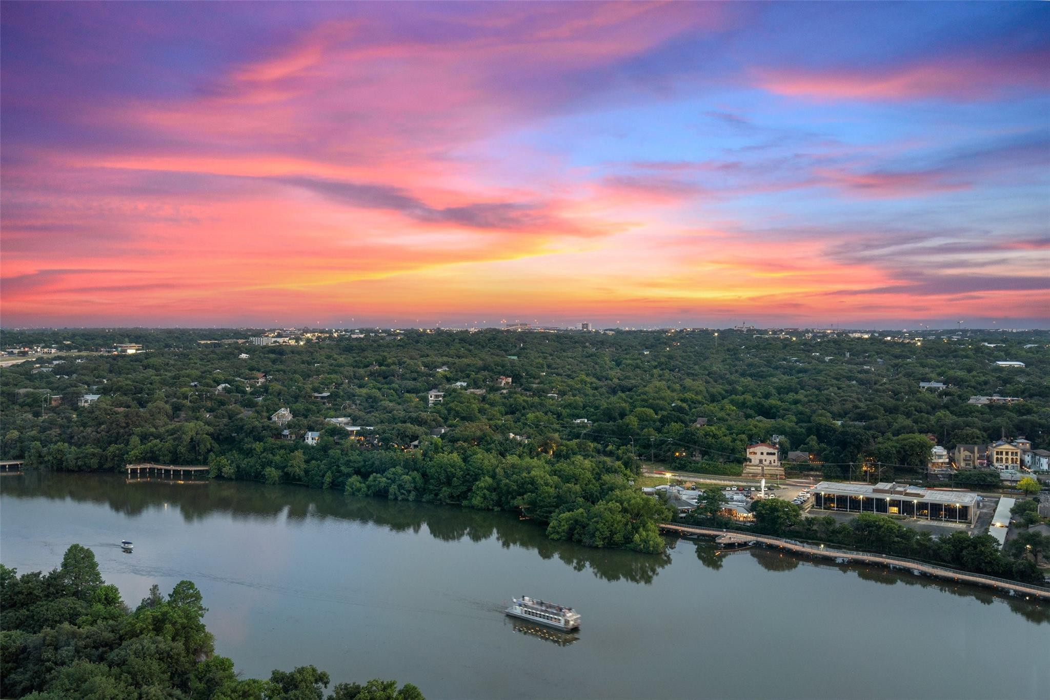 Welcome to your ultimate sanctuary with captivating views nestled in the heart of the vibrant Rainey St. district. This exceptional 3 bedroom, 3 bathroom condo offers a coveted South facing orientation, granting you unobstructed panoramas of the serene Ladybird Lake and the dynamic downtown corridor. Step inside and be mesmerized by the floor-to-ceiling walls of glass, meticulously designed to frame the awe-inspiring views and flood the space with natural light. Every detail has been carefully considered to create an atmosphere of unparalleled elegance. Submerge yourself in the timeless refinement of hardwood floors and the sleek allure of quartz counters, which effortlessly blend style and functionality. The open living, kitchen, and dining areas create a seamless flow, ideal for entertaining guests. The condo comes wired with speakers, while the automatic window shades on all windows provide effortless privacy and shade at the touch of a button. Wake up to breathtaking lake views from the comfort of your primary bedroom and unwind in your spa-like bathroom. Organize your wardrobe with ease in the custom closet systems. Step out onto the large covered balcony and revel in the stunning South facing views of the lake. A second covered balcony off the guest bedroom presents picturesque downtown corridor views. Your new home comes complete with two parking spots on the 6th floor, conveniently equipped with an electric car charger, ensuring convenience for your modern lifestyle. At 44 East, luxury extends beyond your private abode. Immerse yourself in the world-class amenities offered by this premier building. Take a refreshing dip in the sparkling pool, stay active and energized in the state-of-the-art gym, or unwind in the inviting resident lounges. The sky deck on the 37th floor allows you to experience breathtaking views from new heights, while the 24-hour concierge ensures your every need is met with utmost care and attention.