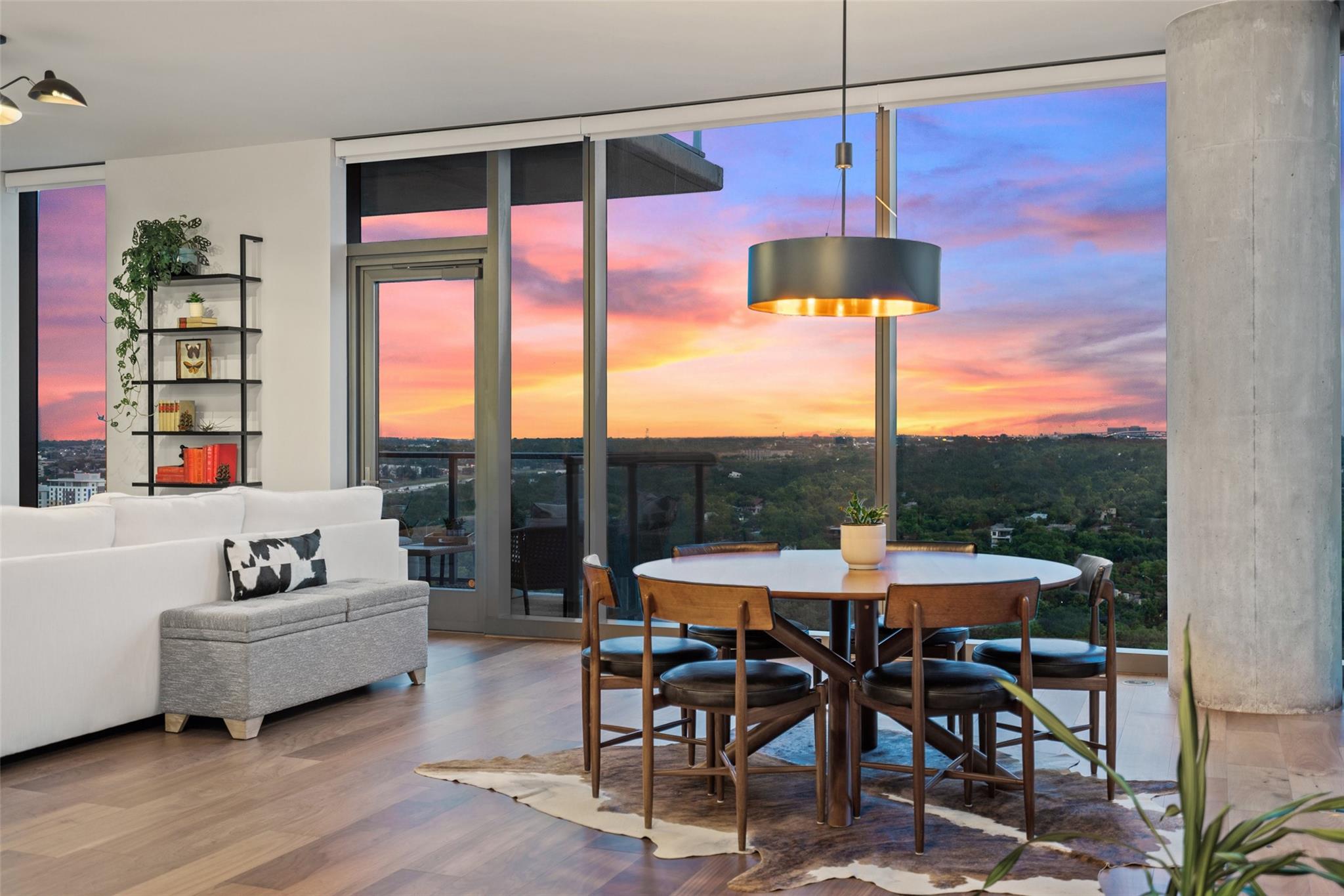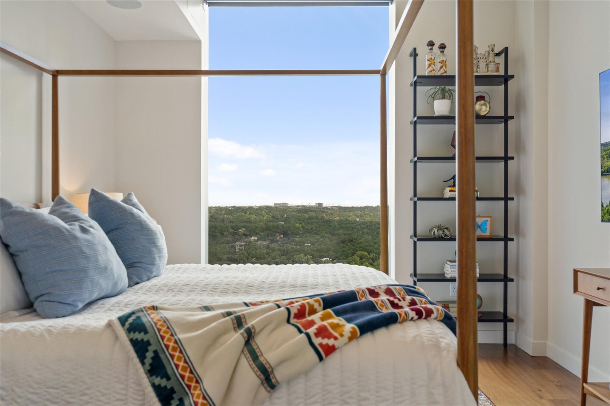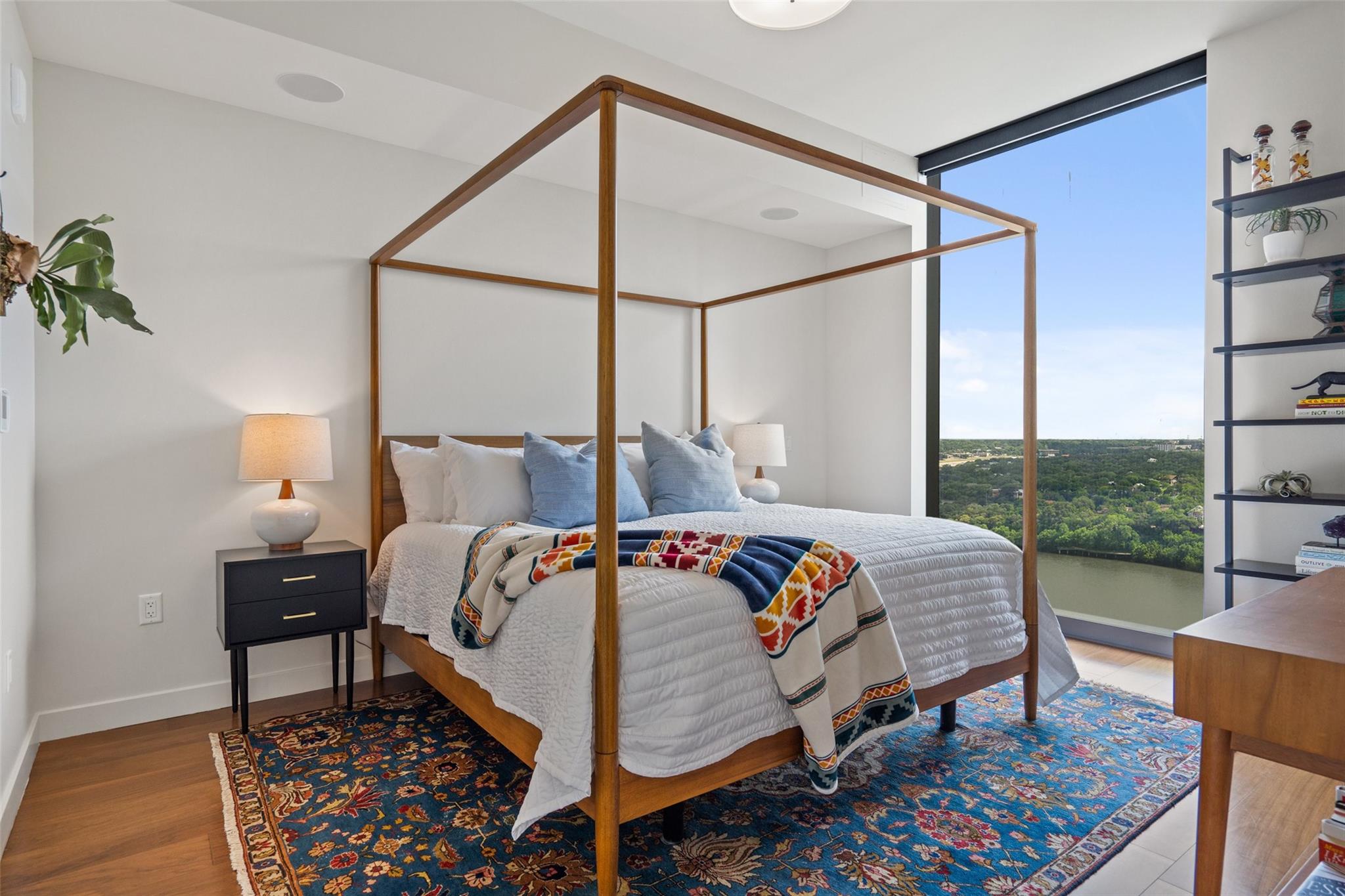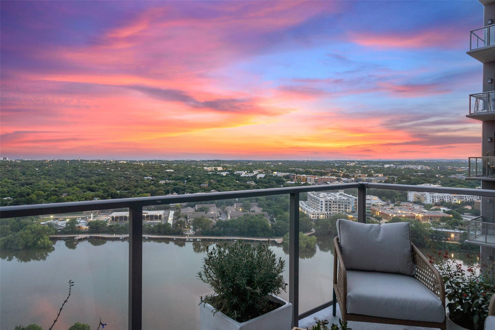 Welcome to your ultimate sanctuary with captivating views nestled in the heart of the vibrant Rainey St. district. This exceptional 3 bedroom, 3 bathroom condo offers a coveted South facing orientation, granting you unobstructed panoramas of the serene Ladybird Lake and the dynamic downtown corridor. Step inside and be mesmerized by the floor-to-ceiling walls of glass, meticulously designed to frame the awe-inspiring views and flood the space with natural light. Every detail has been carefully considered to create an atmosphere of unparalleled elegance. Submerge yourself in the timeless refinement of hardwood floors and the sleek allure of quartz counters, which effortlessly blend style and functionality. The open living, kitchen, and dining areas create a seamless flow, ideal for entertaining guests. The condo comes wired with speakers, while the automatic window shades on all windows provide effortless privacy and shade at the touch of a button. Wake up to breathtaking lake views from the comfort of your primary bedroom and unwind in your spa-like bathroom. Organize your wardrobe with ease in the custom closet systems. Step out onto the large covered balcony and revel in the stunning South facing views of the lake. A second covered balcony off the guest bedroom presents picturesque downtown corridor views. Your new home comes complete with two parking spots on the 6th floor, conveniently equipped with an electric car charger, ensuring convenience for your modern lifestyle. At 44 East, luxury extends beyond your private abode. Immerse yourself in the world-class amenities offered by this premier building. Take a refreshing dip in the sparkling pool, stay active and energized in the state-of-the-art gym, or unwind in the inviting resident lounges. The sky deck on the 37th floor allows you to experience breathtaking views from new heights, while the 24-hour concierge ensures your every need is met with utmost care and attention.