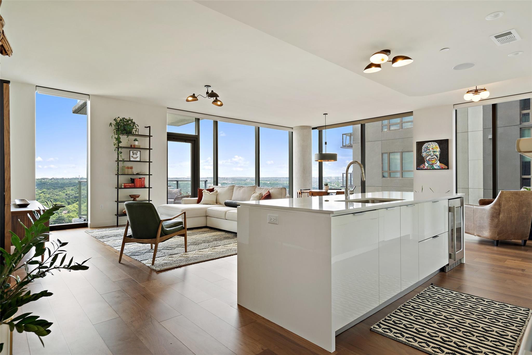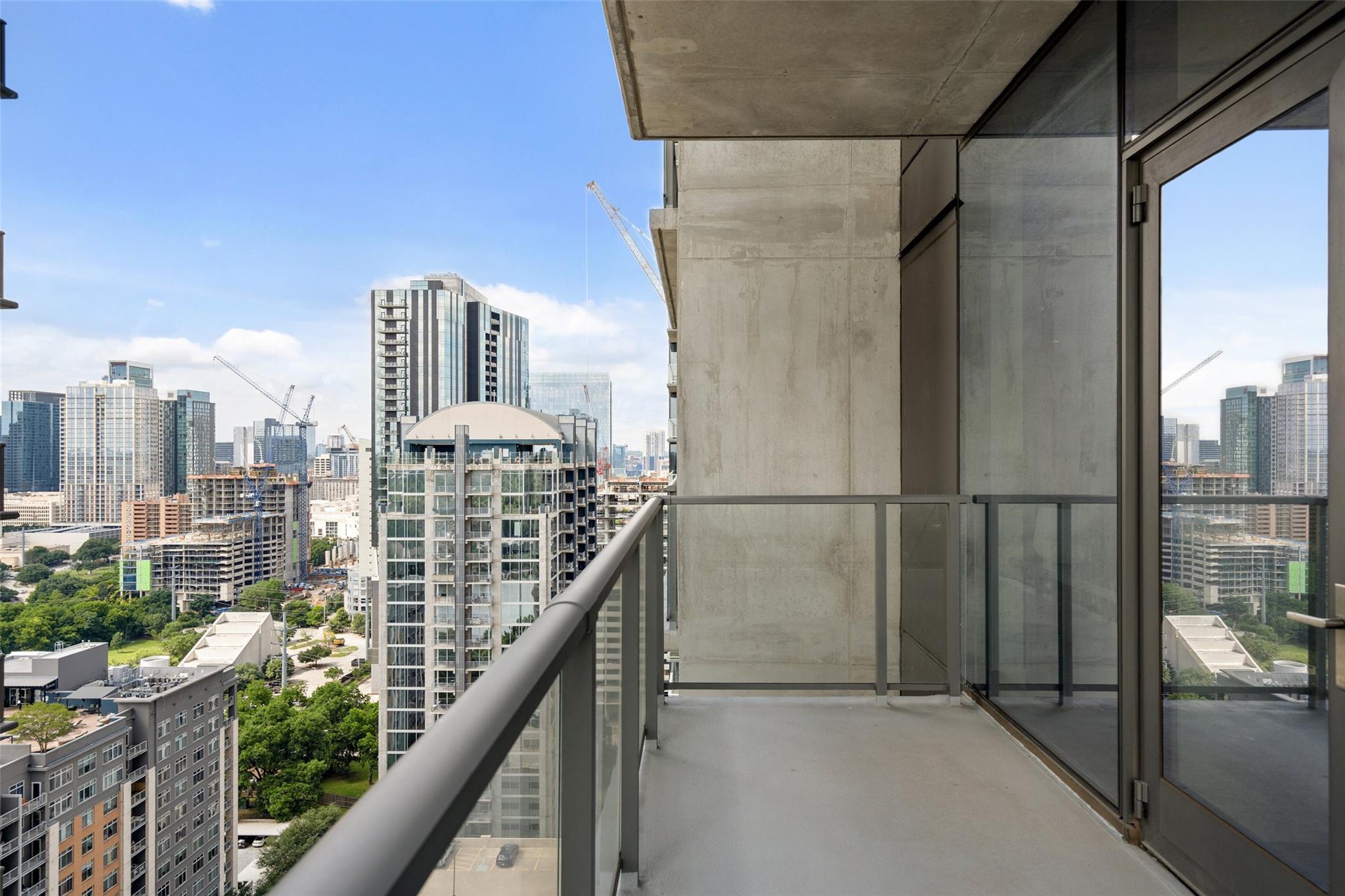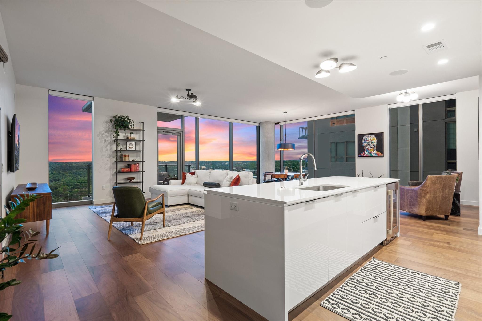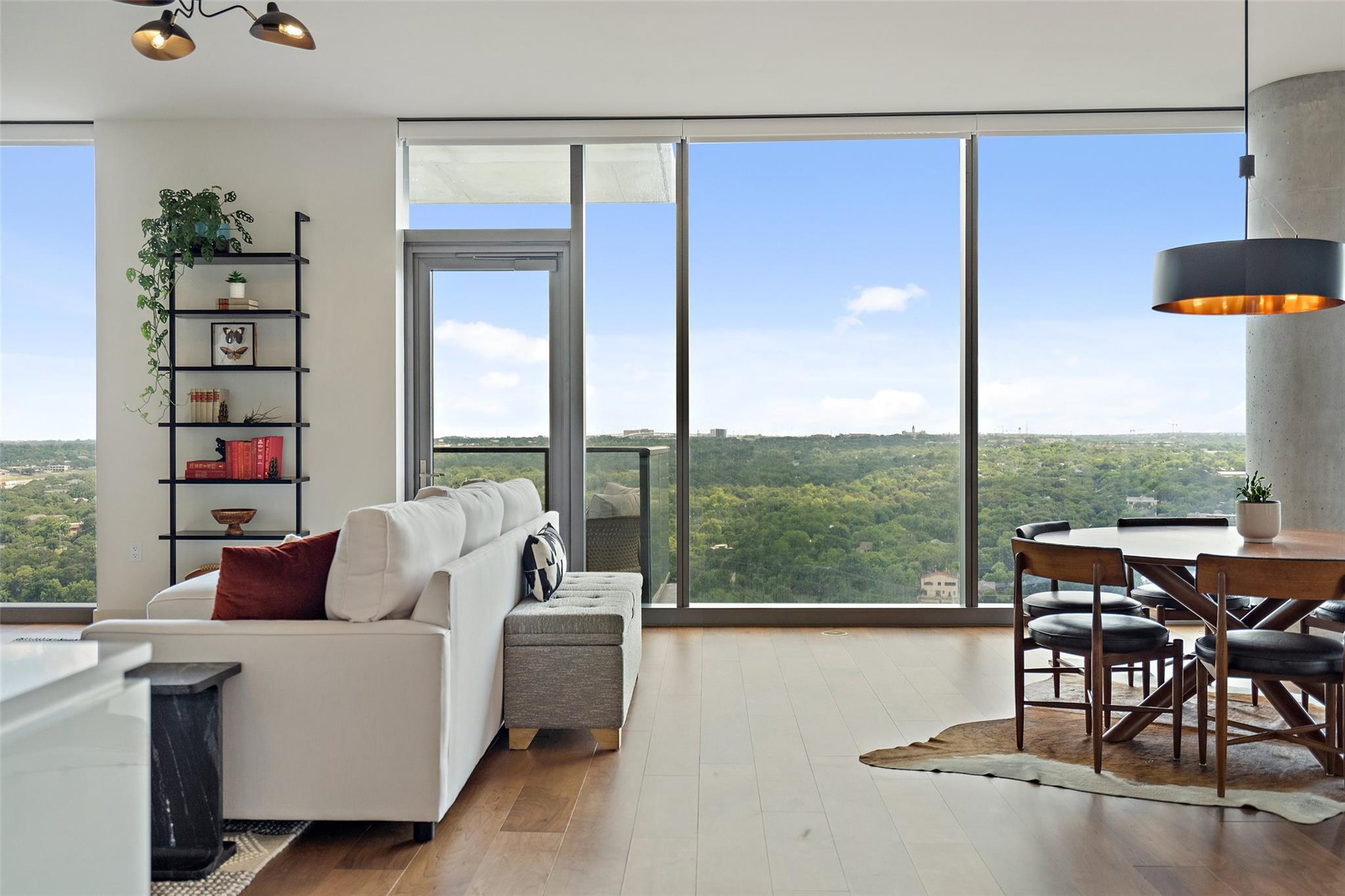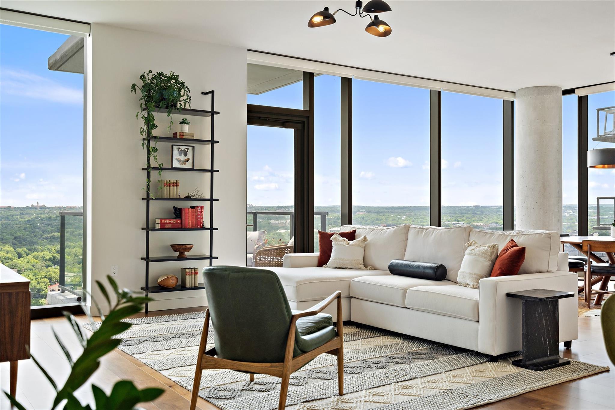 Welcome to your ultimate sanctuary with captivating views nestled in the heart of the vibrant Rainey St. district. This exceptional 3 bedroom, 3 bathroom condo offers a coveted South facing orientation, granting you unobstructed panoramas of the serene Ladybird Lake and the dynamic downtown corridor. Step inside and be mesmerized by the floor-to-ceiling walls of glass, meticulously designed to frame the awe-inspiring views and flood the space with natural light. Every detail has been carefully considered to create an atmosphere of unparalleled elegance. Submerge yourself in the timeless refinement of hardwood floors and the sleek allure of quartz counters, which effortlessly blend style and functionality. The open living, kitchen, and dining areas create a seamless flow, ideal for entertaining guests. The condo comes wired with speakers, while the automatic window shades on all windows provide effortless privacy and shade at the touch of a button. Wake up to breathtaking lake views from the comfort of your primary bedroom and unwind in your spa-like bathroom. Organize your wardrobe with ease in the custom closet systems. Step out onto the large covered balcony and revel in the stunning South facing views of the lake. A second covered balcony off the guest bedroom presents picturesque downtown corridor views. Your new home comes complete with two parking spots on the 6th floor, conveniently equipped with an electric car charger, ensuring convenience for your modern lifestyle. At 44 East, luxury extends beyond your private abode. Immerse yourself in the world-class amenities offered by this premier building. Take a refreshing dip in the sparkling pool, stay active and energized in the state-of-the-art gym, or unwind in the inviting resident lounges. The sky deck on the 37th floor allows you to experience breathtaking views from new heights, while the 24-hour concierge ensures your every need is met with utmost care and attention.