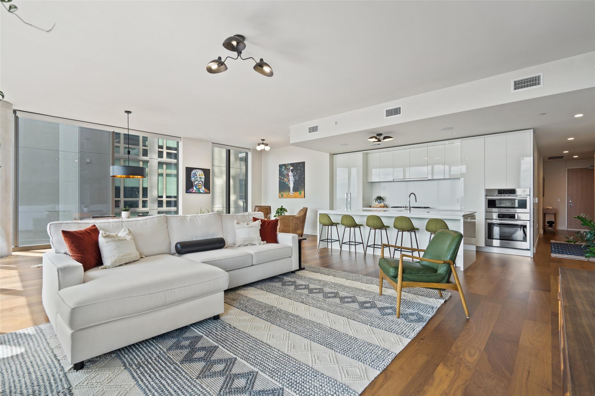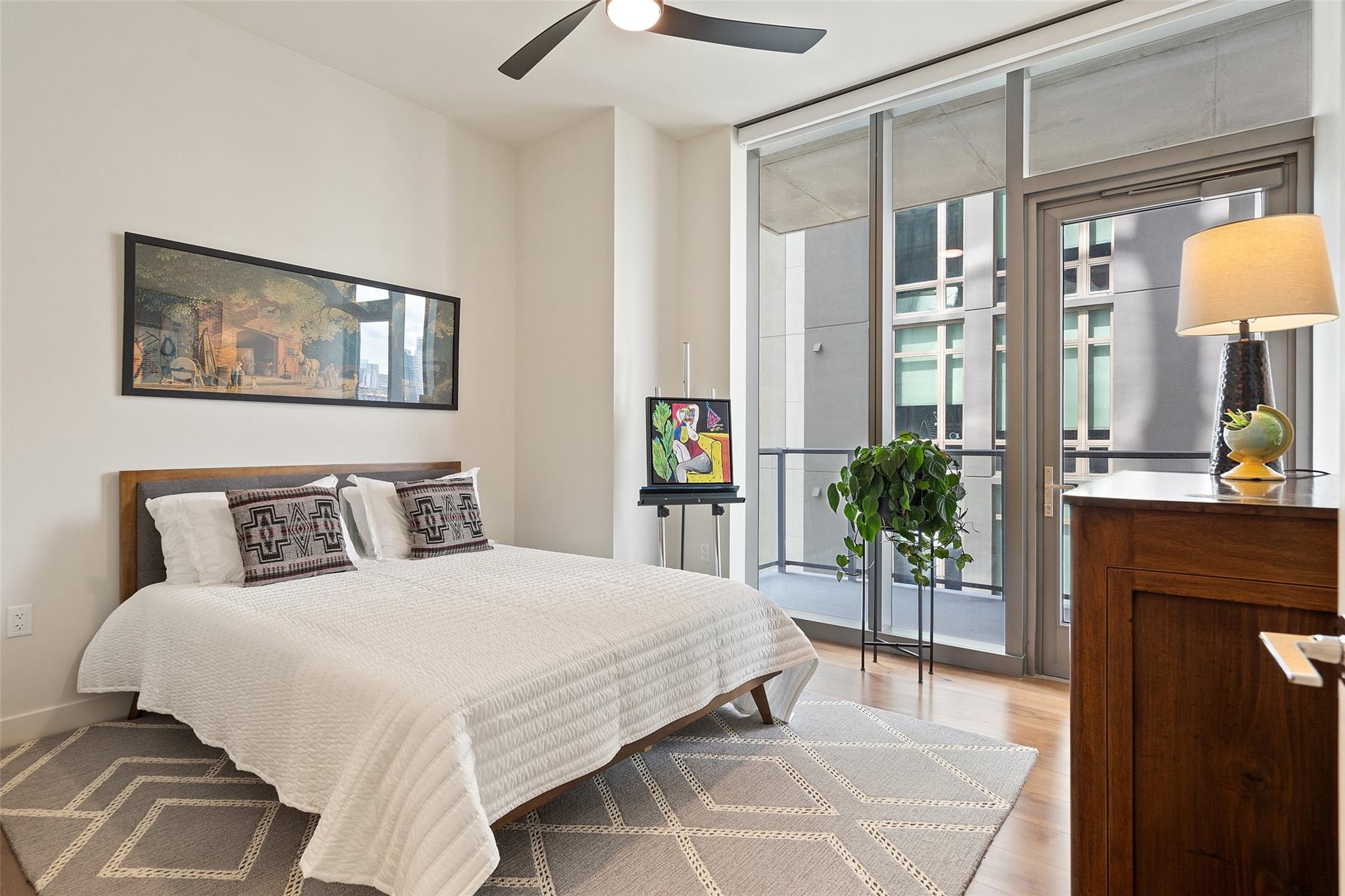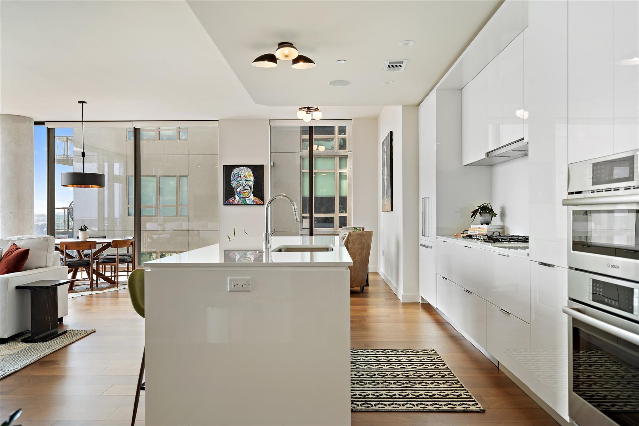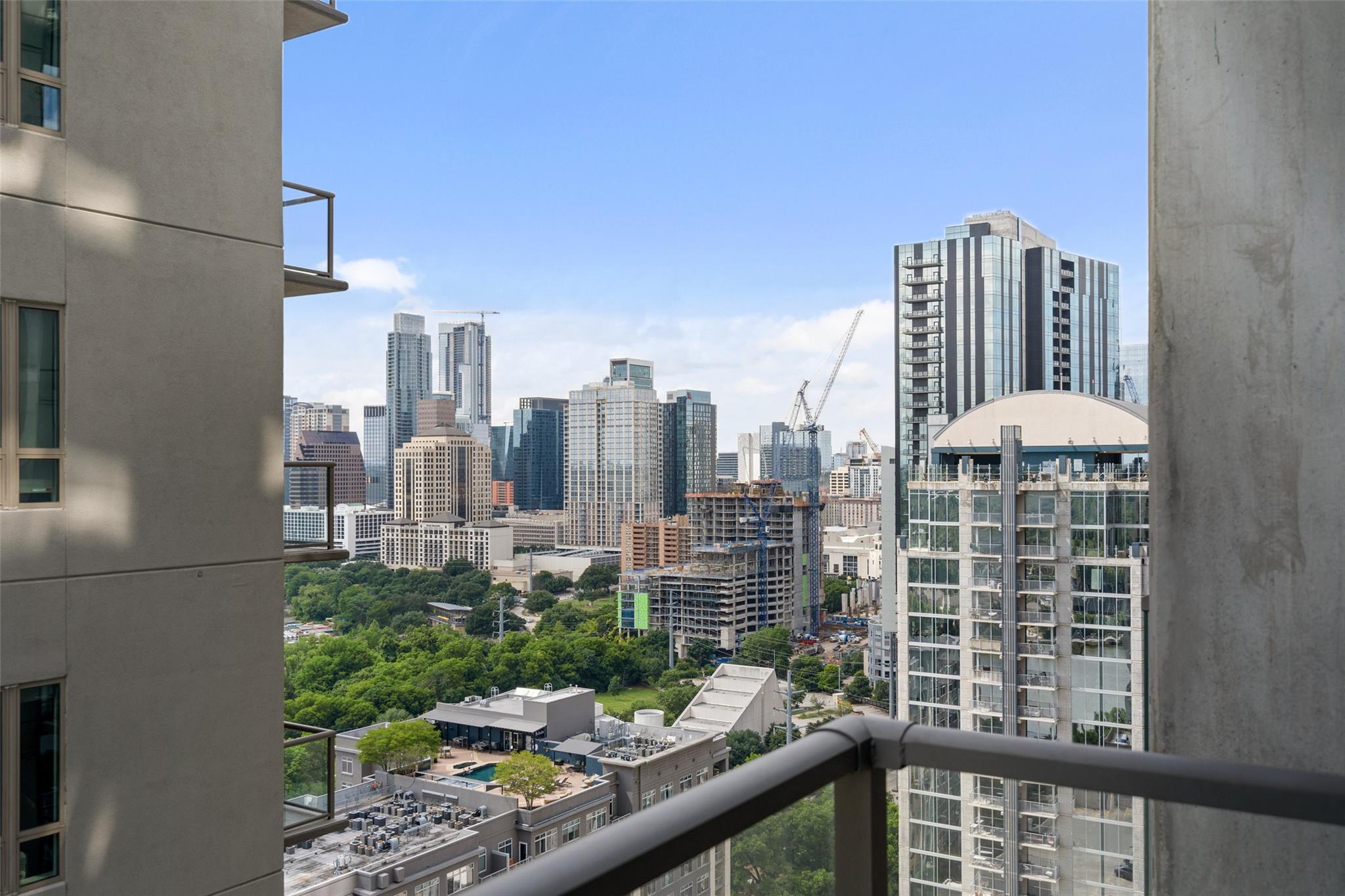 Welcome to your ultimate sanctuary with captivating views nestled in the heart of the vibrant Rainey St. district. This exceptional 3 bedroom, 3 bathroom condo offers a coveted South facing orientation, granting you unobstructed panoramas of the serene Ladybird Lake and the dynamic downtown corridor. Step inside and be mesmerized by the floor-to-ceiling walls of glass, meticulously designed to frame the awe-inspiring views and flood the space with natural light. Every detail has been carefully considered to create an atmosphere of unparalleled elegance. Submerge yourself in the timeless refinement of hardwood floors and the sleek allure of quartz counters, which effortlessly blend style and functionality. The open living, kitchen, and dining areas create a seamless flow, ideal for entertaining guests. The condo comes wired with speakers, while the automatic window shades on all windows provide effortless privacy and shade at the touch of a button. Wake up to breathtaking lake views from the comfort of your primary bedroom and unwind in your spa-like bathroom. Organize your wardrobe with ease in the custom closet systems. Step out onto the large covered balcony and revel in the stunning South facing views of the lake. A second covered balcony off the guest bedroom presents picturesque downtown corridor views. Your new home comes complete with two parking spots on the 6th floor, conveniently equipped with an electric car charger, ensuring convenience for your modern lifestyle. At 44 East, luxury extends beyond your private abode. Immerse yourself in the world-class amenities offered by this premier building. Take a refreshing dip in the sparkling pool, stay active and energized in the state-of-the-art gym, or unwind in the inviting resident lounges. The sky deck on the 37th floor allows you to experience breathtaking views from new heights, while the 24-hour concierge ensures your every need is met with utmost care and attention.