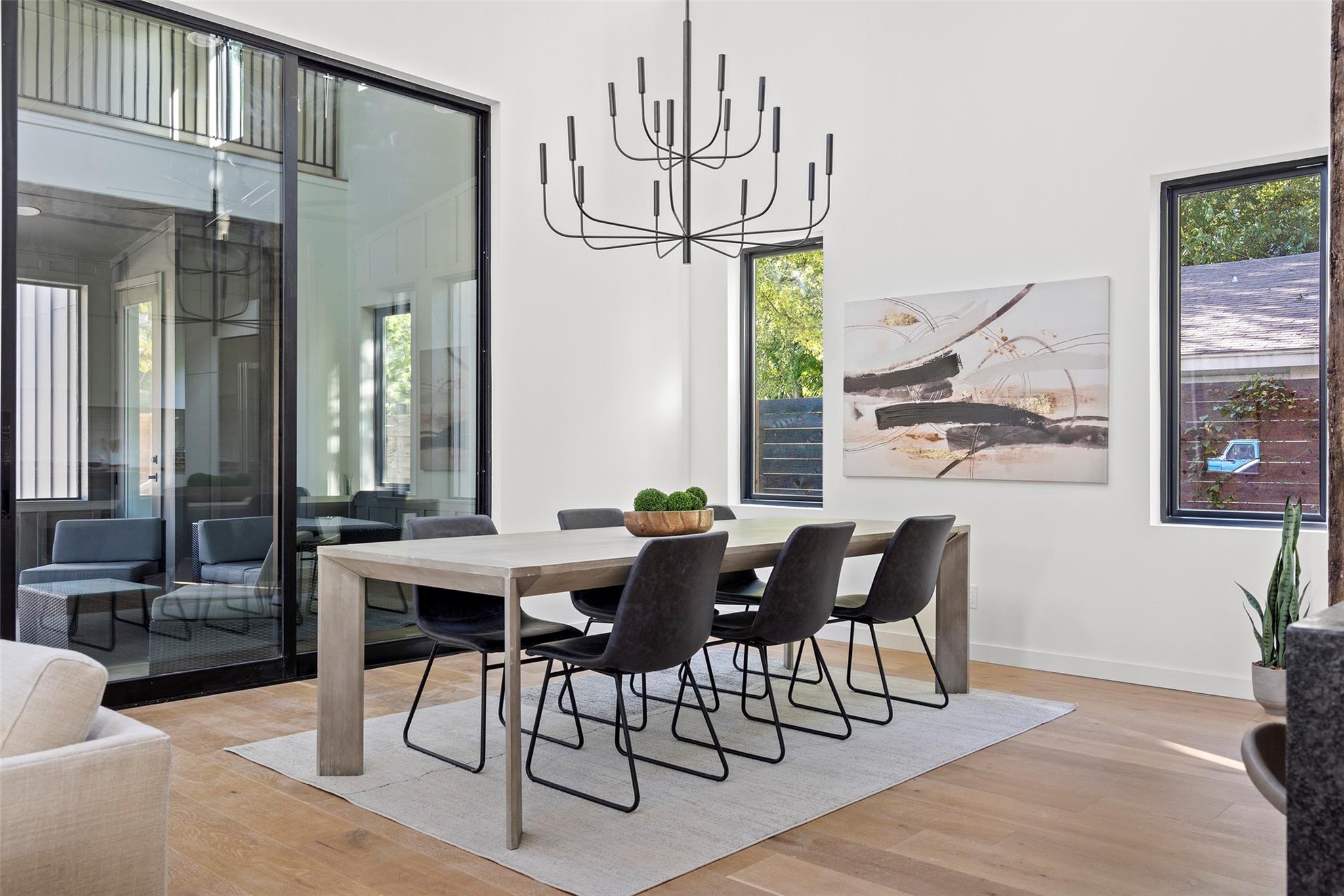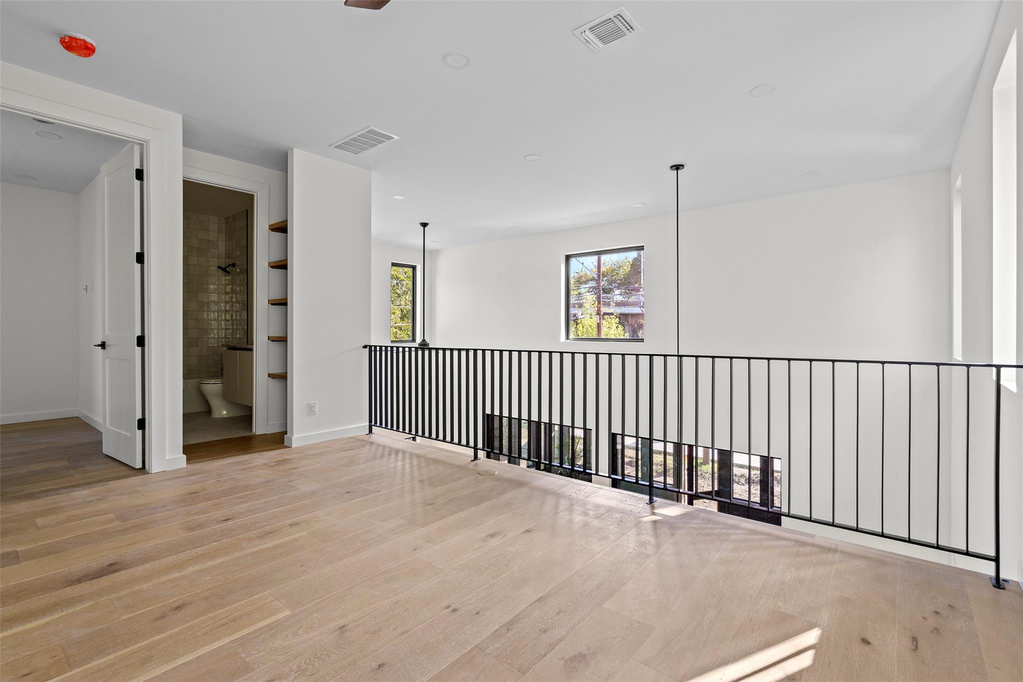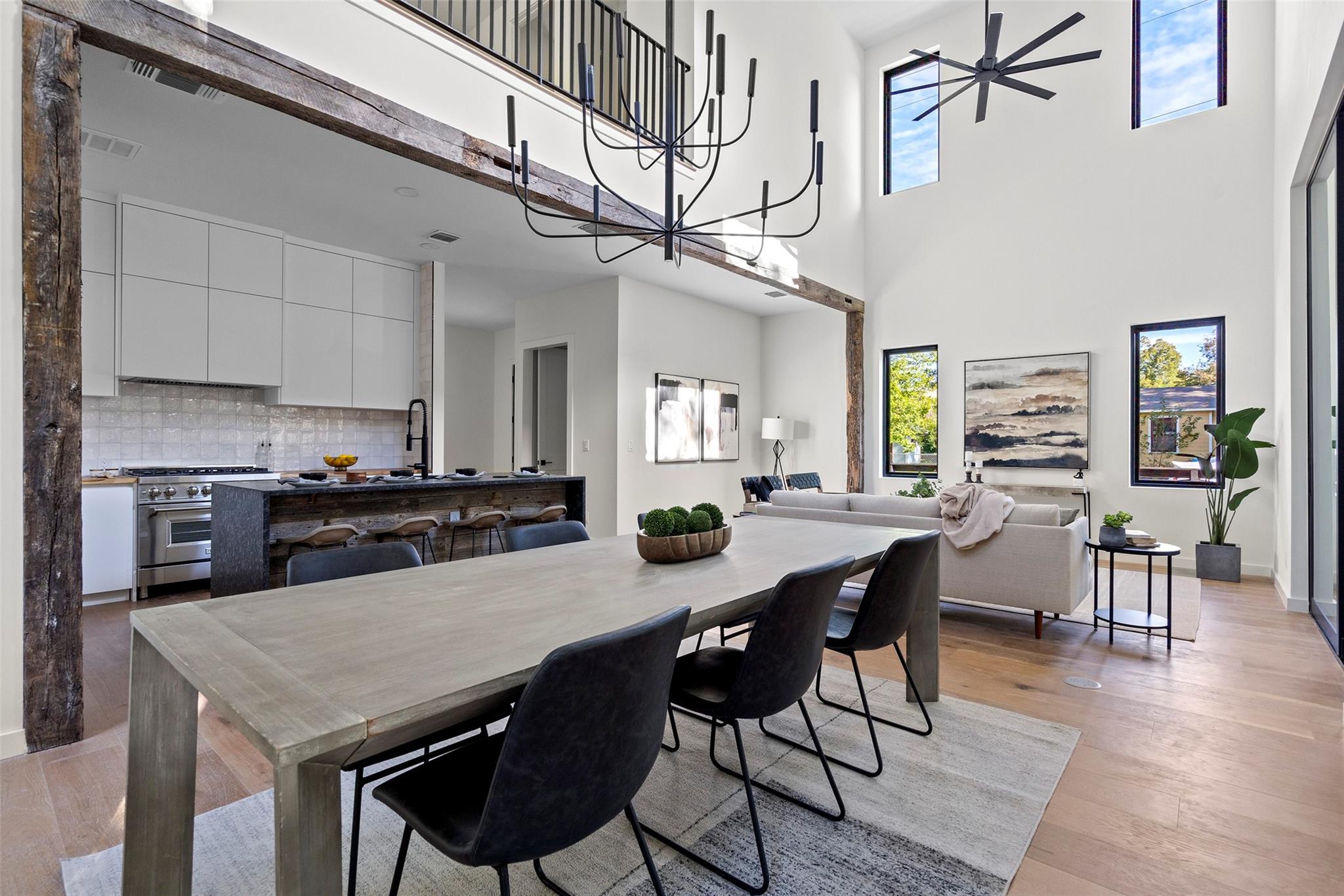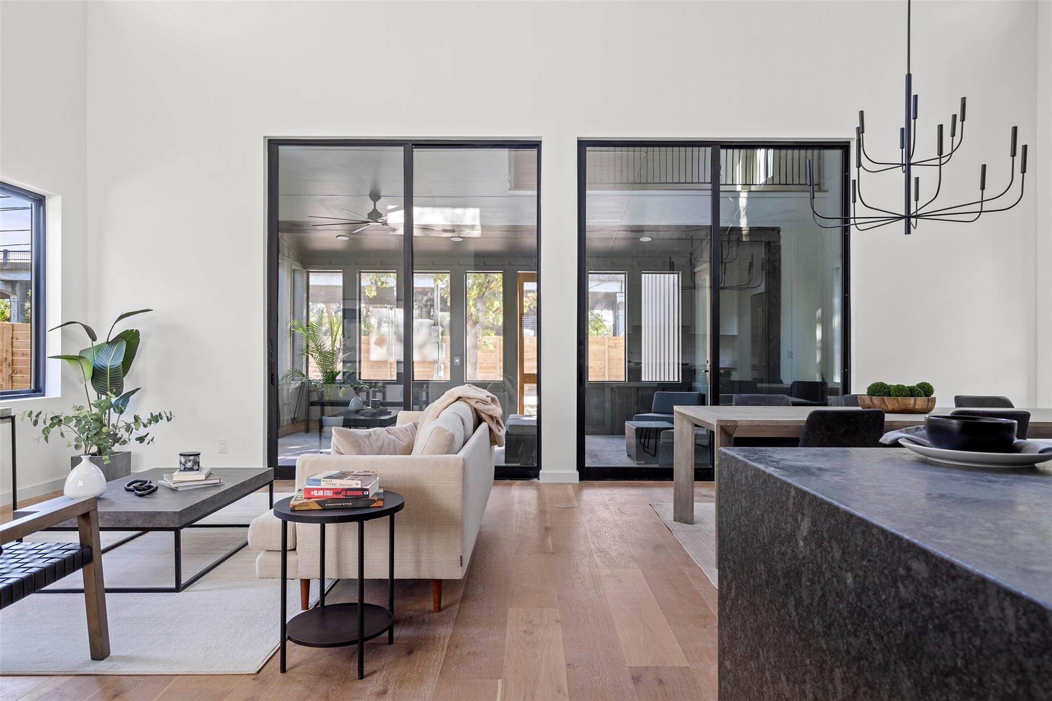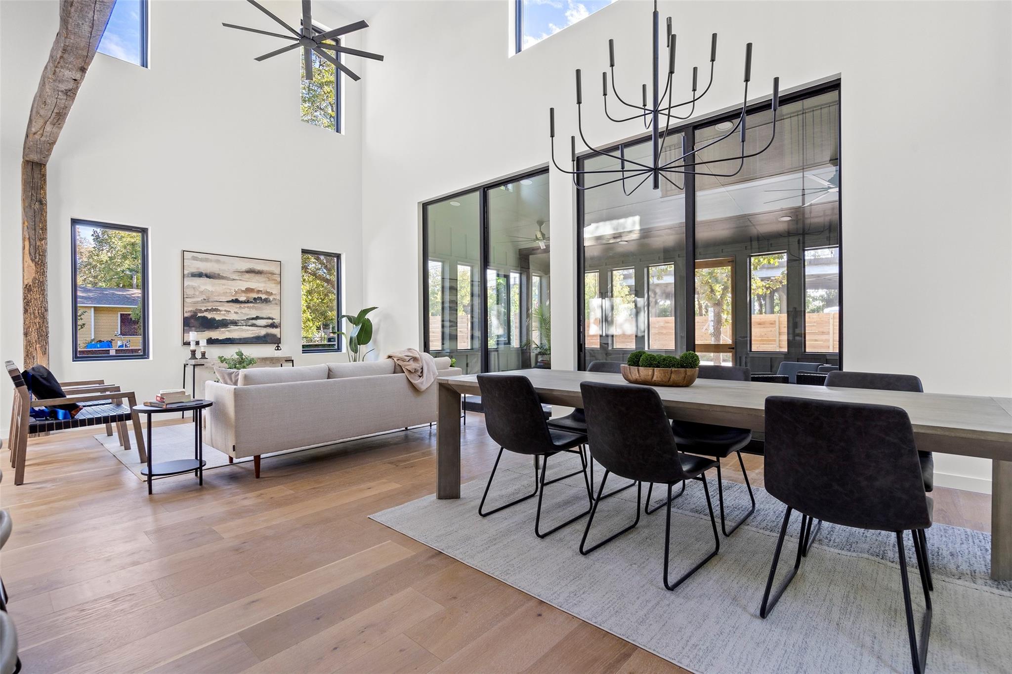 Welcome to the East Austin farm house, and silo! This gorgeous and unique property is situated on just over 1/5 of an acre, and has been designed to create a Texas ranch exterior. The main house is almost 3,100 sq ft and is sided with reclaimed barn wood siding that is believed to be almost a century old. Inside, both the barn and silo are luxury homes with high-end design, finishes and fixtures. The main level in the barn house boasts a primary bedroom with a luxurious spa like marble bathroom. The bathroom has a 9' long floating dual vanity and wet room with an oversized soaking tub. The primary suite is finished with a custom designed closet and convenient in-closet stackable washer and dryer. The remainder of the main level includes a Chef's kitchen, huge screened in porch, living and dining rooms. The kitchen has a stunning JennAir refrigerator, 6-burner stainless gas range, and eat-in island with leathered granite waterfall counter tops. The rest of the kitchen has butcher block counter tops, a cream Zelige tile backsplash and an enormous 25' reclaimed support beam which add to the rustic and modern aesthetic. On the second story, you will find a loft space overlooking the great room and dining area, along with three large bedrooms, each with an en suite bathroom. The third level offers a media room that is pre-wired & a bonus space with full bathroom. Bring your imagination for the bonus space, it could make a great play space, studio, library or more. The silo on the property is the guest house/casita, and is an awesome space which spans almost 700 square feet. Current design has the space utilized as a home gym with a galley kitchen, and the upstairs as a large home office. It is versatile extra space that can work around your life, and can also easily be redesigned as a fully functioning standalone apartment or AirBnb. Come embrace the vibrant East Austin lifestyle in this thoughtfully designed slice of country, in the city.